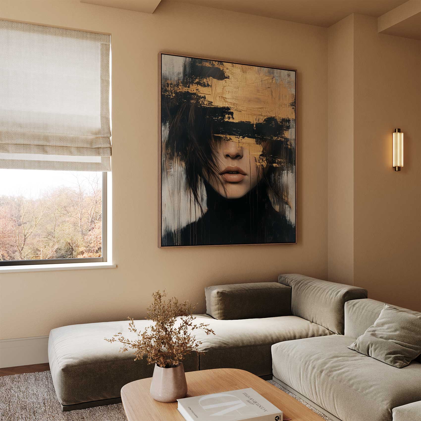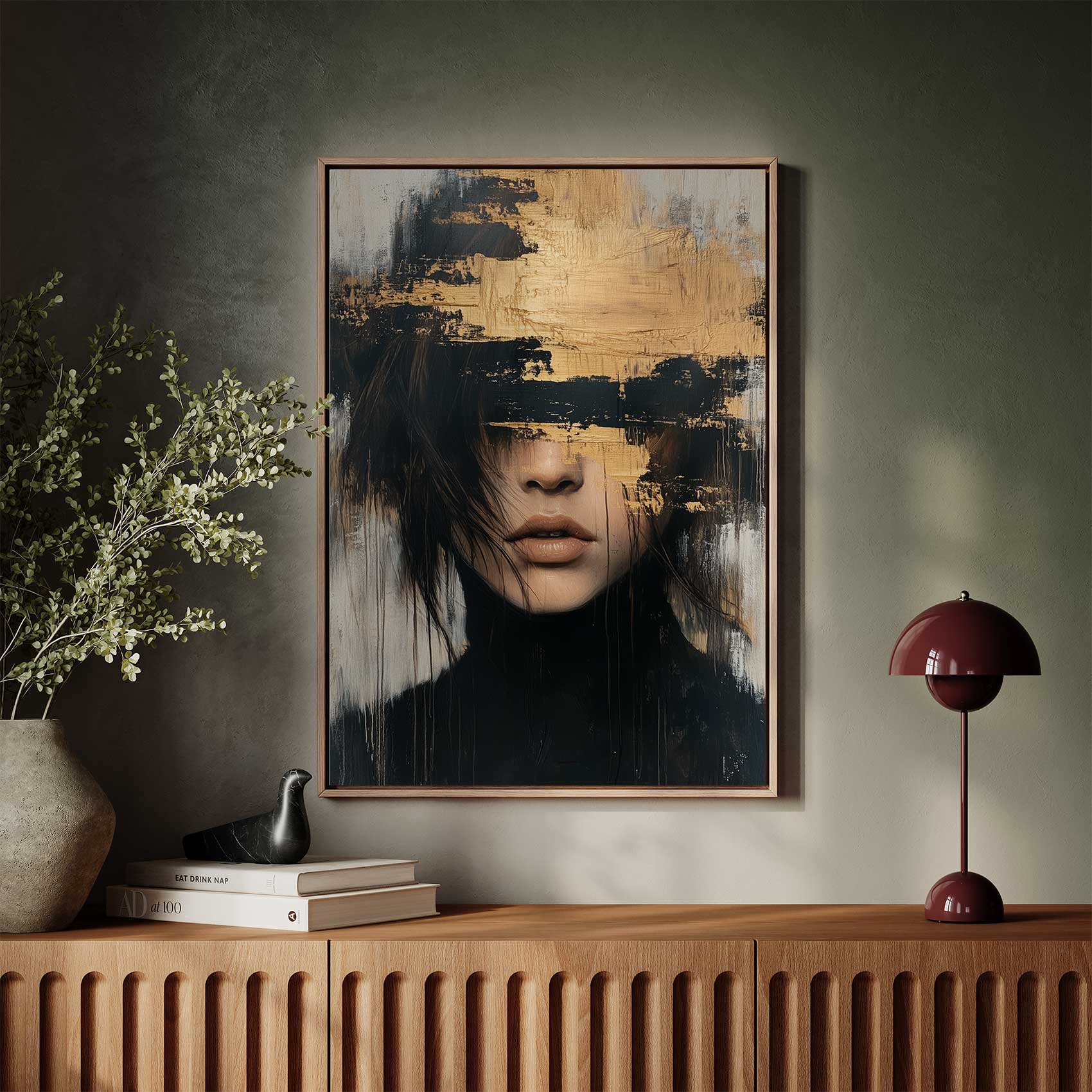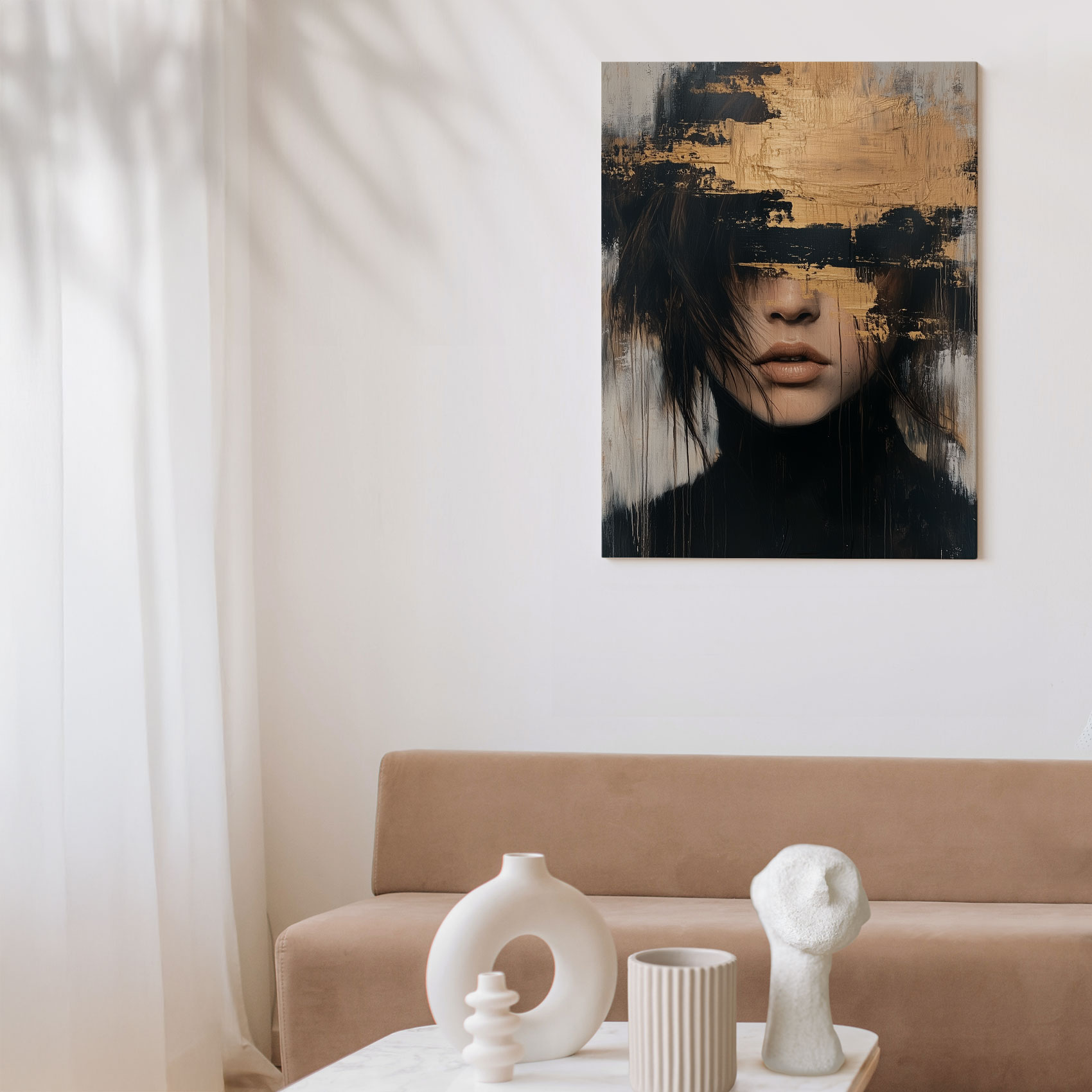 Terug naar collectie / Schilderijen / Abstract Schilderij / Abstracte vrouw met goudwind