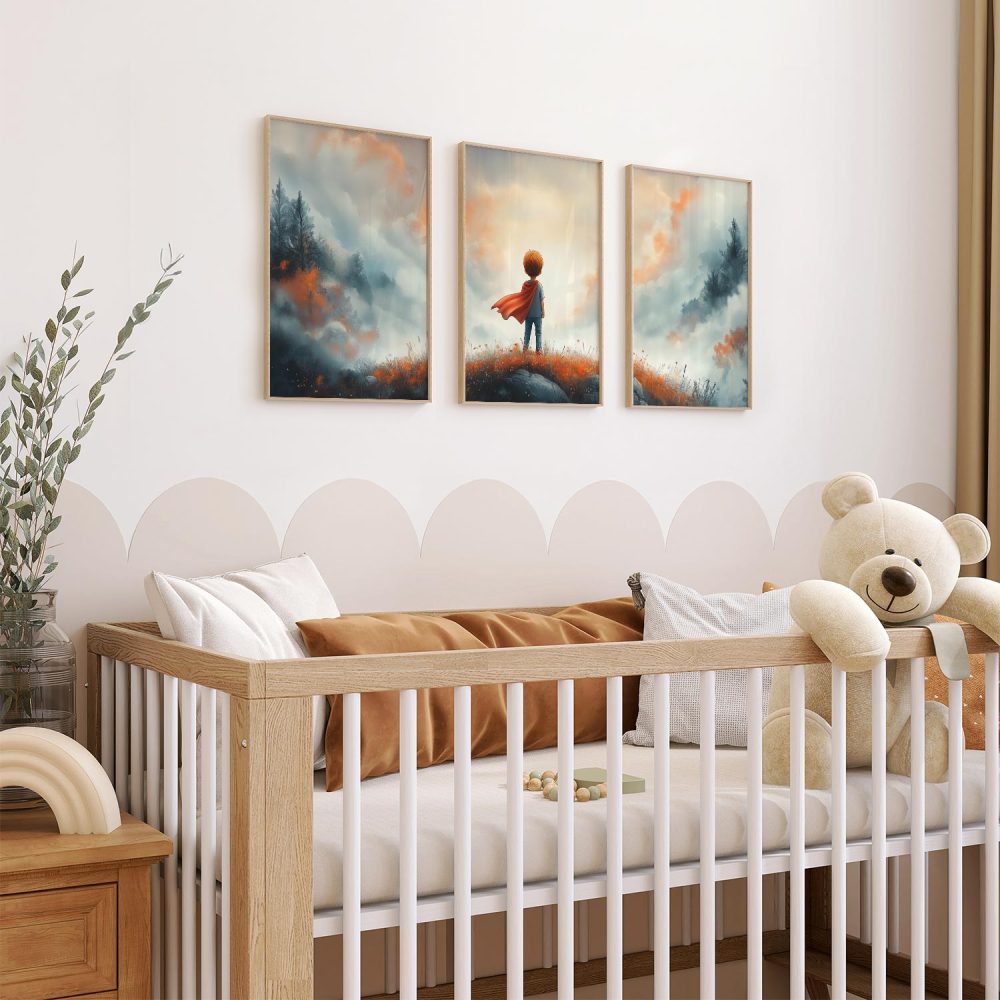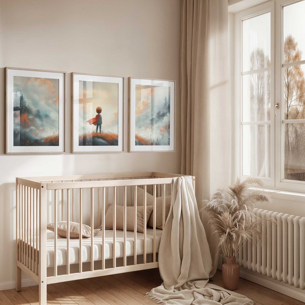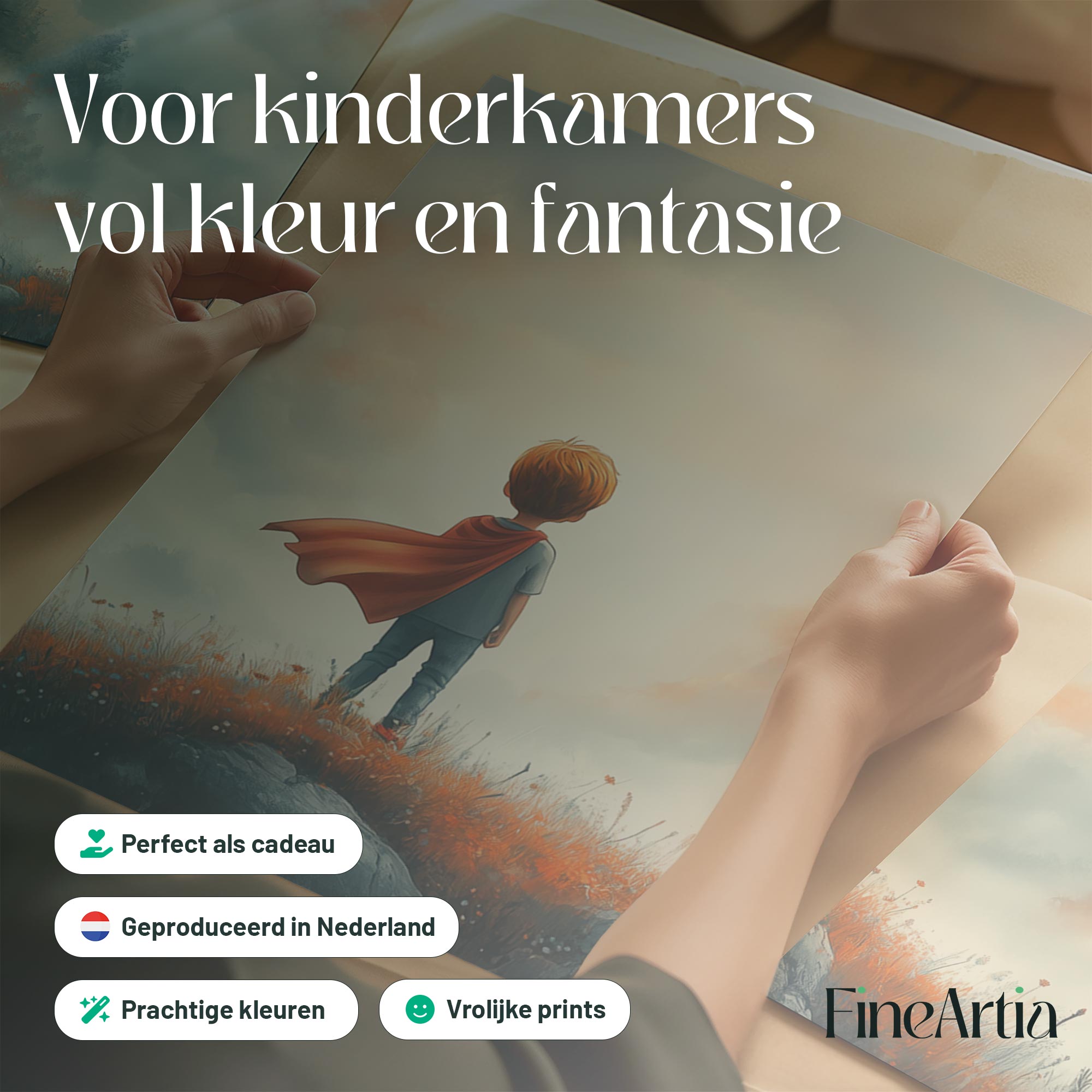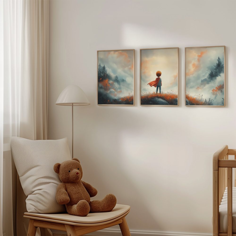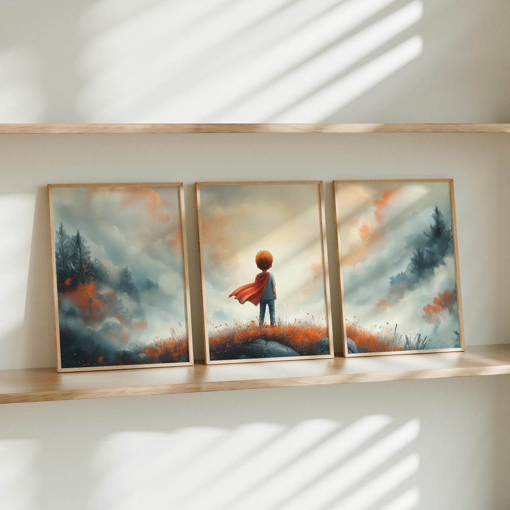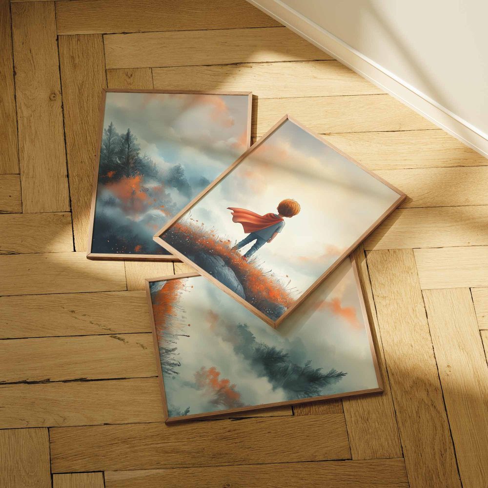Terug naar collectie / Kinderkamer posters / Avontuurlijk posters / Avontuurlijke Jongen met Cape op Bloemenheuvel