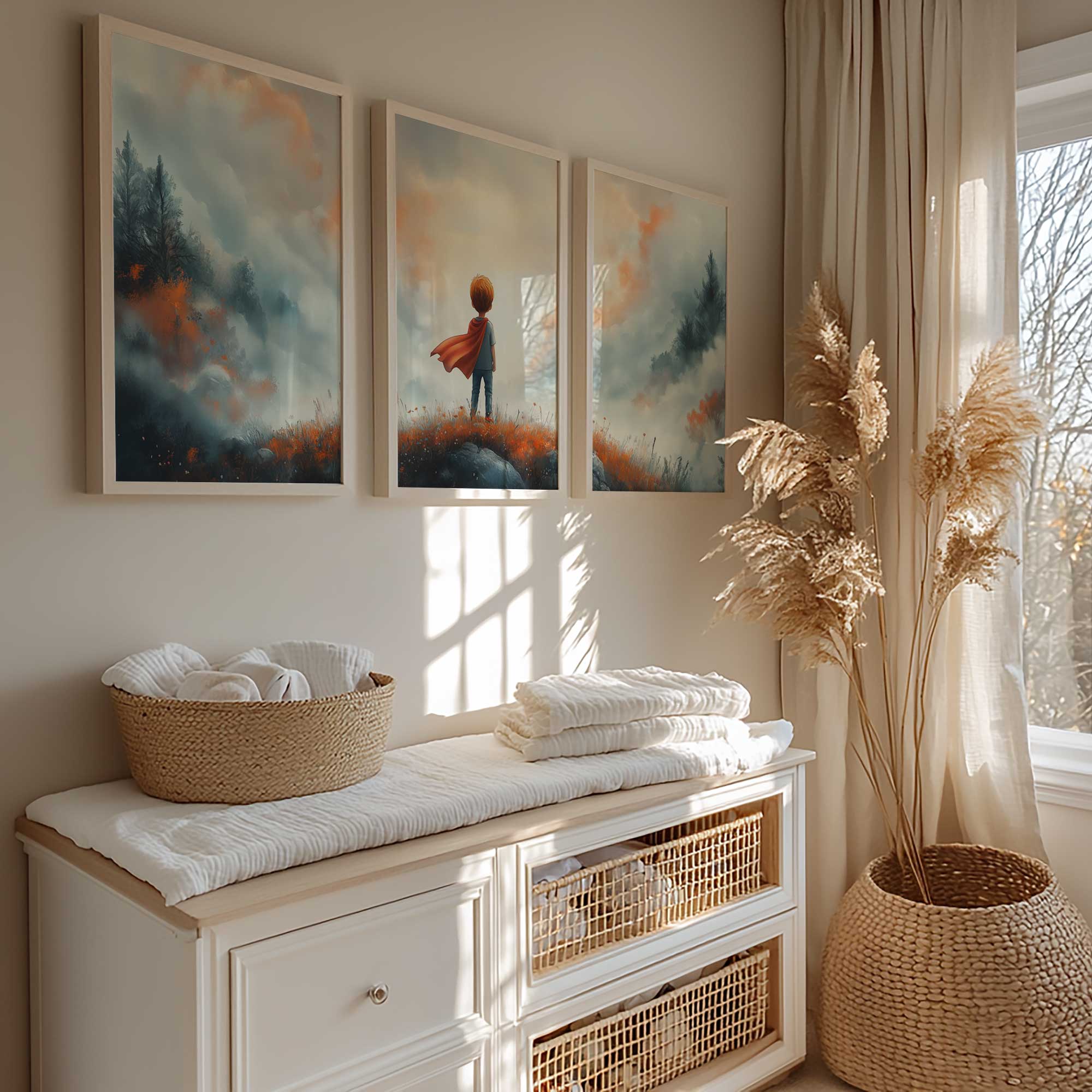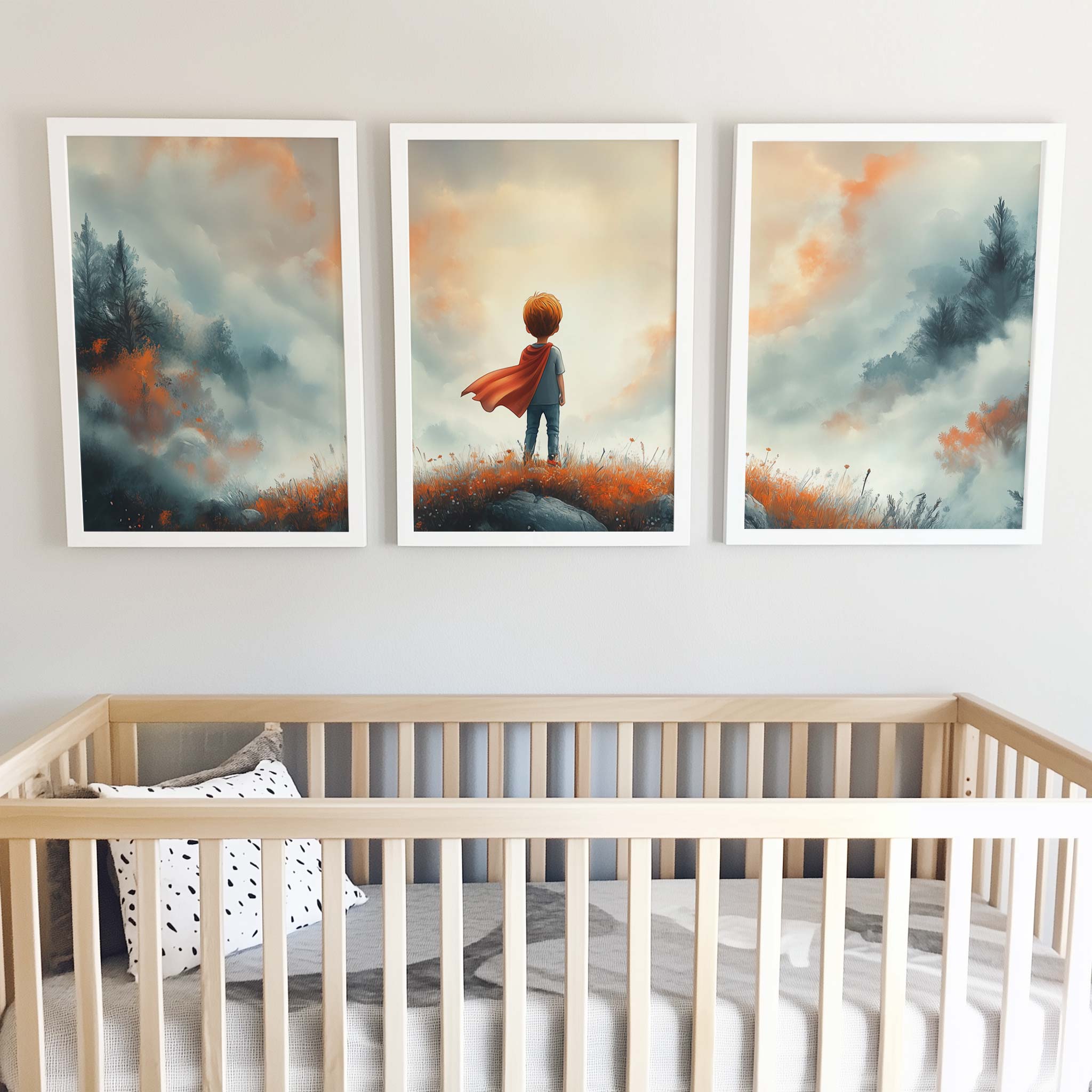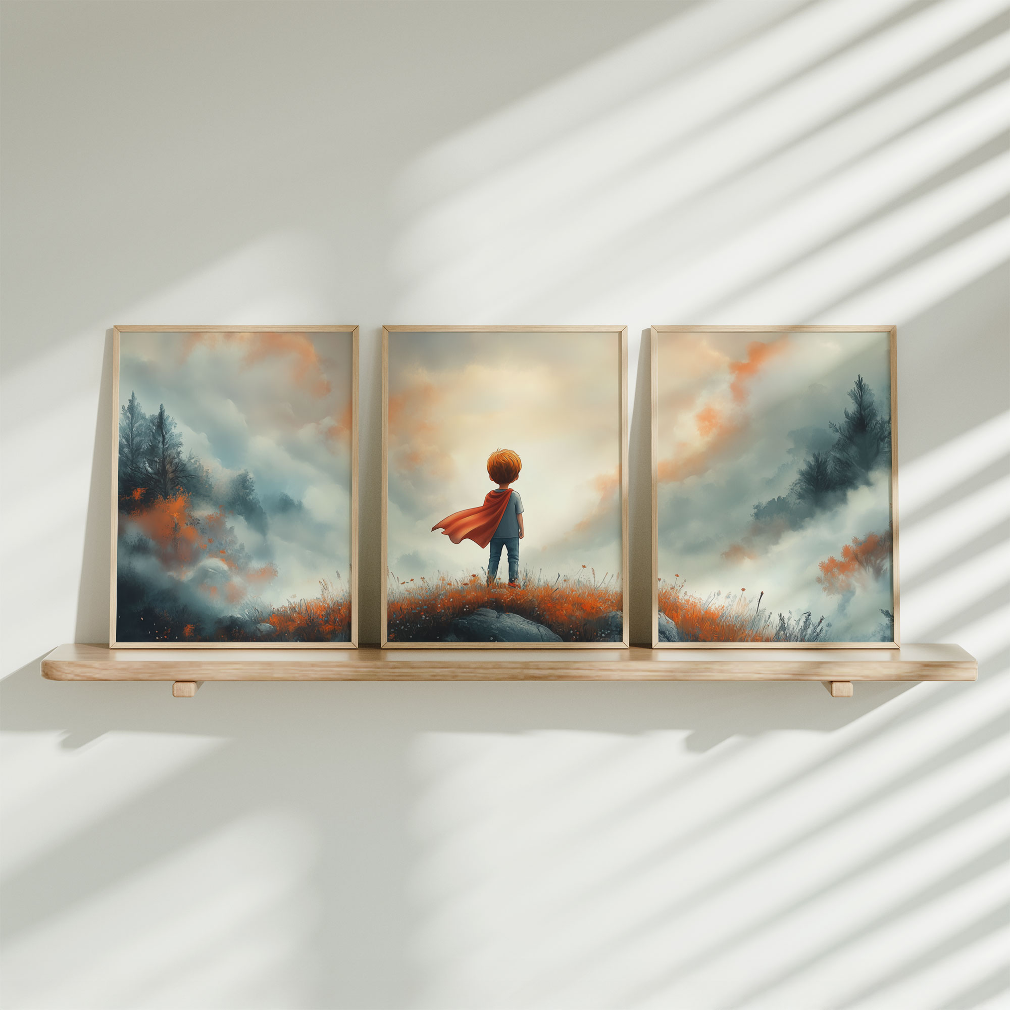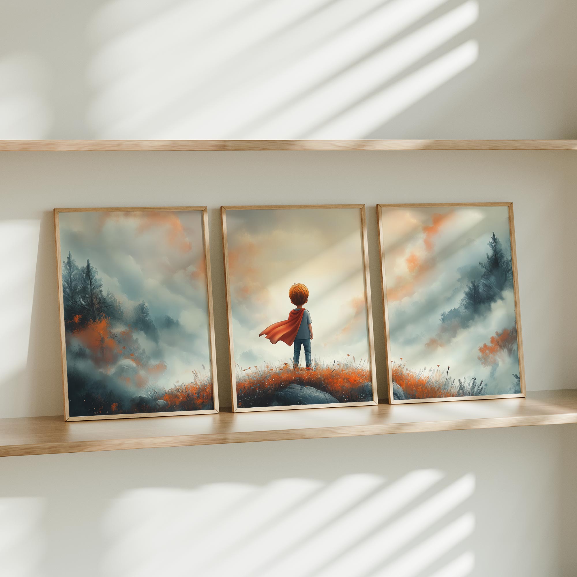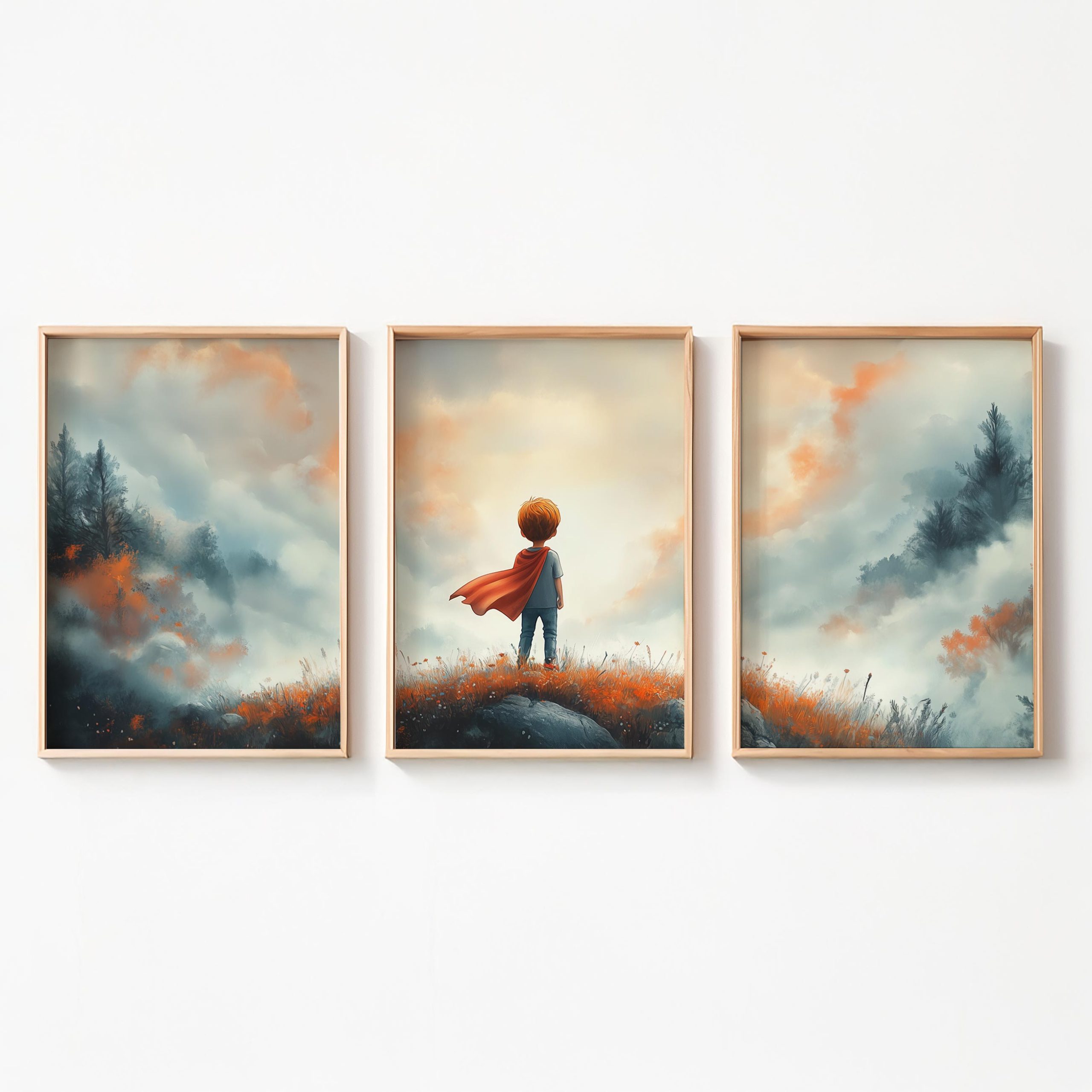 Terug naar collectie / Kinderkamer posters / Avontuurlijk posters / Avontuurlijke Jongen met Cape op Bloemenheuvel
