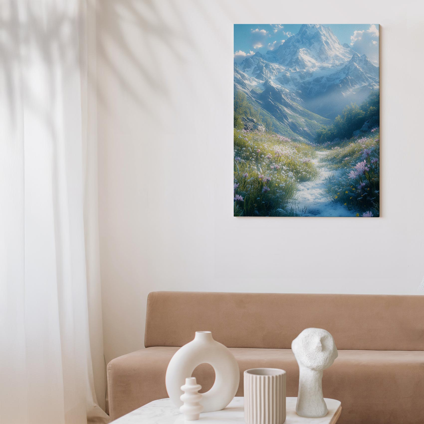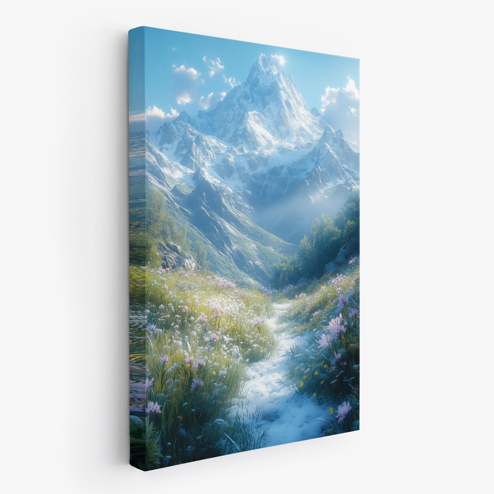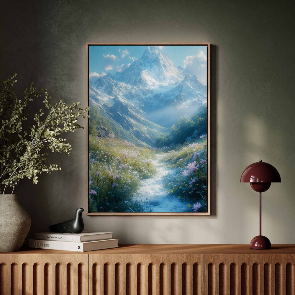 Terug naar collectie / Schilderijen / Bergen Schilderij / Besneeuwde bergvallei met bloemen