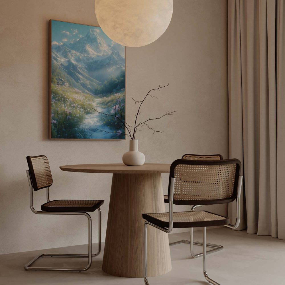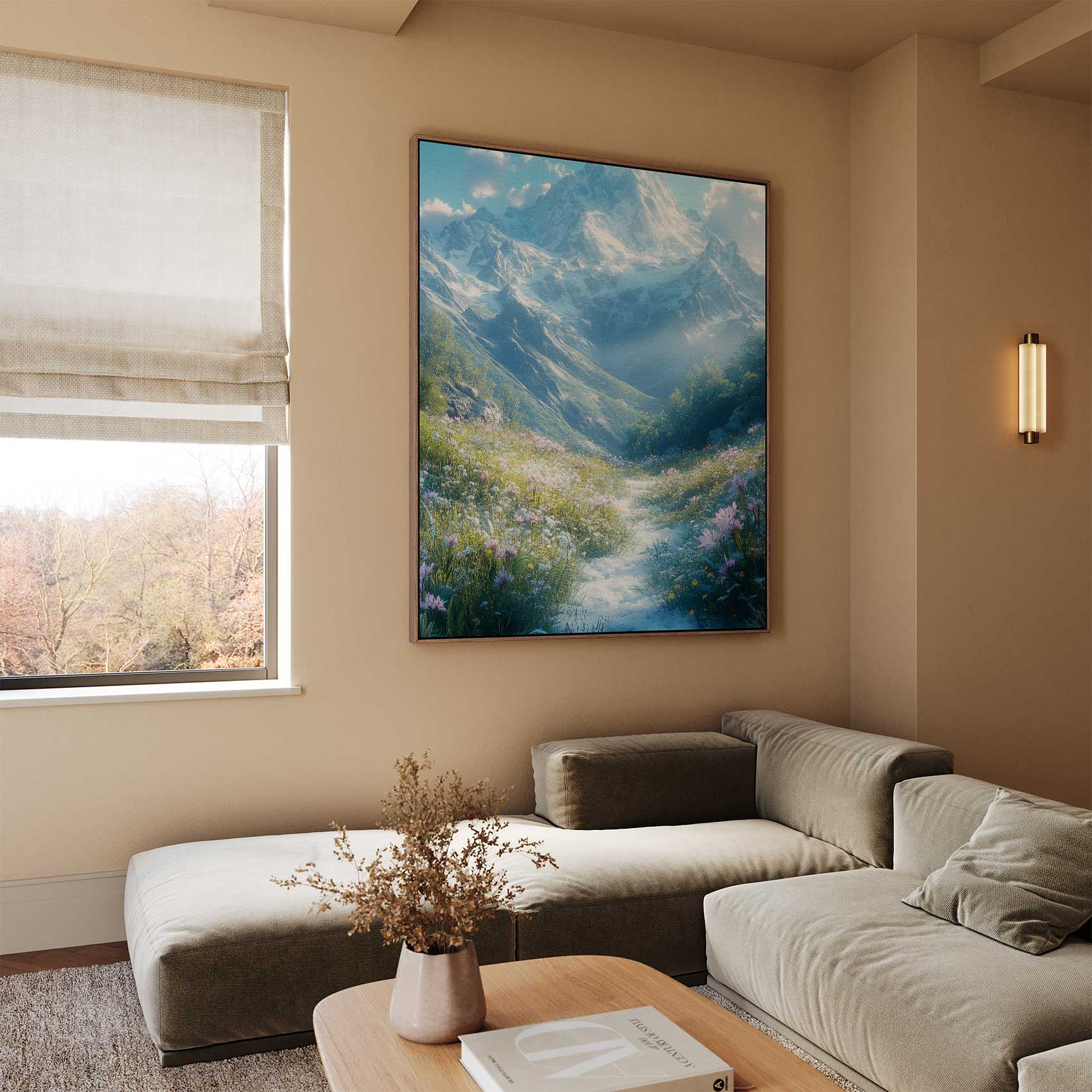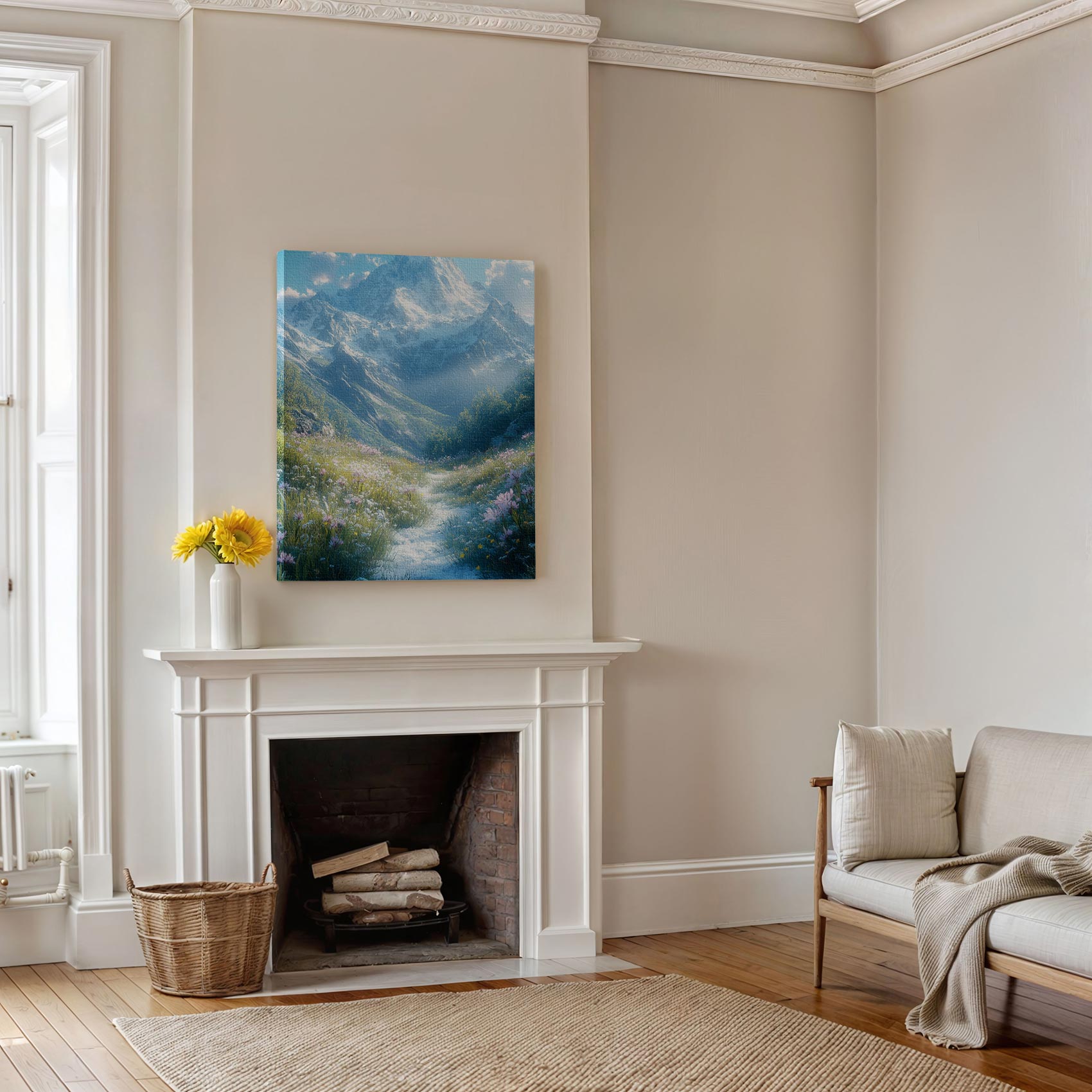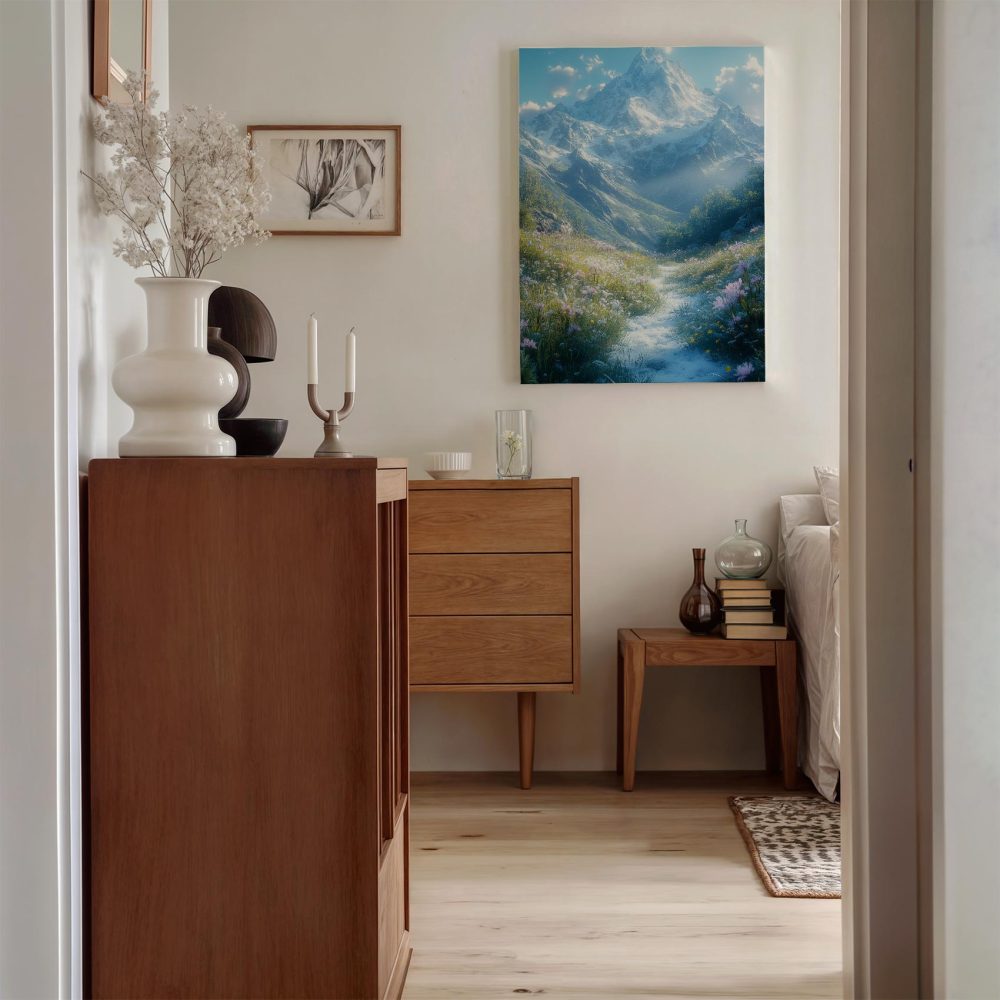 Terug naar collectie / Schilderijen / Bergen Schilderij / Besneeuwde bergvallei met bloemen