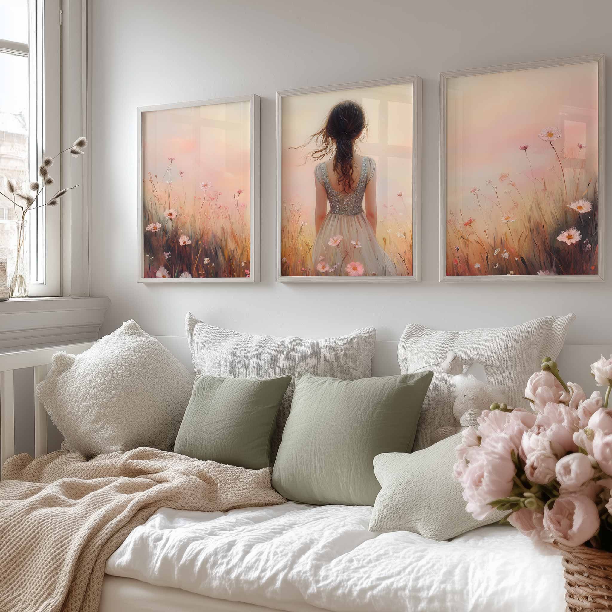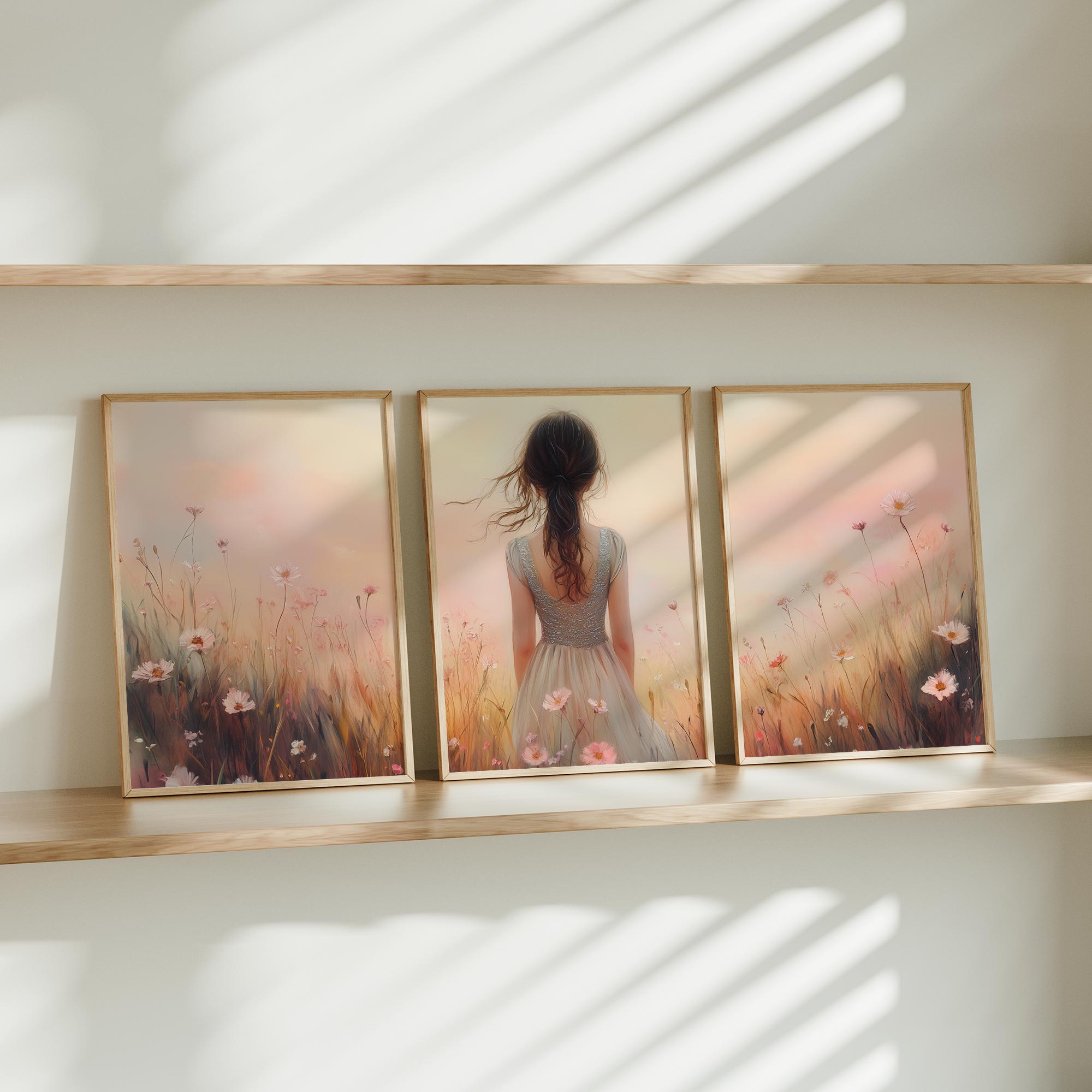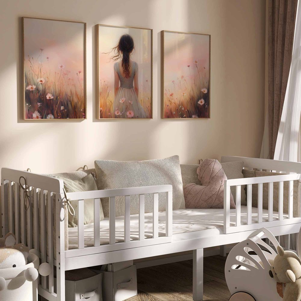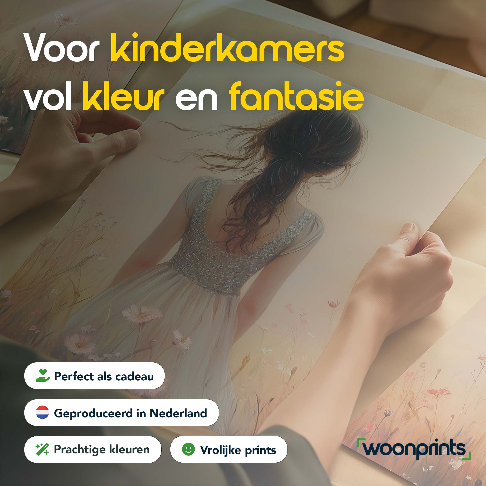 Terug naar collectie / Kinderkamer posters / Bloemen posters / Betoverend bloemenveld met dromerige vrouw en kleurrijke lucht