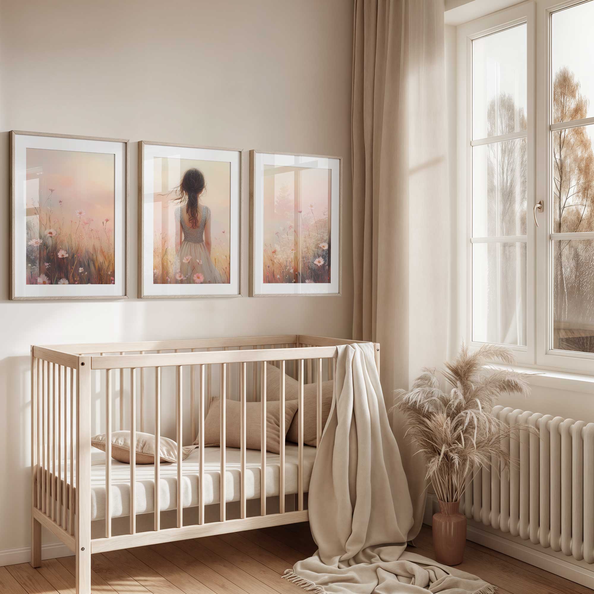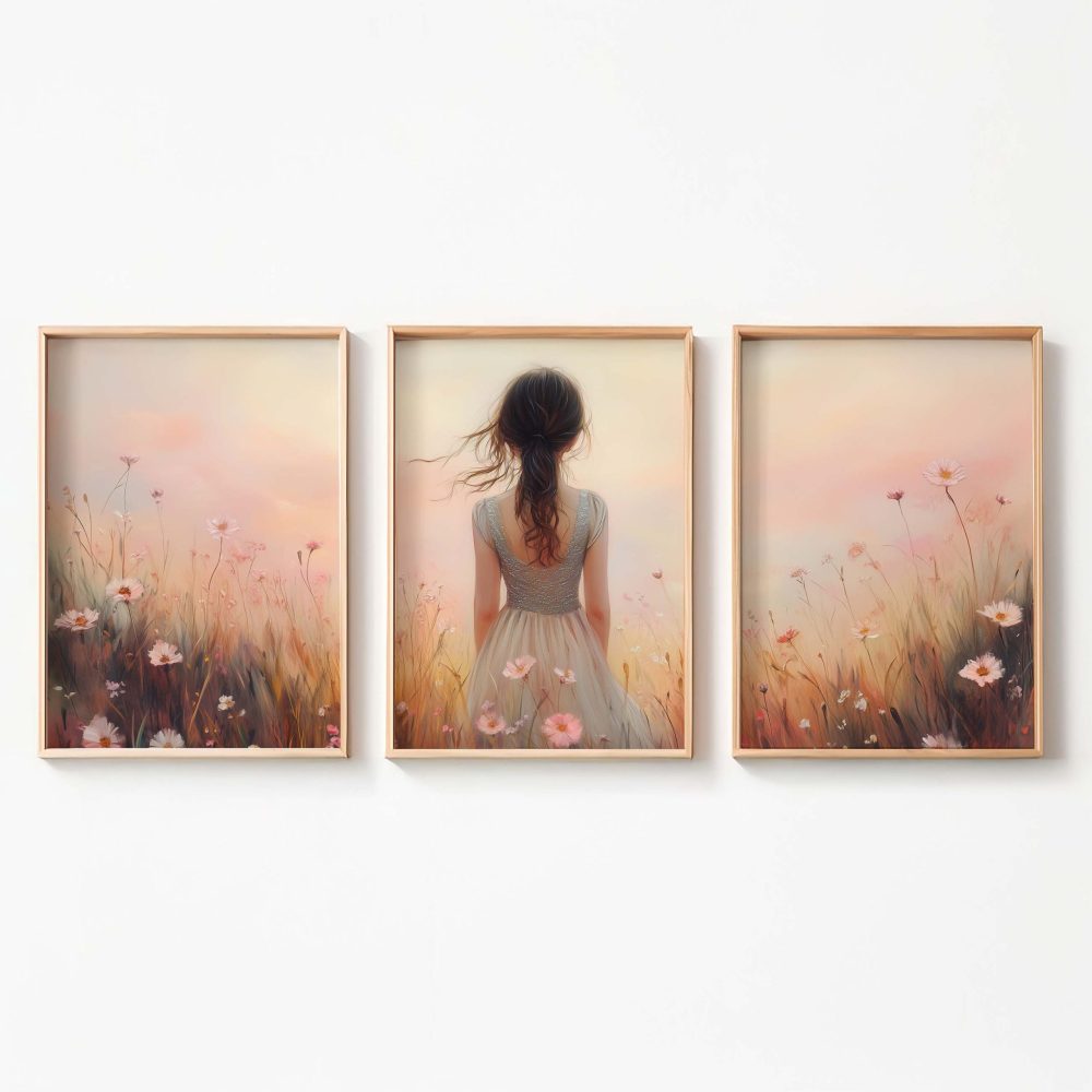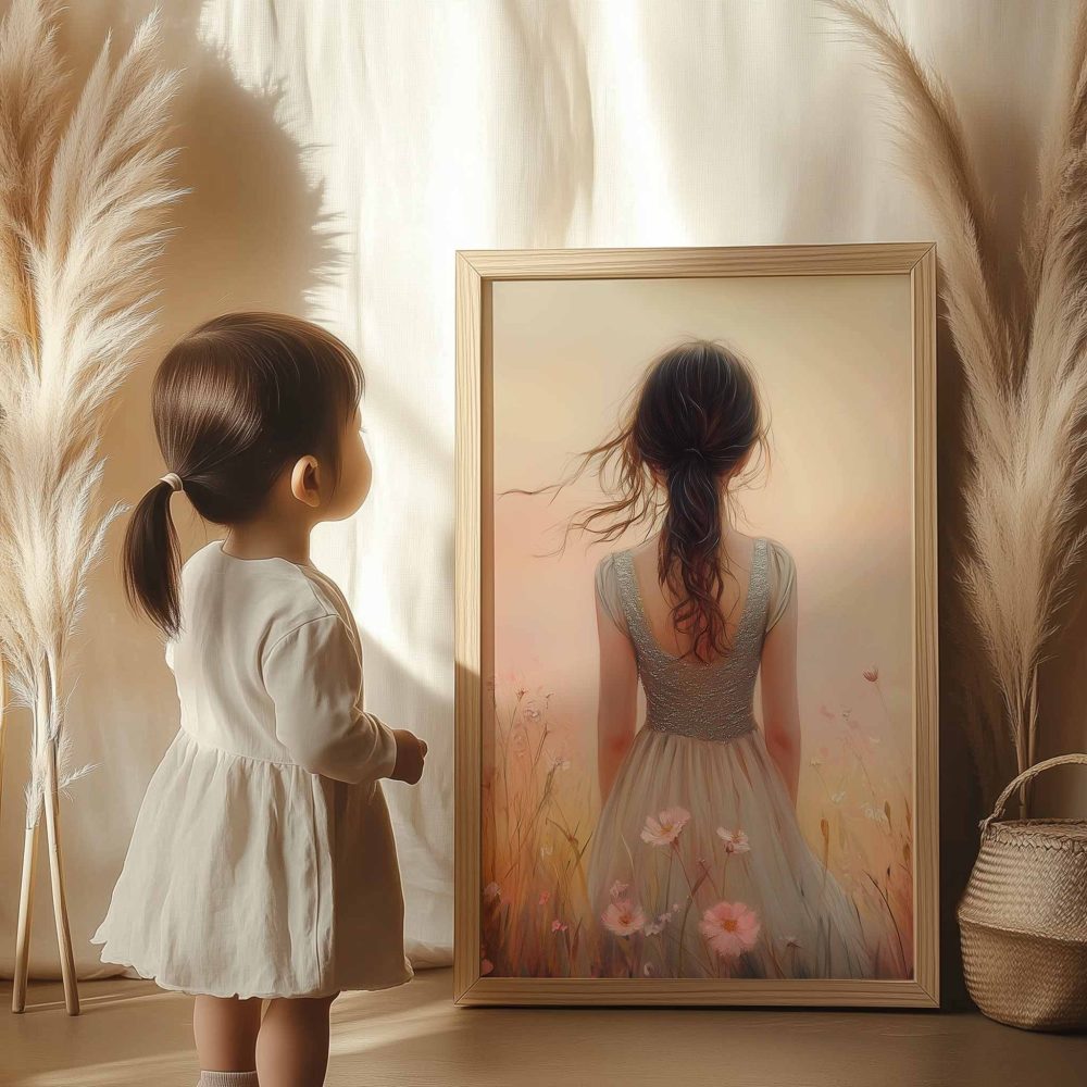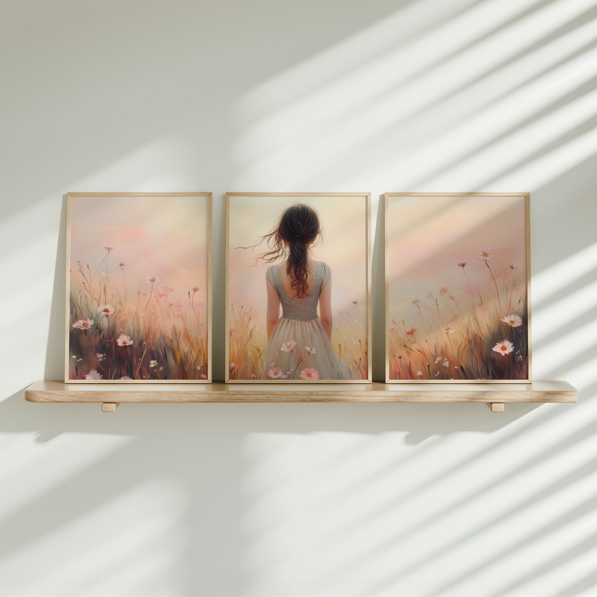Terug naar collectie / Kinderkamer posters / Bloemen posters / Betoverend bloemenveld met dromerige vrouw en kleurrijke lucht