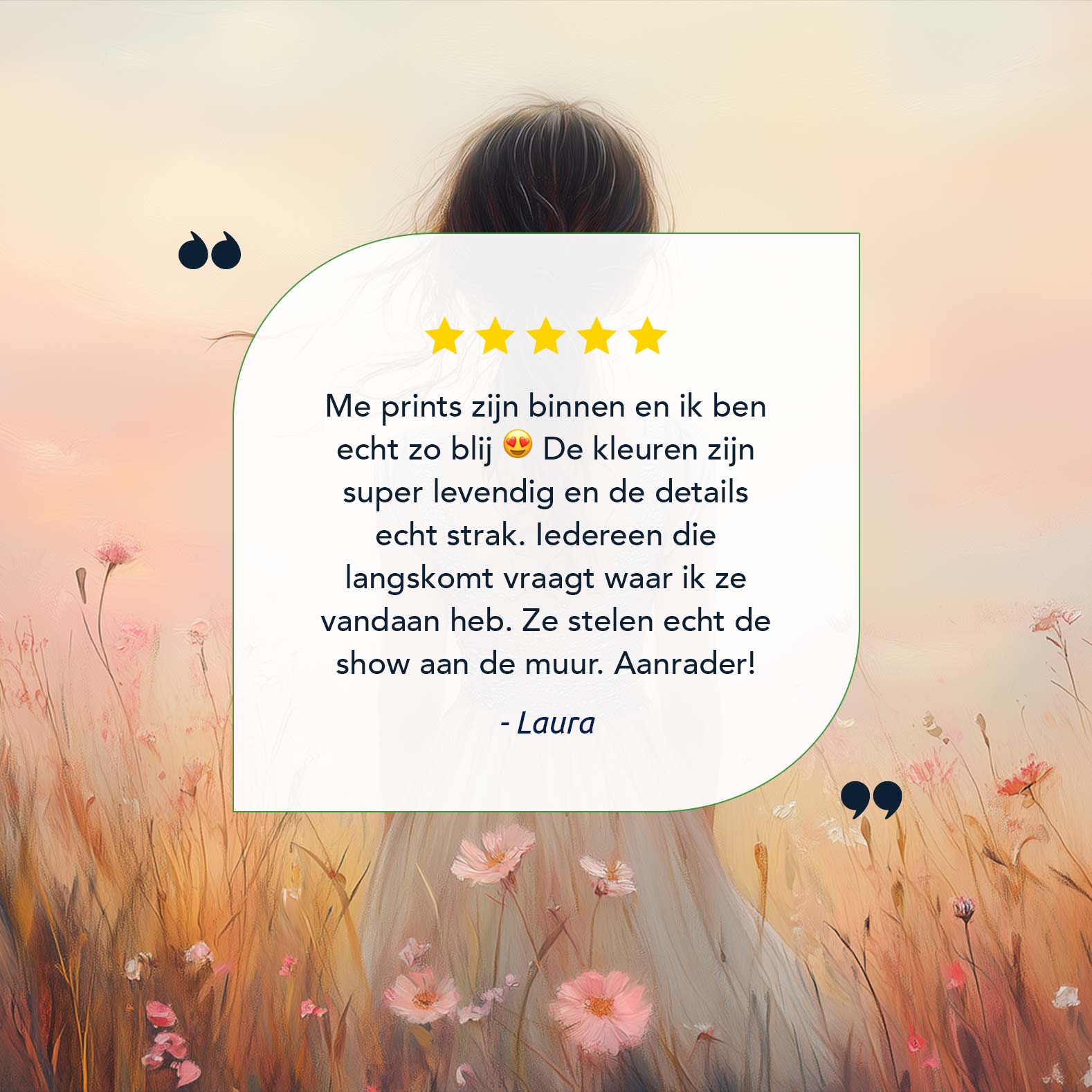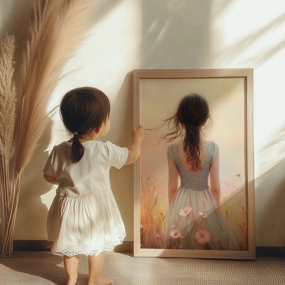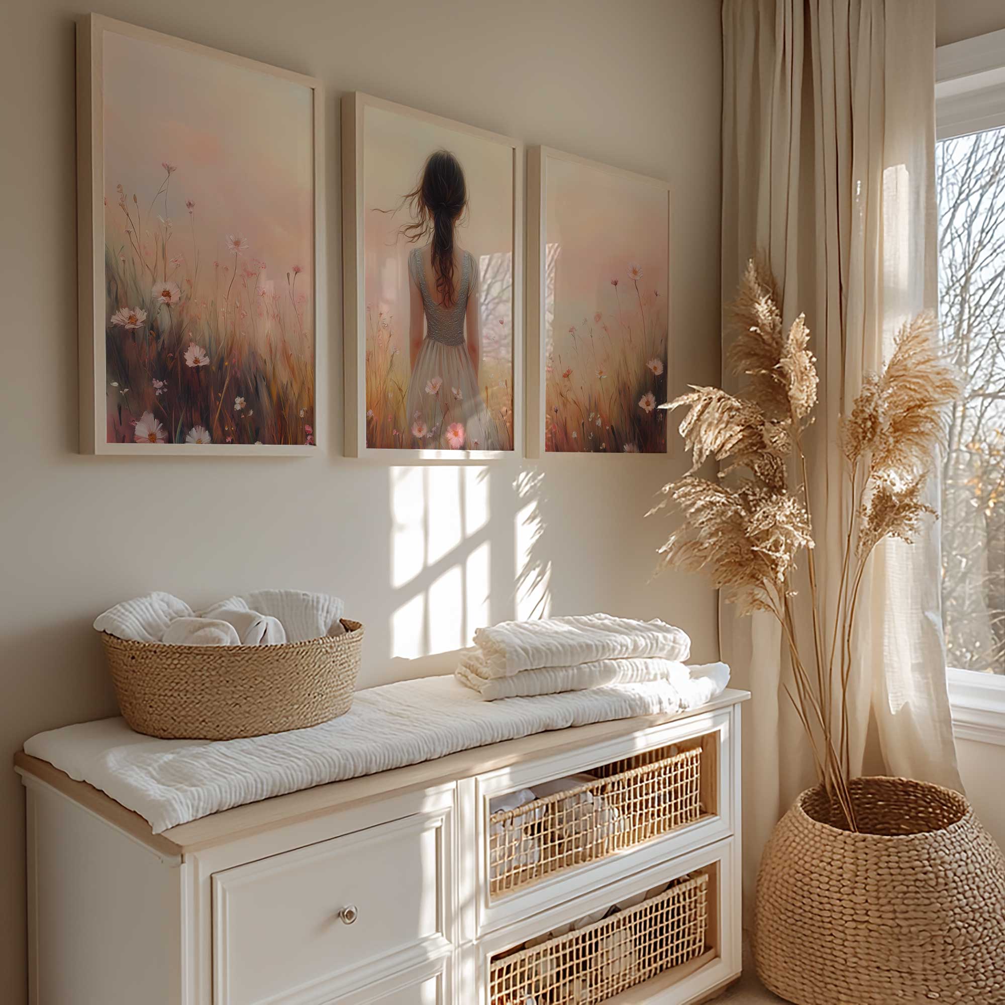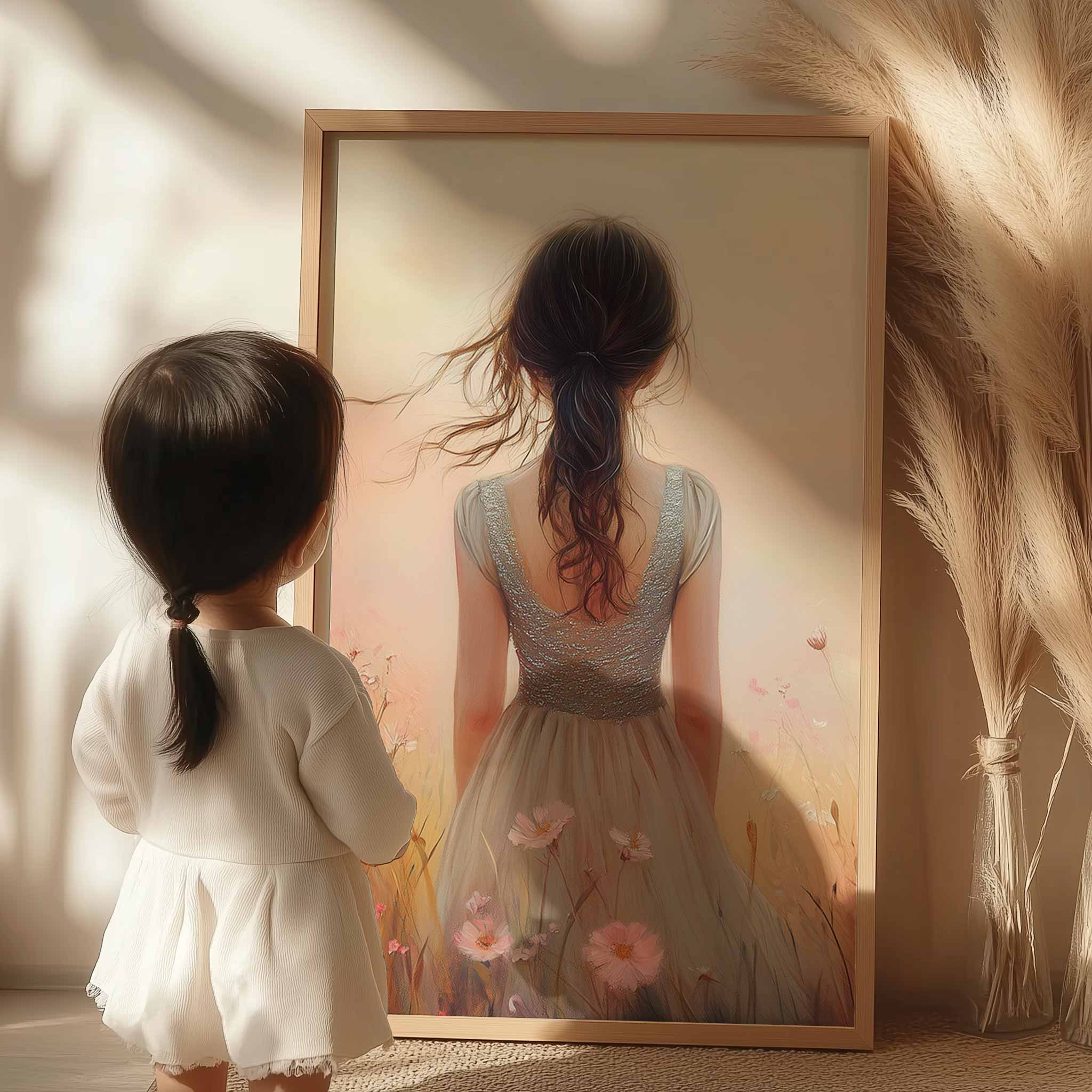 Terug naar collectie / Kinderkamer posters / Bloemen posters / Betoverend bloemenveld met dromerige vrouw en kleurrijke lucht