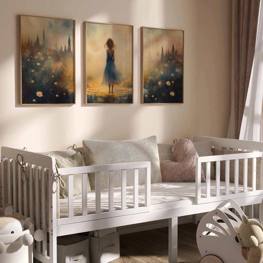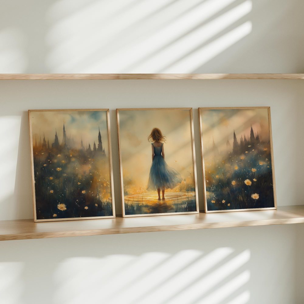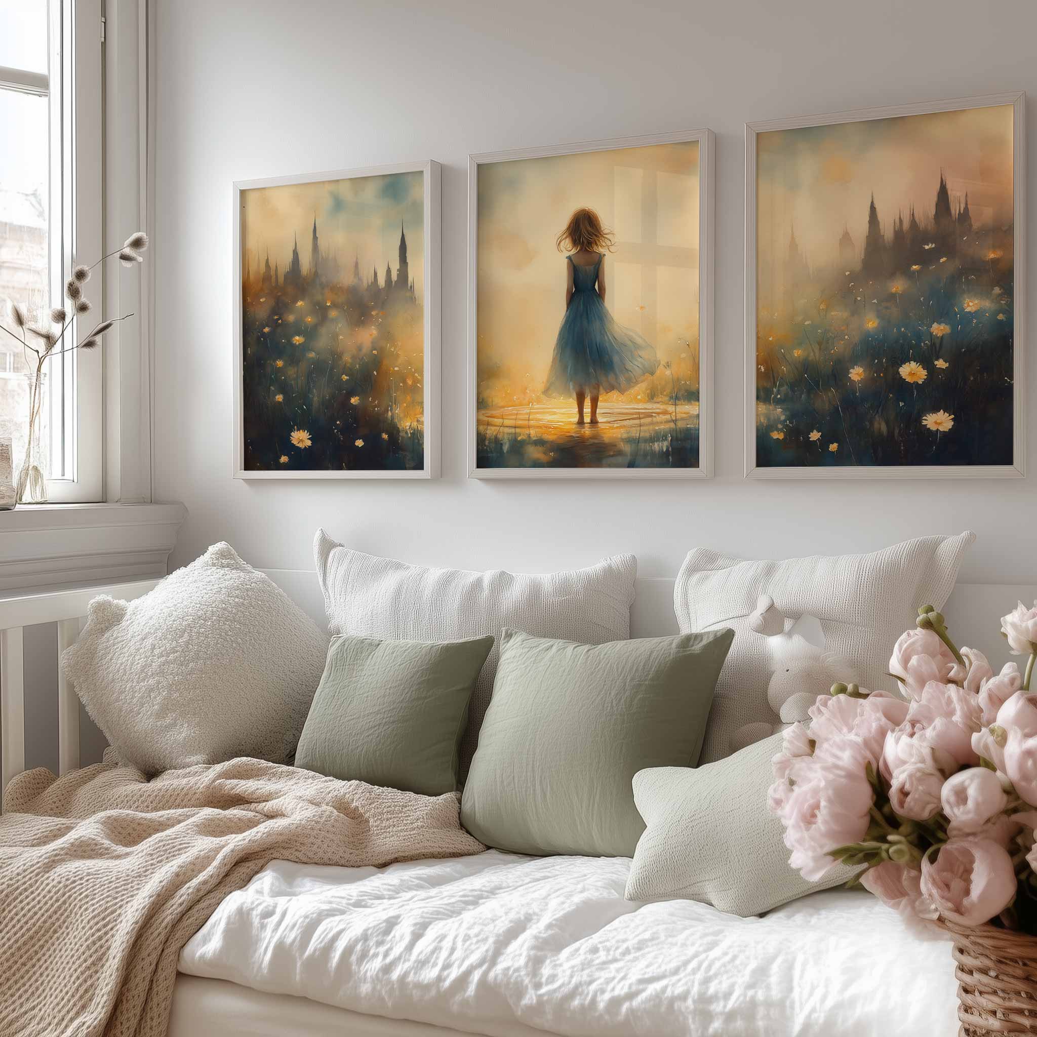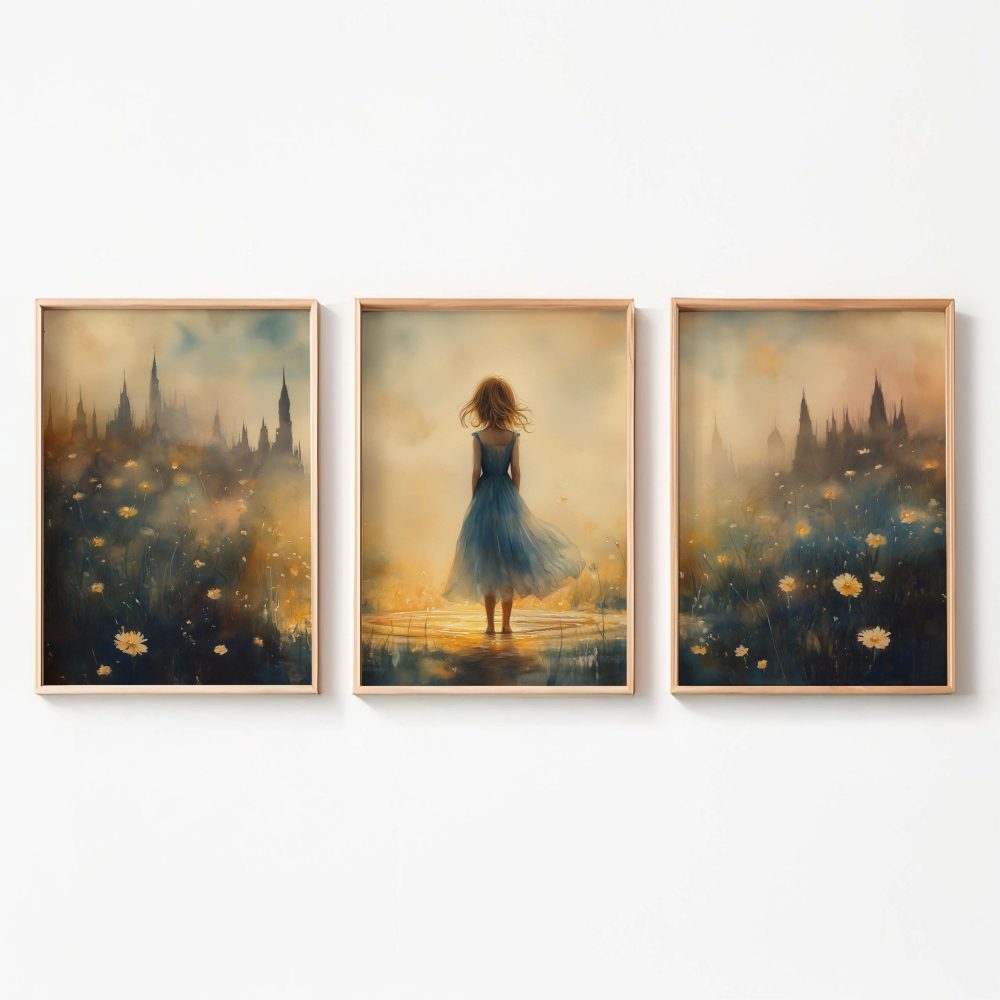Terug naar collectie / Kinderkamer posters / Bloemen posters / Betoverend bloemenveld met kasteel en blauwe jurk