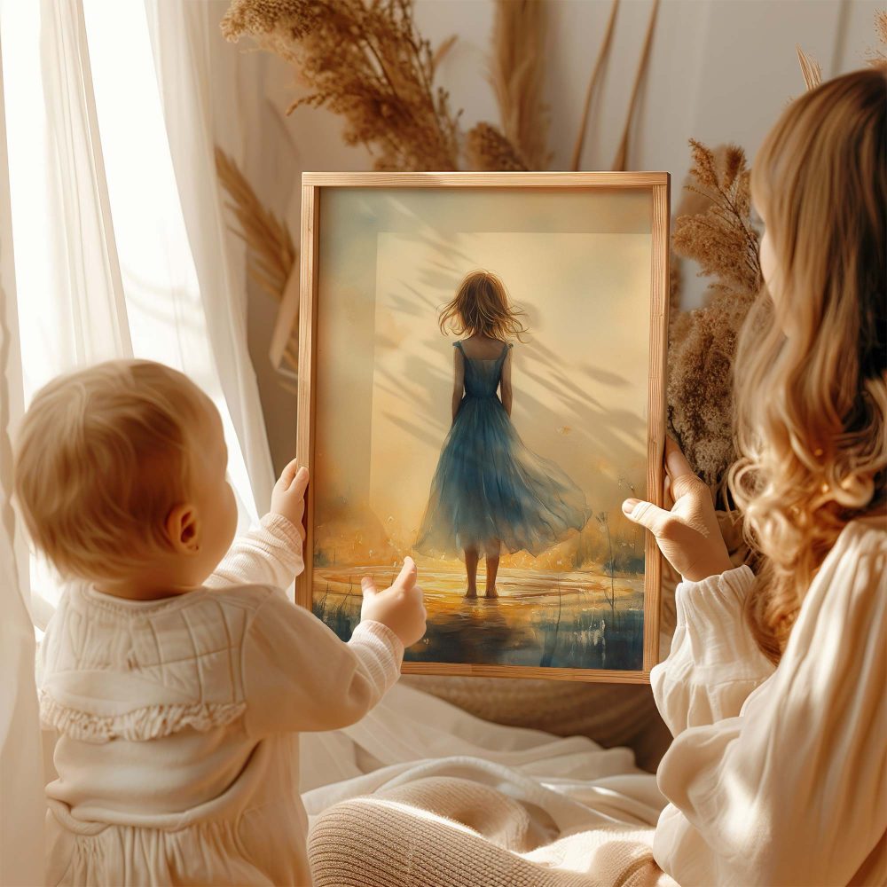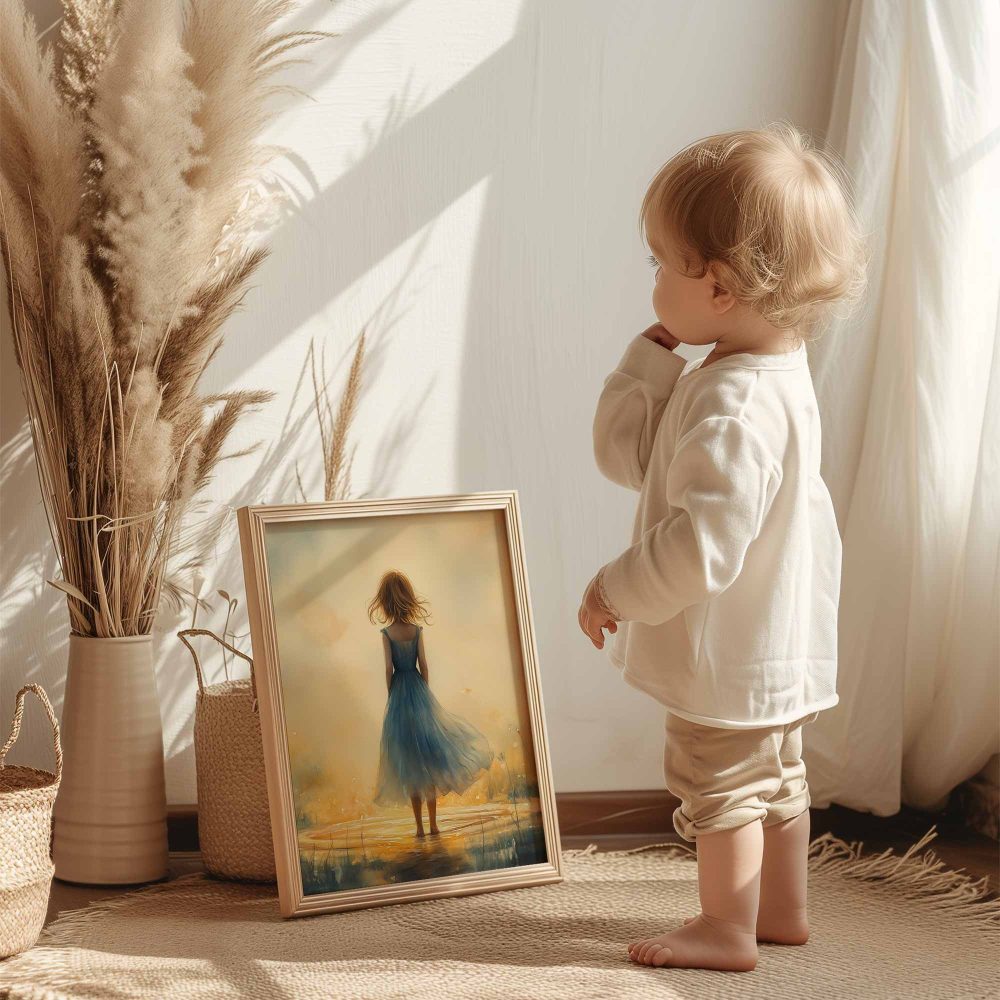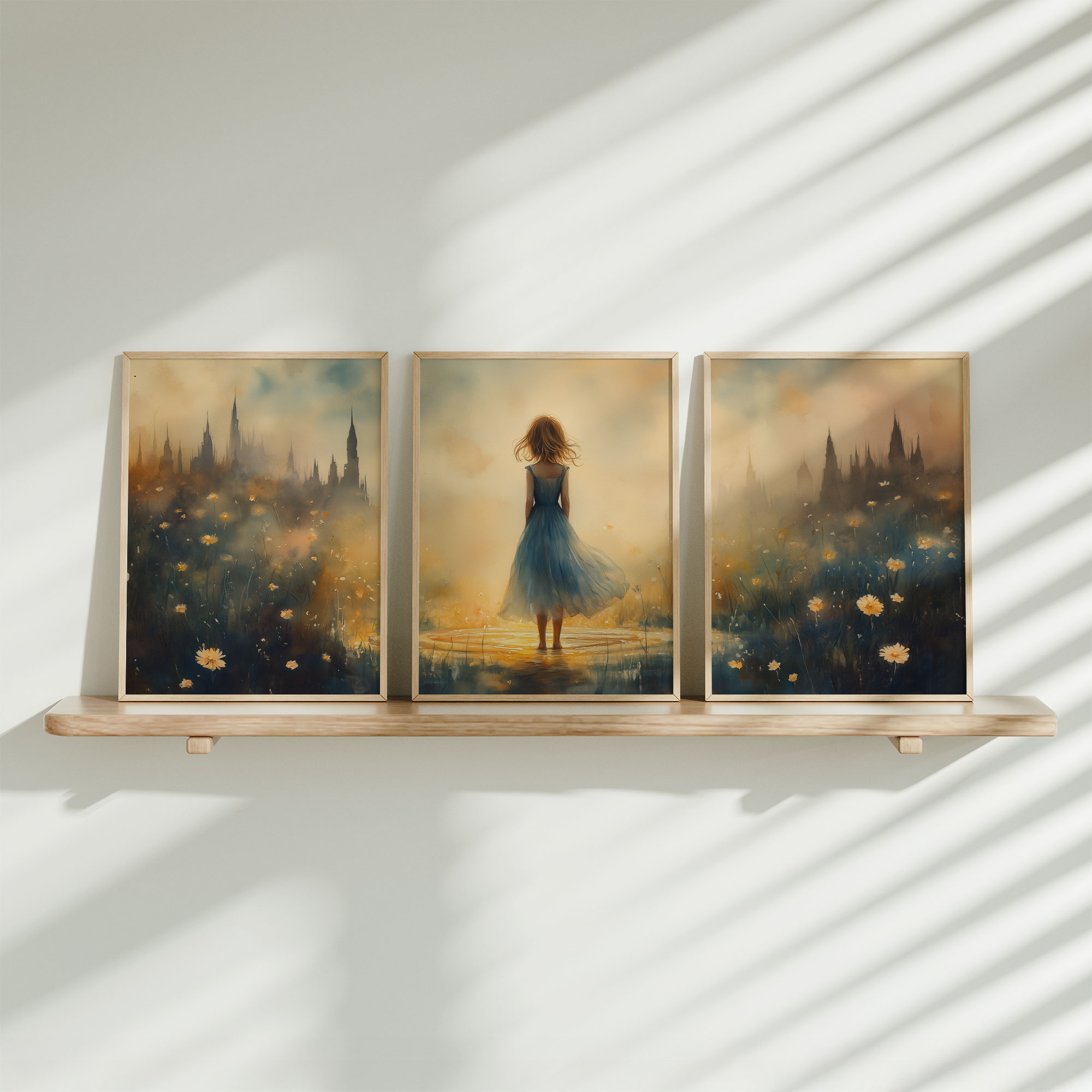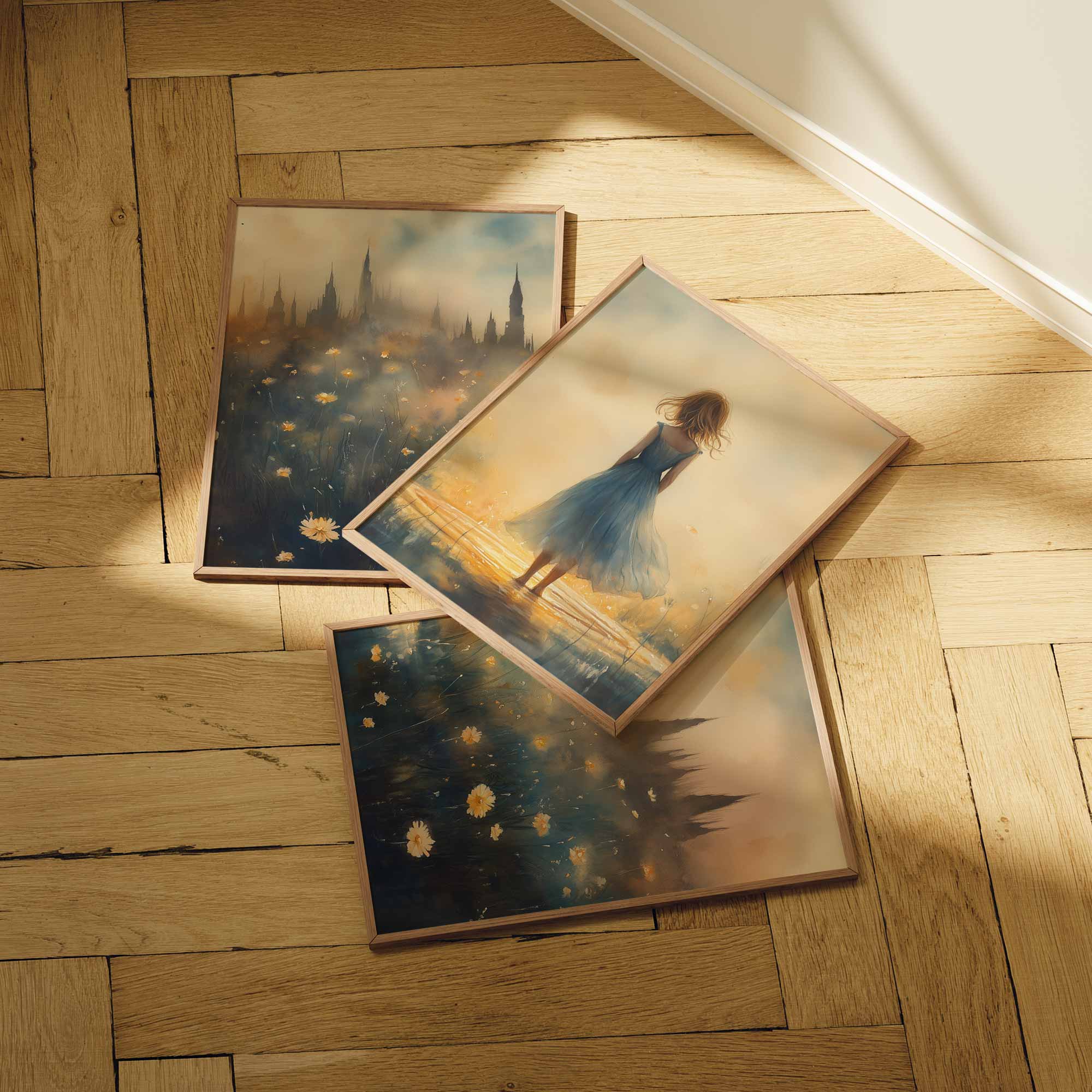 Terug naar collectie / Kinderkamer posters / Bloemen posters / Betoverend bloemenveld met kasteel en blauwe jurk
