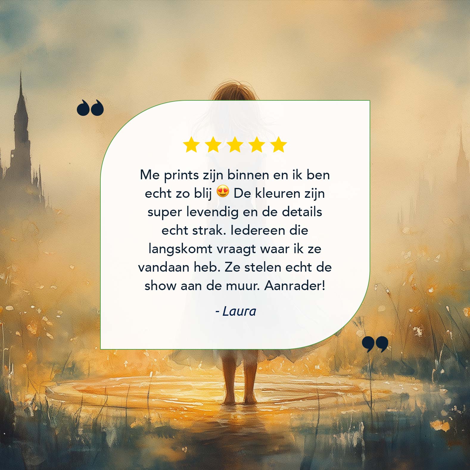 Betoverend bloemenveld met kasteel en blauwe jurk