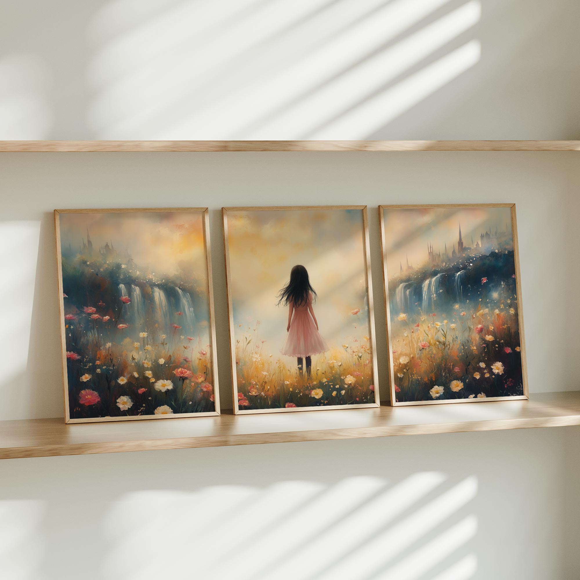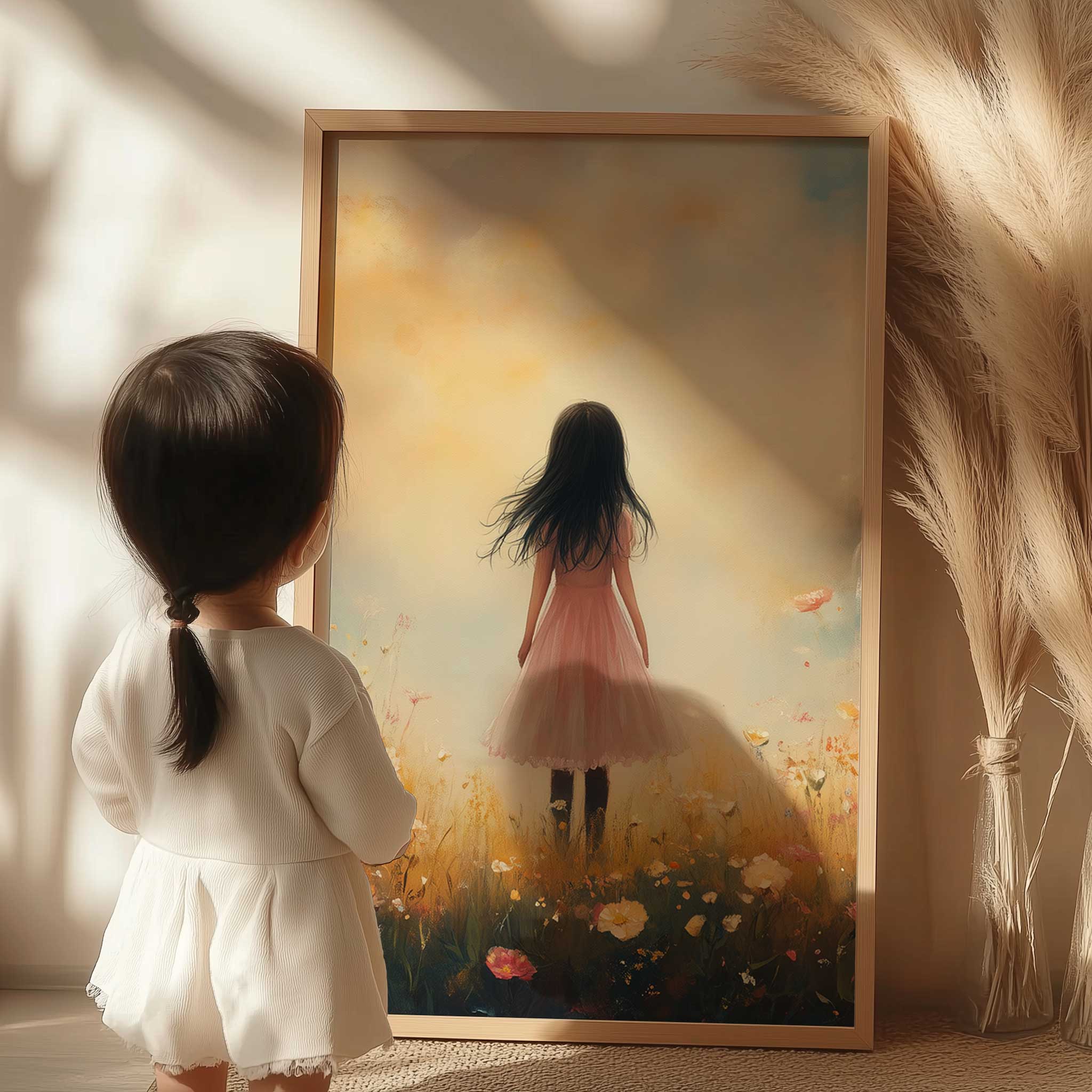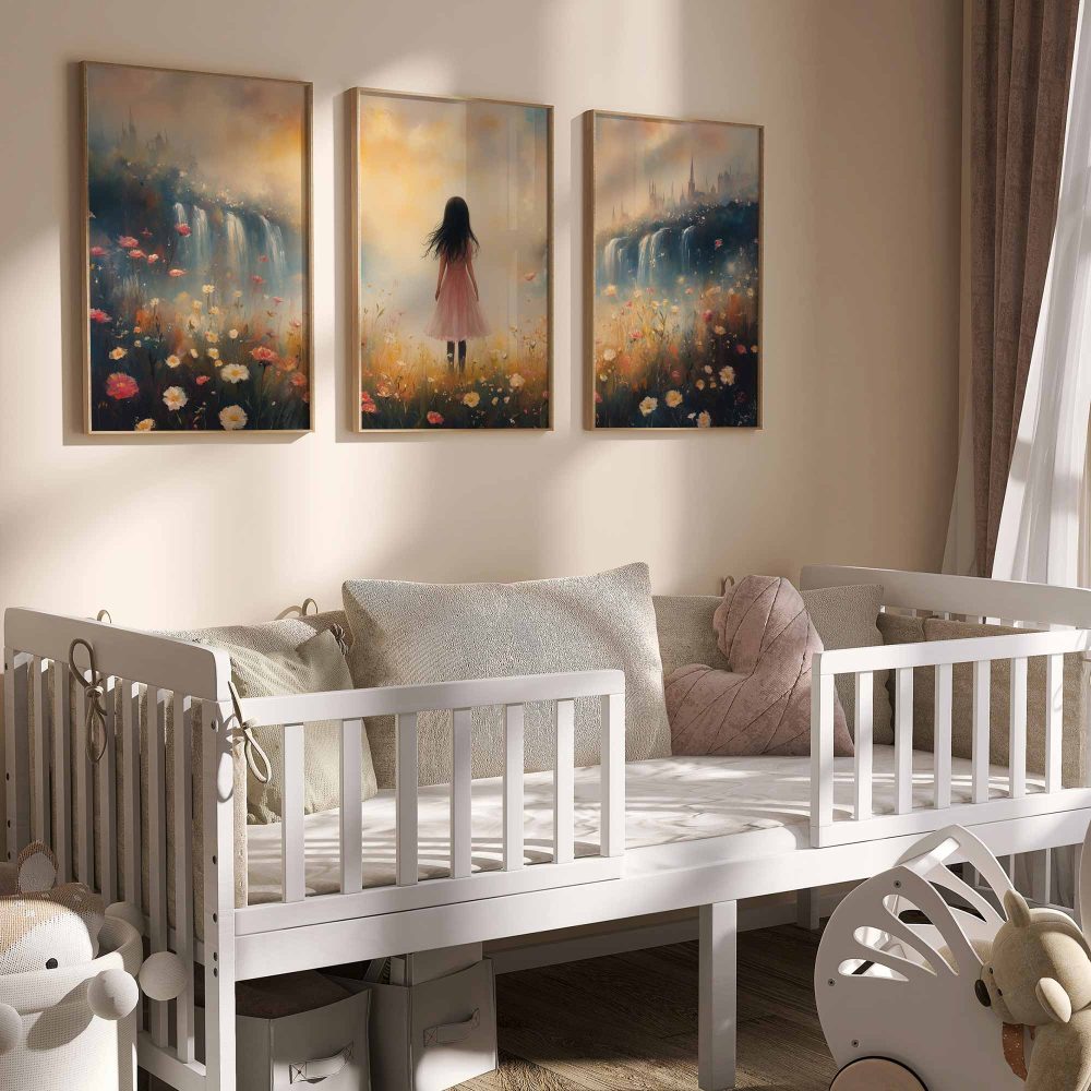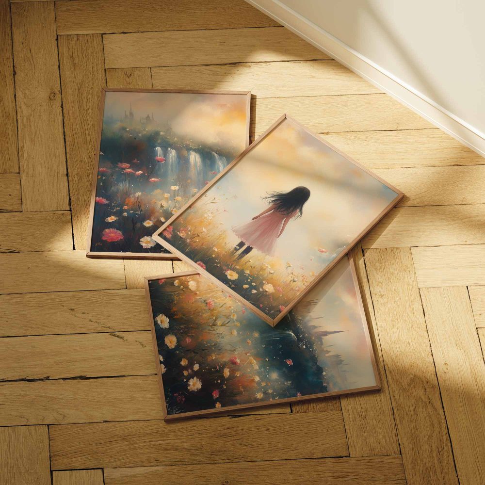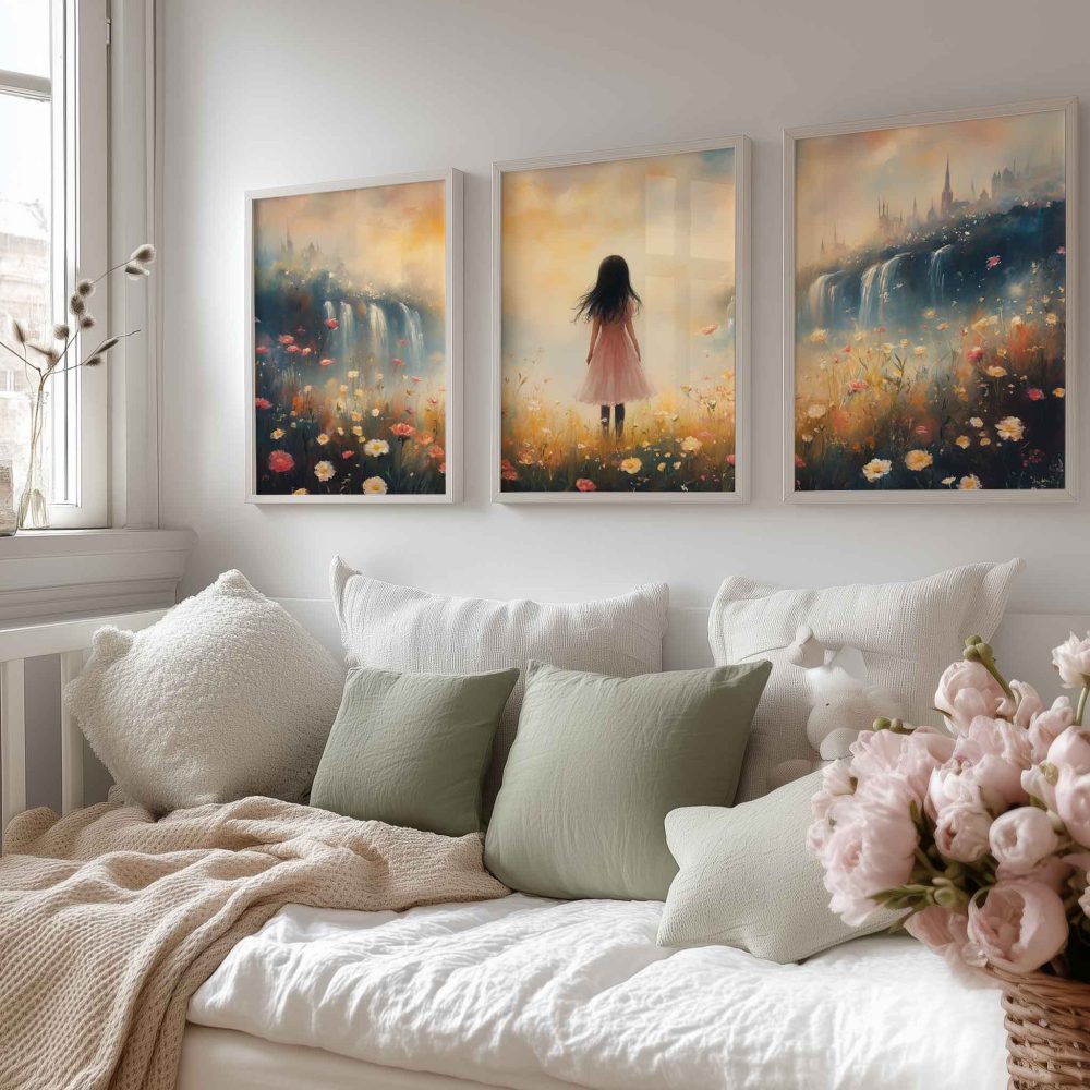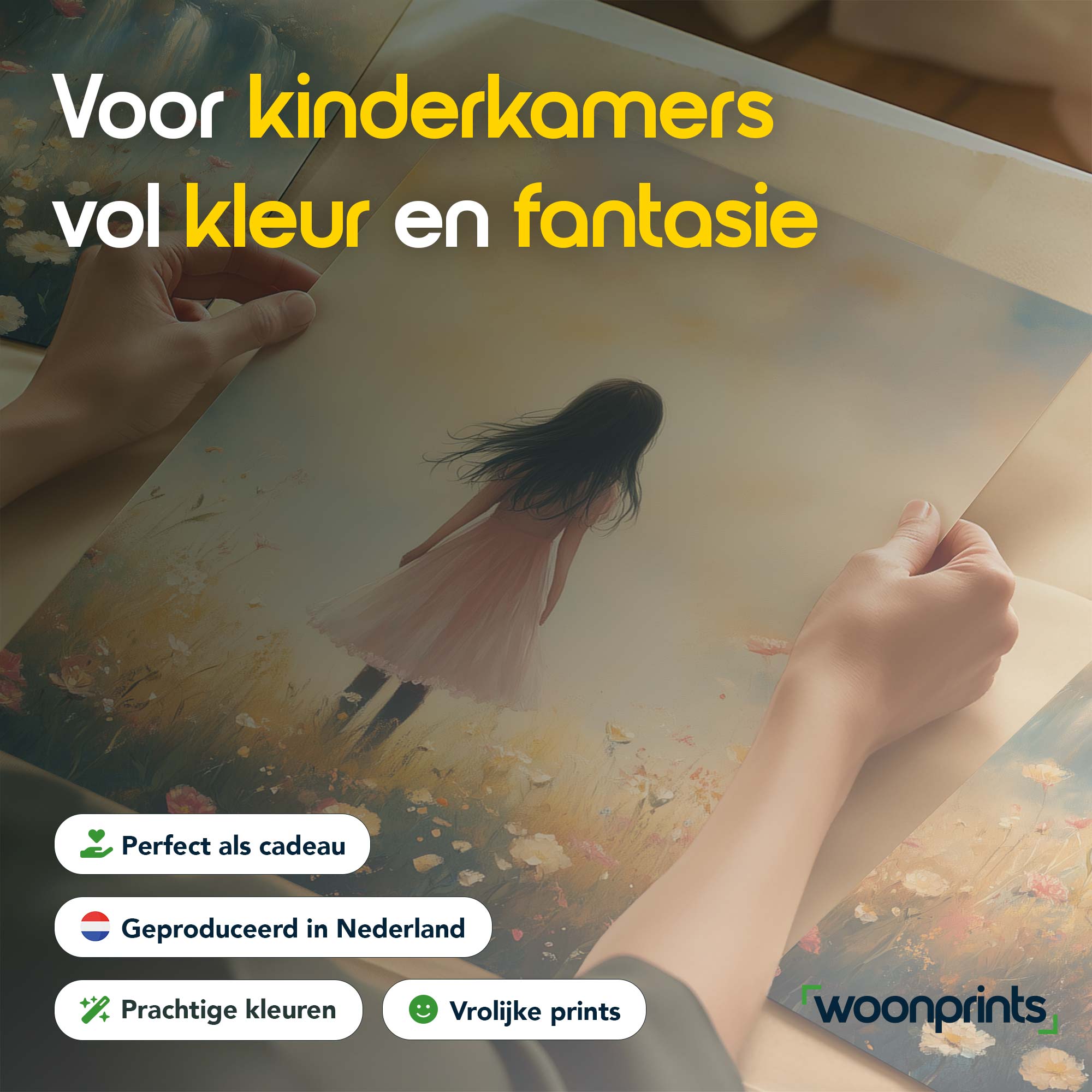 Terug naar collectie / Kinderkamer posters / Bloemen posters / Betoverend bloemenveld met kasteel en roze jurk