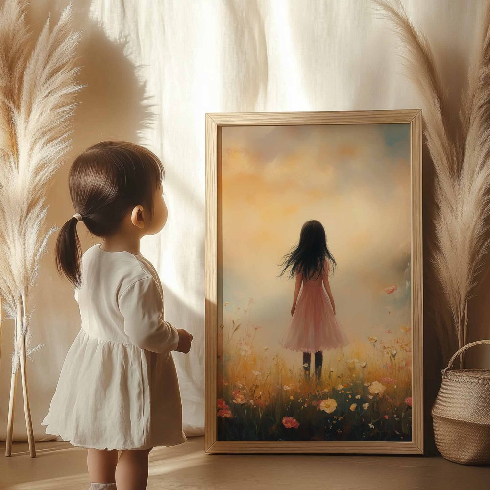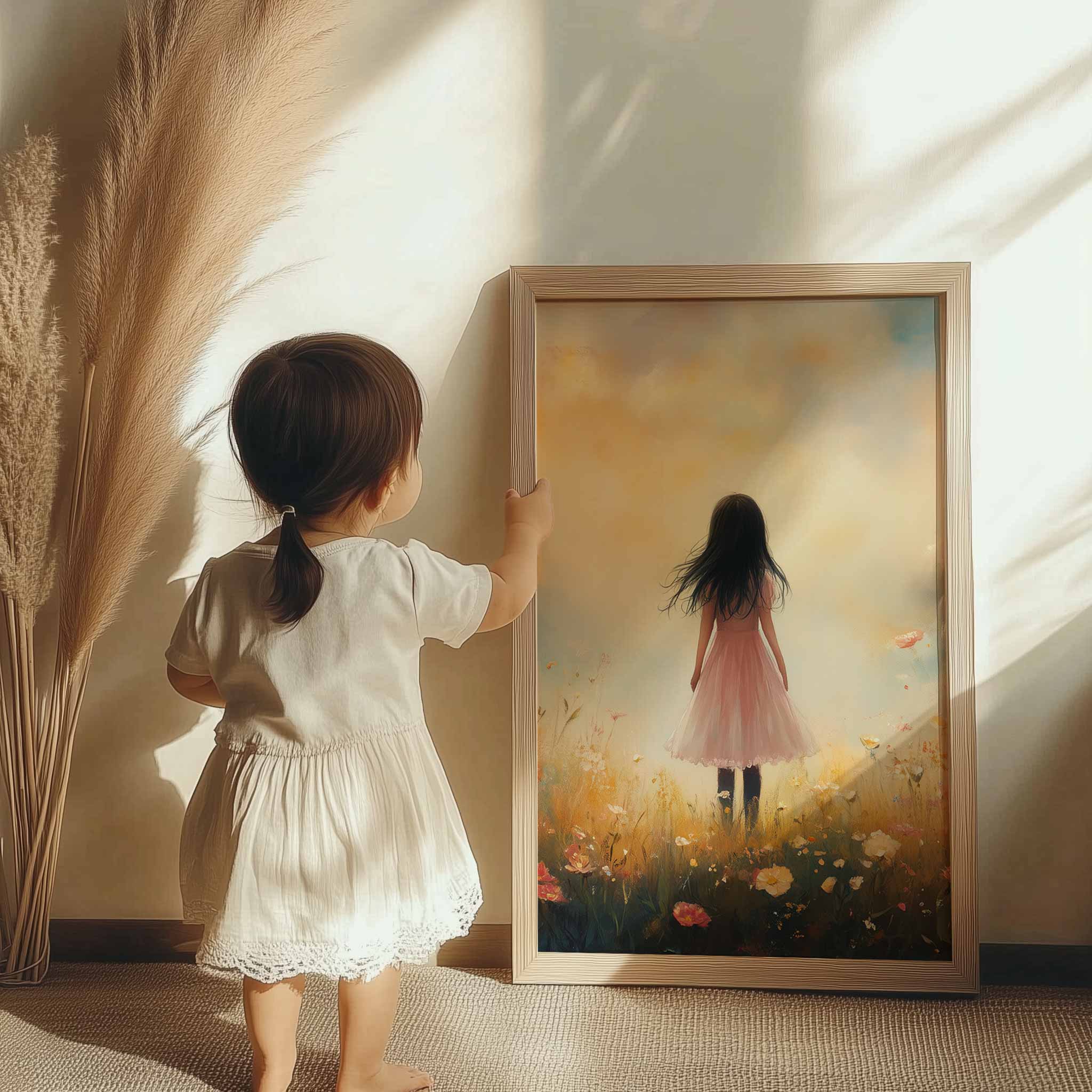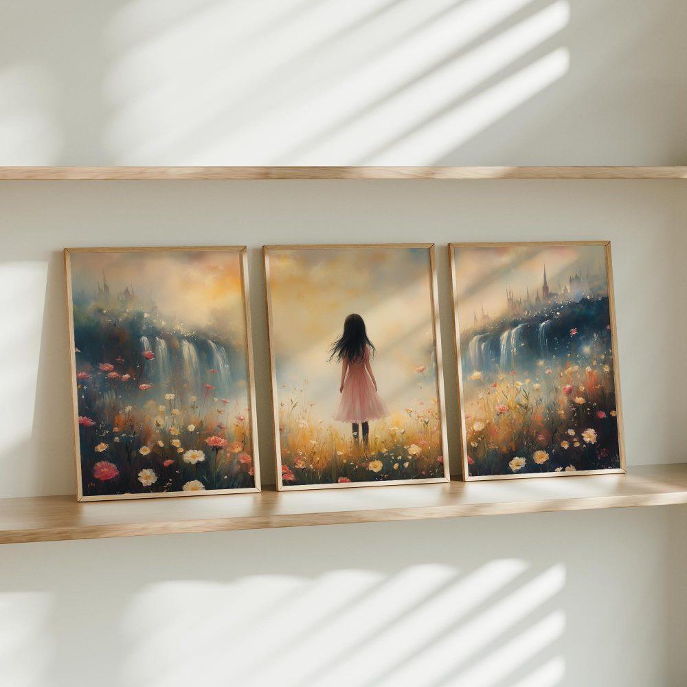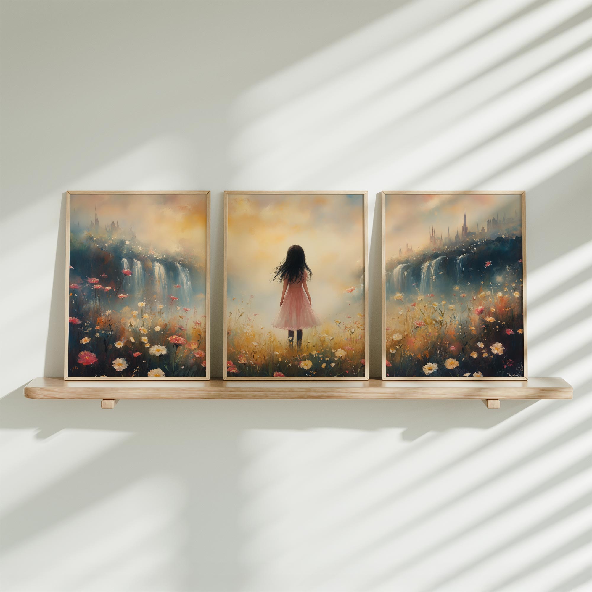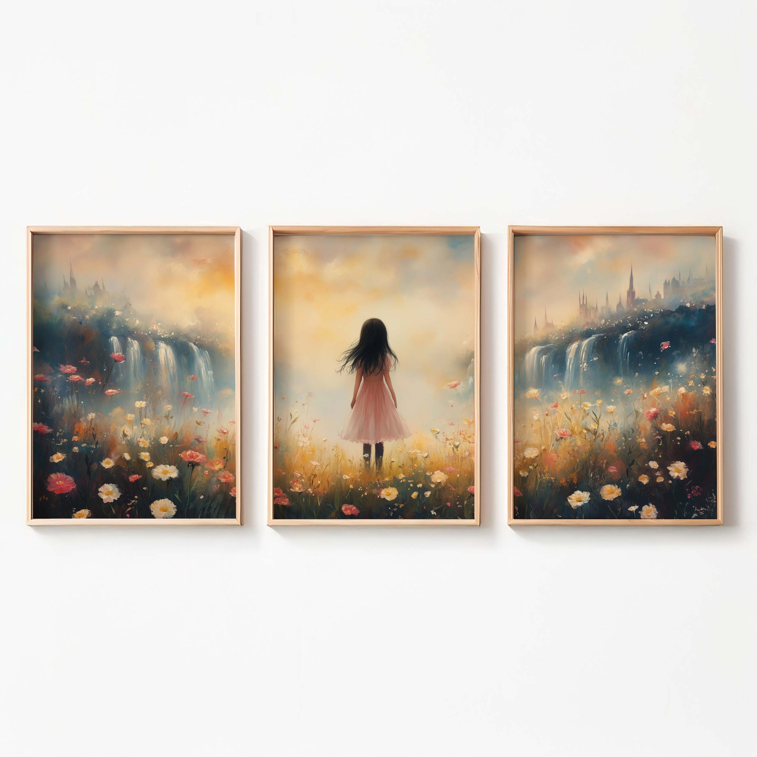 Terug naar collectie / Kinderkamer posters / Bloemen posters / Betoverend bloemenveld met kasteel en roze jurk