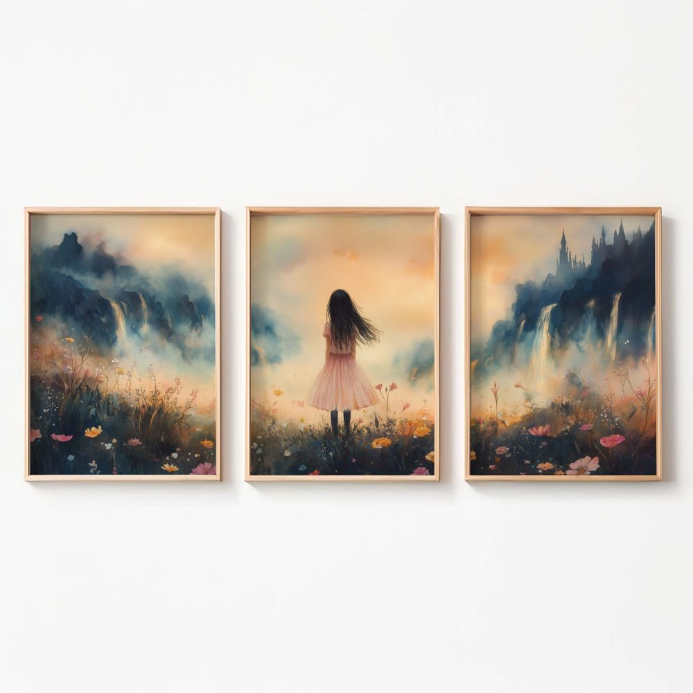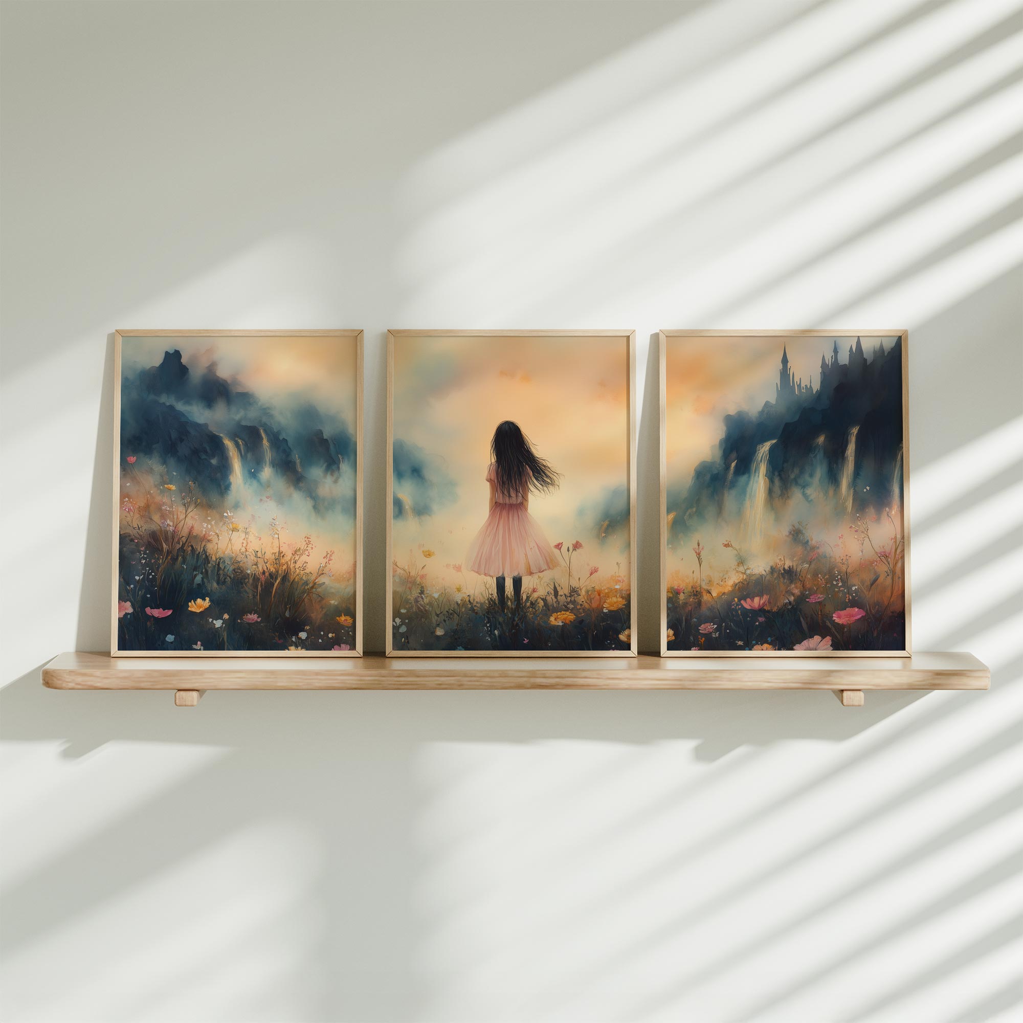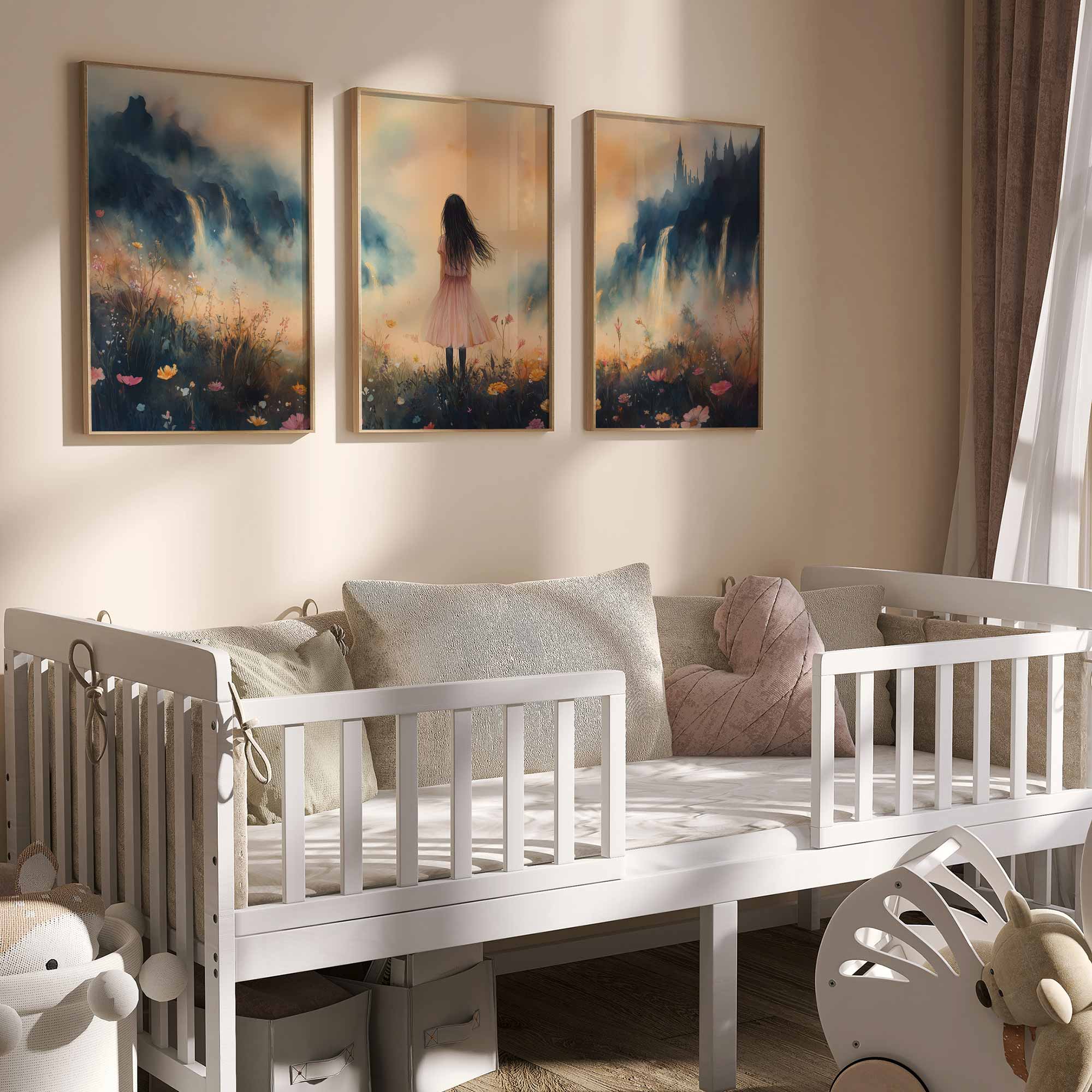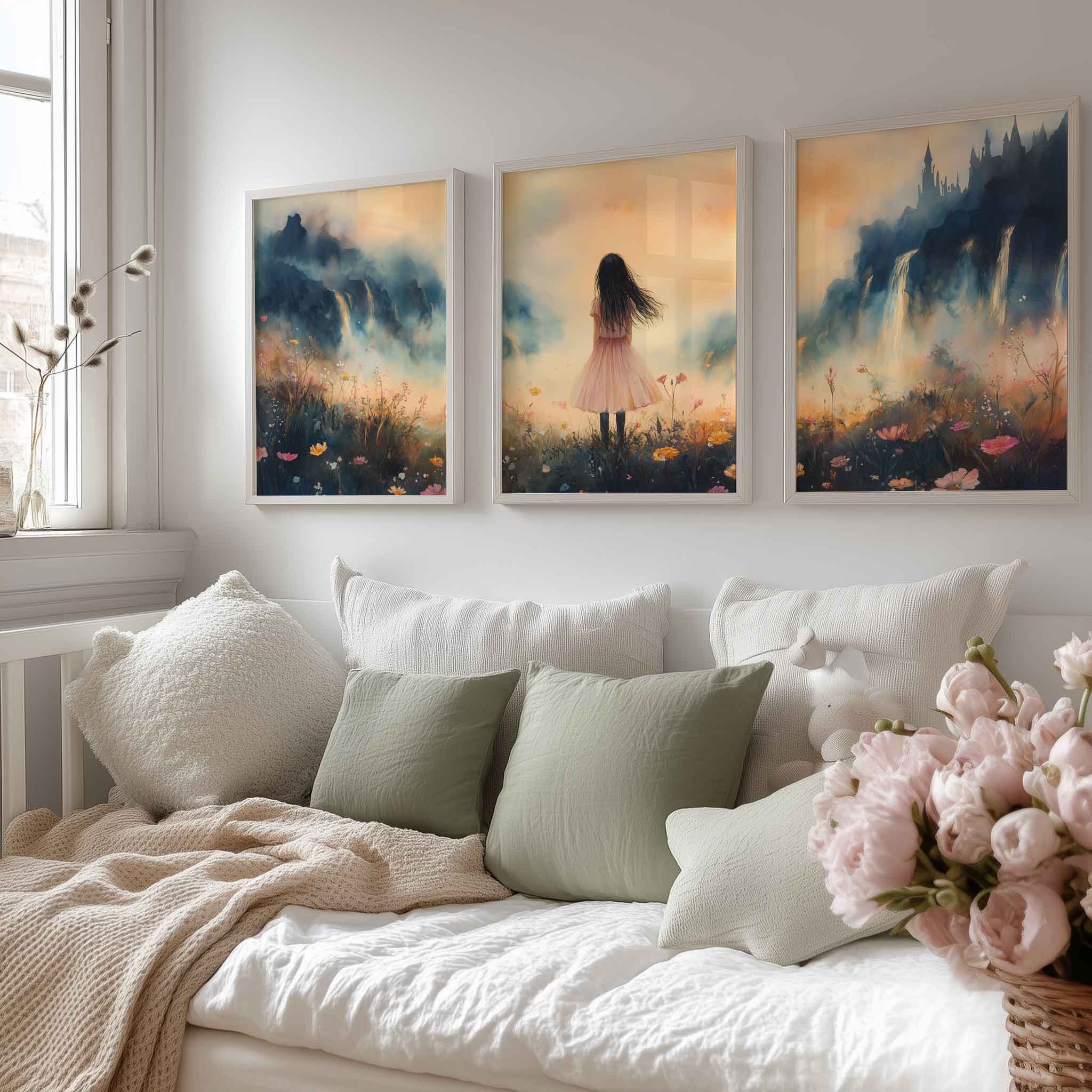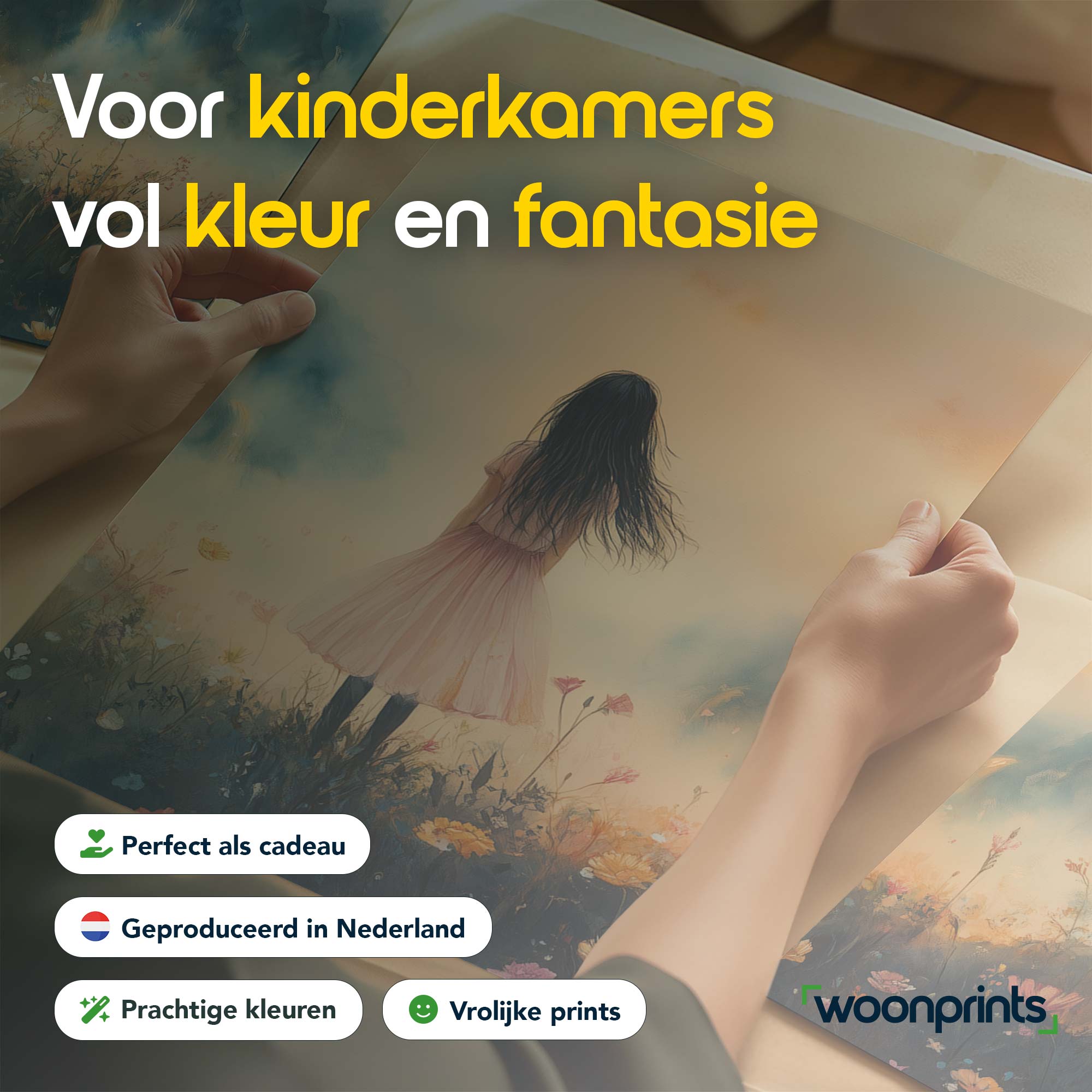 Terug naar collectie / Kinderkamer posters / Avontuurlijk posters / Betoverend bloemenveld met kasteel en roze jurk
