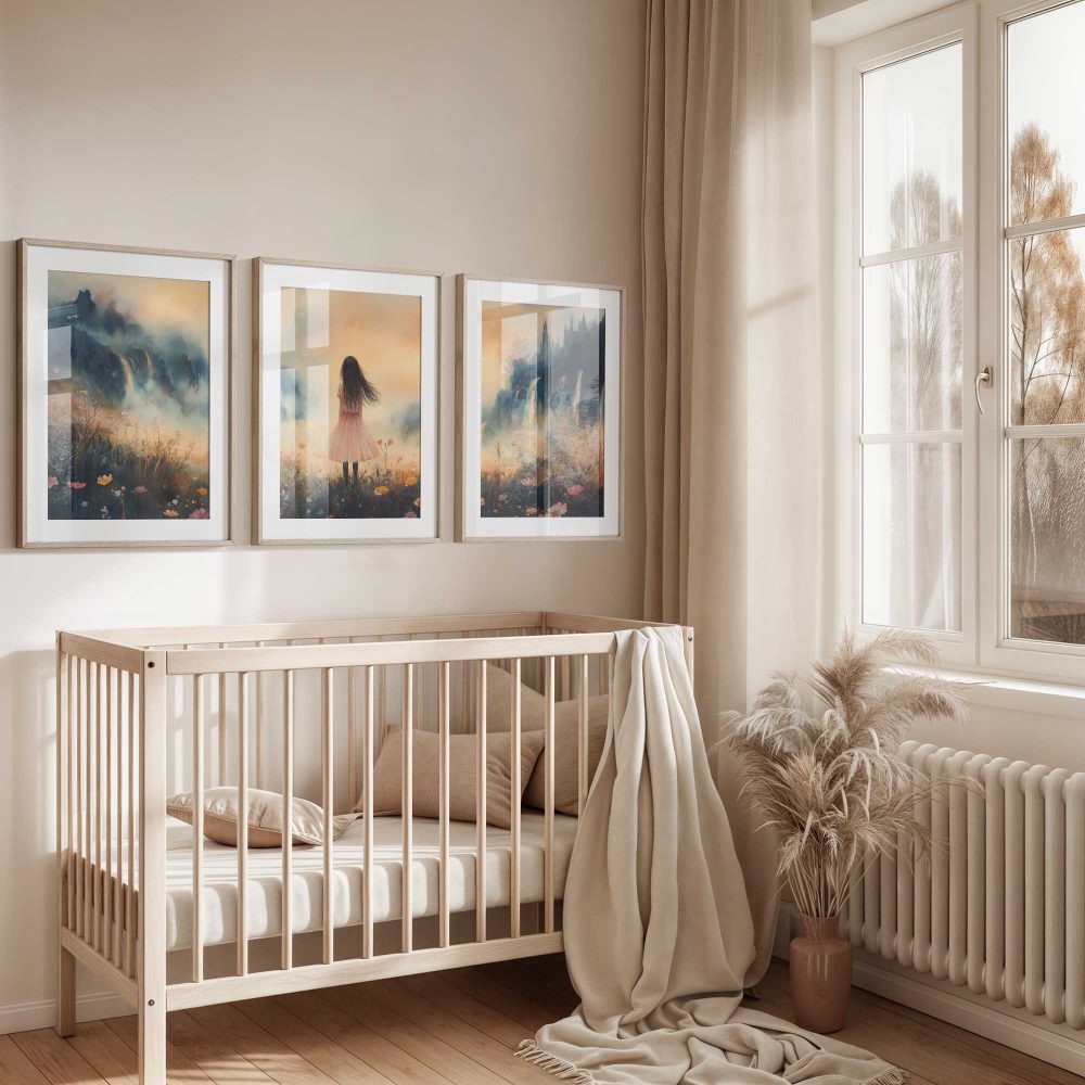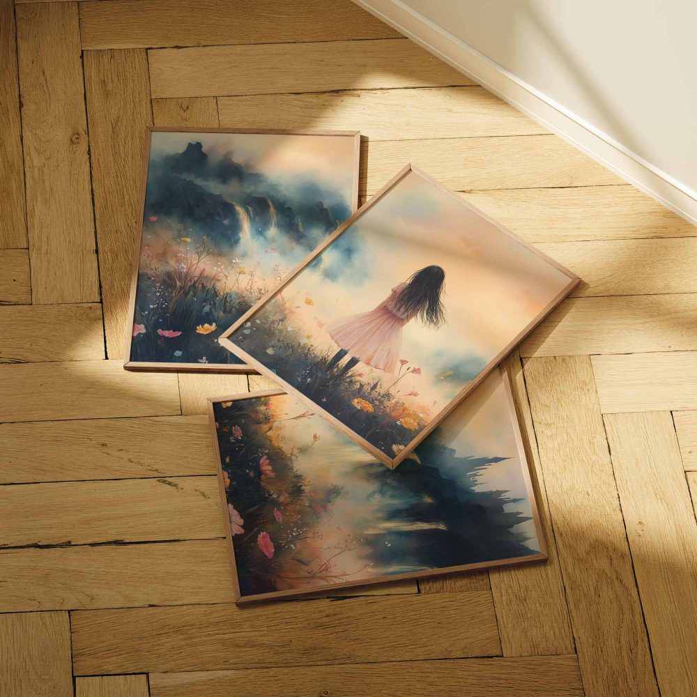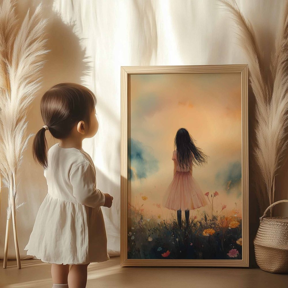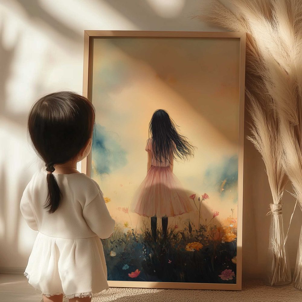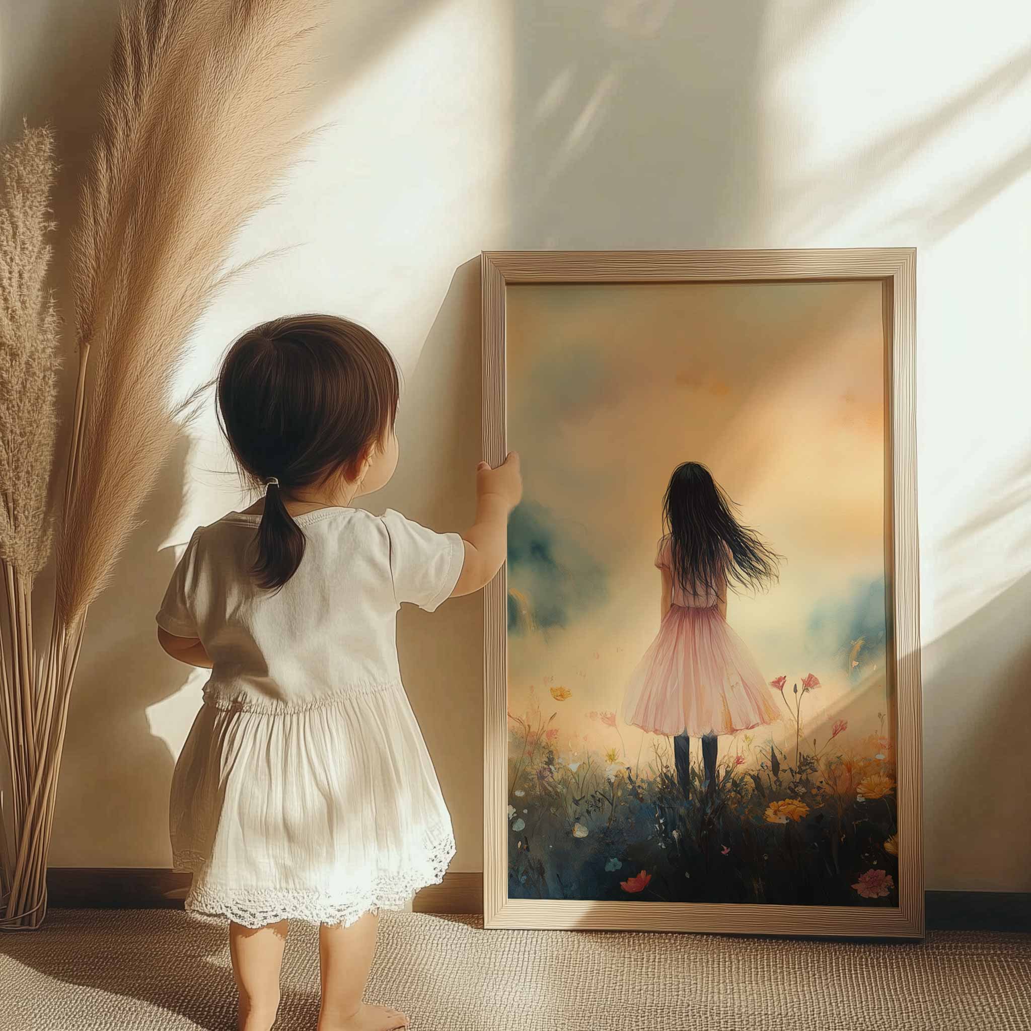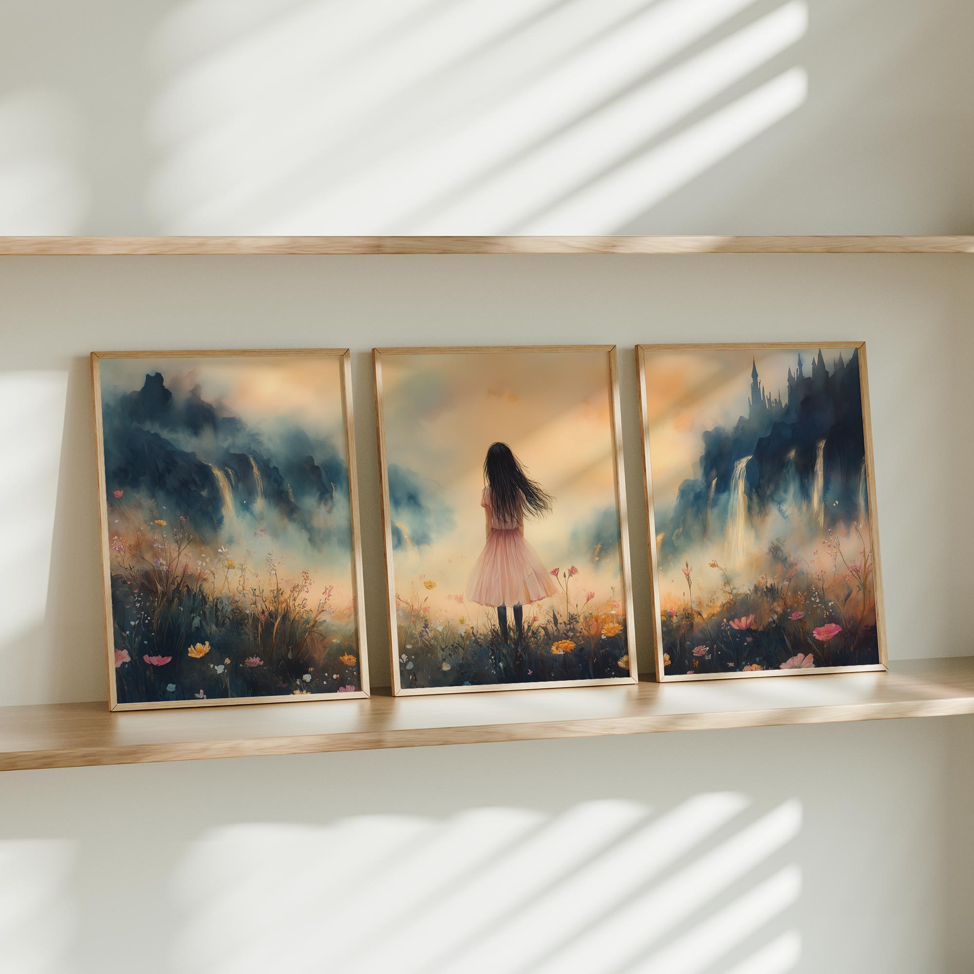 Terug naar collectie / Kinderkamer posters / Avontuurlijk posters / Betoverend bloemenveld met kasteel en roze jurk