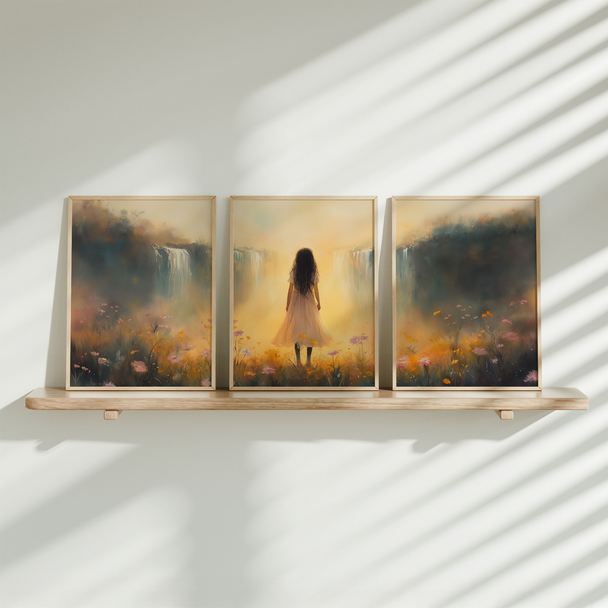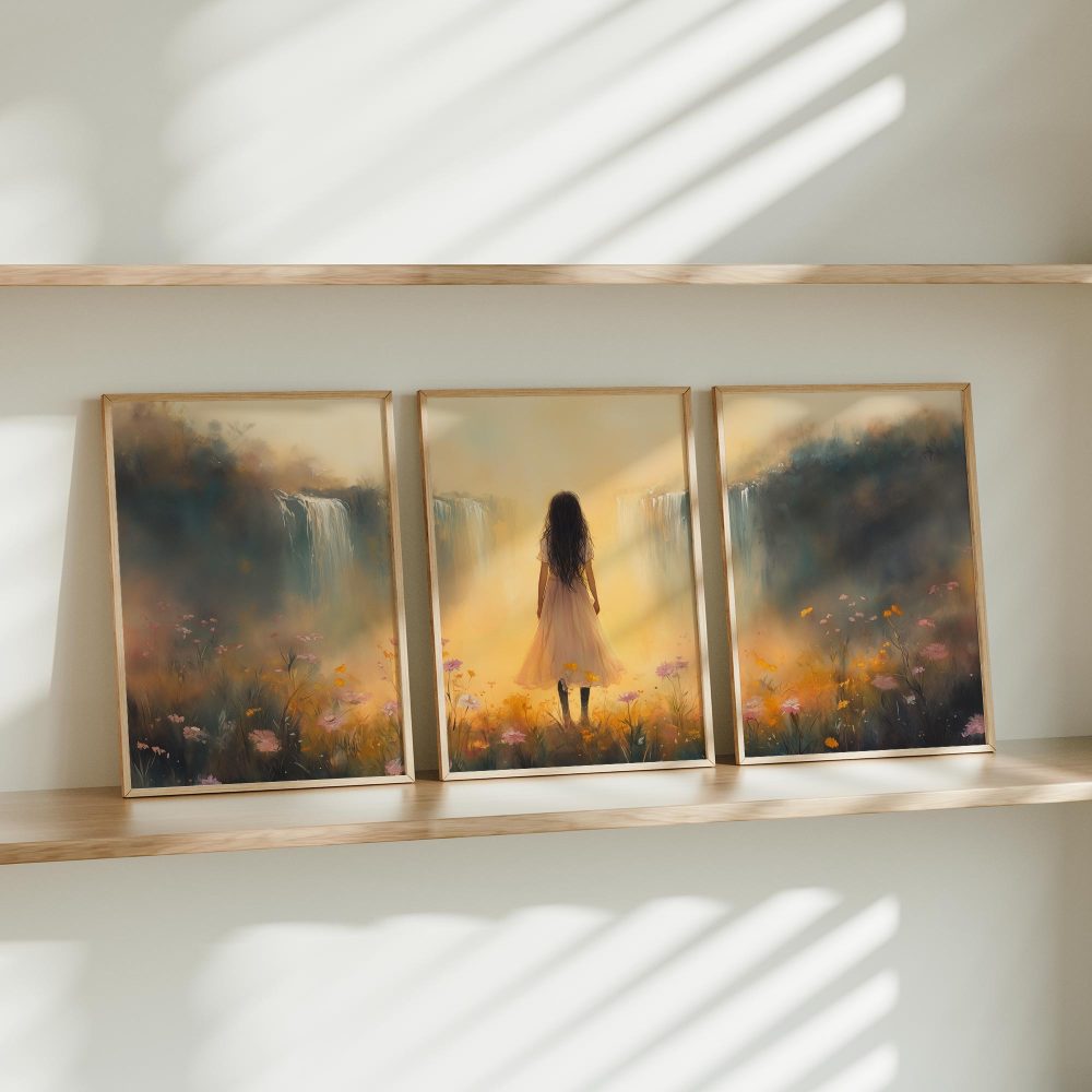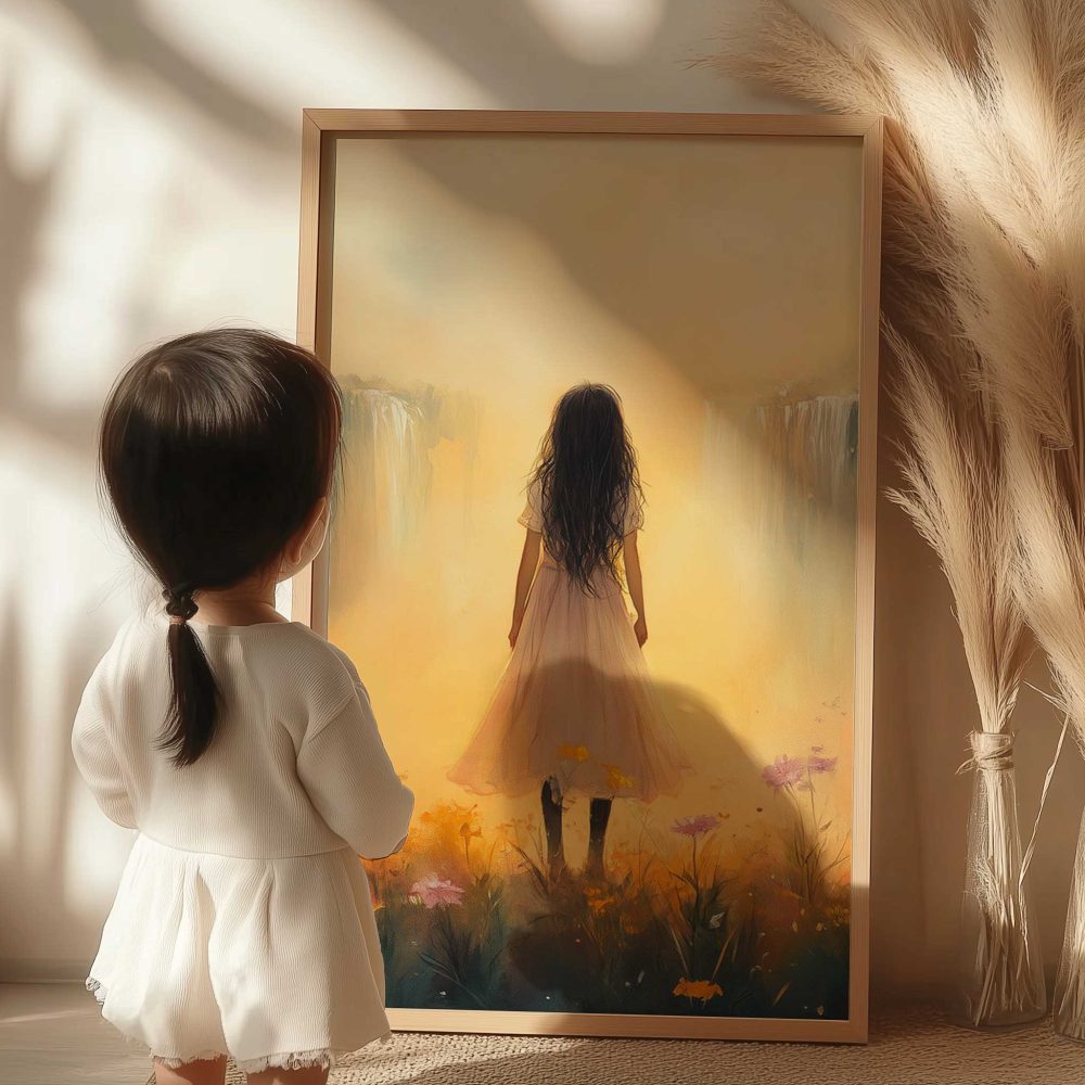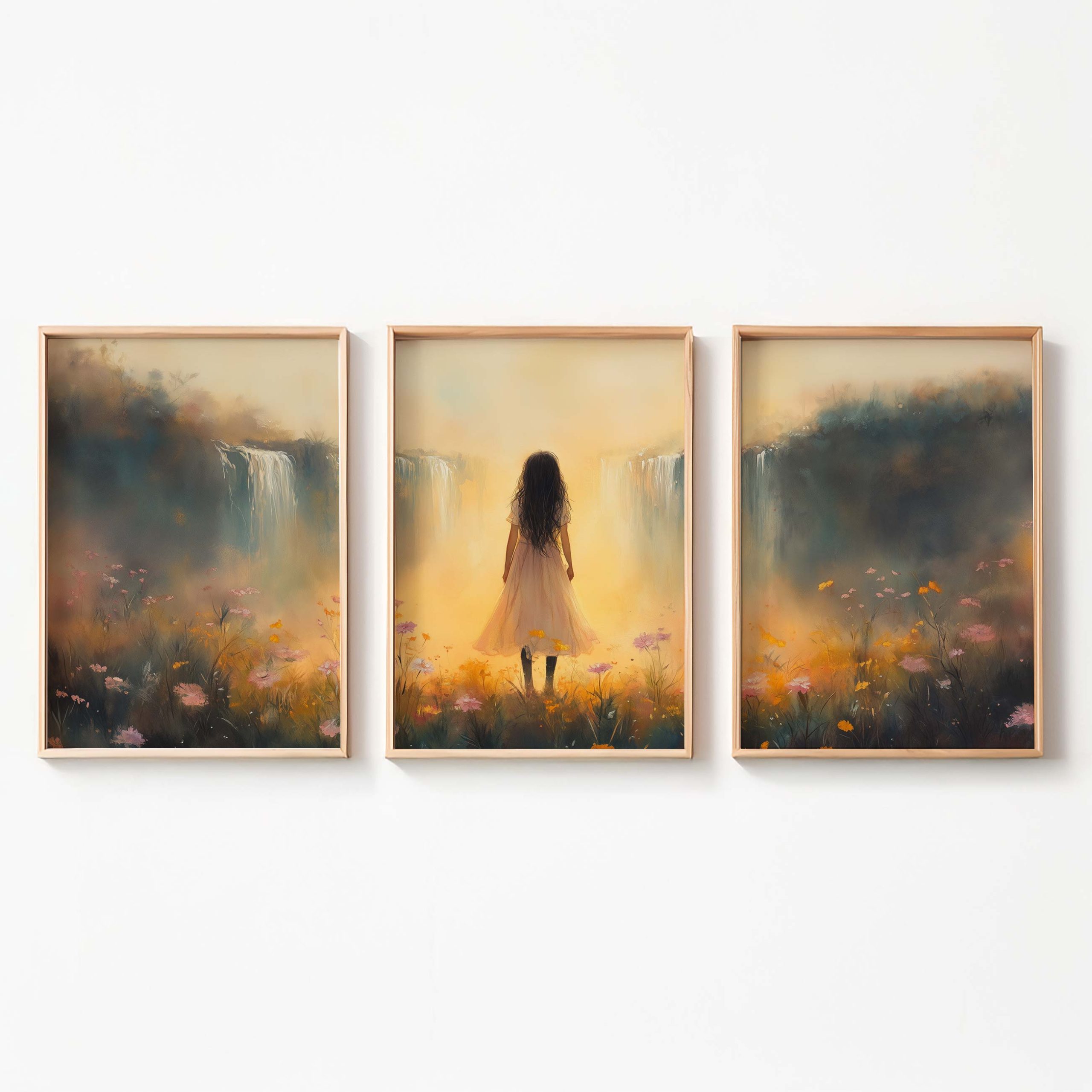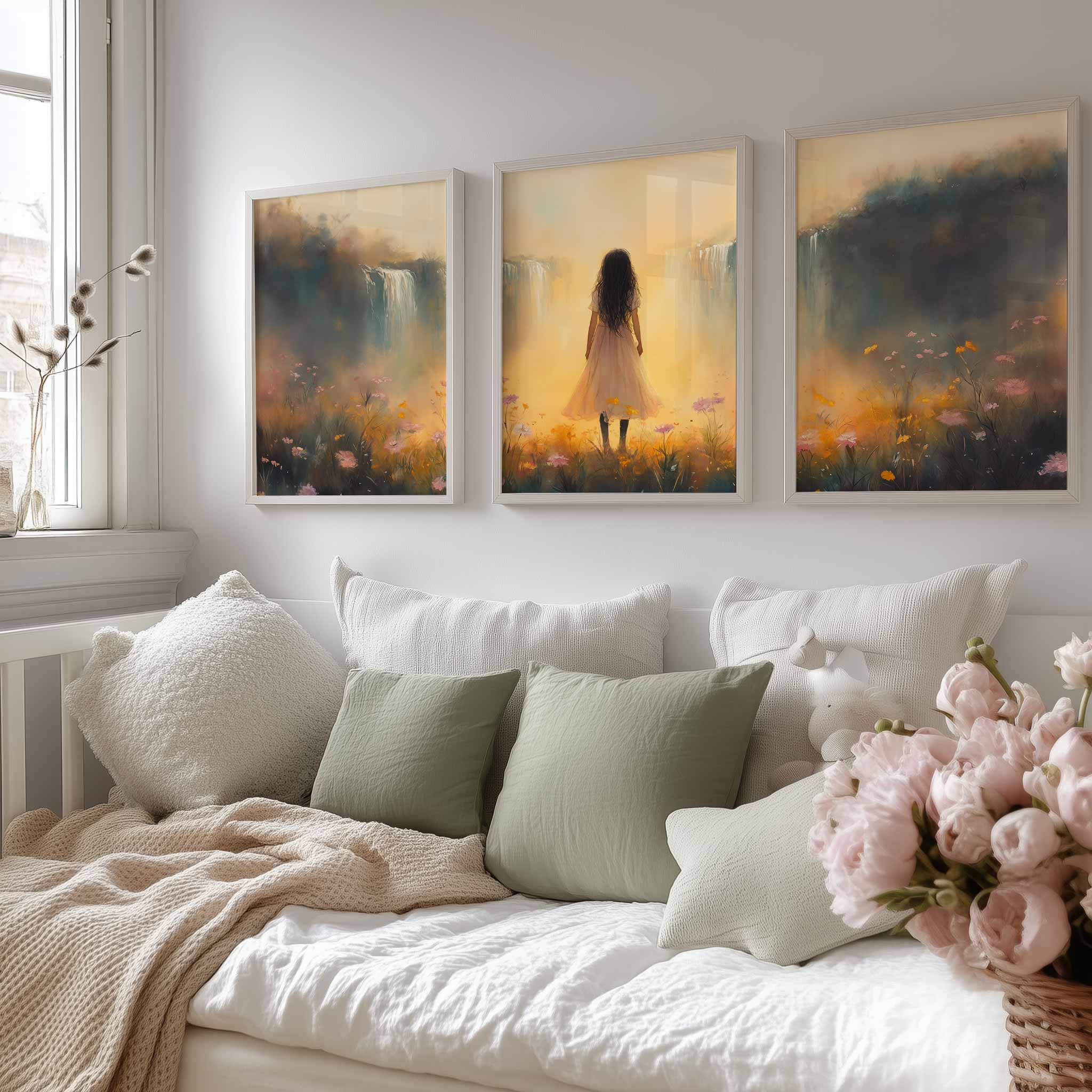 Terug naar collectie / Kinderkamer posters / Bloemen posters / Betoverend bloemenveld met waterval en dromerige vrouw