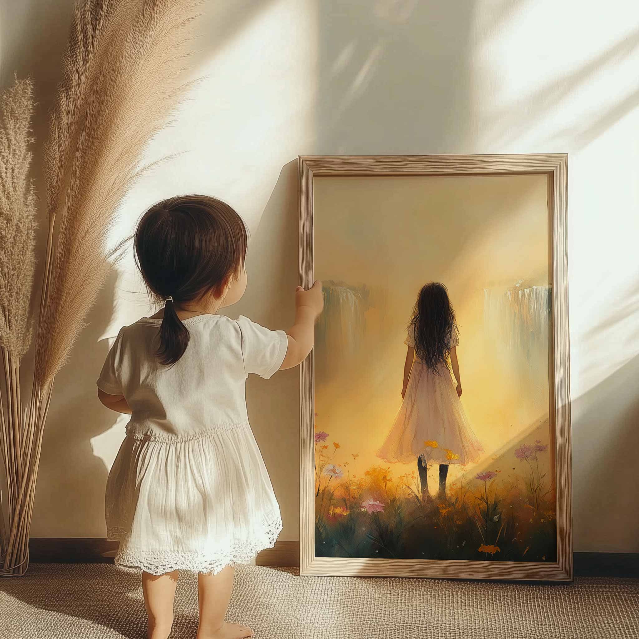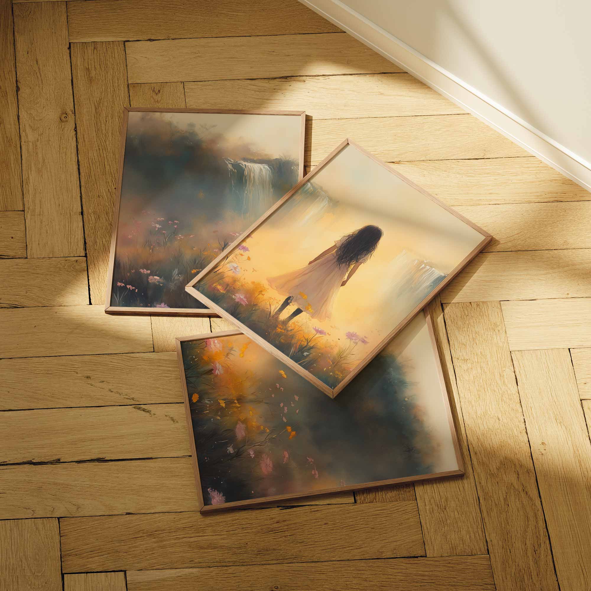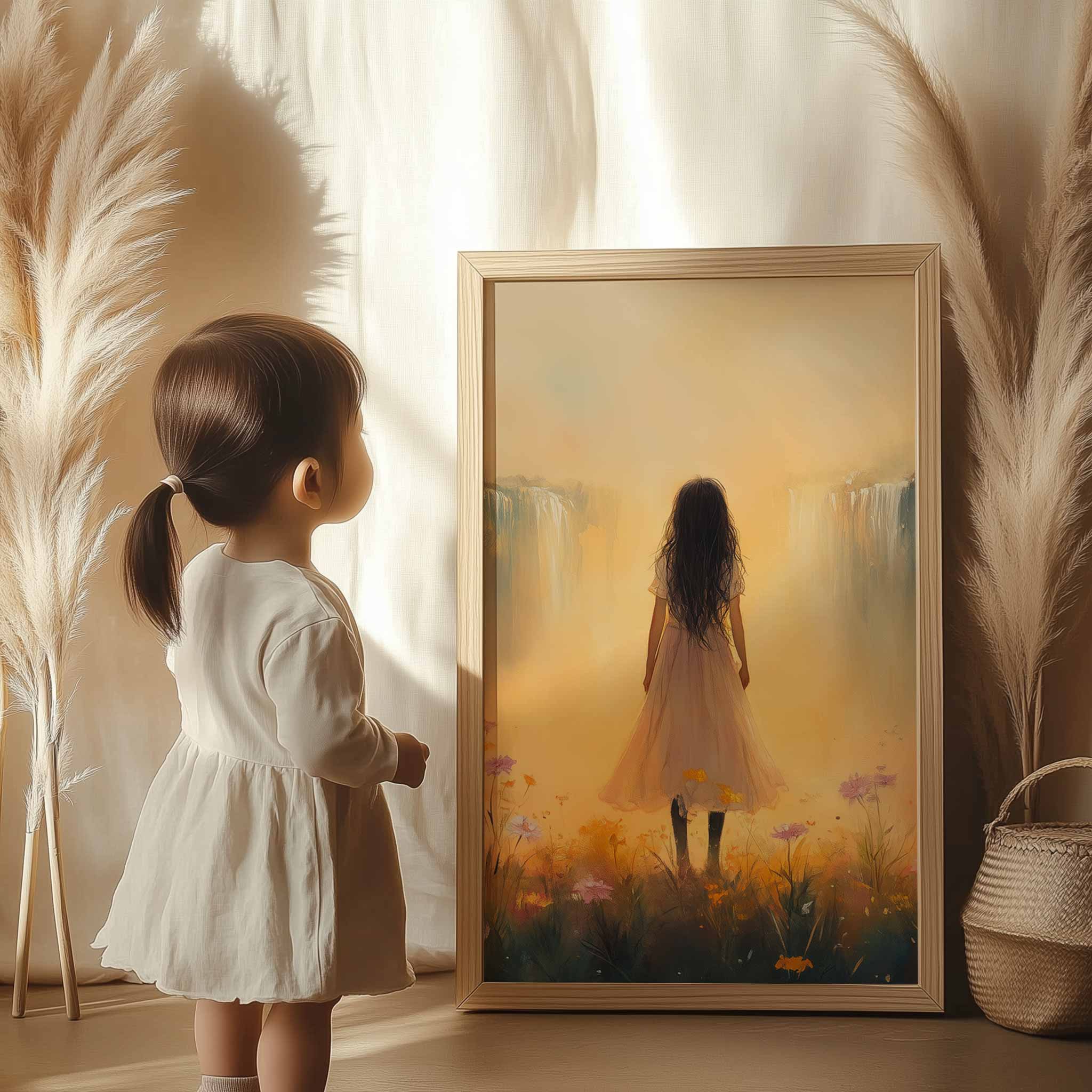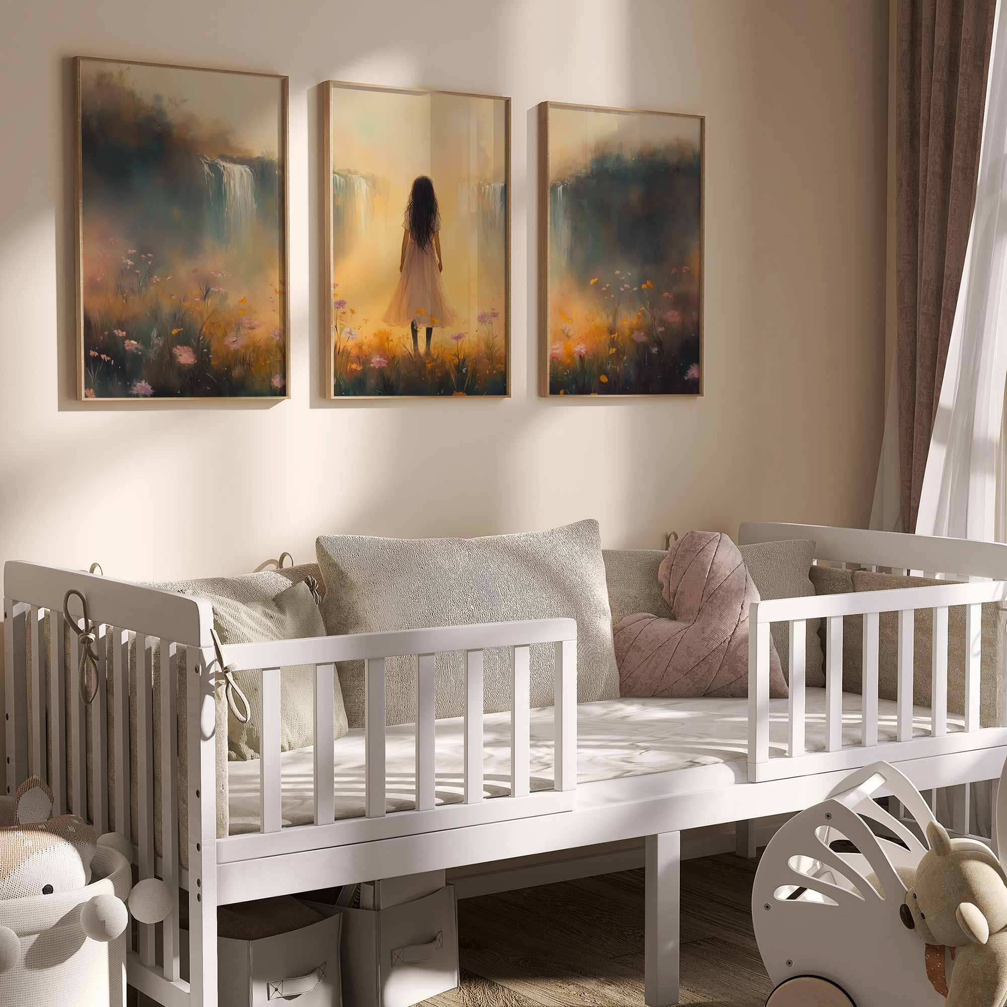 Terug naar collectie / Kinderkamer posters / Bloemen posters / Betoverend bloemenveld met waterval en dromerige vrouw