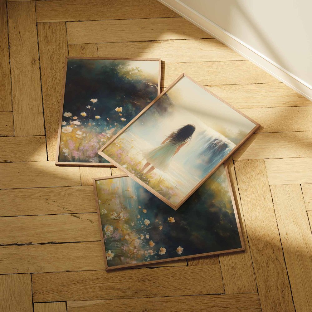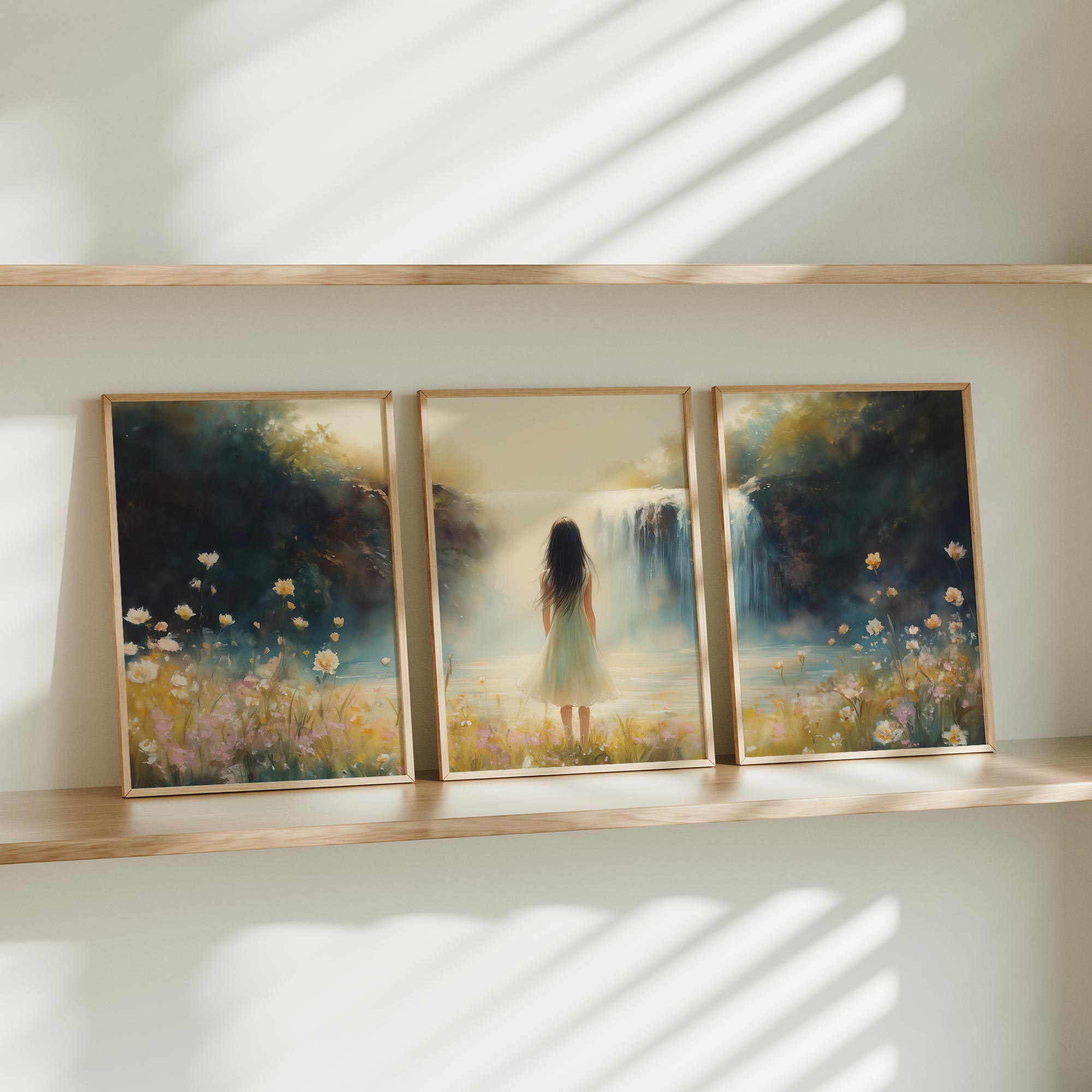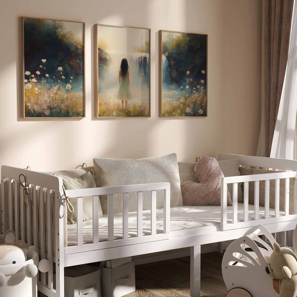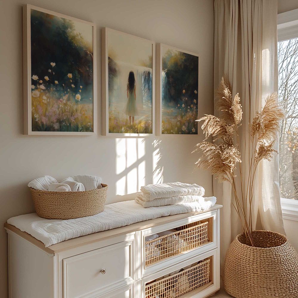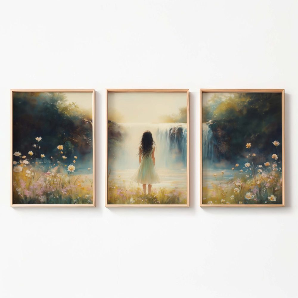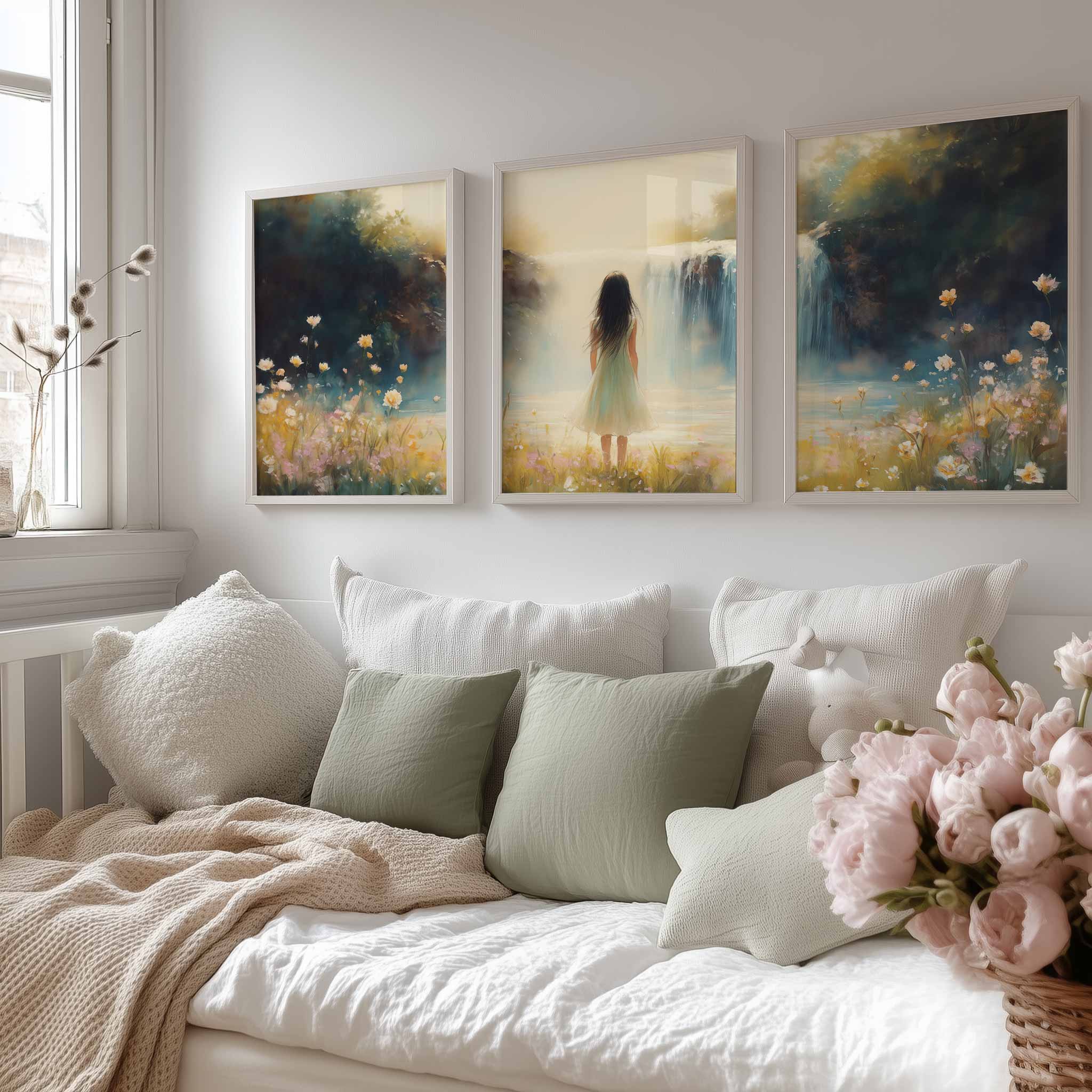 Terug naar collectie / Kinderkamer posters / Bloemen posters / Betoverend Landschap: Vrouw bij Waterval en Bloemenveld