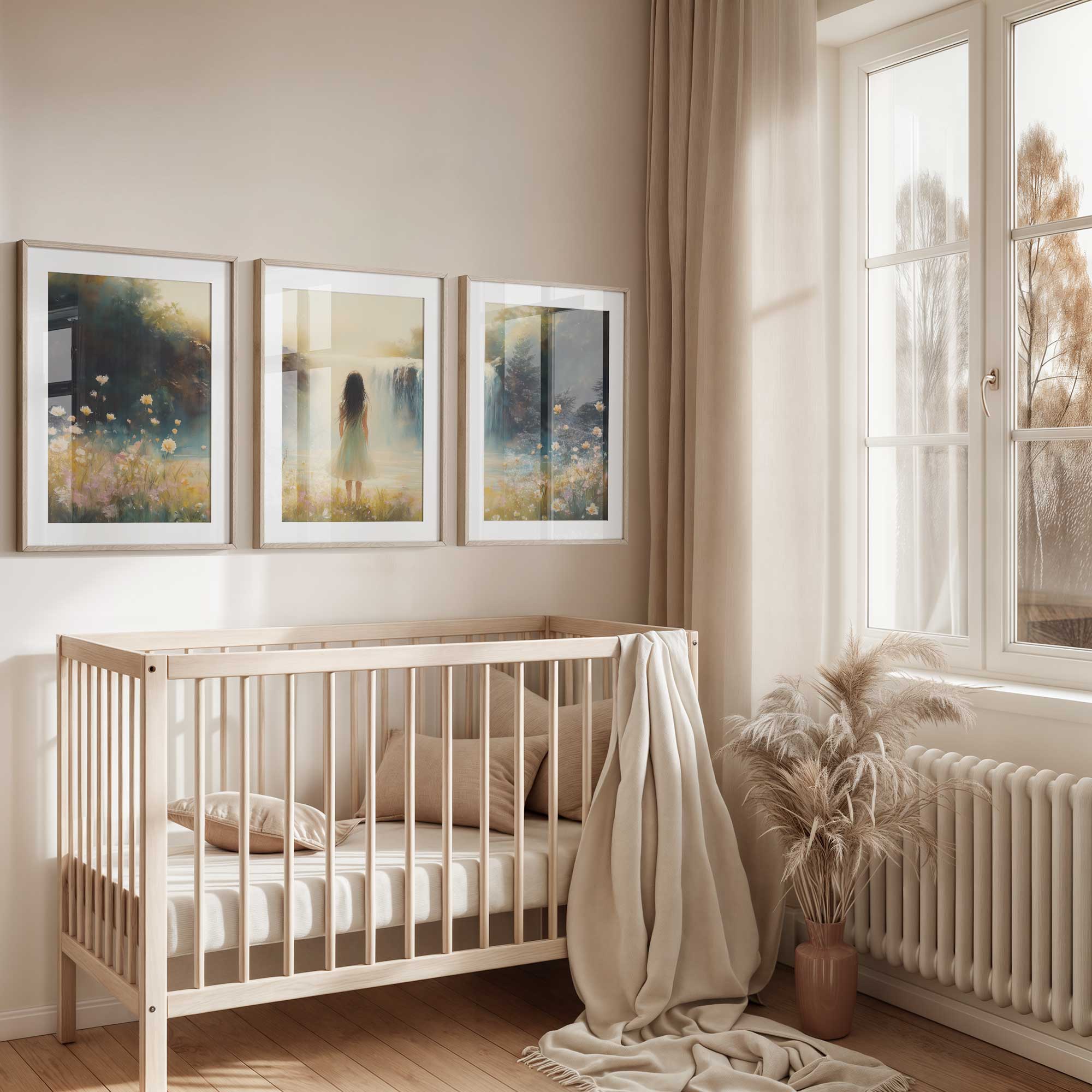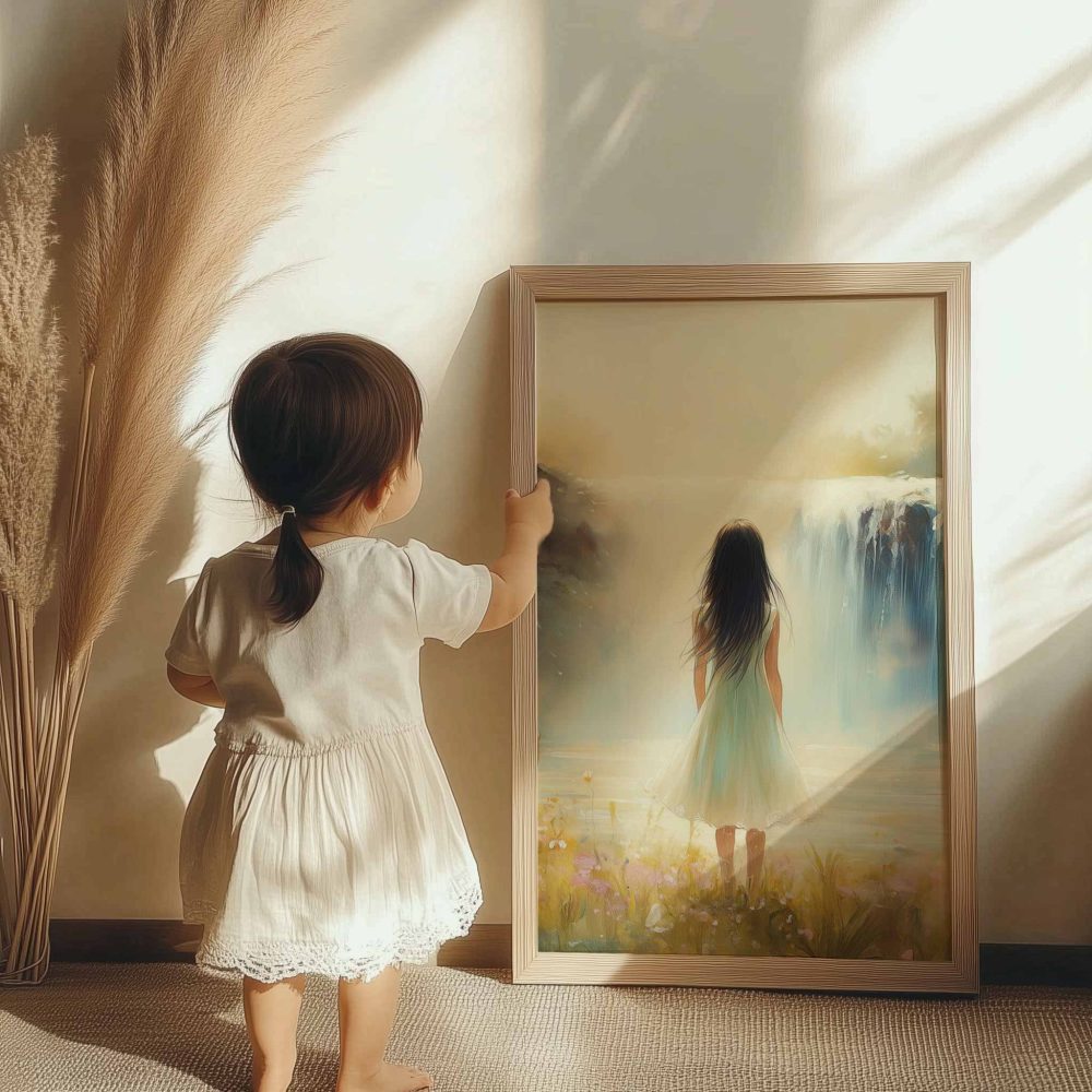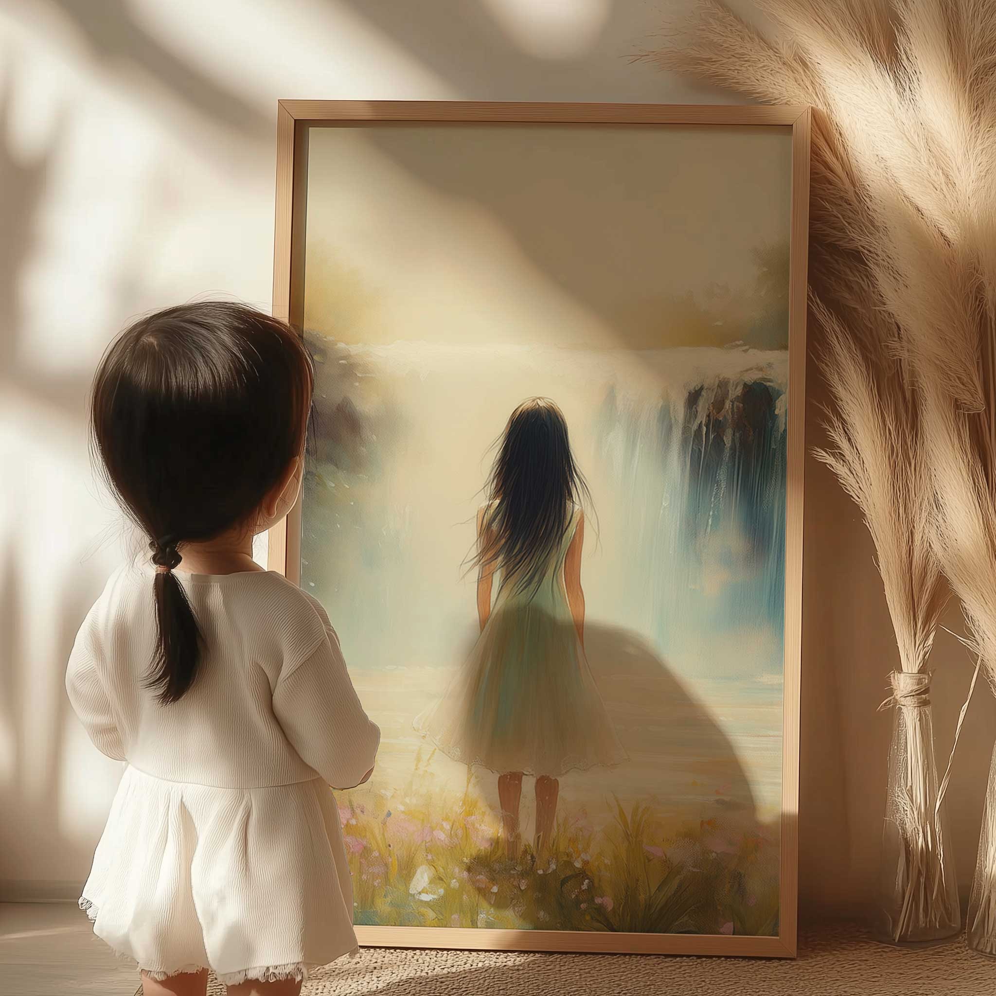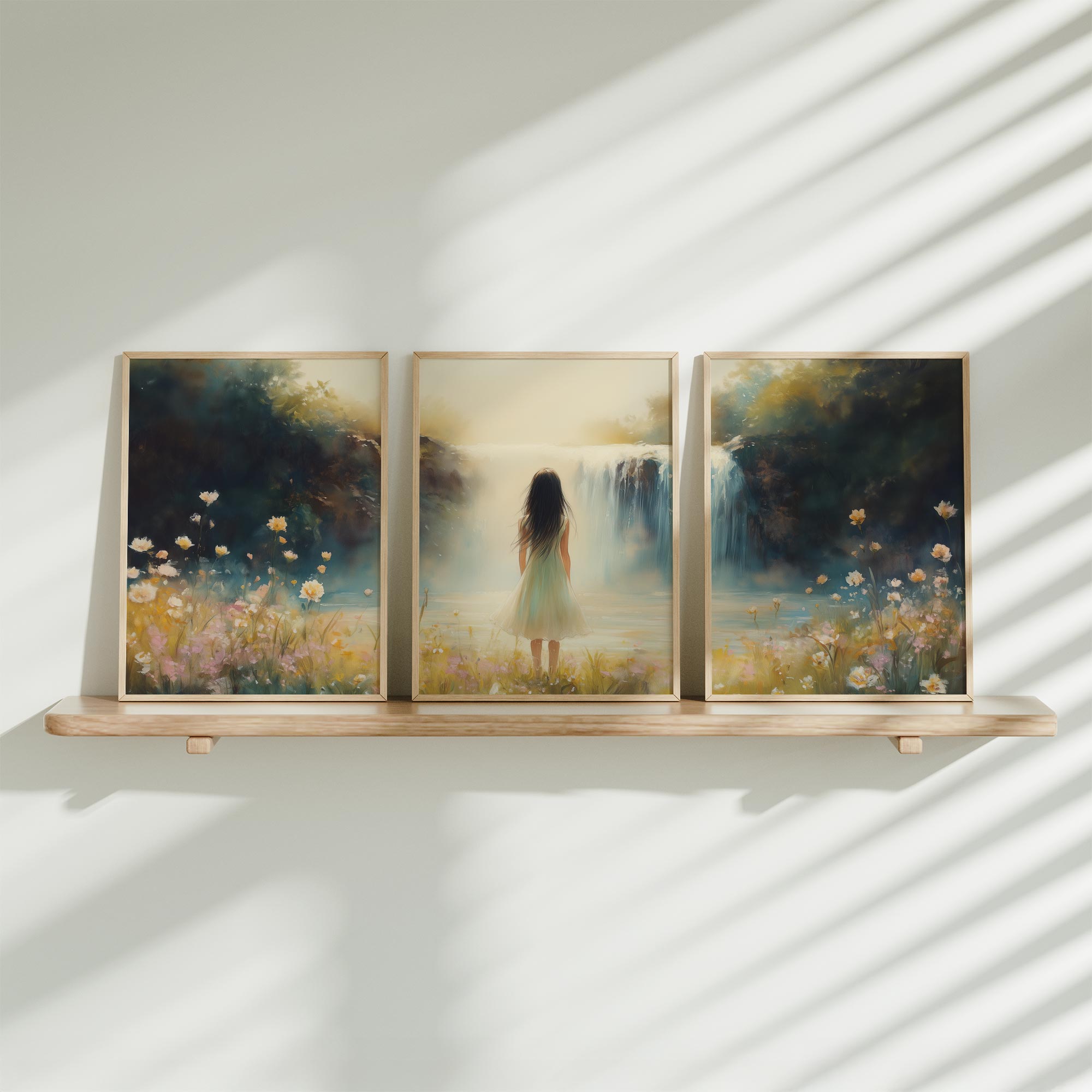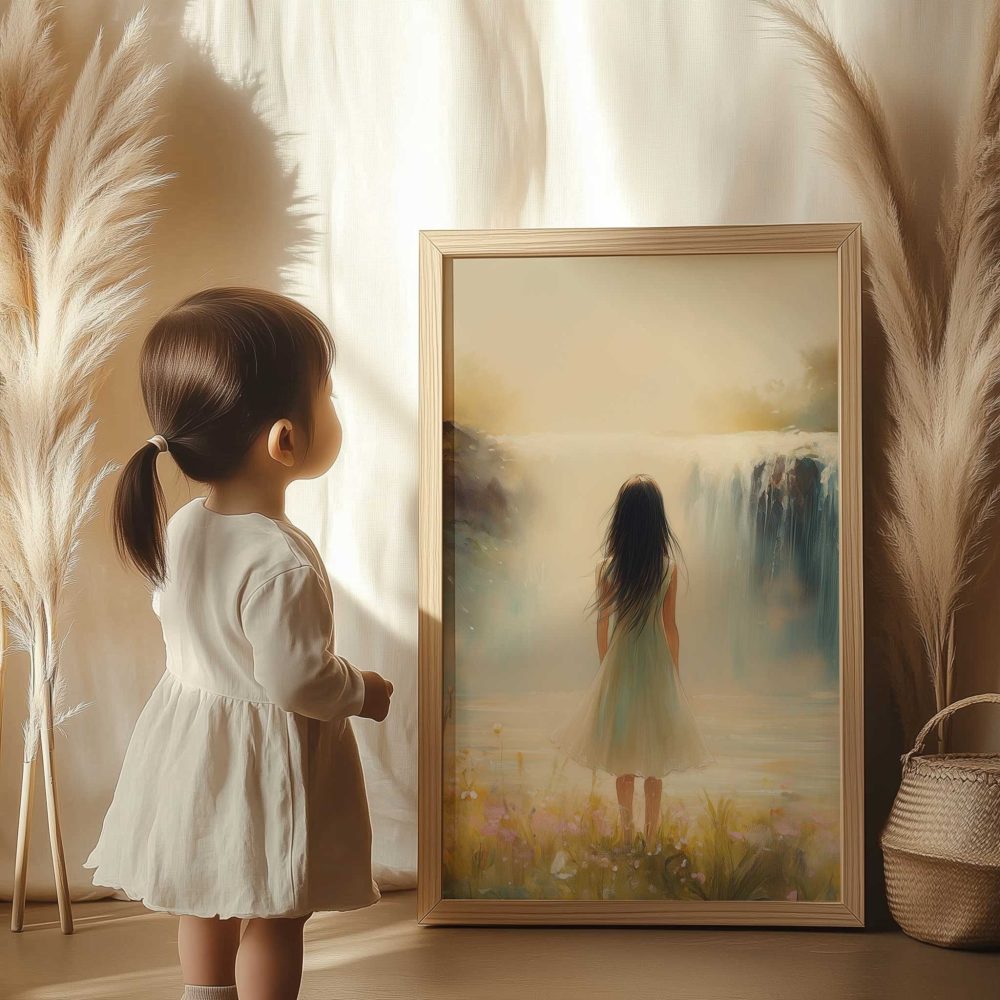 Terug naar collectie / Kinderkamer posters / Bloemen posters / Betoverend Landschap: Vrouw bij Waterval en Bloemenveld