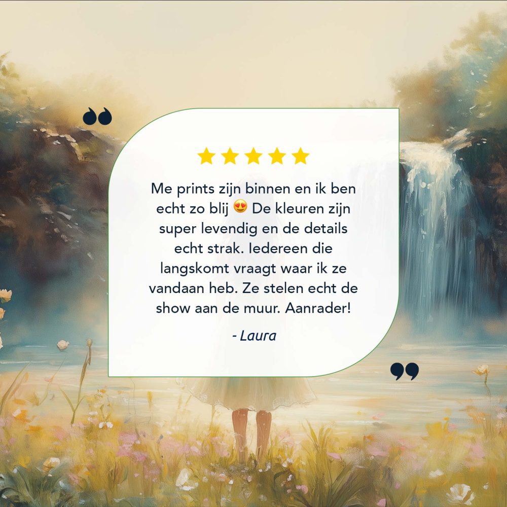 Betoverend Landschap: Vrouw bij Waterval en Bloemenveld