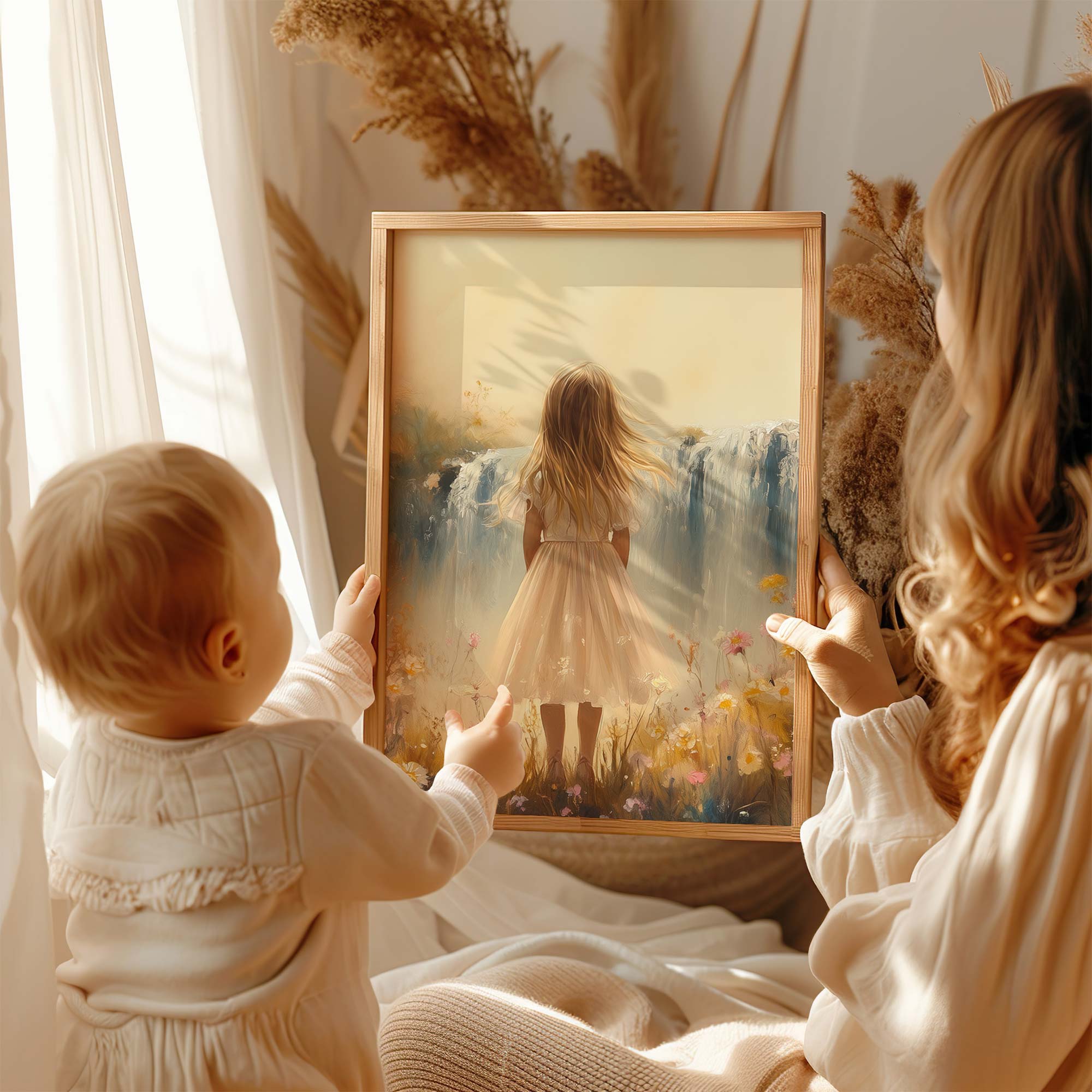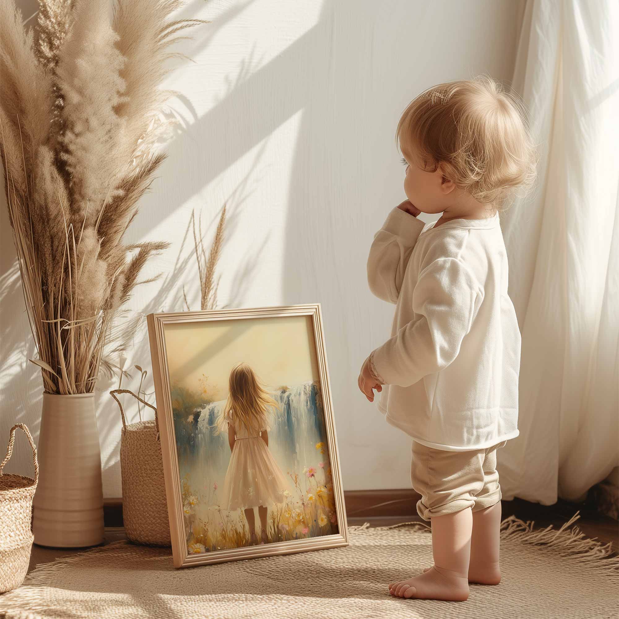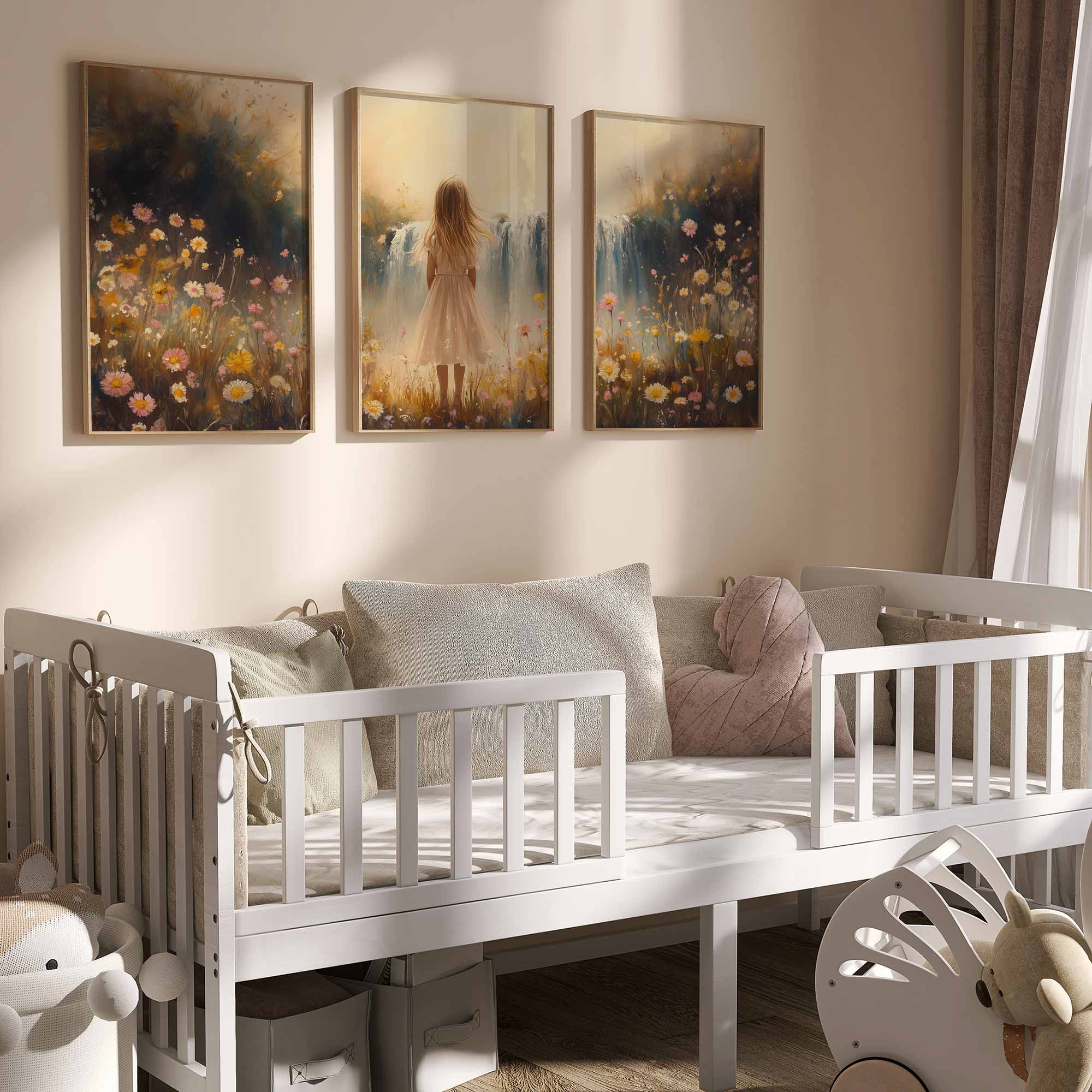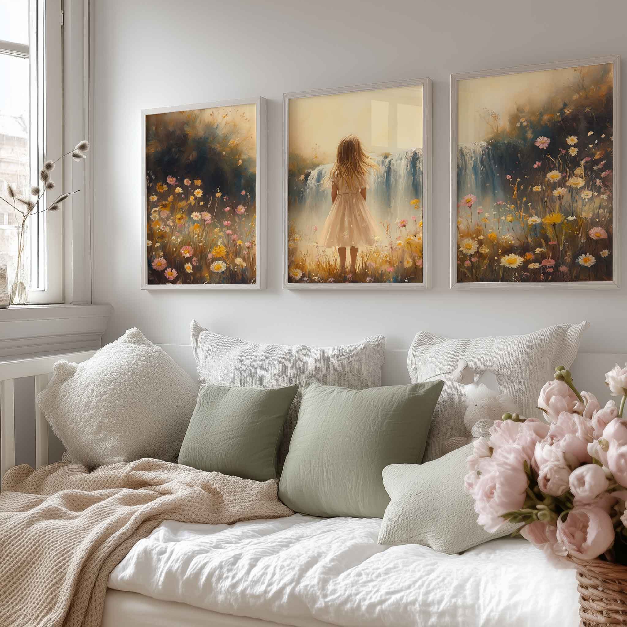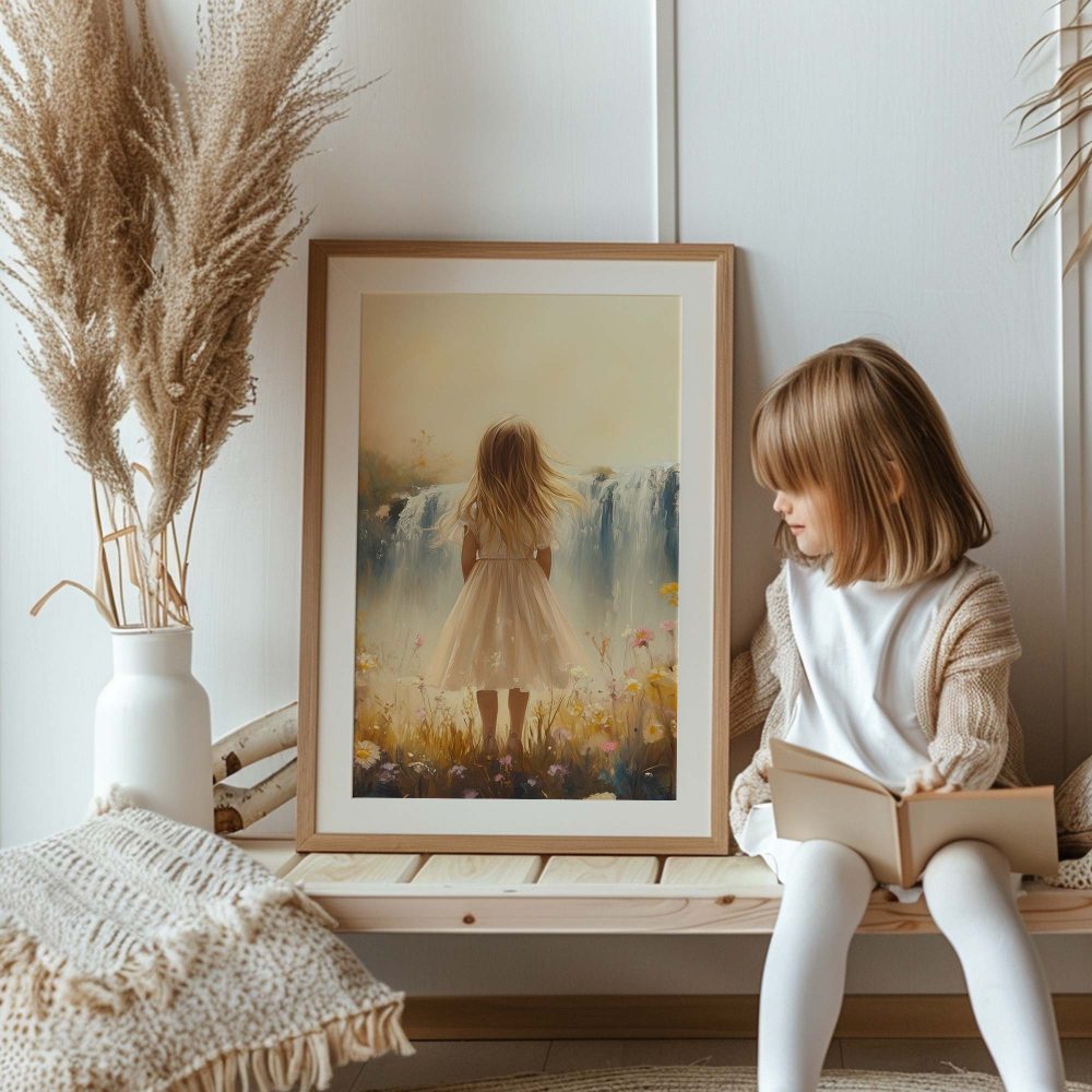 Terug naar collectie / Kinderkamer posters / Bloemen posters / Betoverend Meisje bij Waterval in Bloemenveld