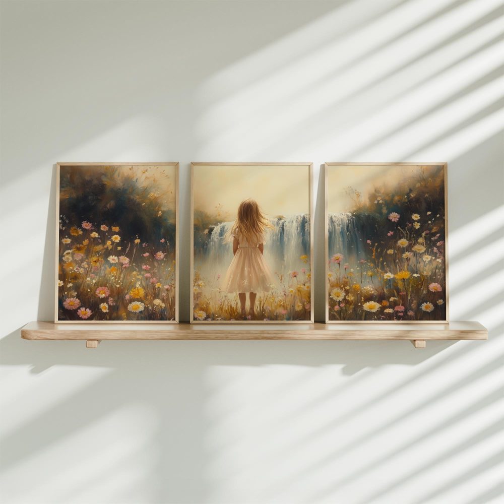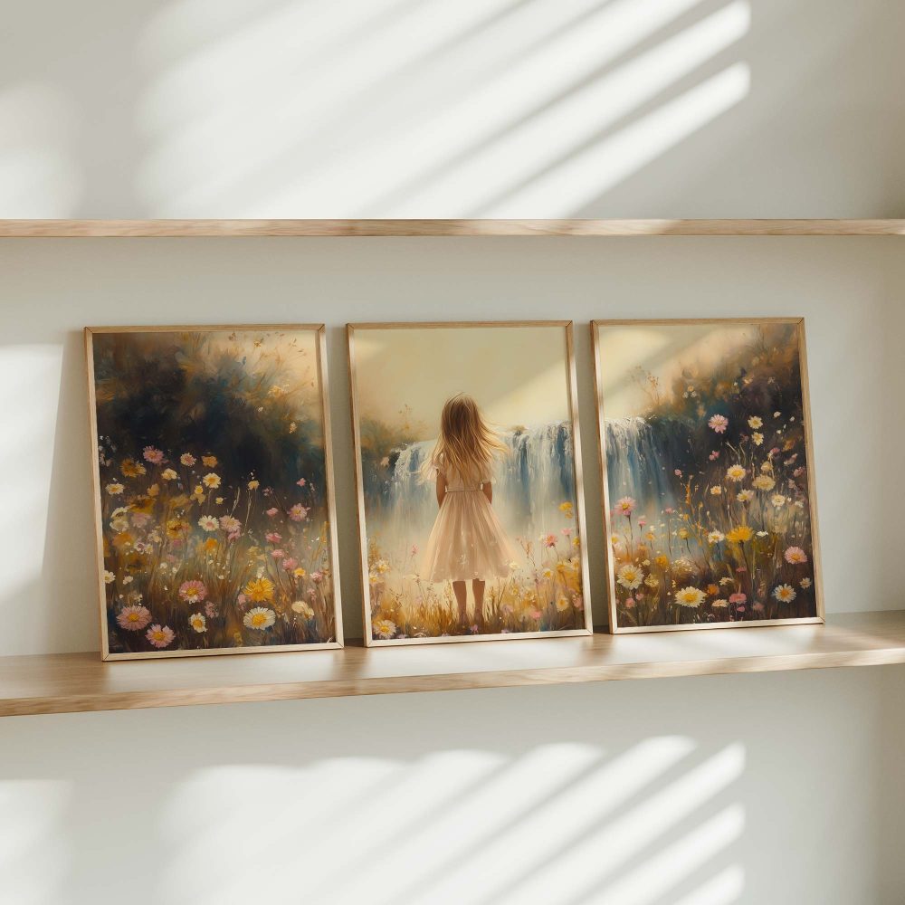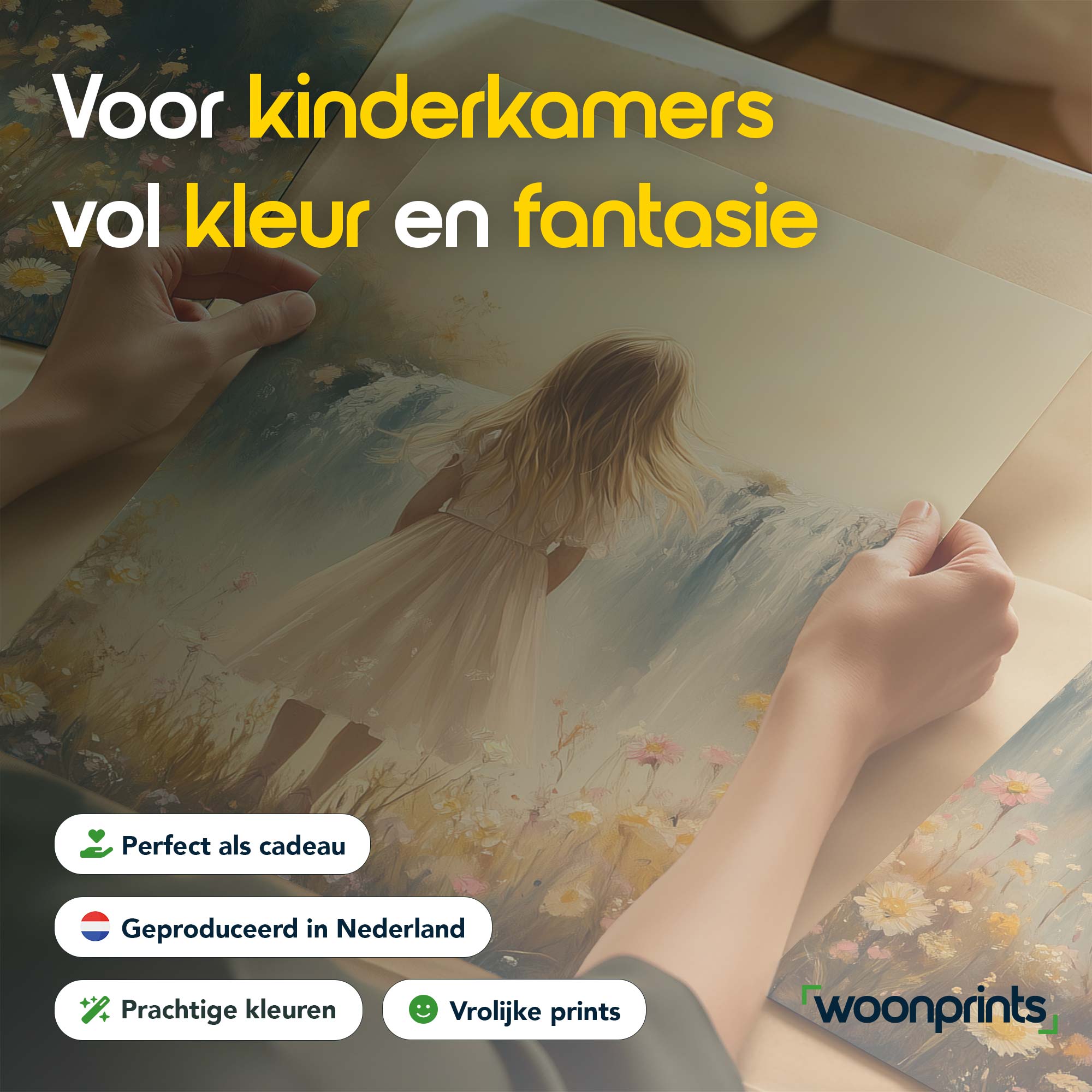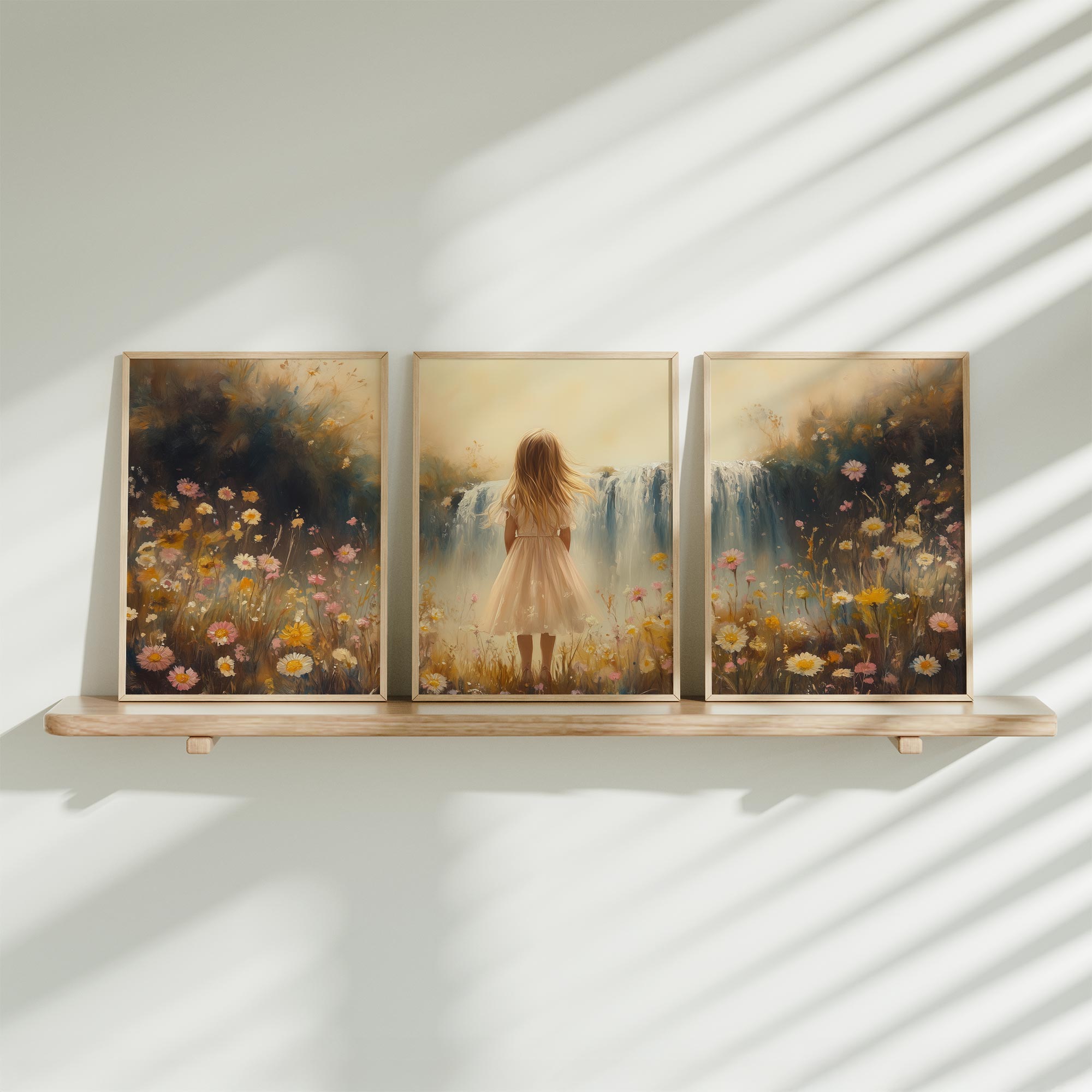 Terug naar collectie / Kinderkamer posters / Bloemen posters / Betoverend Meisje bij Waterval in Bloemenveld