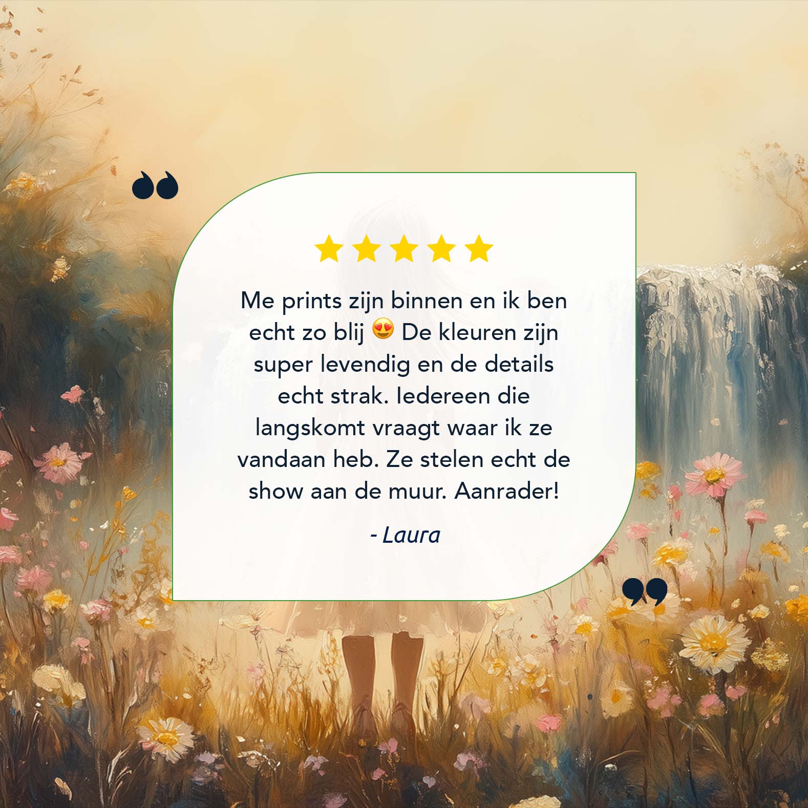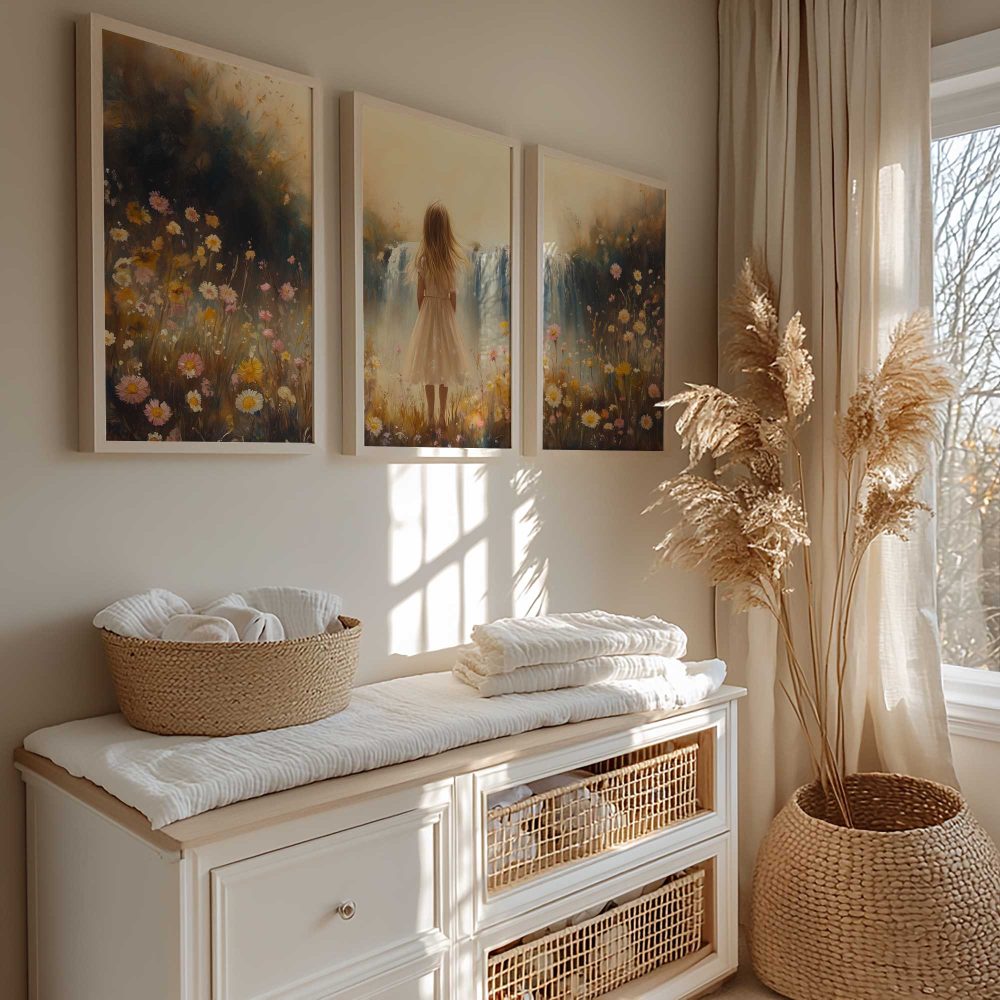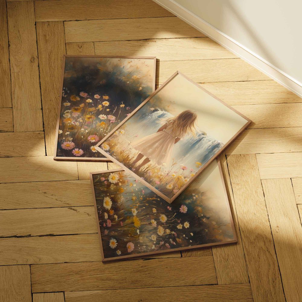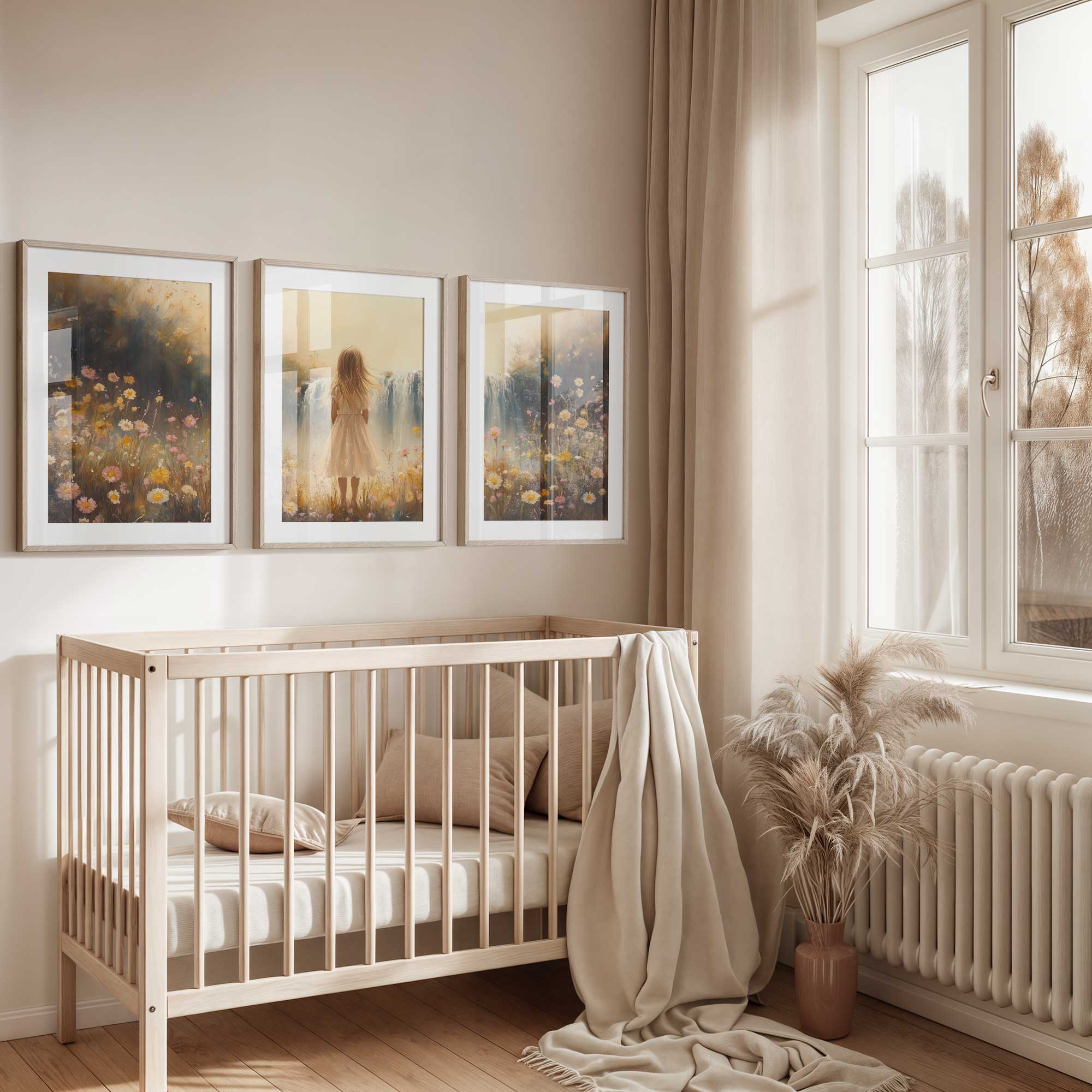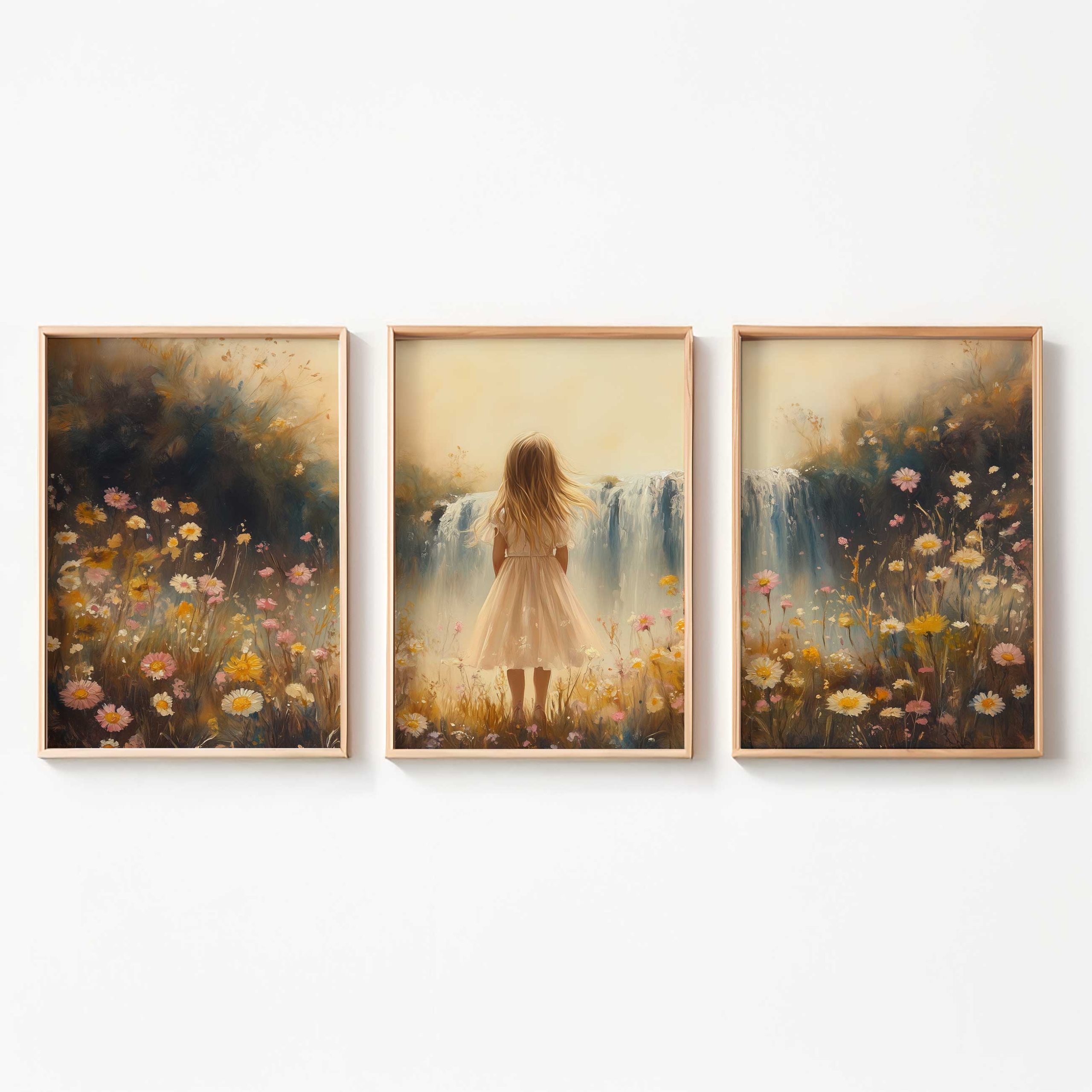 Terug naar collectie / Kinderkamer posters / Bloemen posters / Betoverend Meisje bij Waterval in Bloemenveld