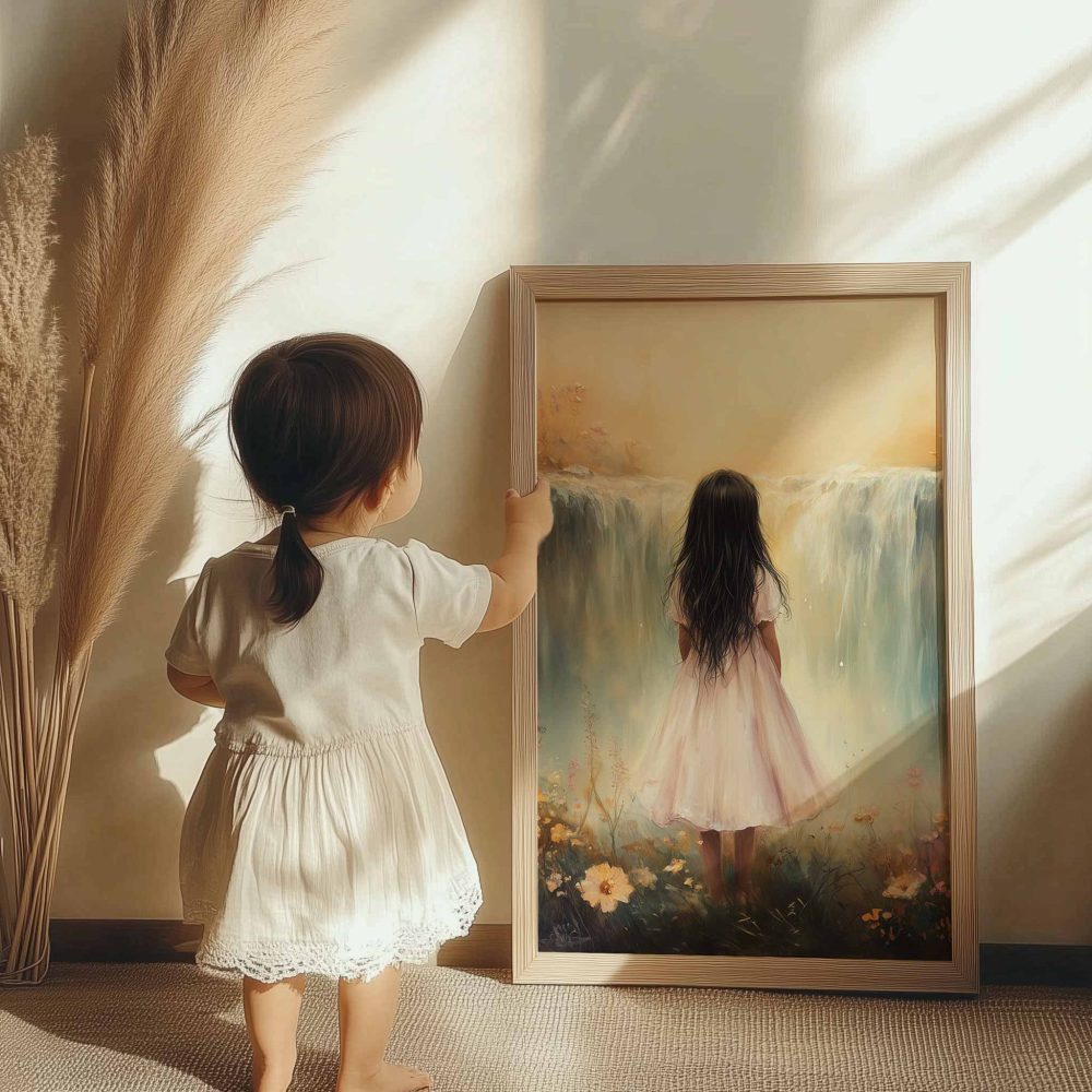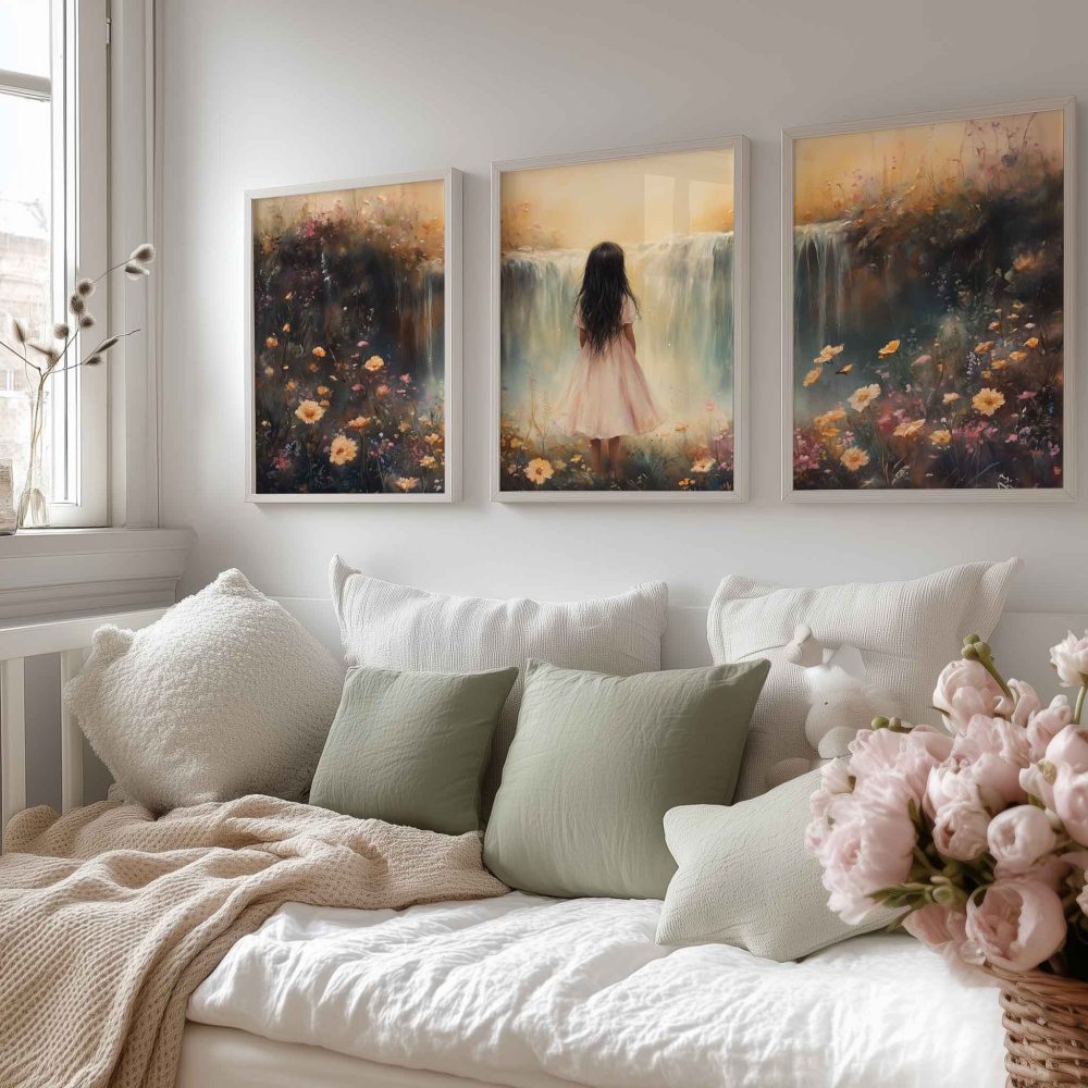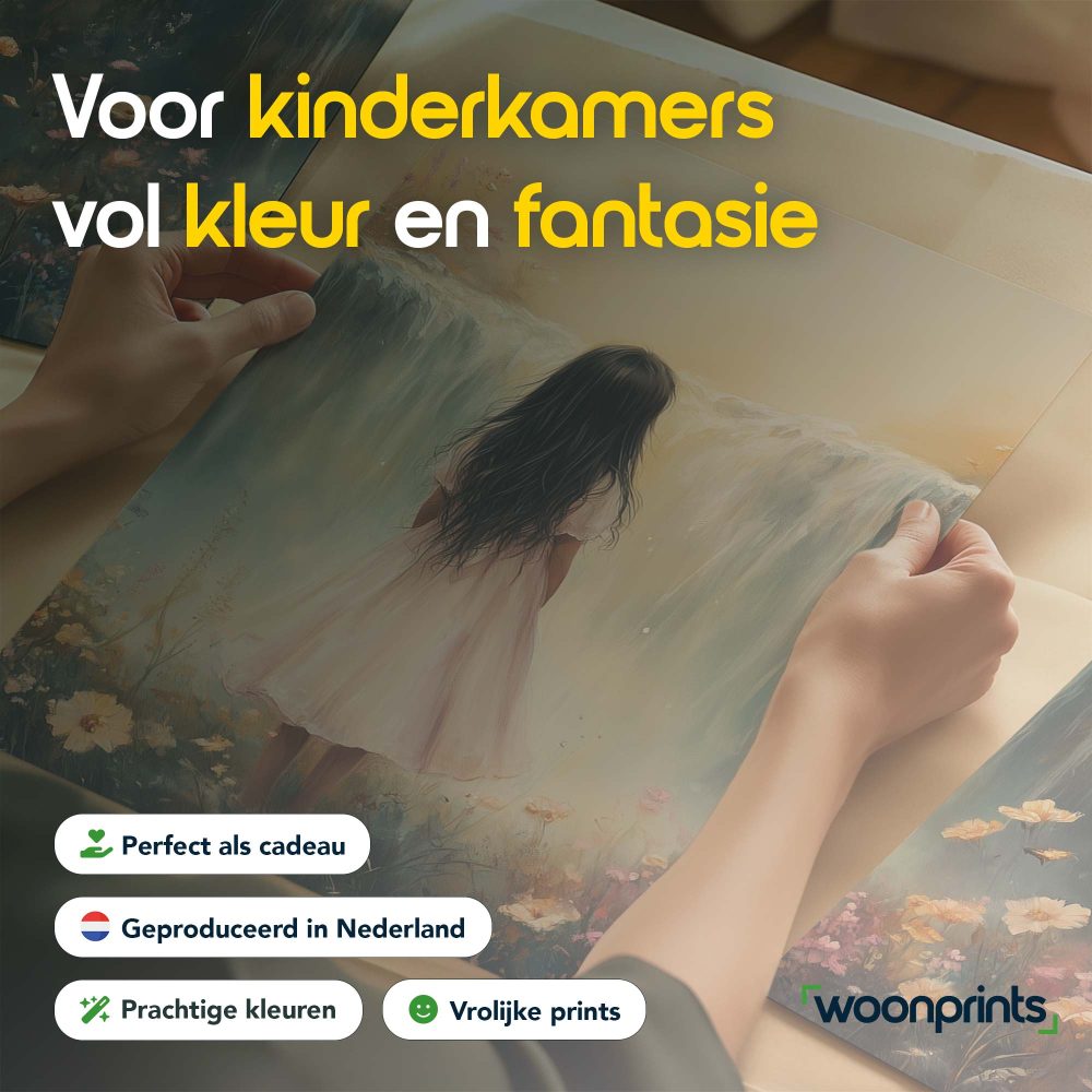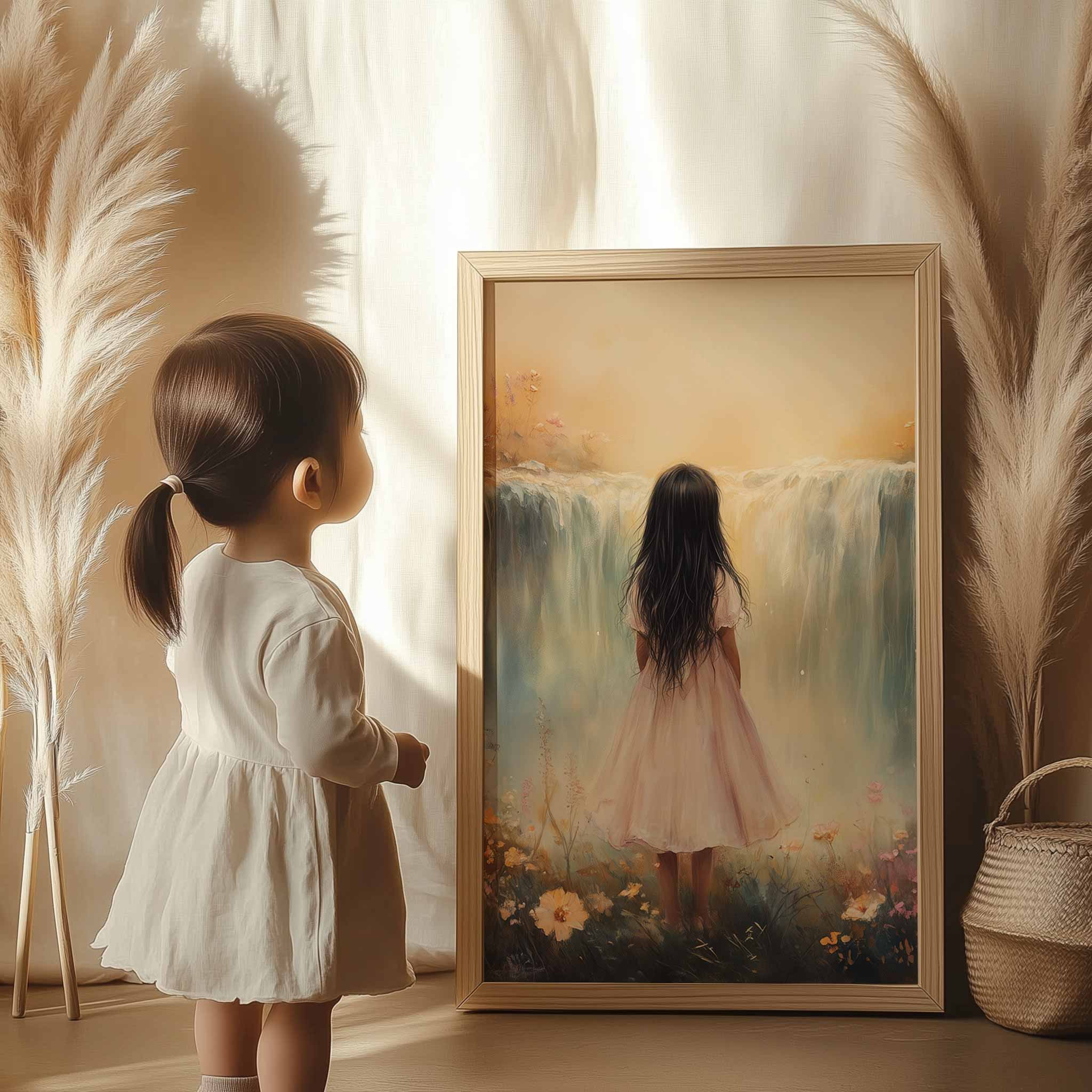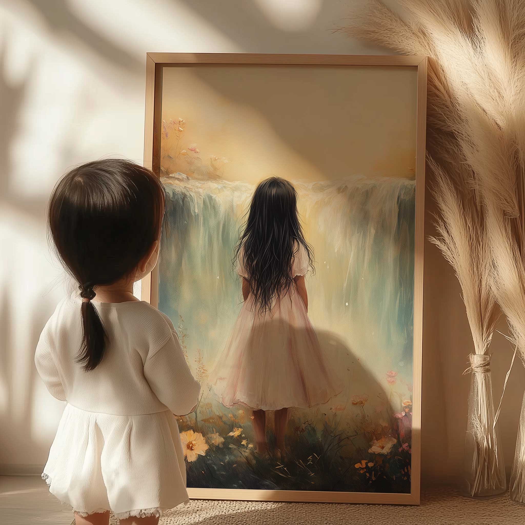 Terug naar collectie / Kinderkamer posters / Bloemen posters / Betoverend Meisje bij Waterval in Pastel Bloemenveld