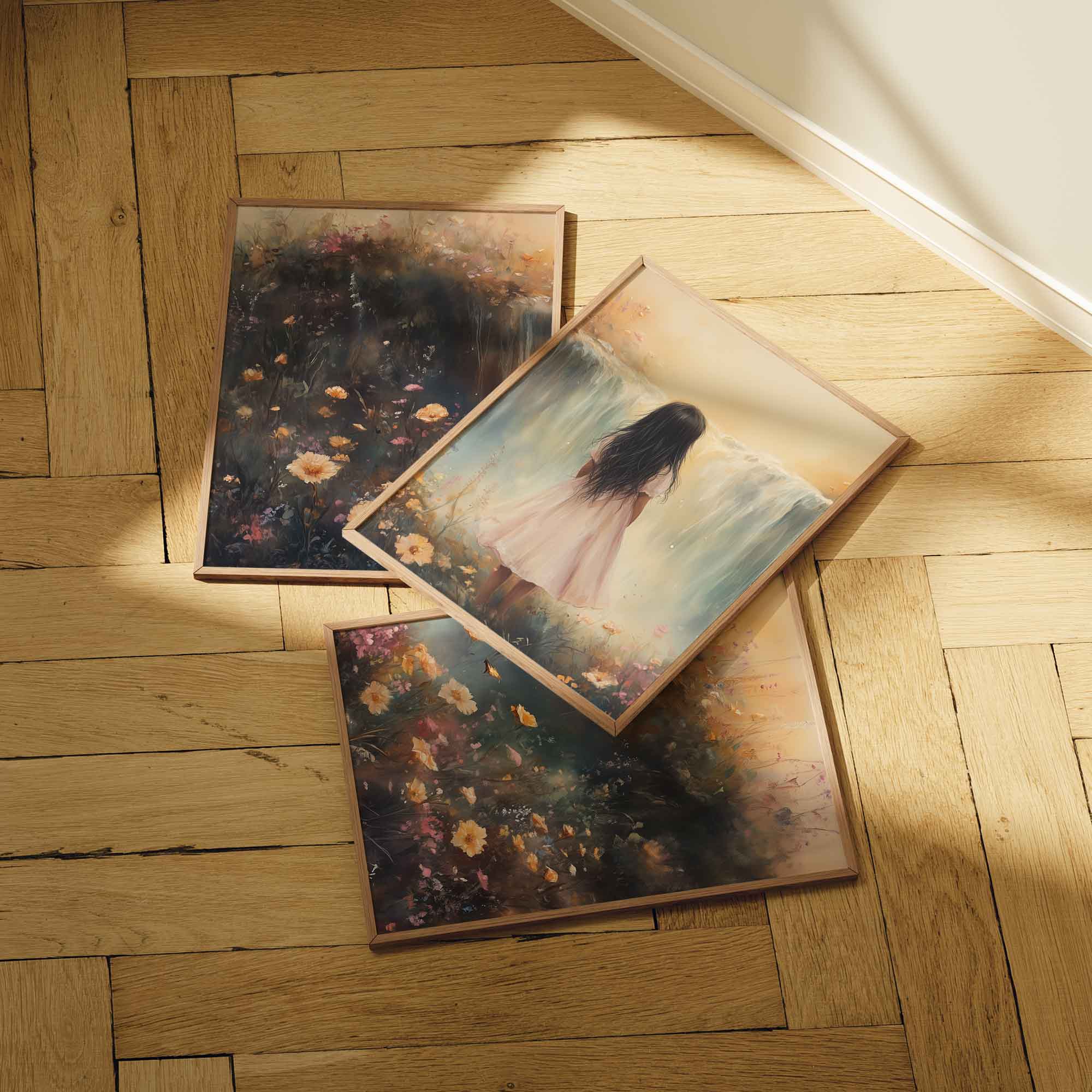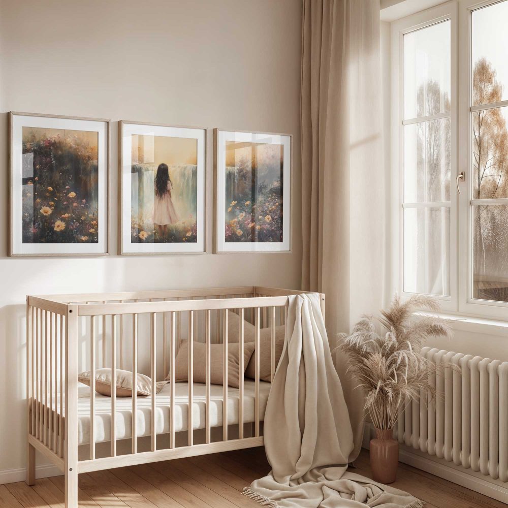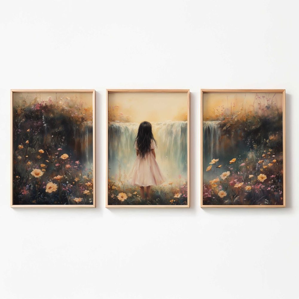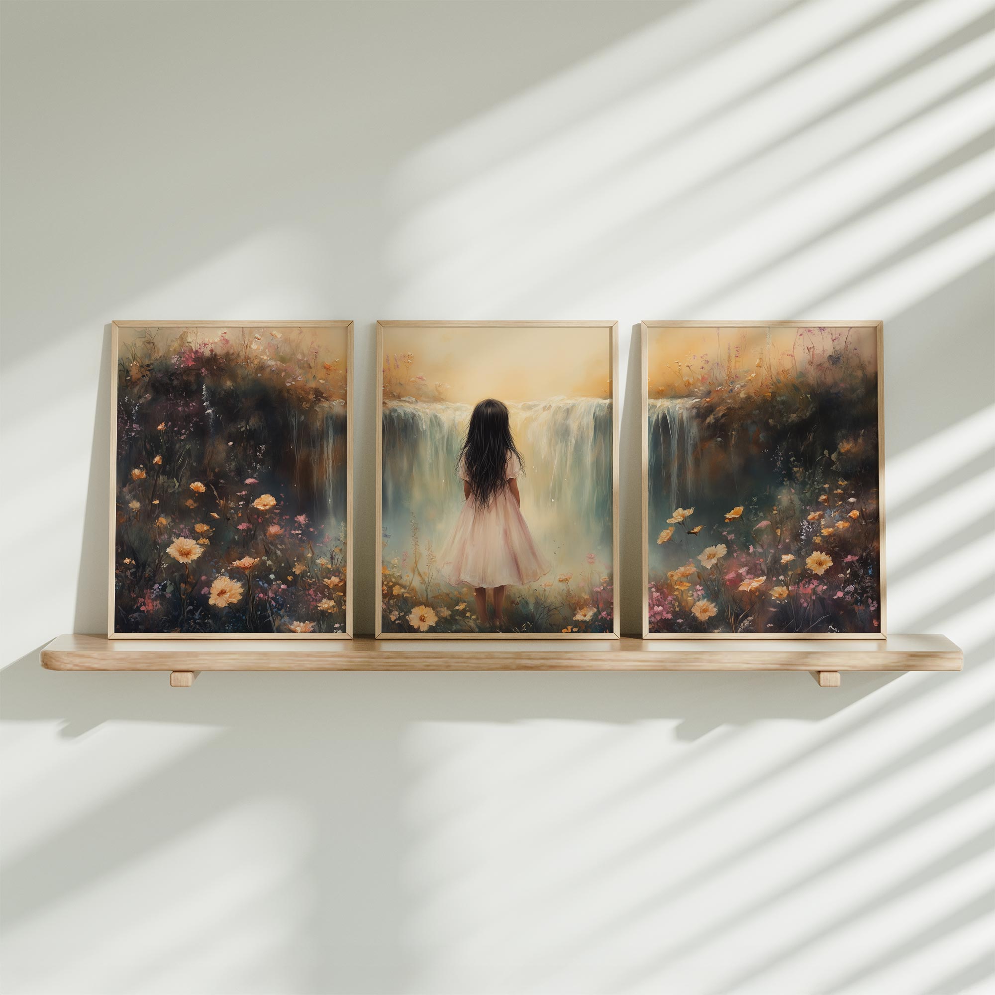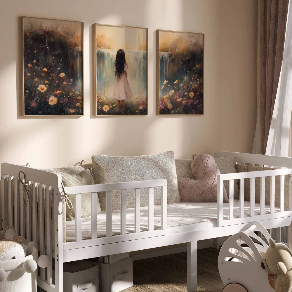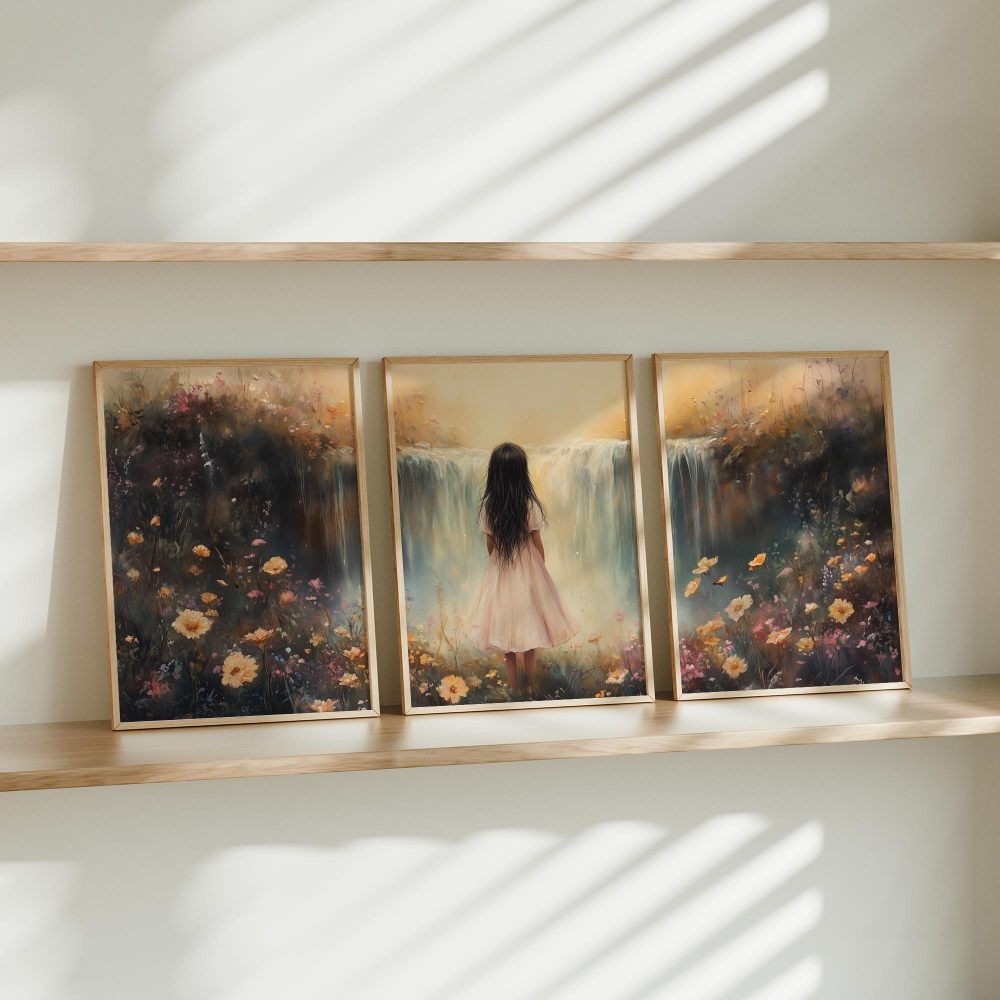 Terug naar collectie / Kinderkamer posters / Bloemen posters / Betoverend Meisje bij Waterval in Pastel Bloemenveld