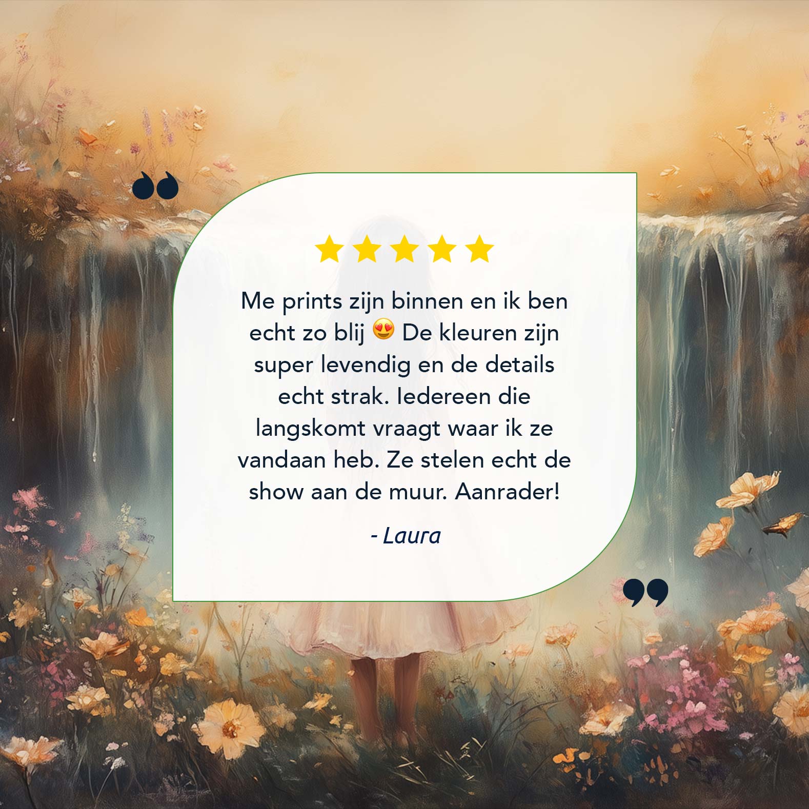 Betoverend Meisje bij Waterval in Pastel Bloemenveld