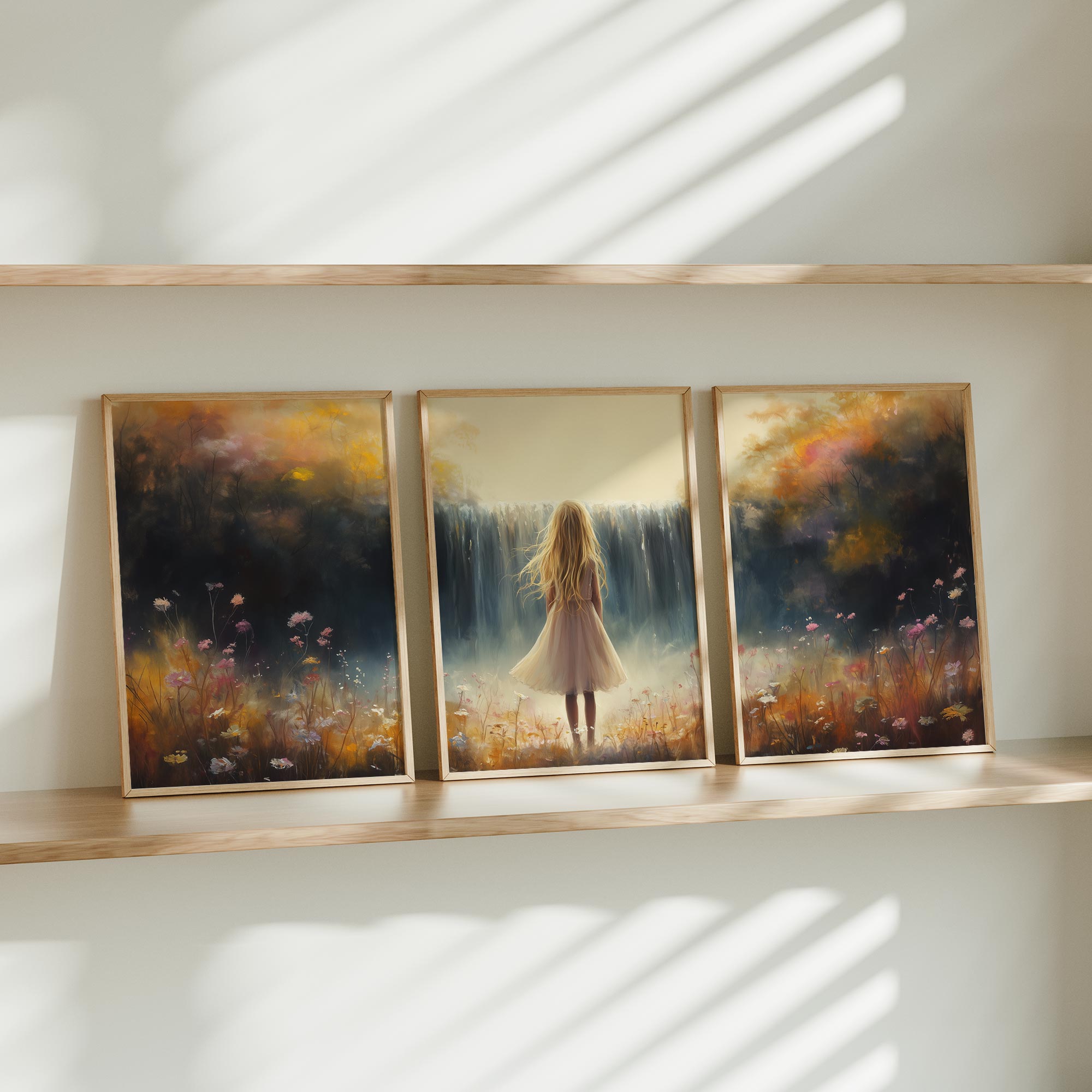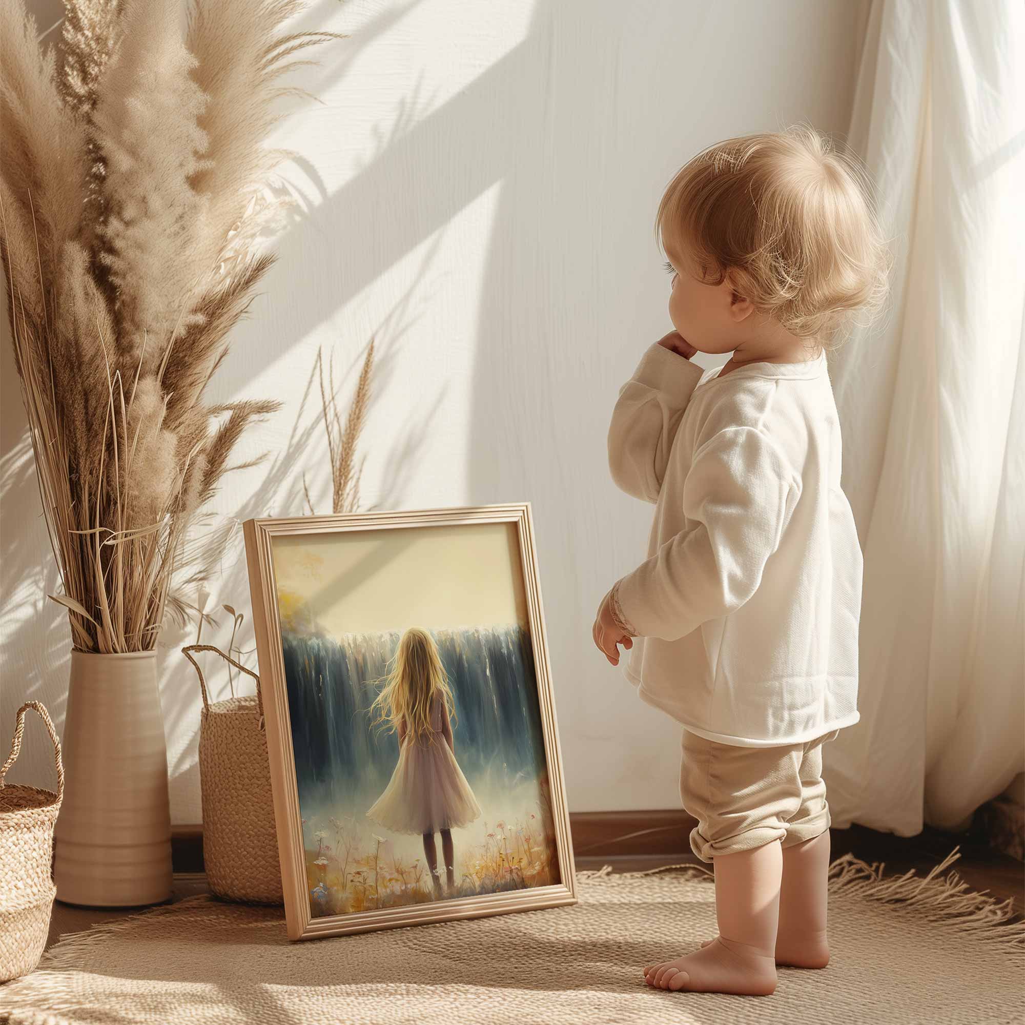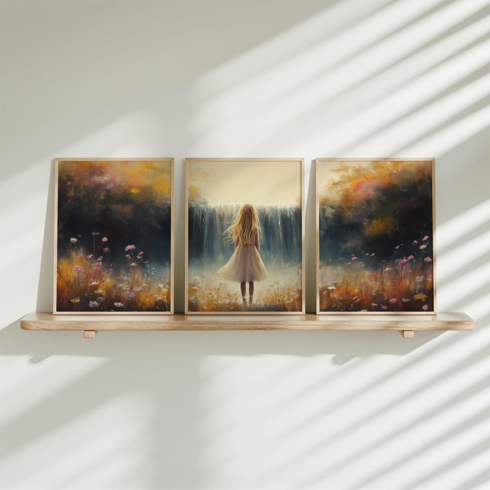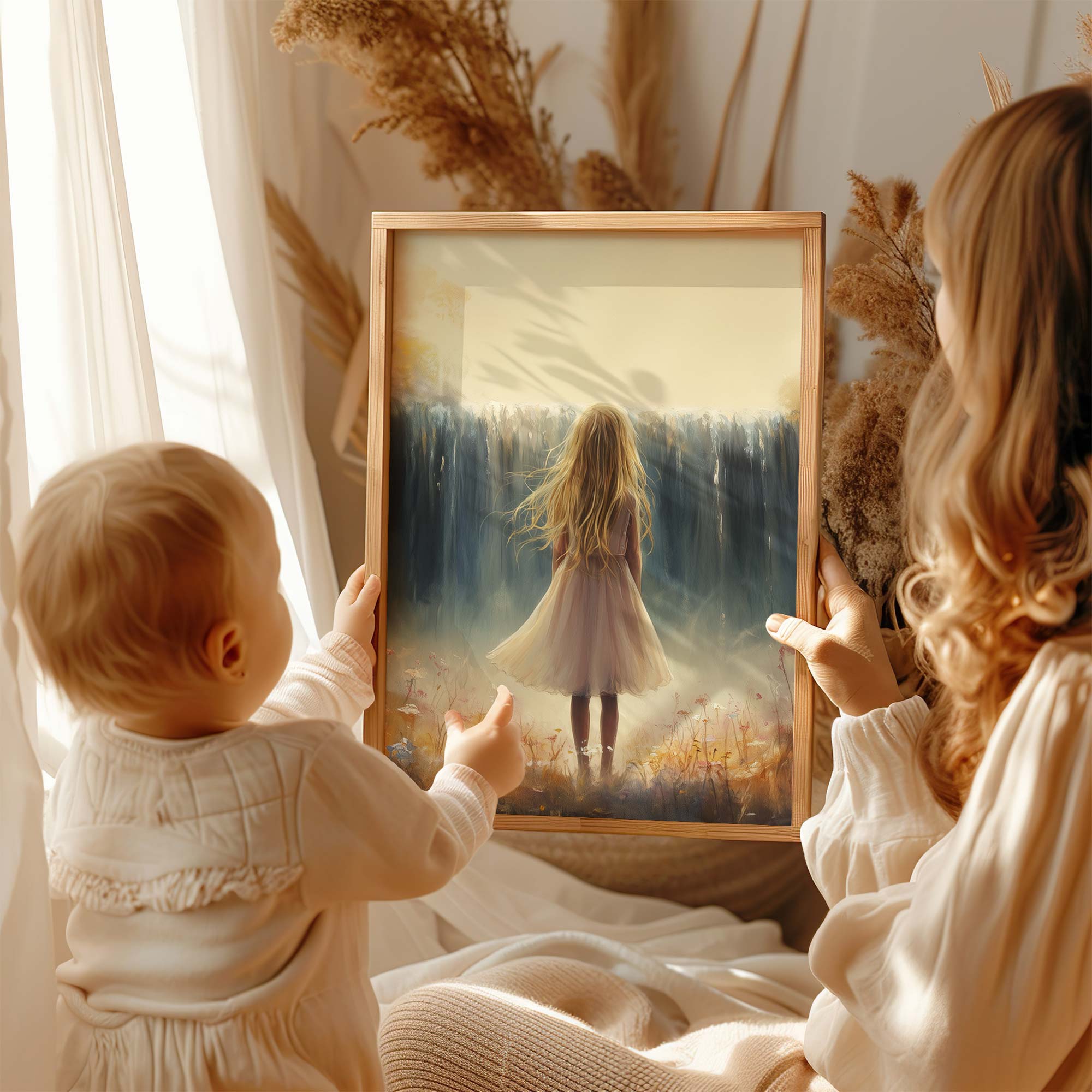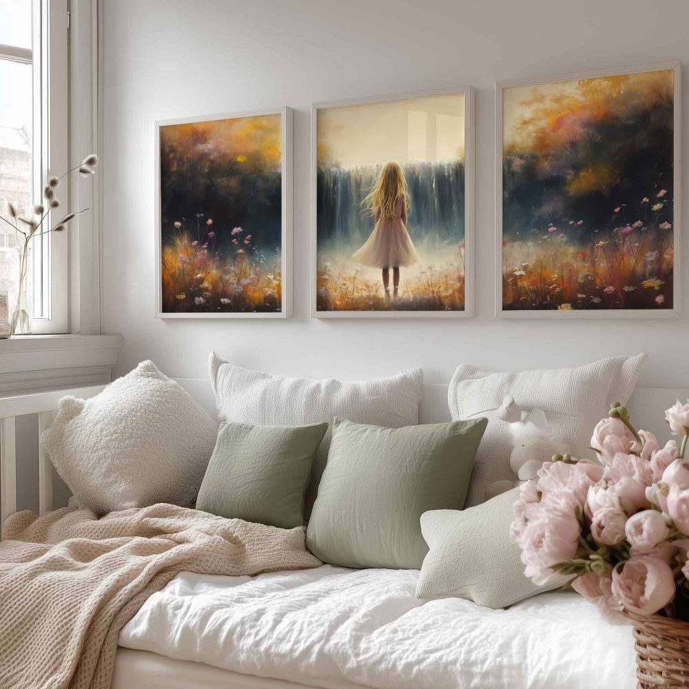 Terug naar collectie / Kinderkamer posters / Bloemen posters / Betoverend Meisje bij Waterval in Pastel Droomwereld
