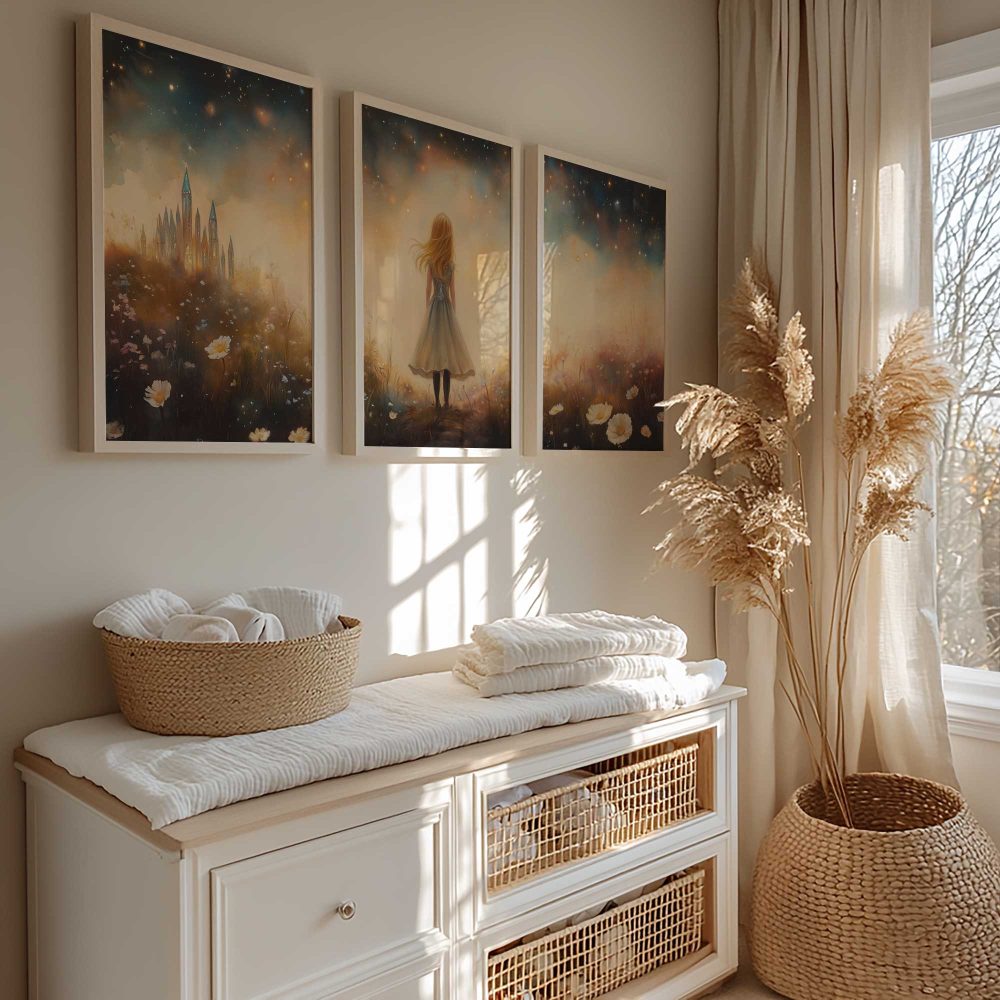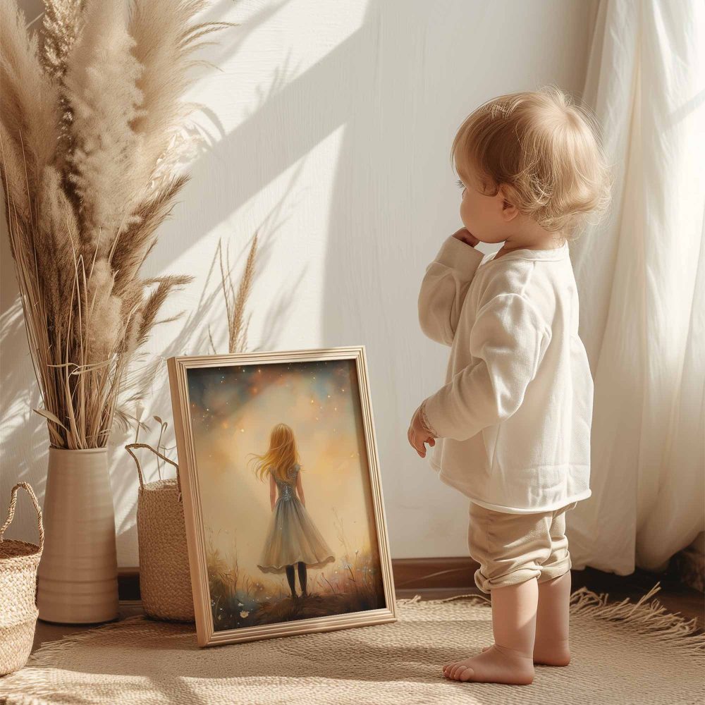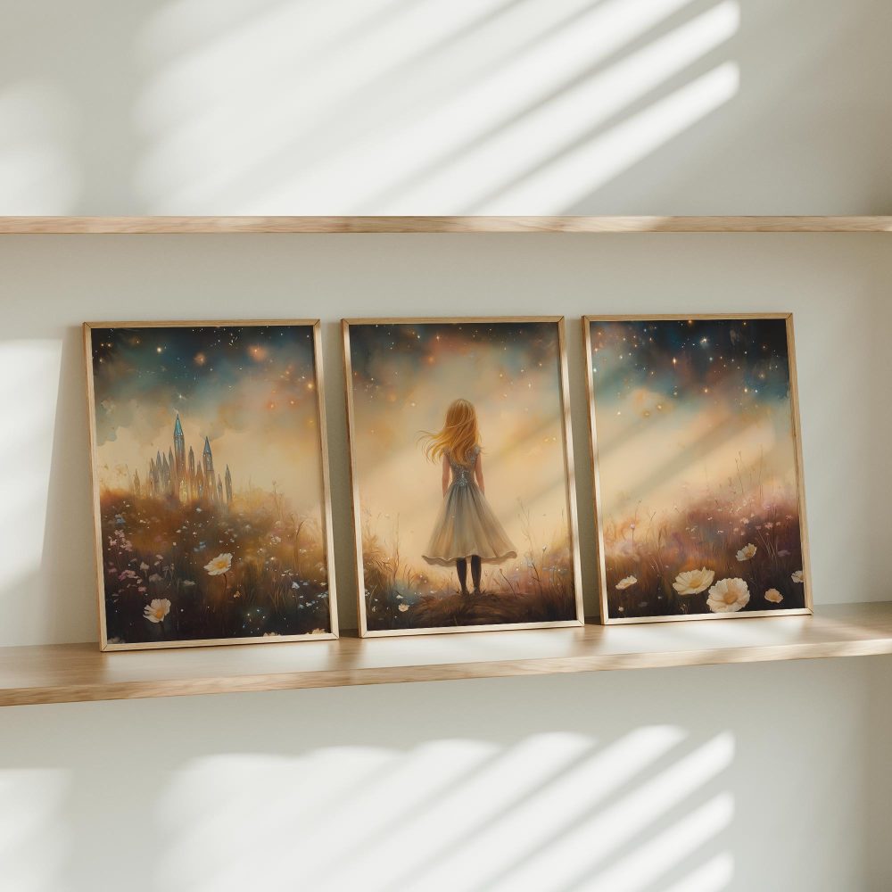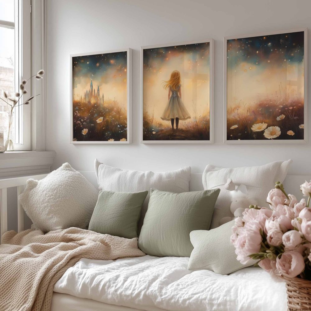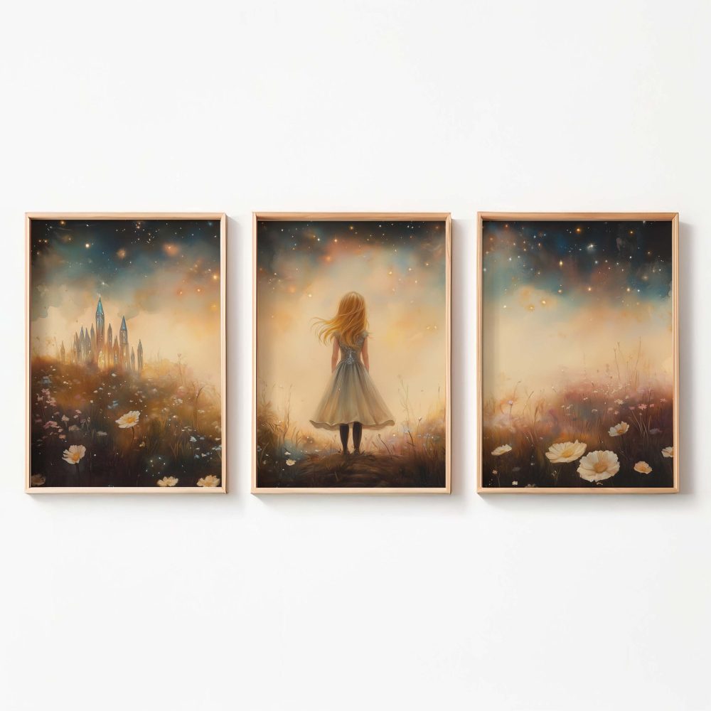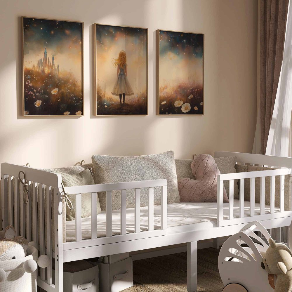 Terug naar collectie / Kinderkamer posters / Bloemen posters / Betoverend Meisje in Bloemenveld met Kasteel