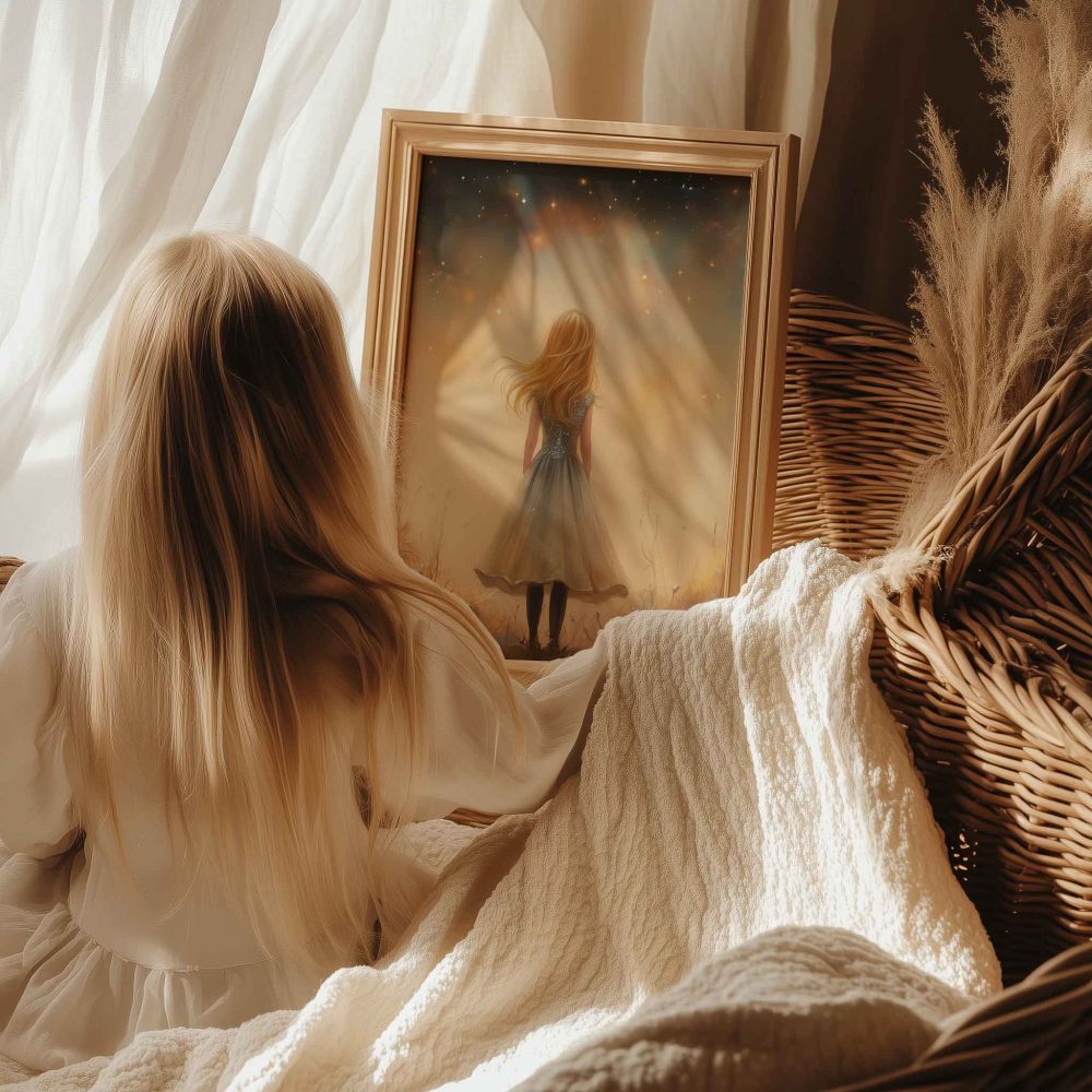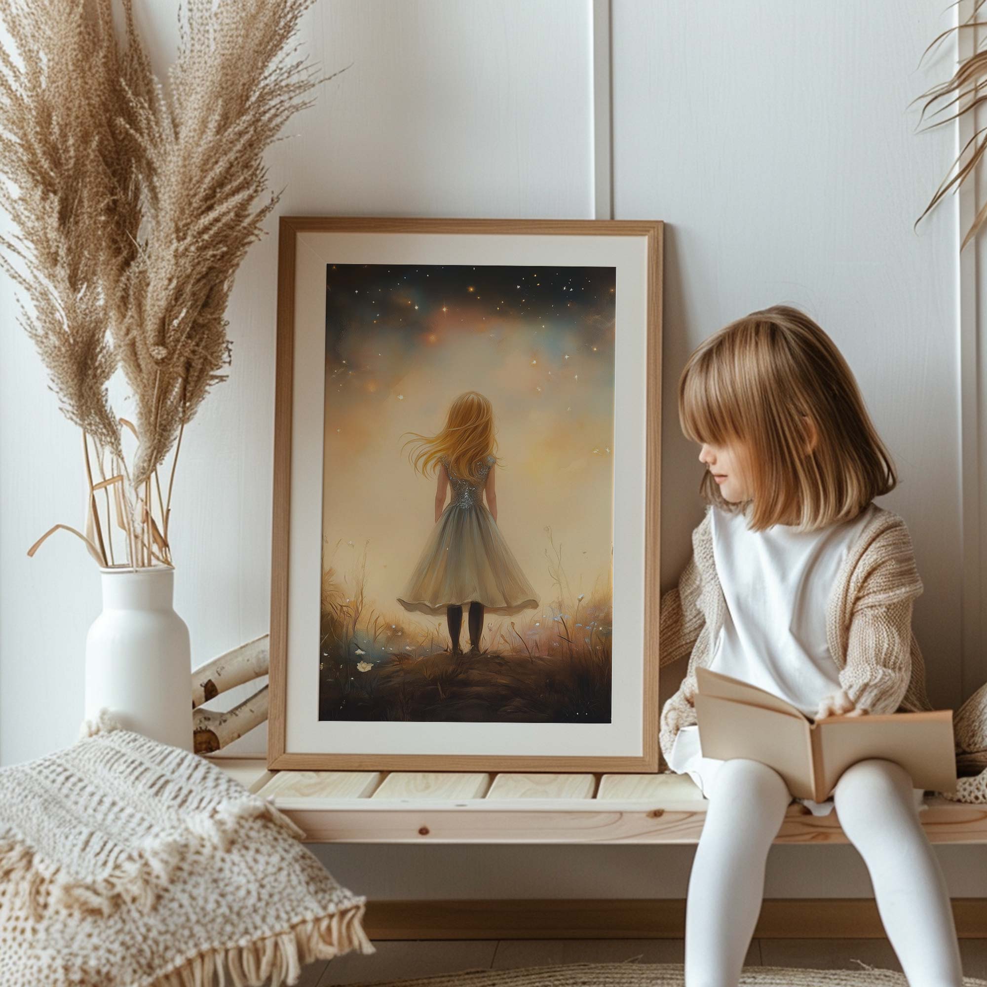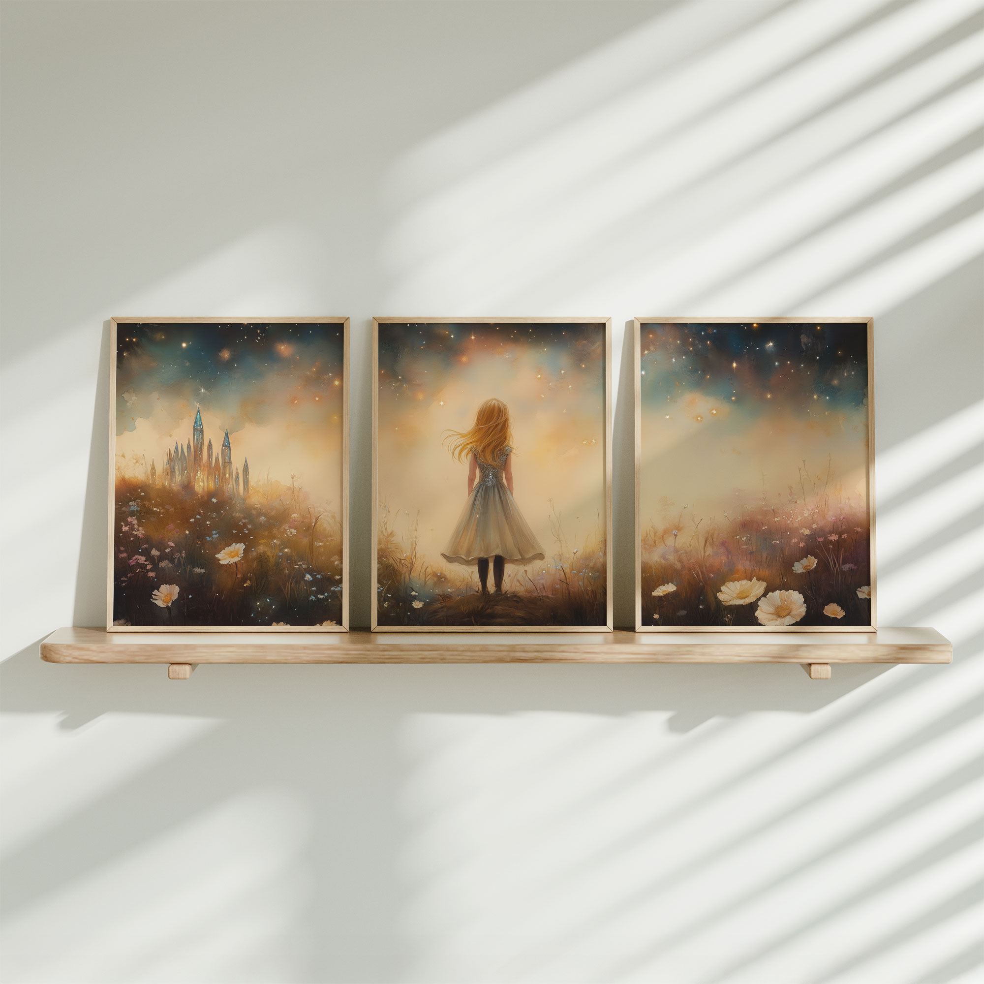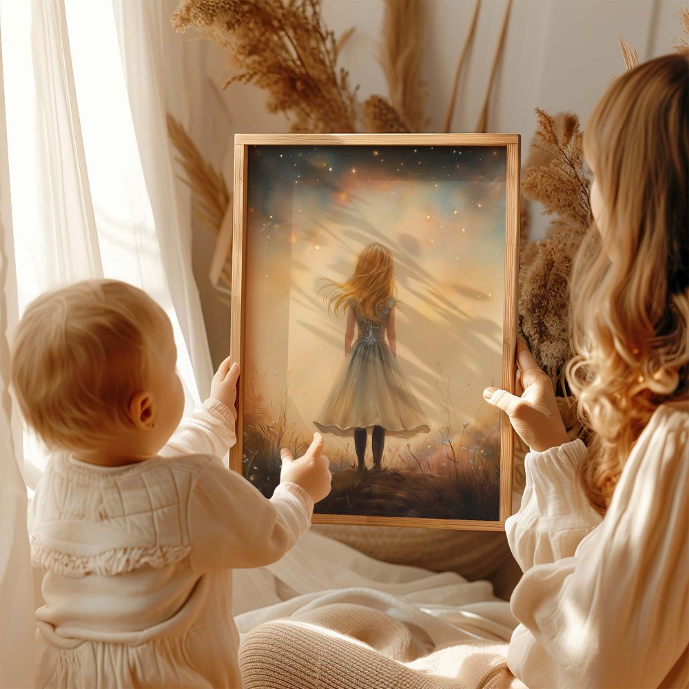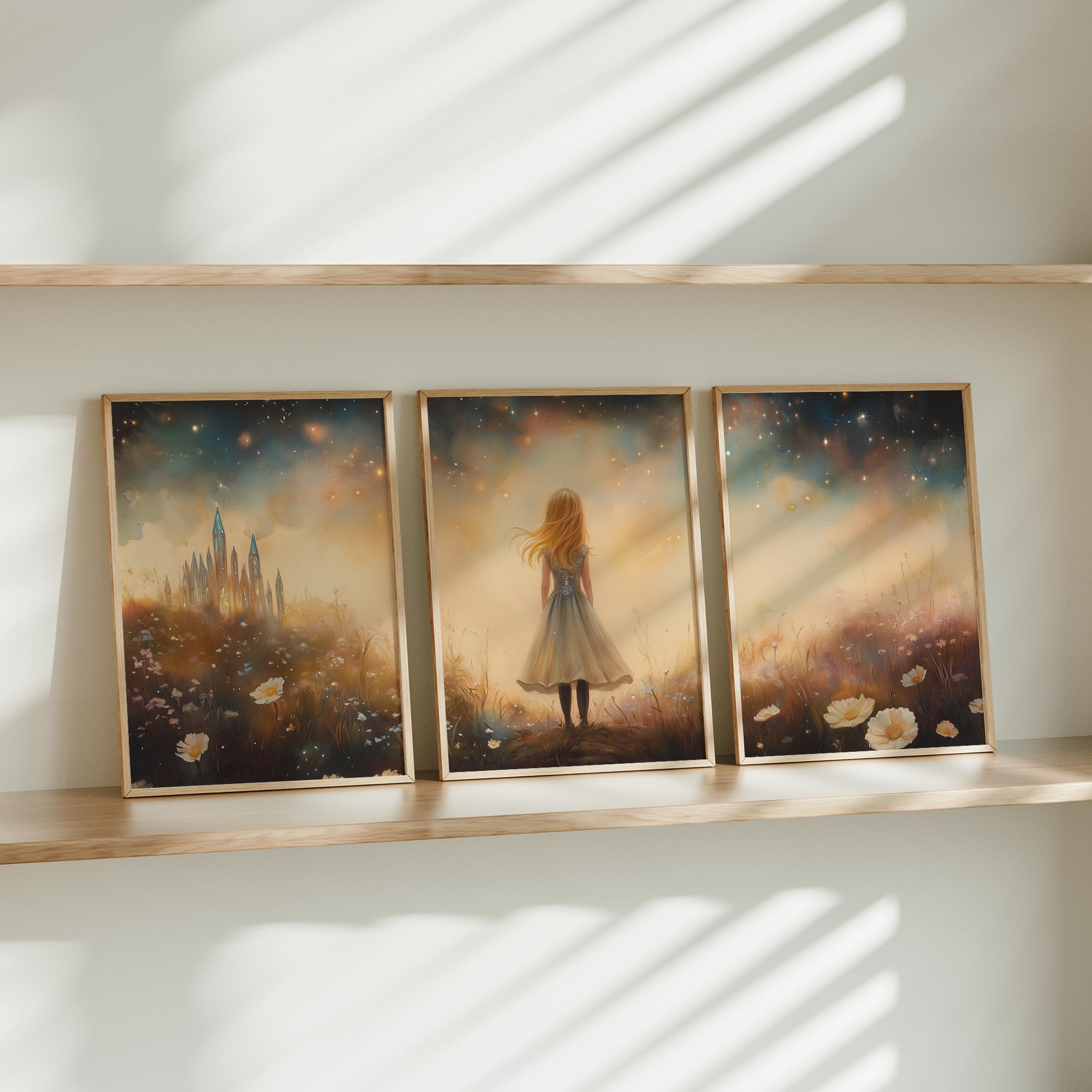 Terug naar collectie / Kinderkamer posters / Bloemen posters / Betoverend Meisje in Bloemenveld met Kasteel