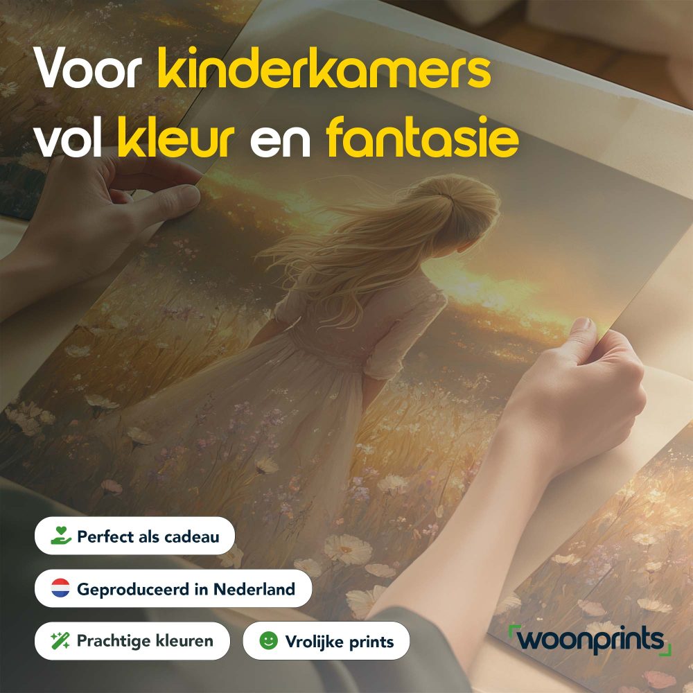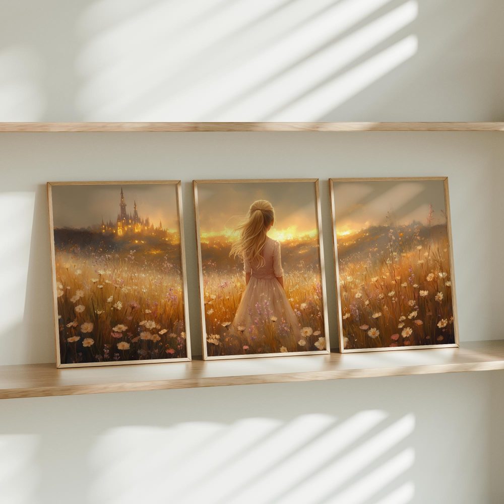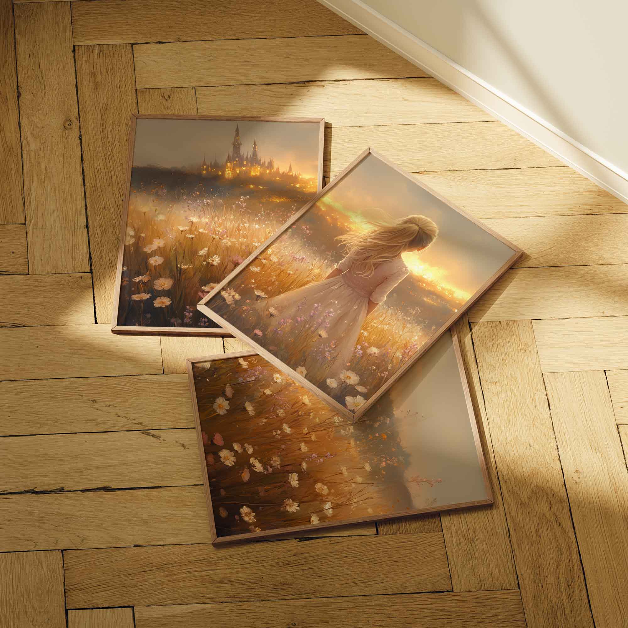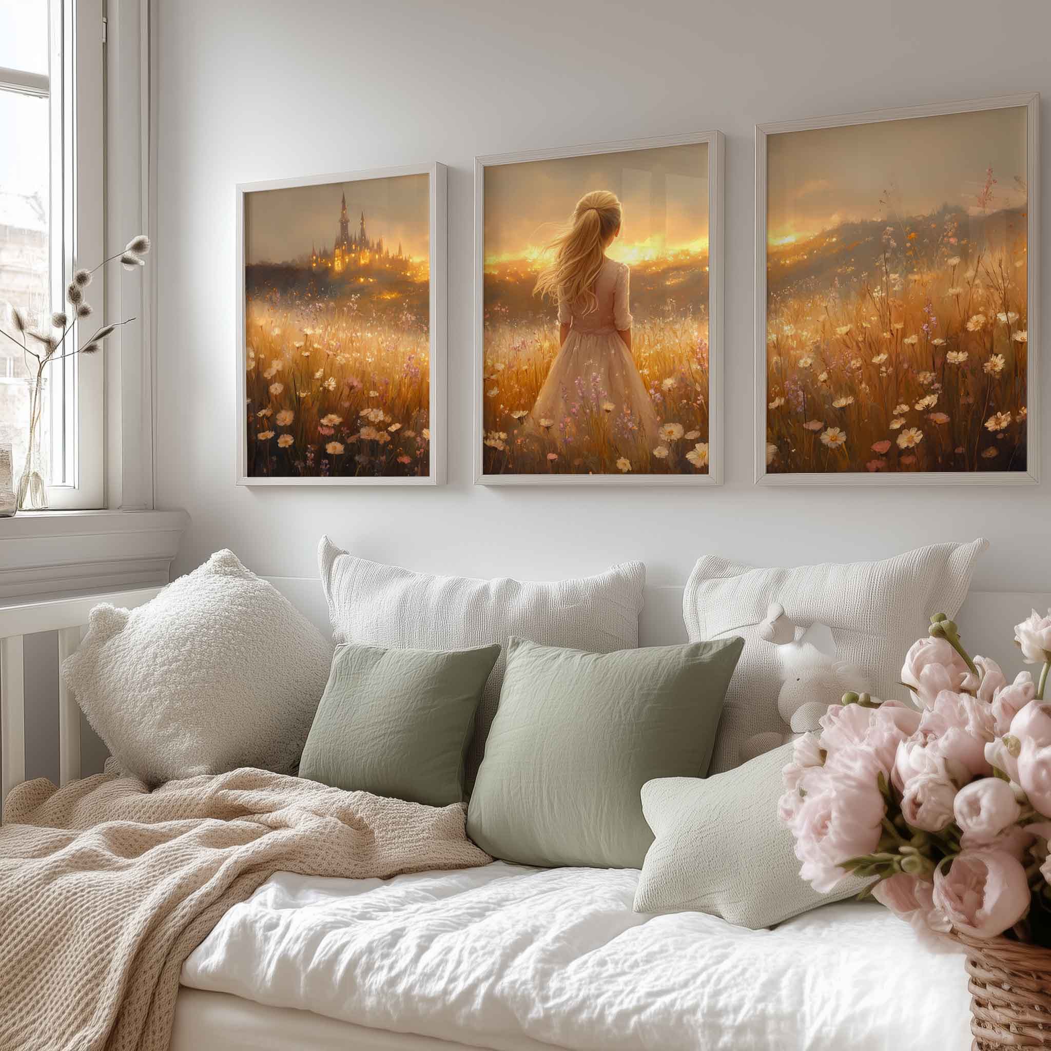 Terug naar collectie / Kinderkamer posters / Bloemen posters / Betoverend Meisje in Bloemenveld met Sprookjeskasteel