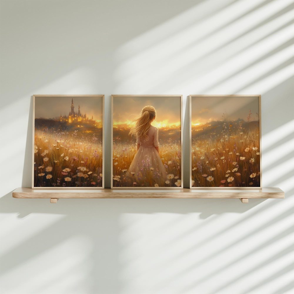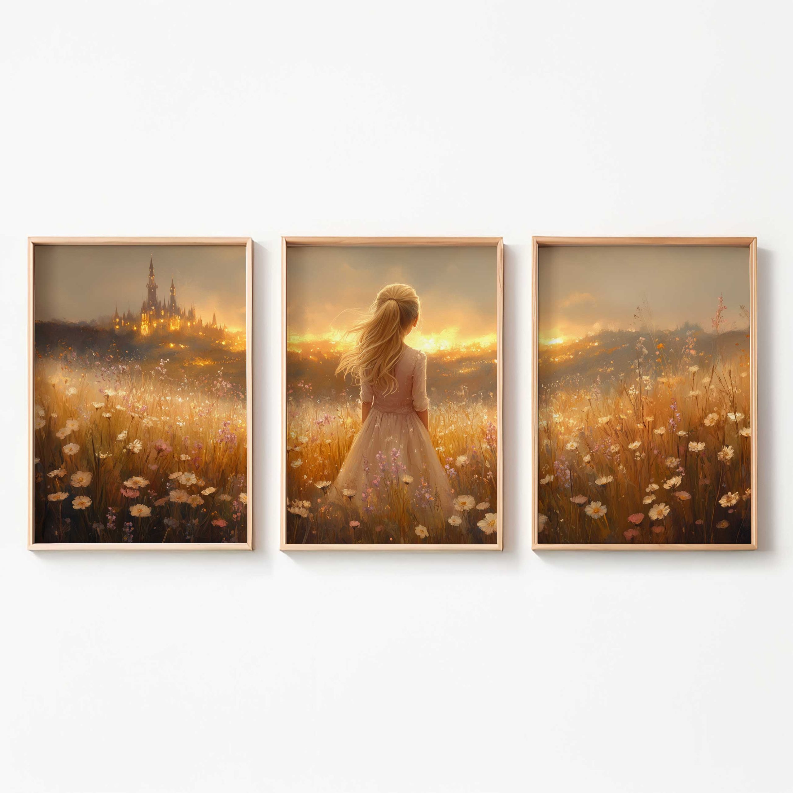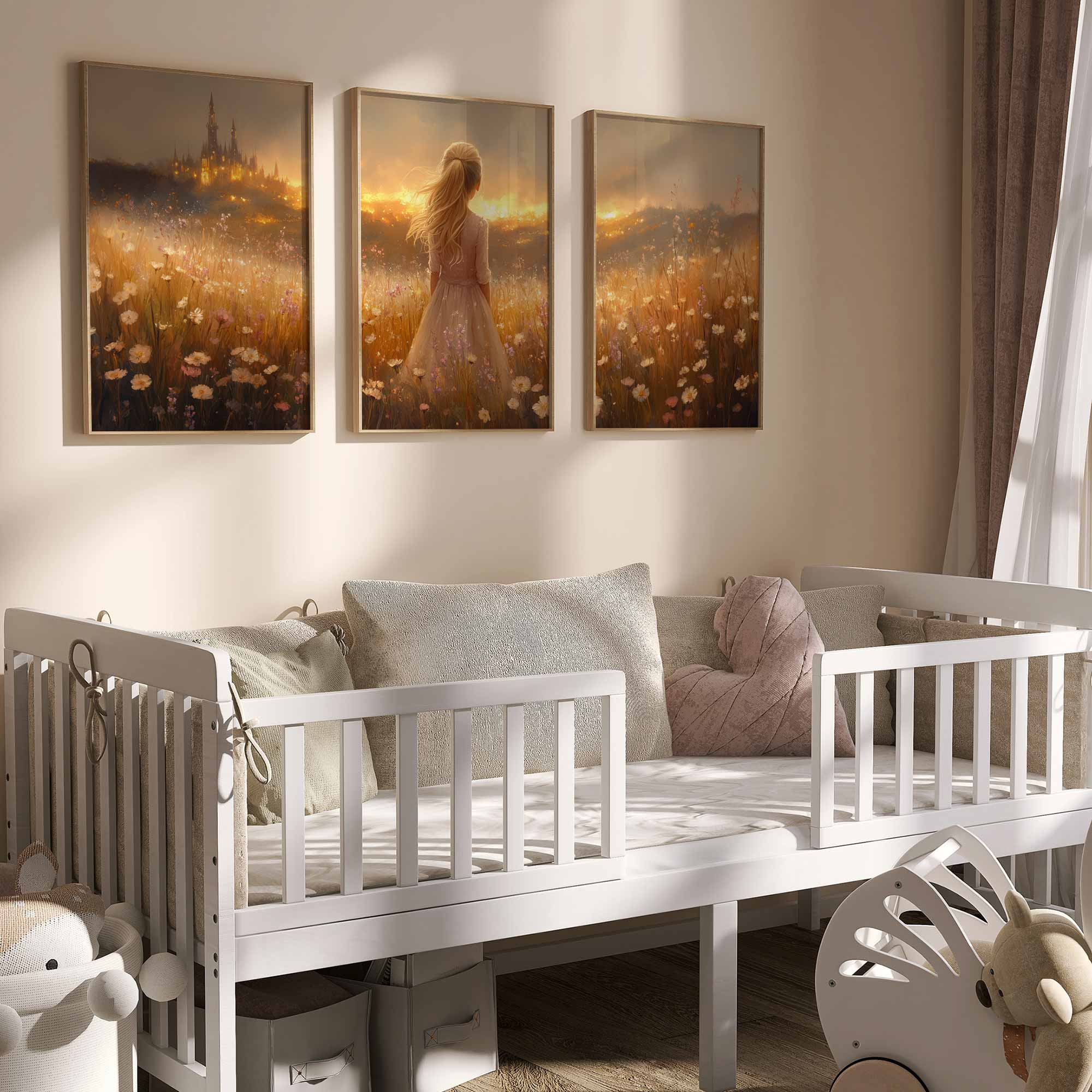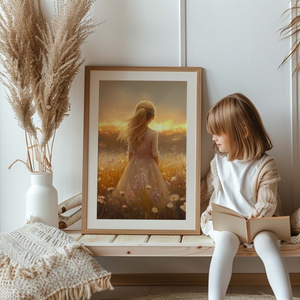 Terug naar collectie / Kinderkamer posters / Bloemen posters / Betoverend Meisje in Bloemenveld met Sprookjeskasteel