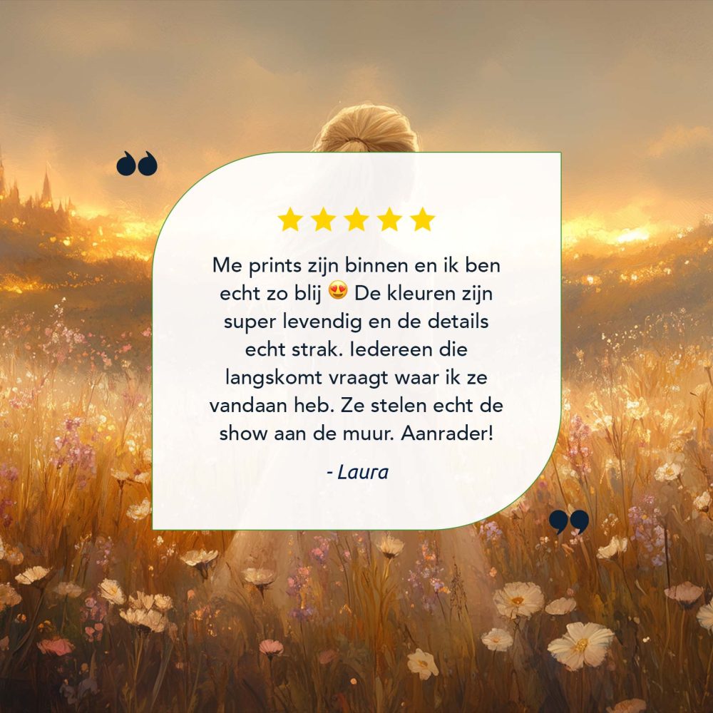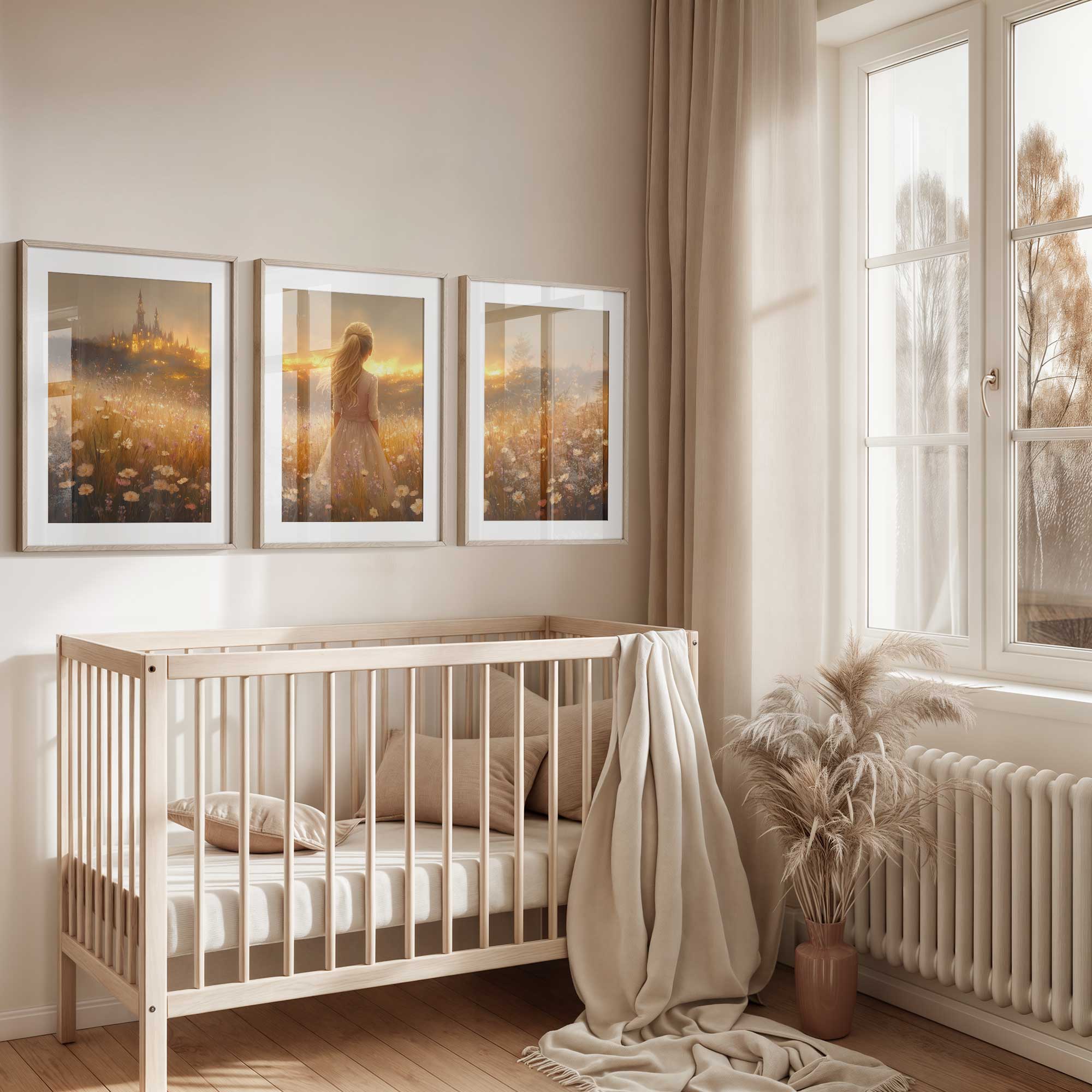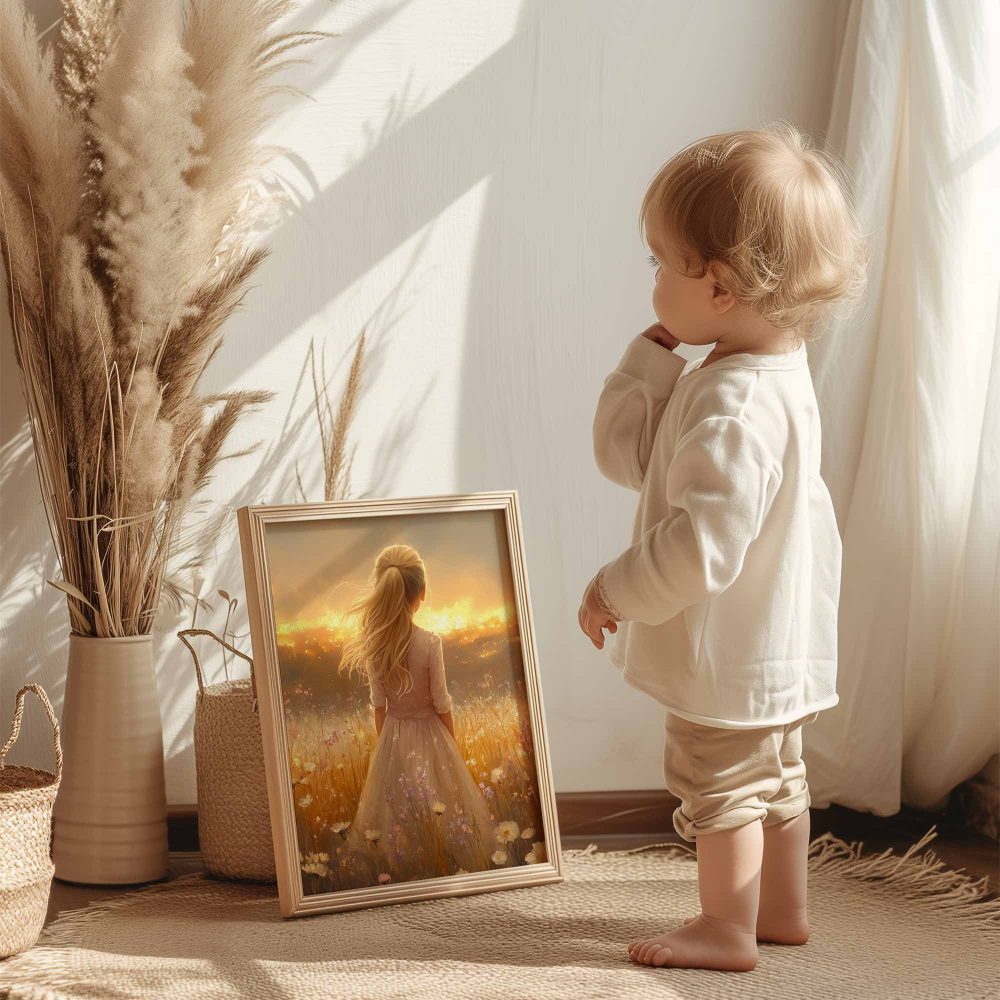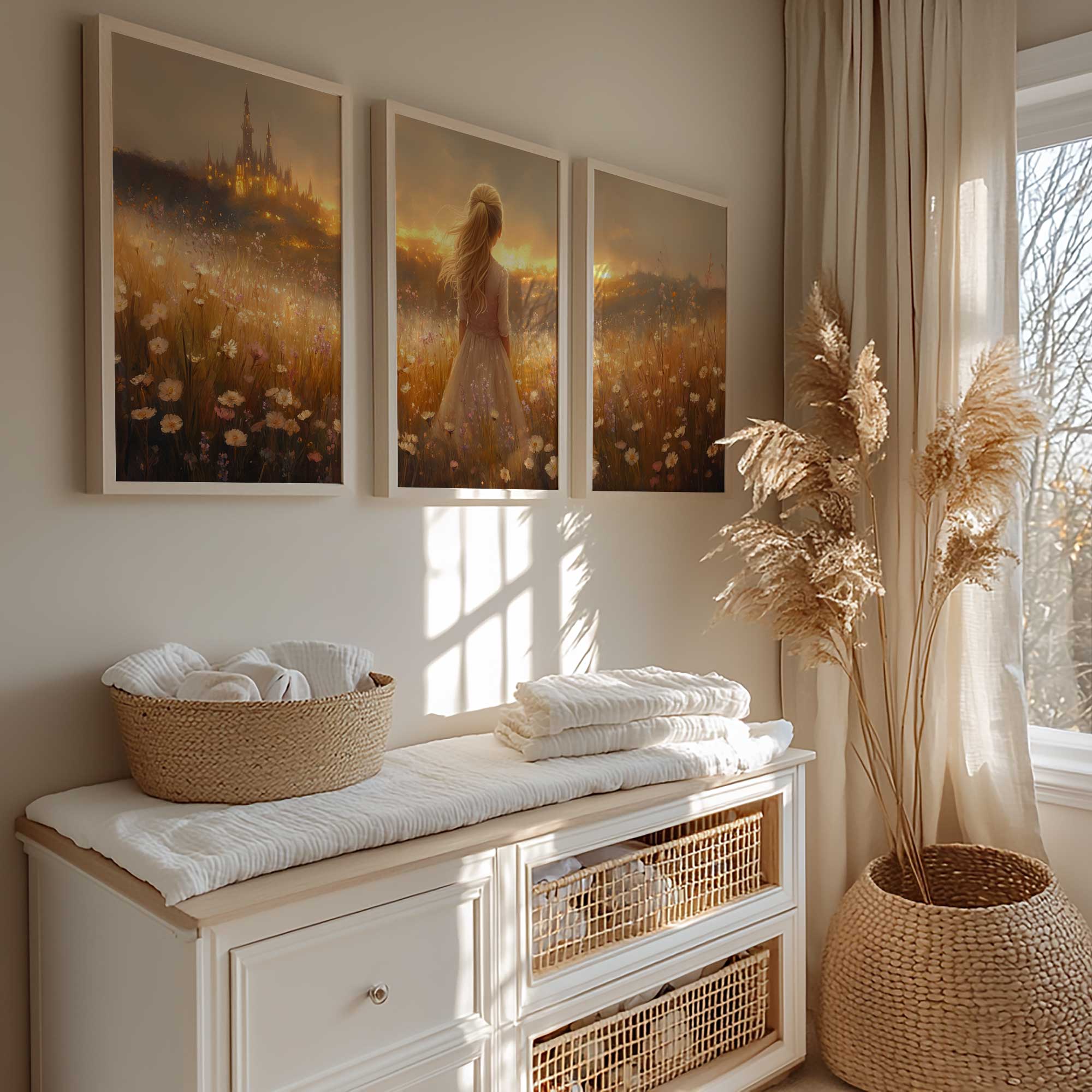 Terug naar collectie / Kinderkamer posters / Bloemen posters / Betoverend Meisje in Bloemenveld met Sprookjeskasteel