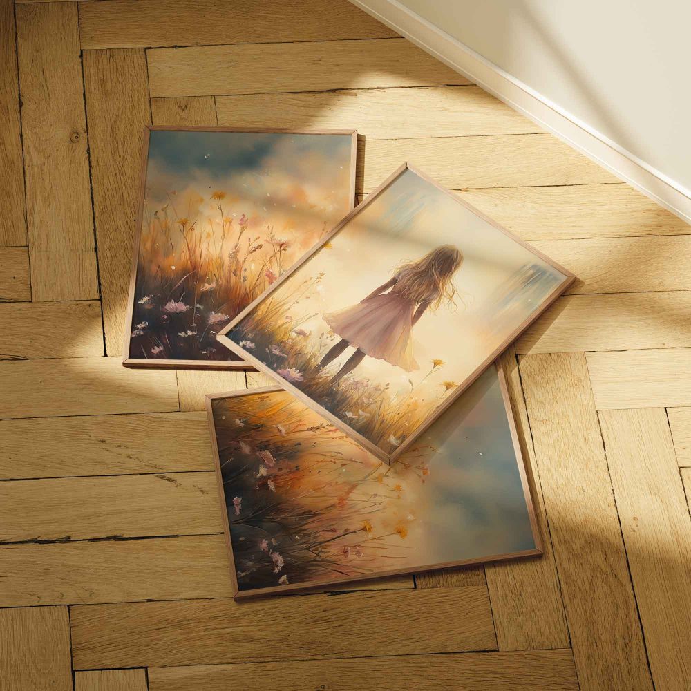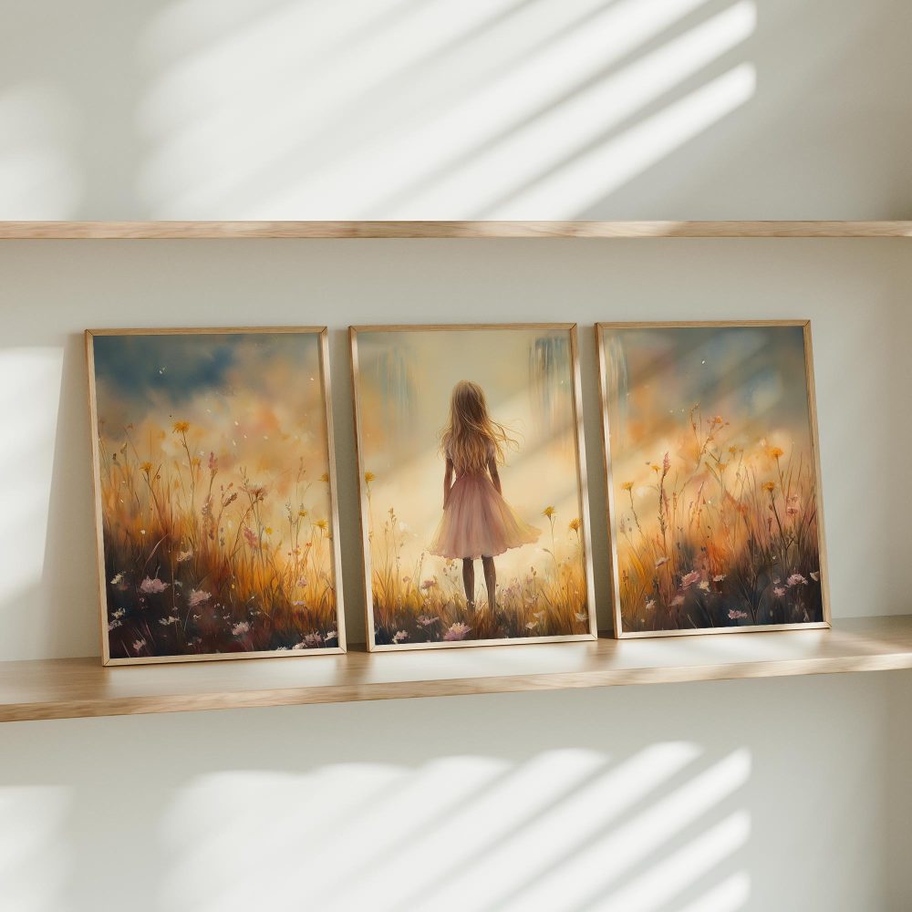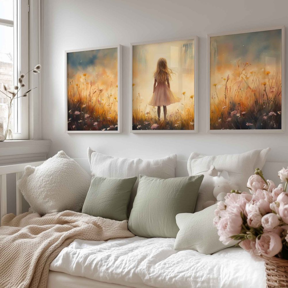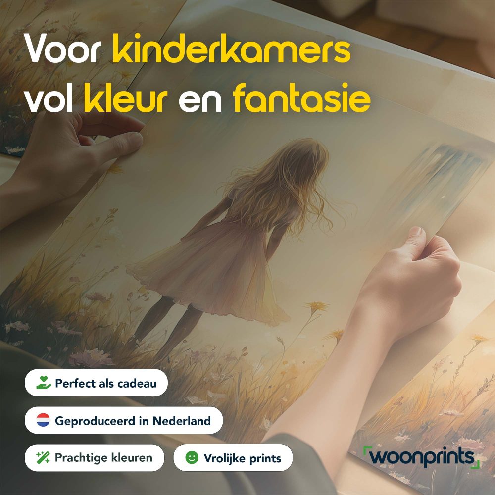 Terug naar collectie / Kinderkamer posters / Bloemen posters / Betoverend Meisje in Bloemenveld met Waterval