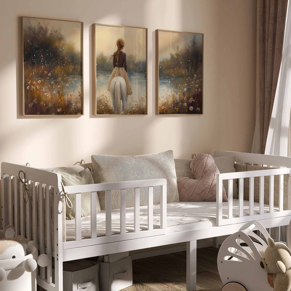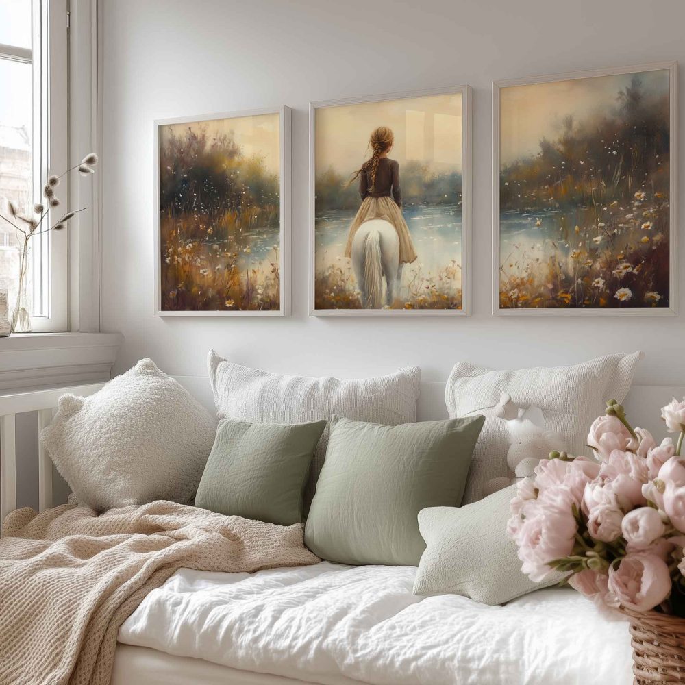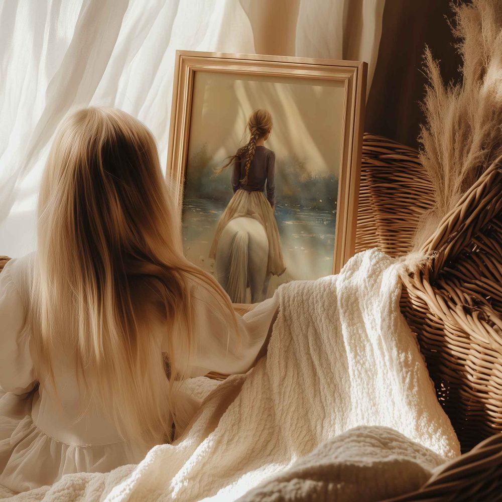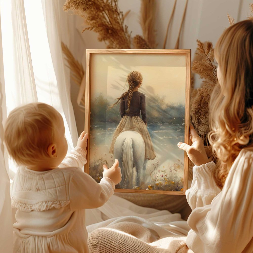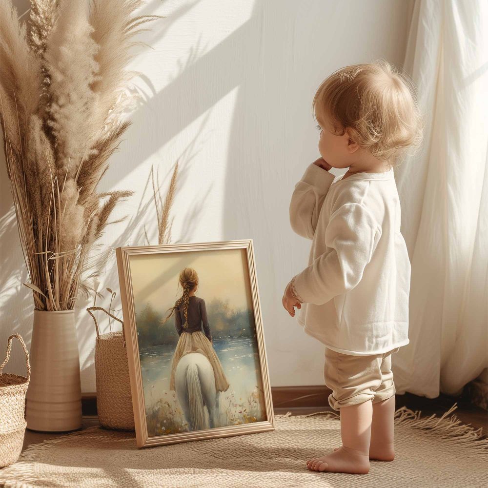 Terug naar collectie / Kinderkamer posters / Bloemen posters / Betoverend Meisje op Wit Paard in Bloemenveld