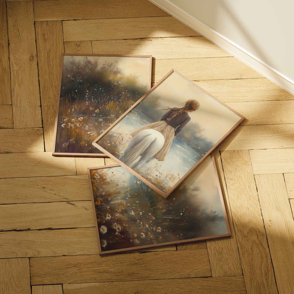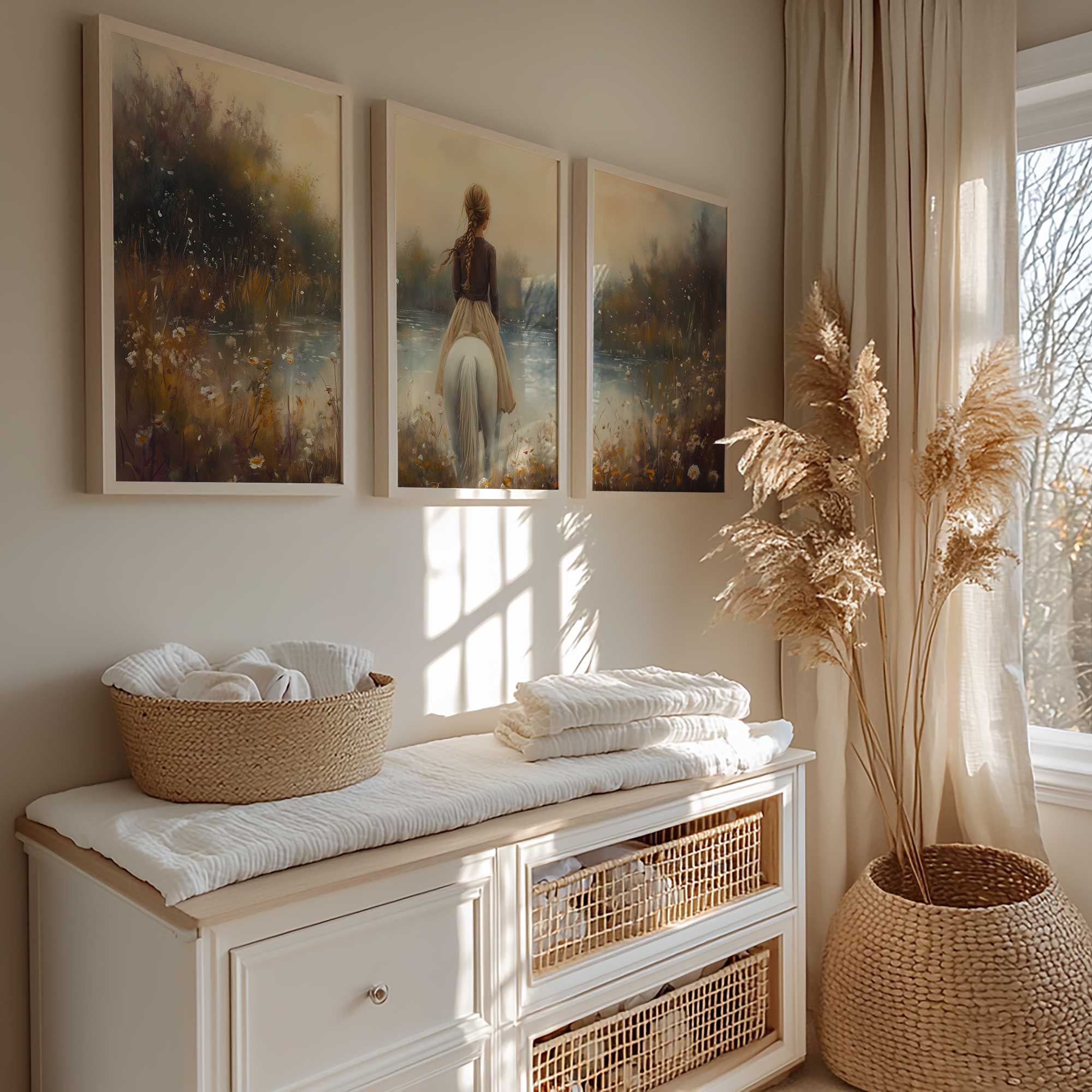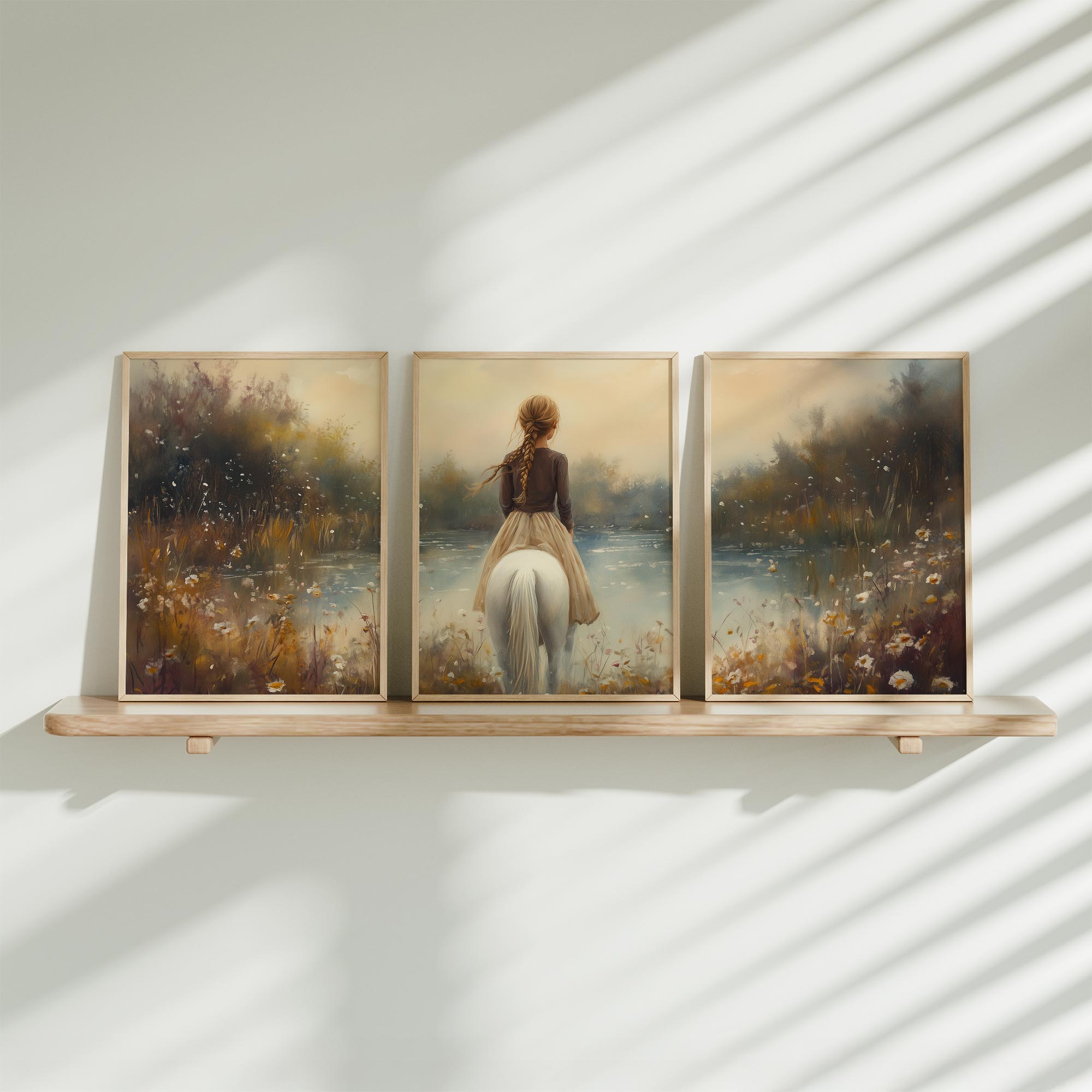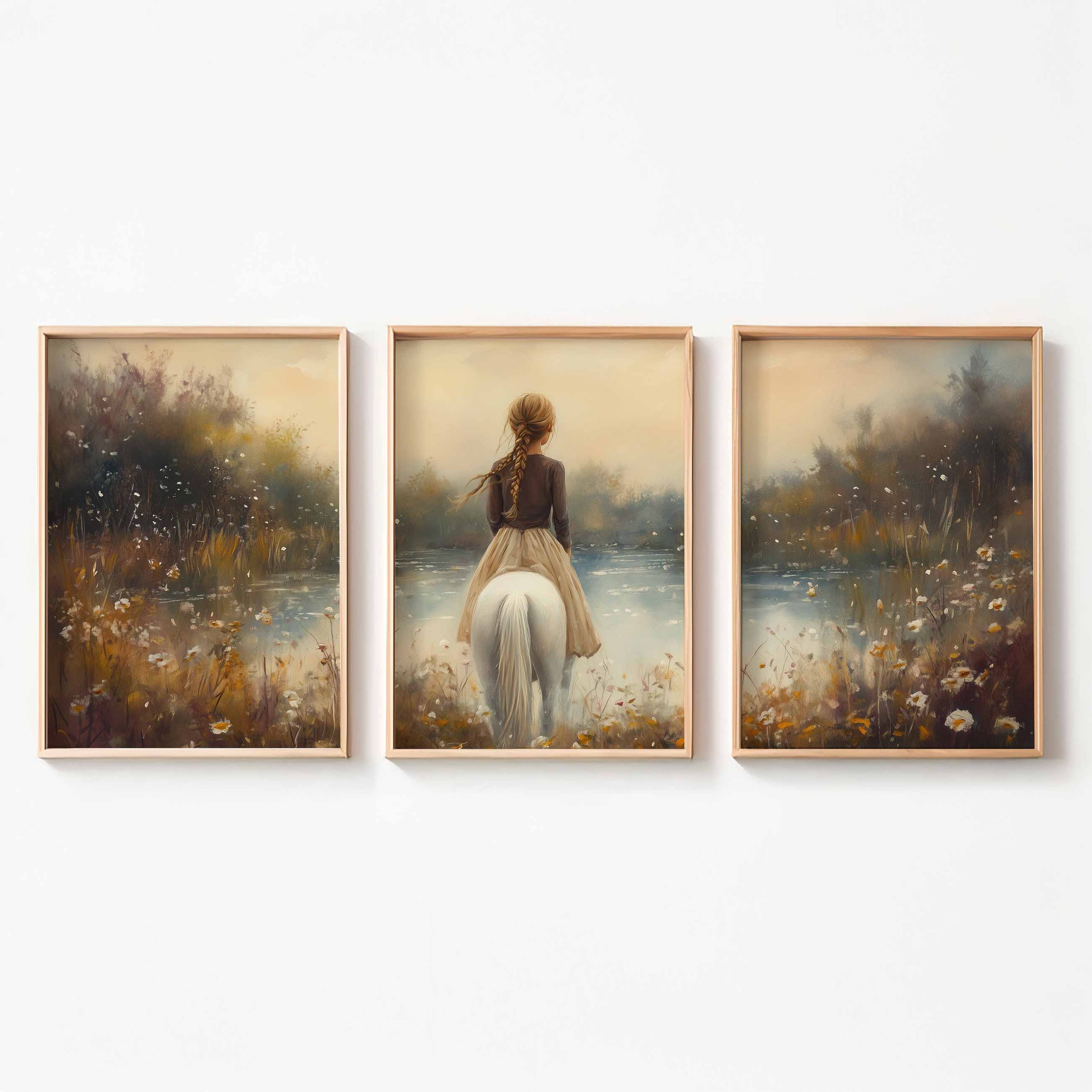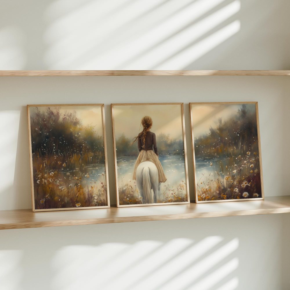 Terug naar collectie / Kinderkamer posters / Bloemen posters / Betoverend Meisje op Wit Paard in Bloemenveld
