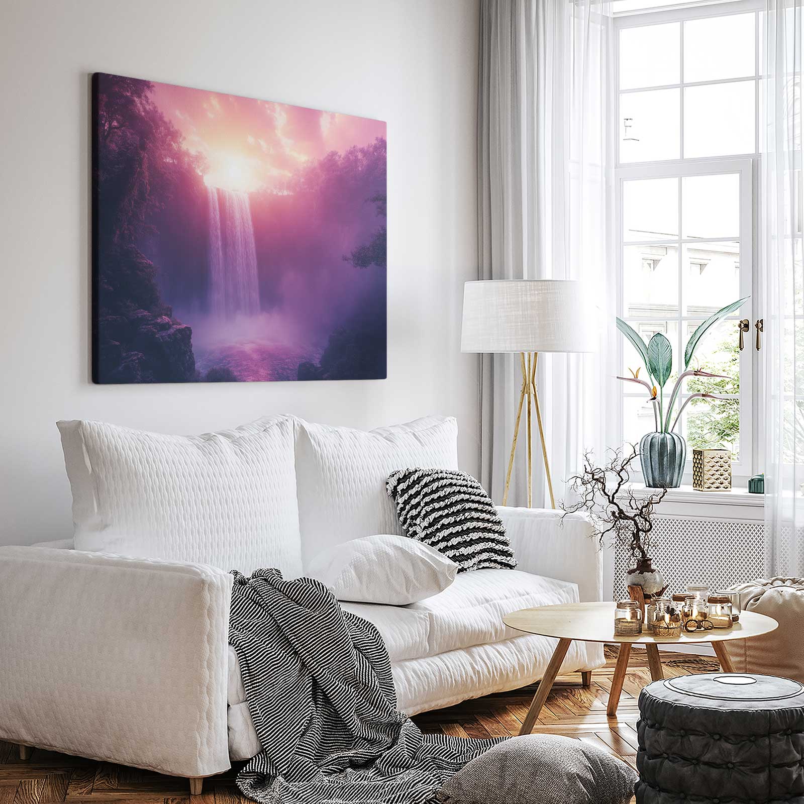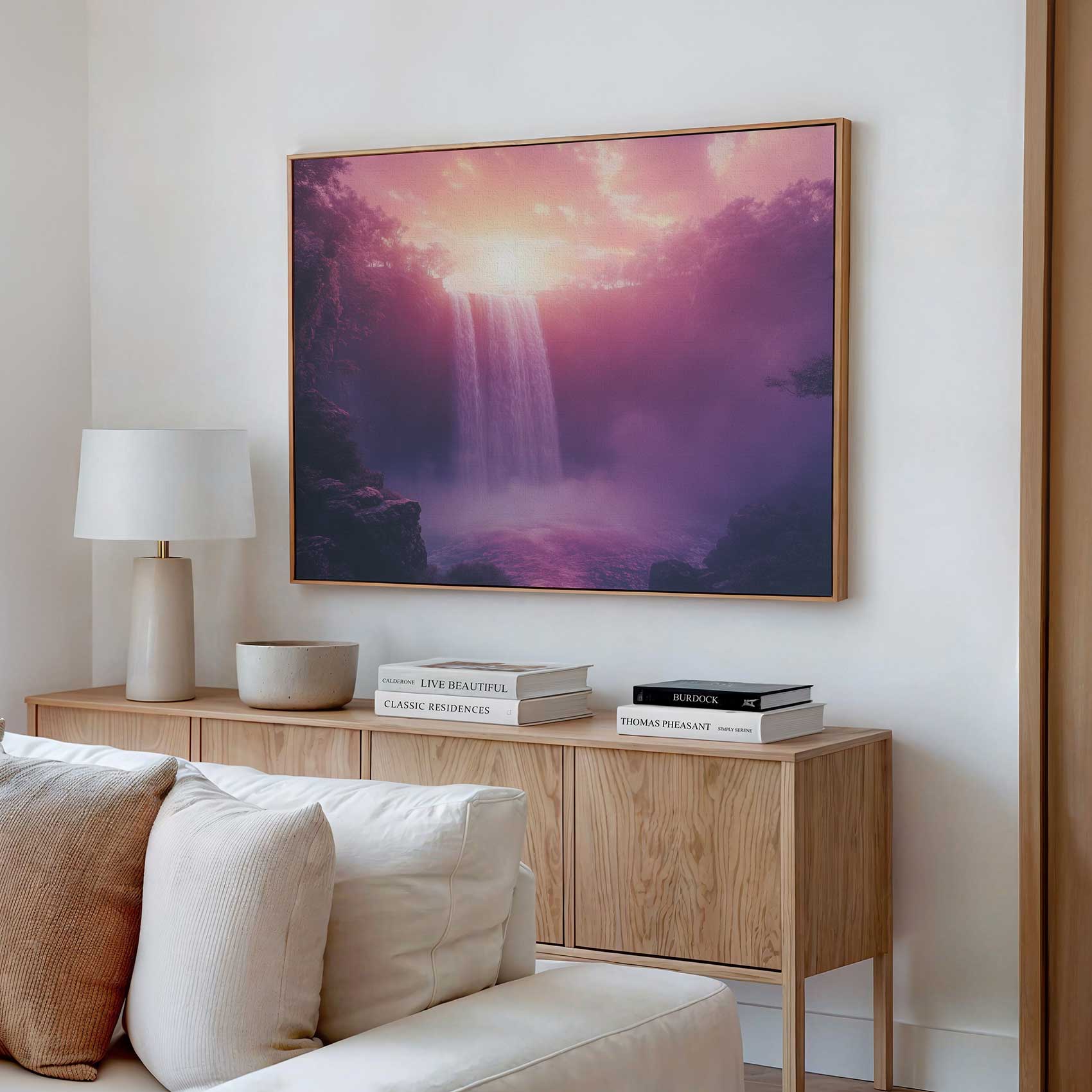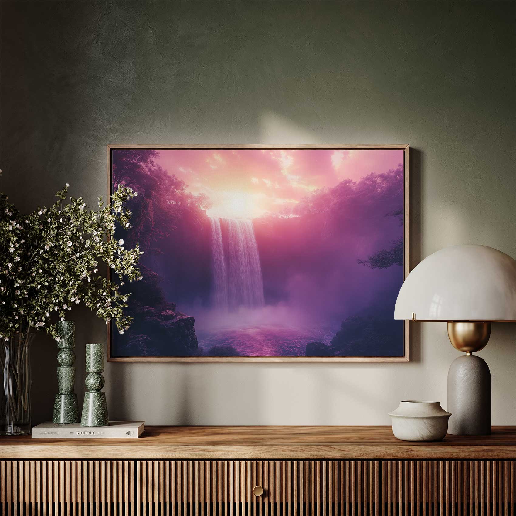 Terug naar collectie / Schilderijen / Bergen Schilderij / Betoverend Roze Waterval Landschap