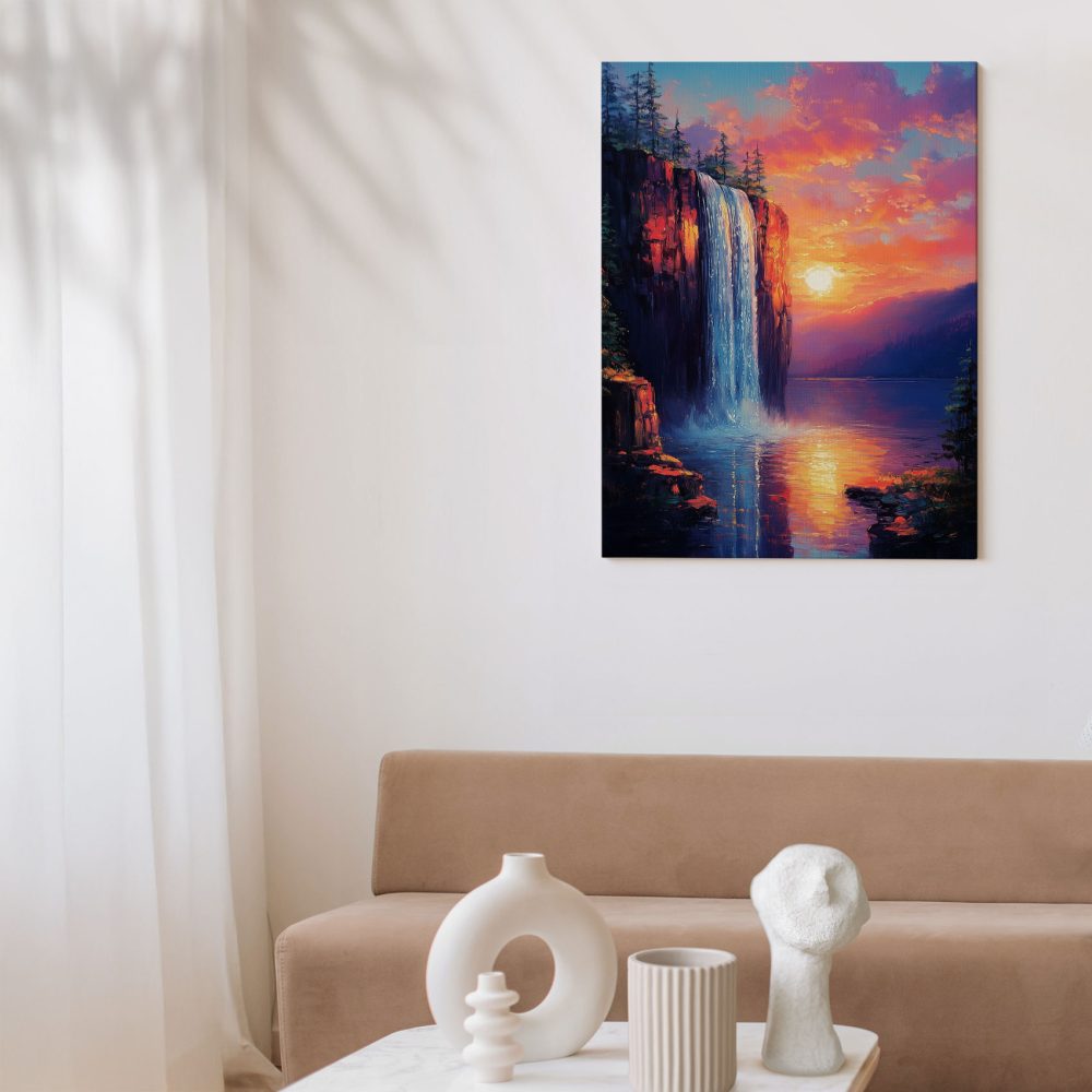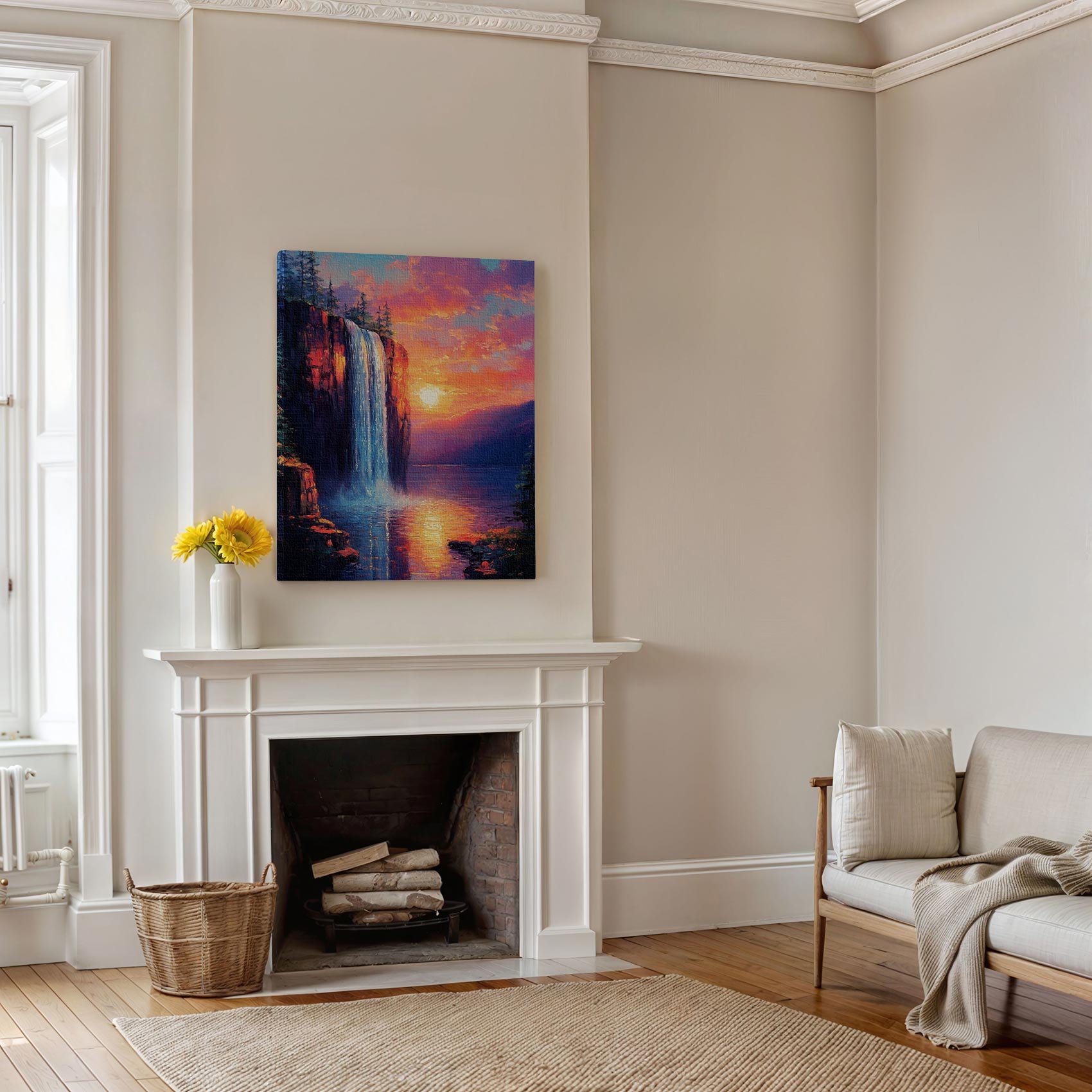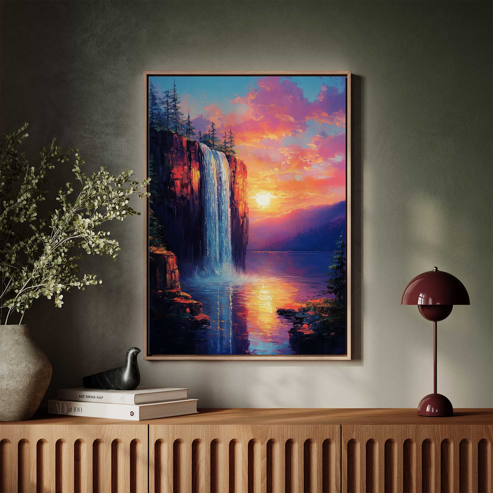 Terug naar collectie / Schilderijen / Bergen Schilderij / Betoverend waterval zonsondergang schilderij