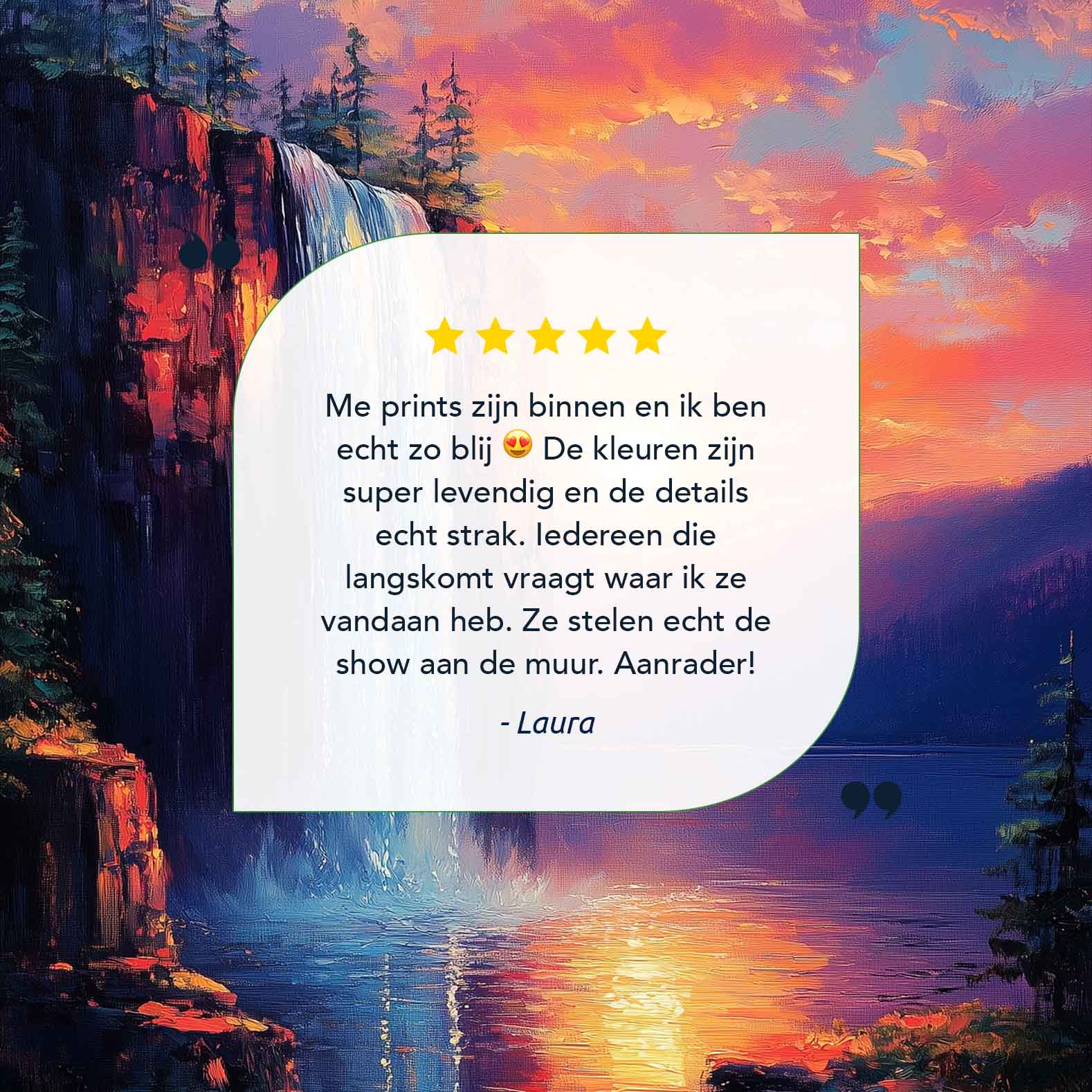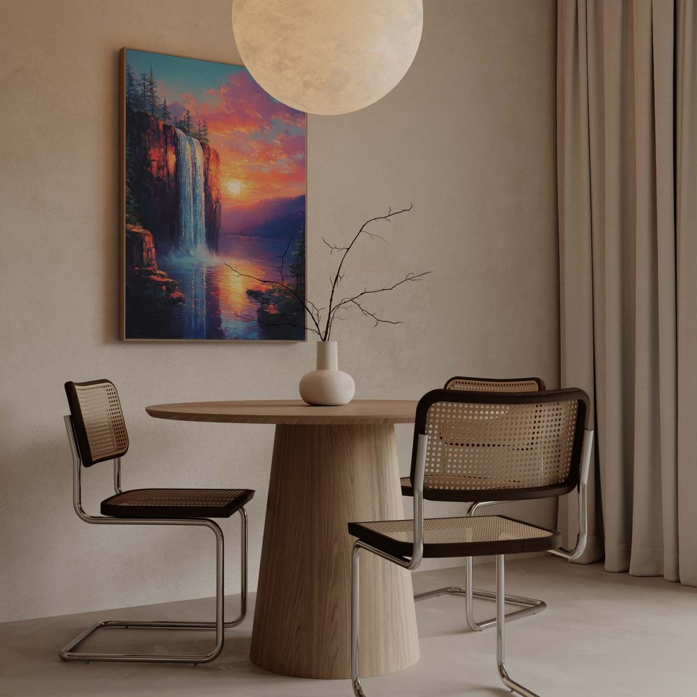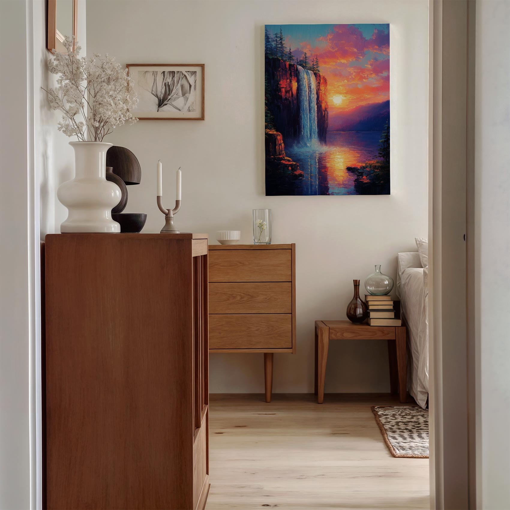Terug naar collectie / Schilderijen / Bergen Schilderij / Betoverend waterval zonsondergang schilderij