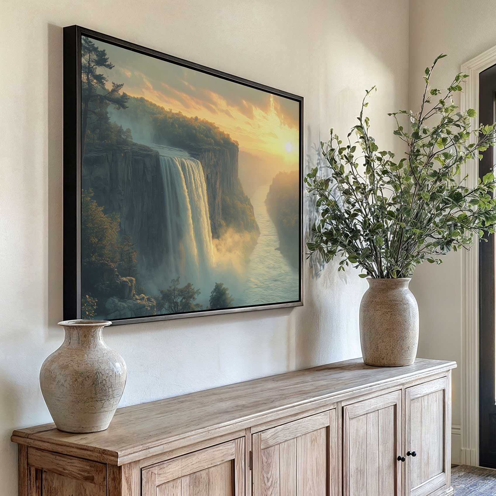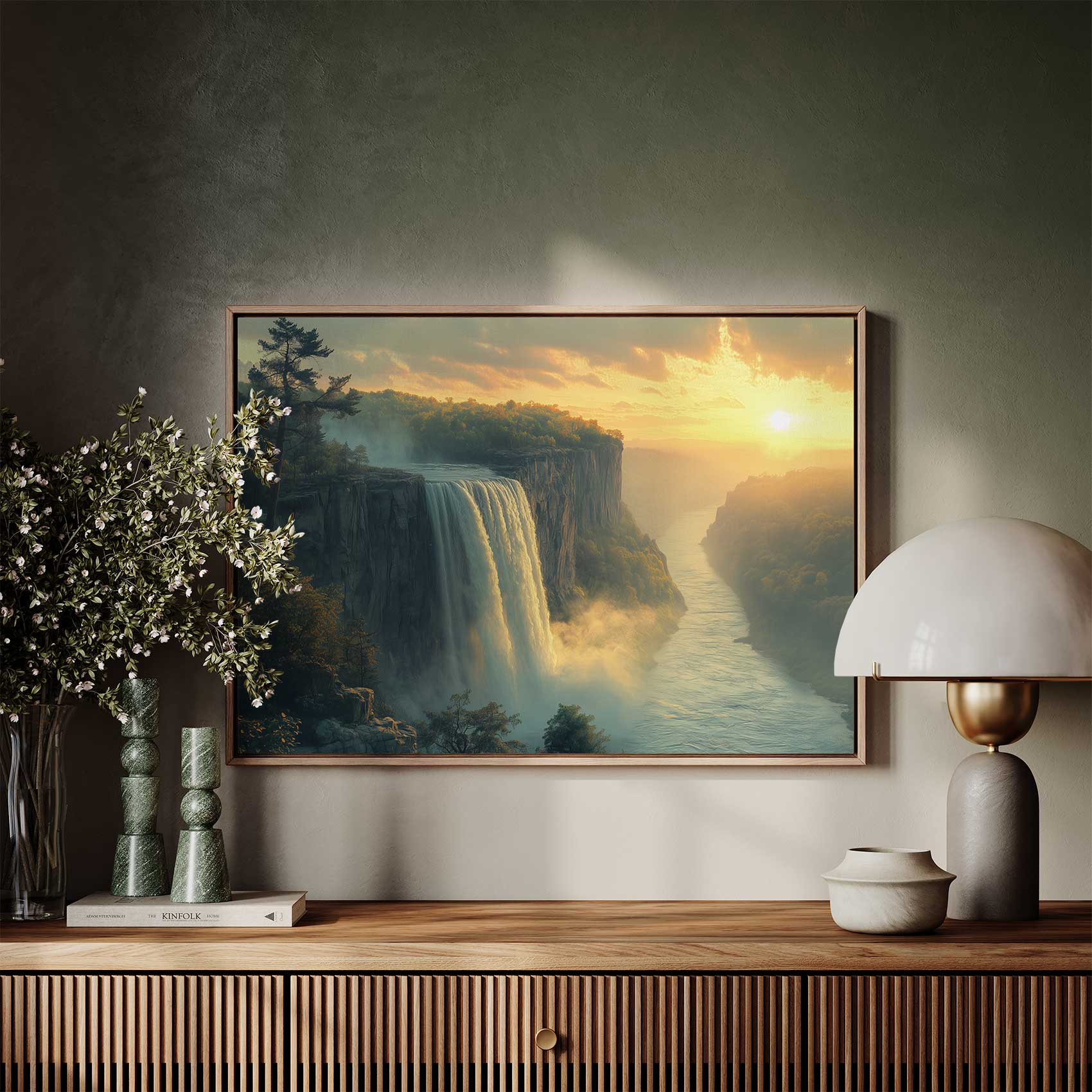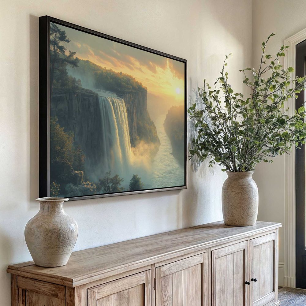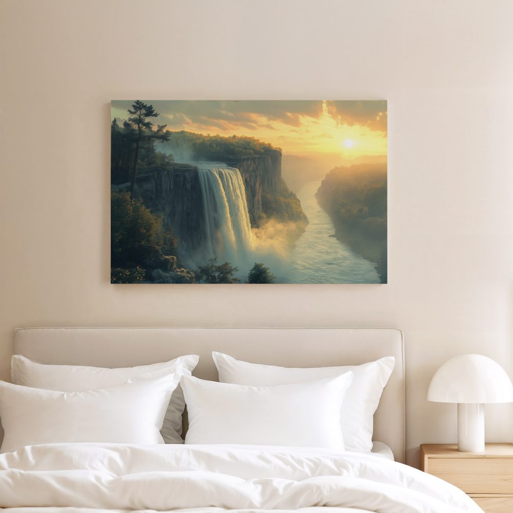 Terug naar collectie / Schilderijen / Bergen Schilderij / Betoverend waterval-zonsonderganglandschap