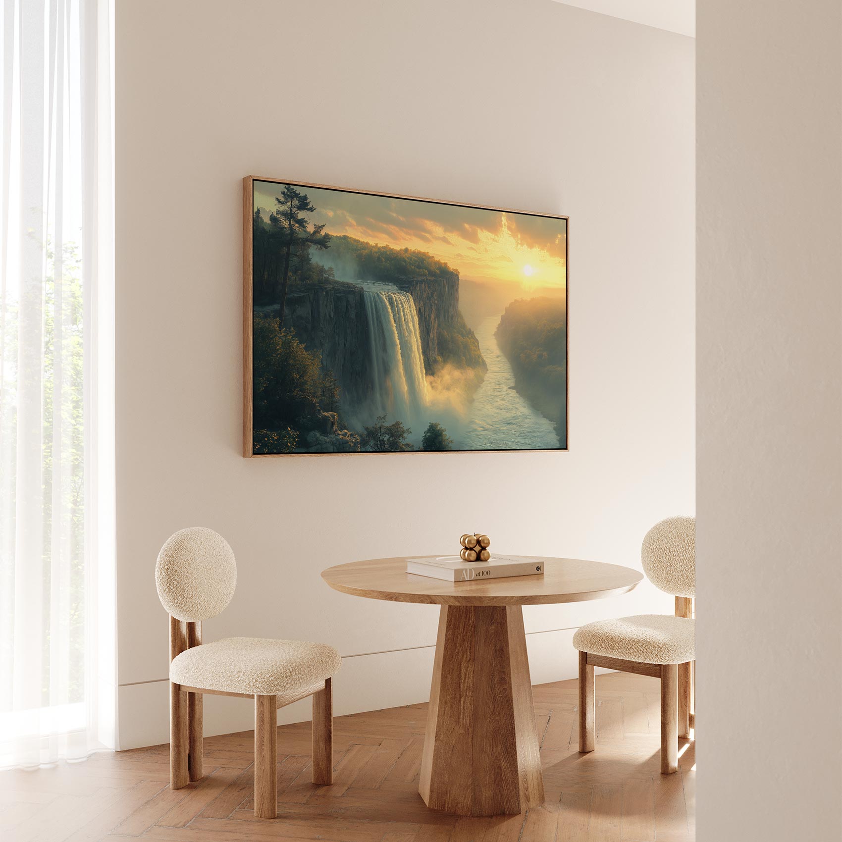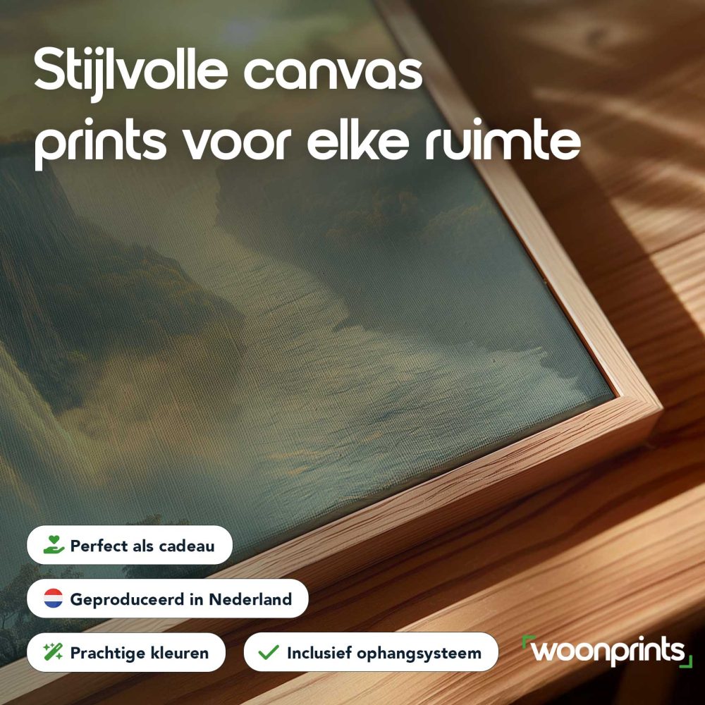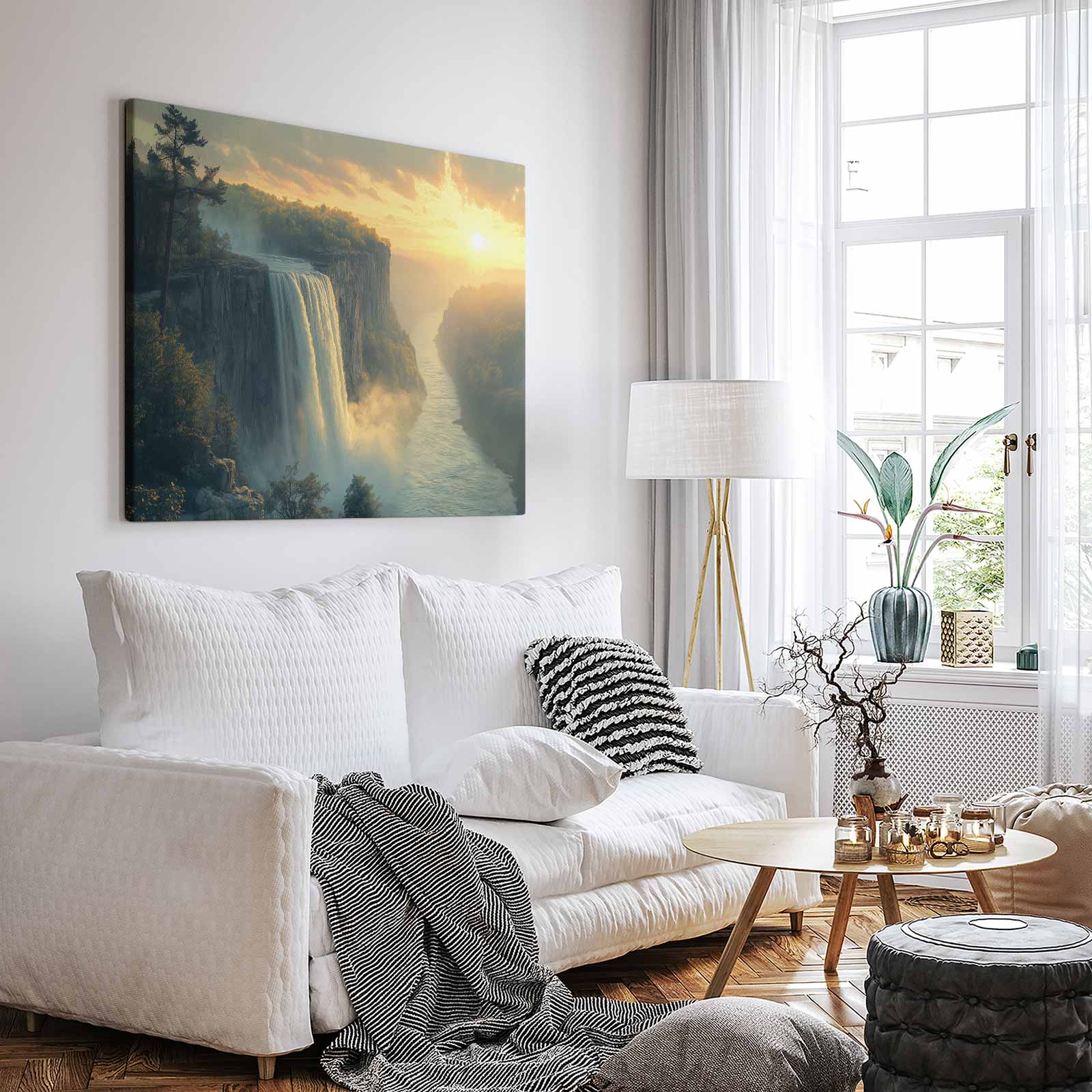 Terug naar collectie / Schilderijen / Bergen Schilderij / Betoverend waterval-zonsonderganglandschap