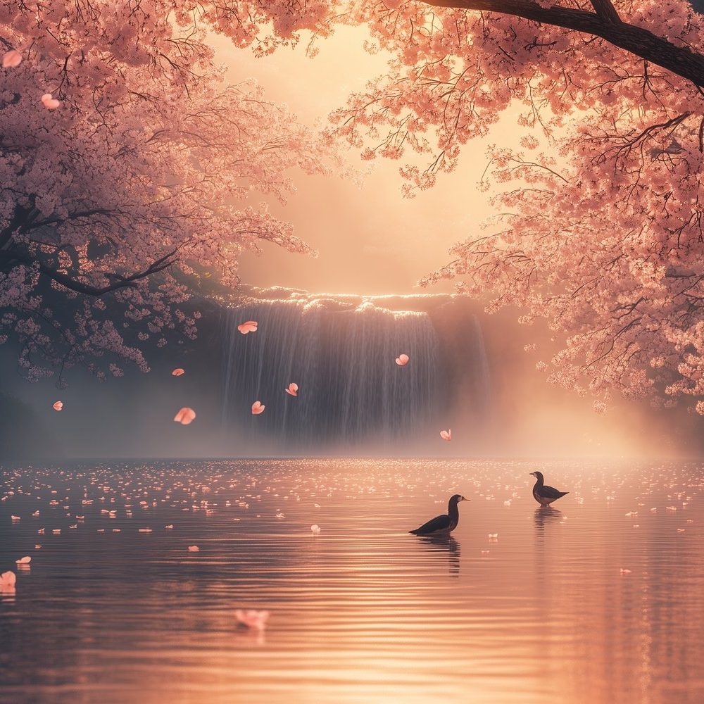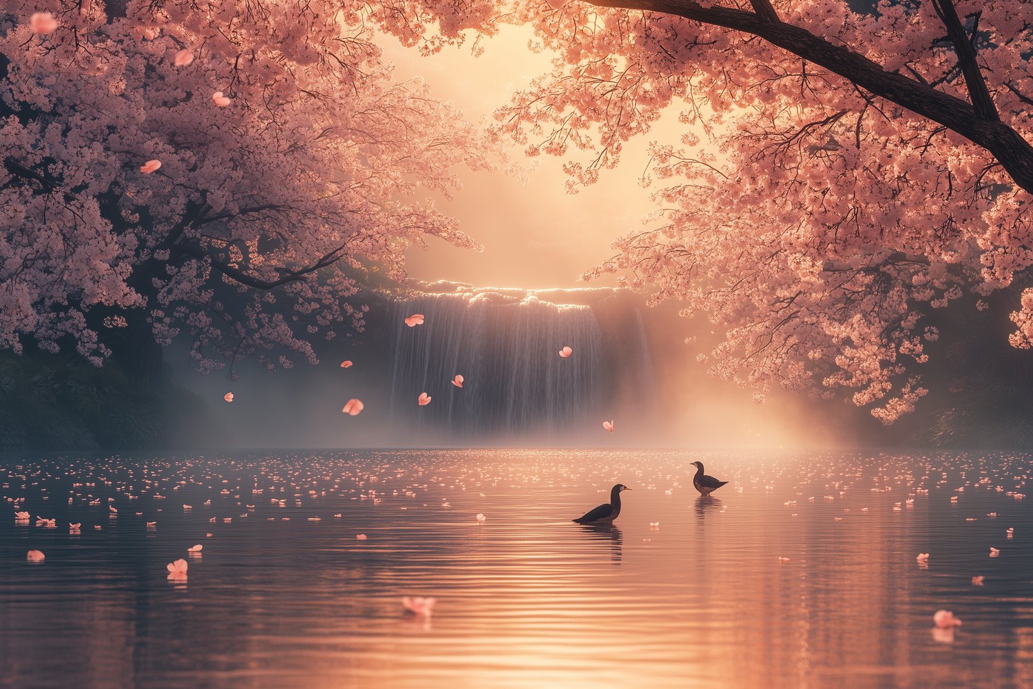 Betoverende waterval met eenden behang
