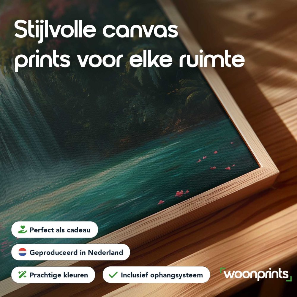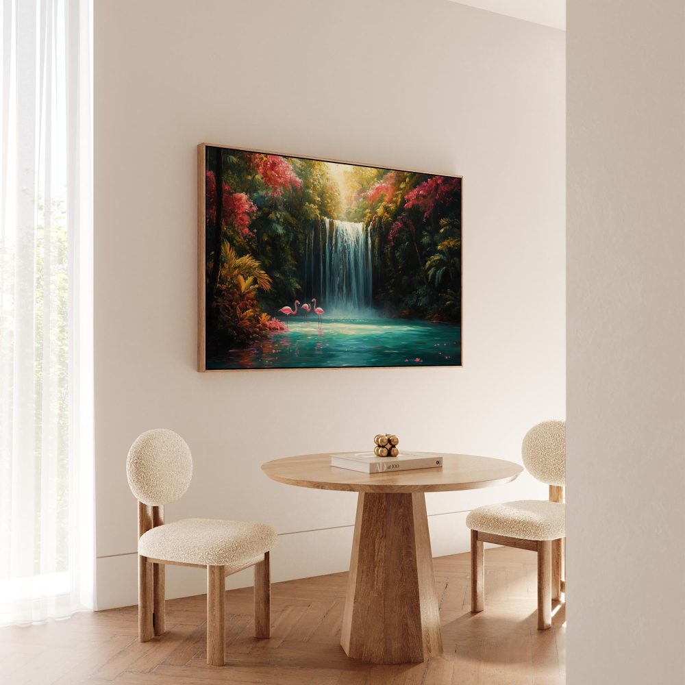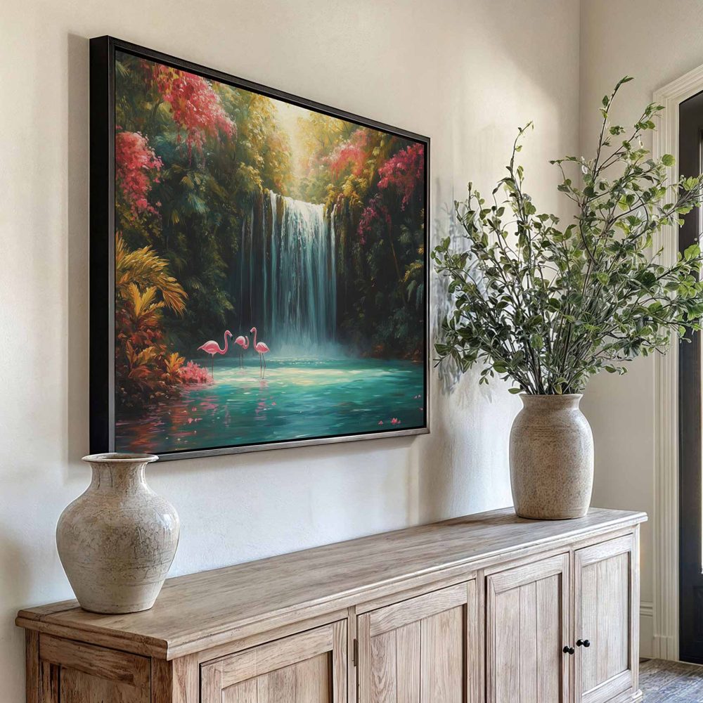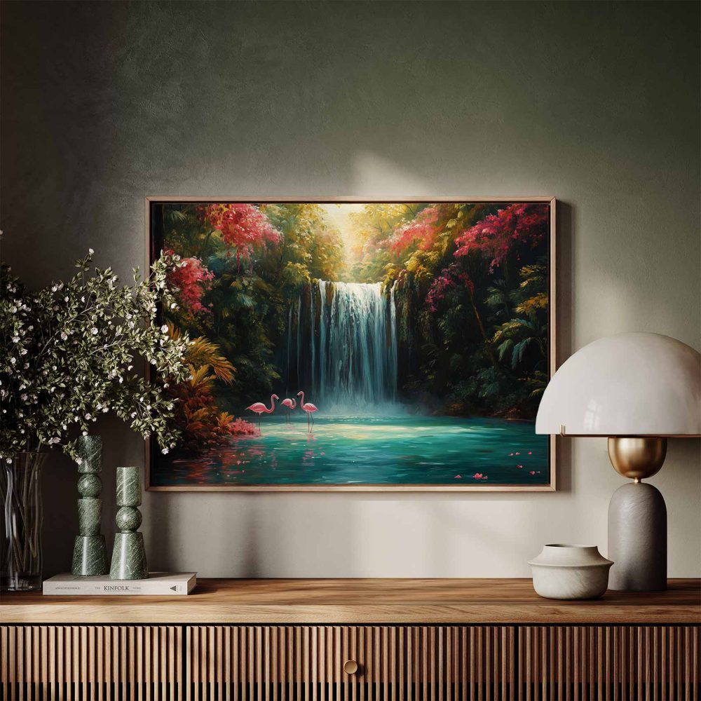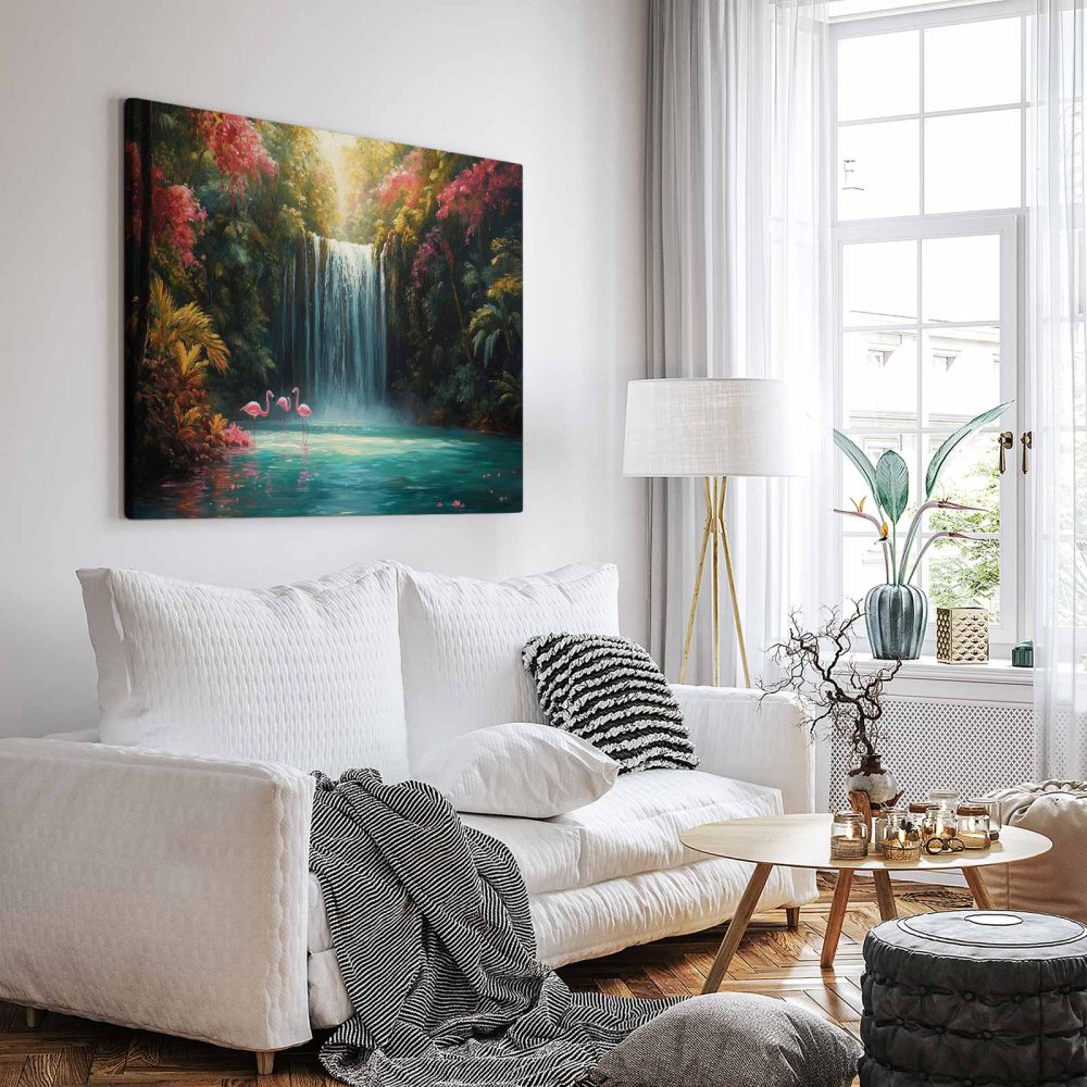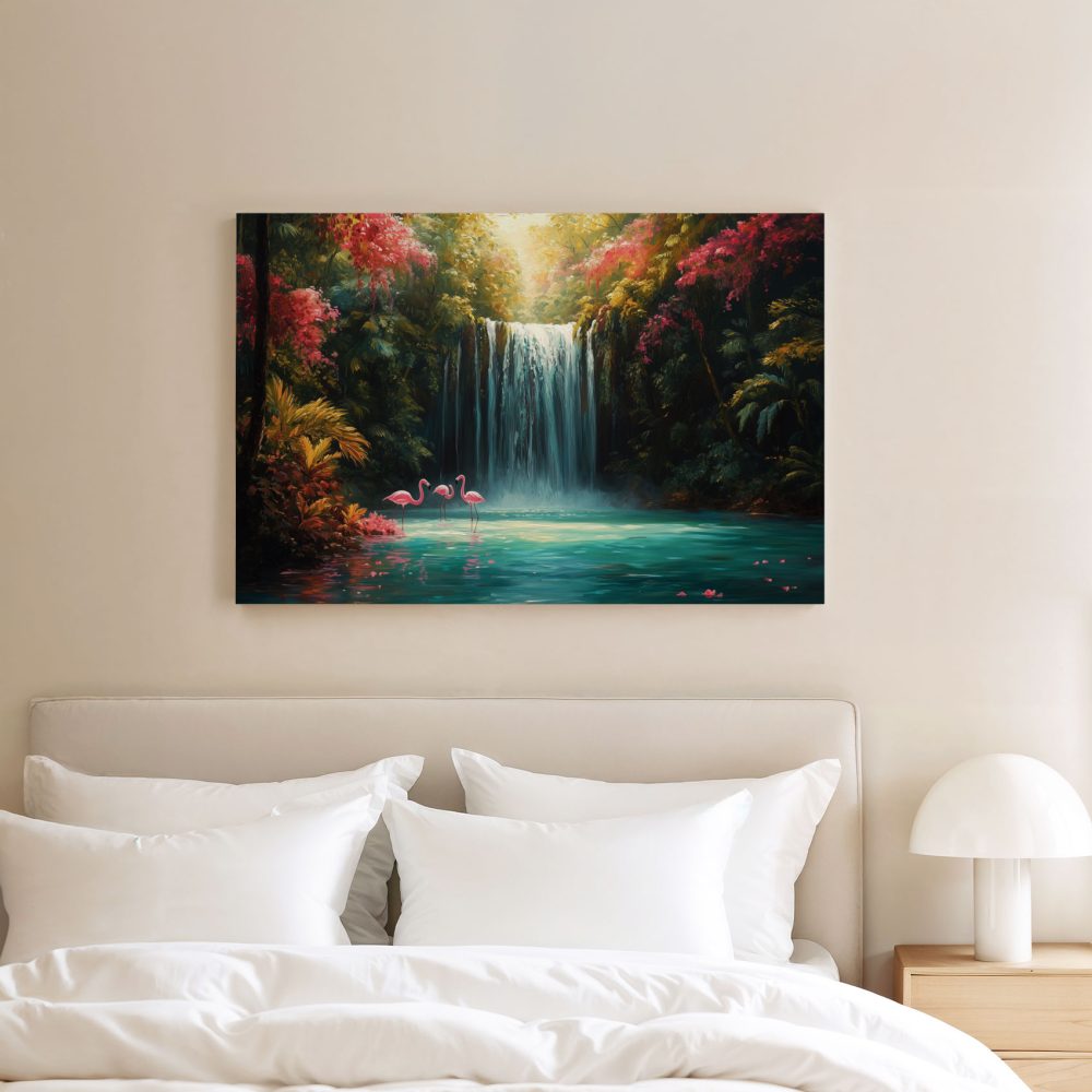 Terug naar collectie / Schilderijen / Bloemen Schilderij / Betoverende Waterval met Flamingo’s
