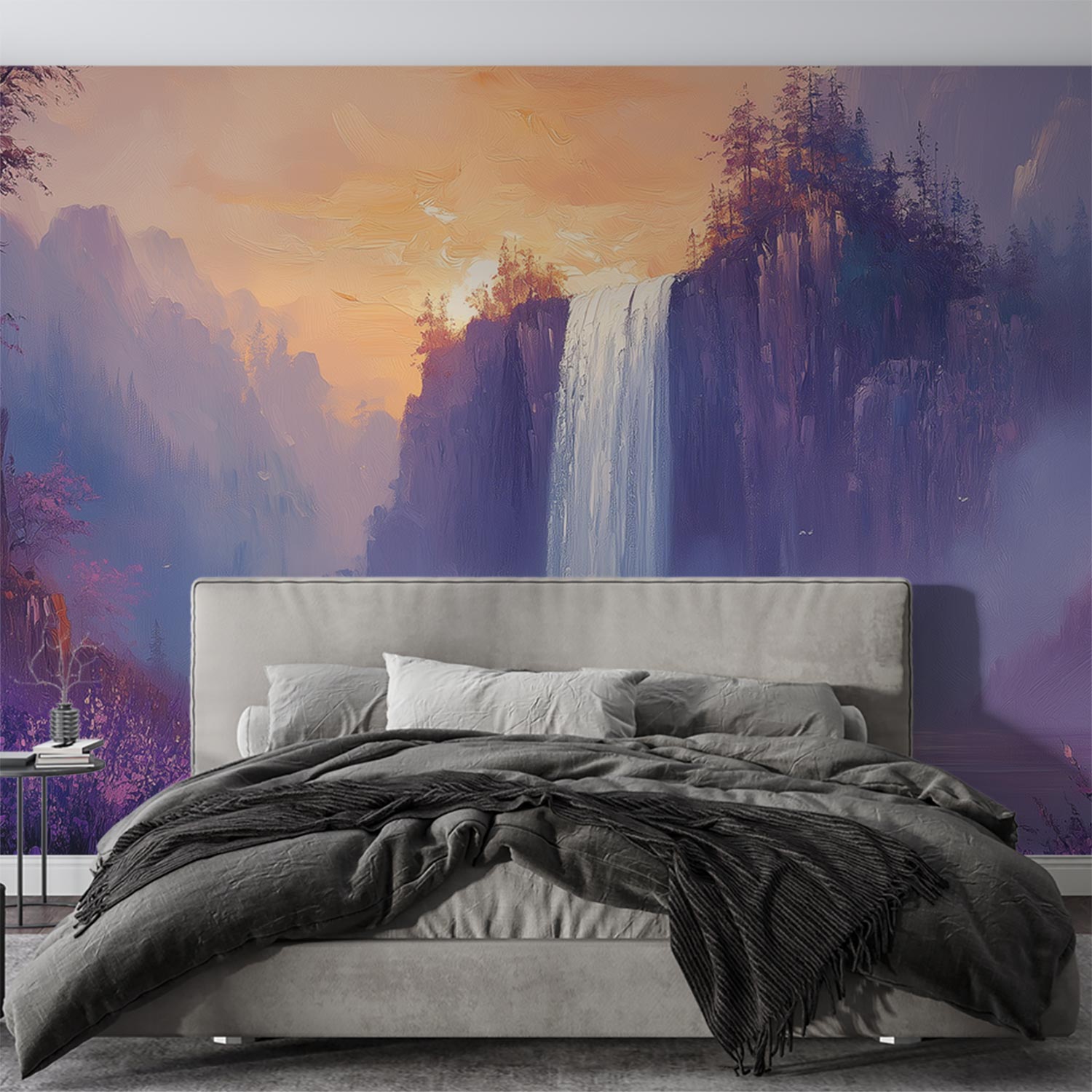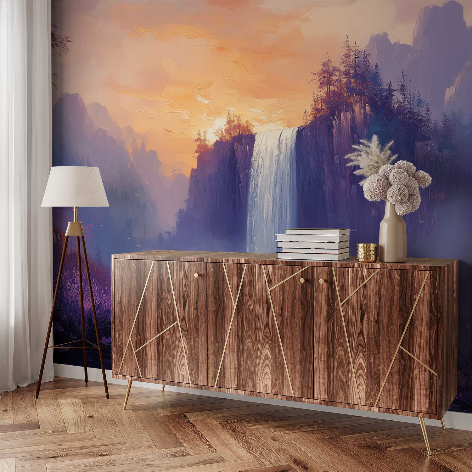 Betoverende waterval schilderij behang