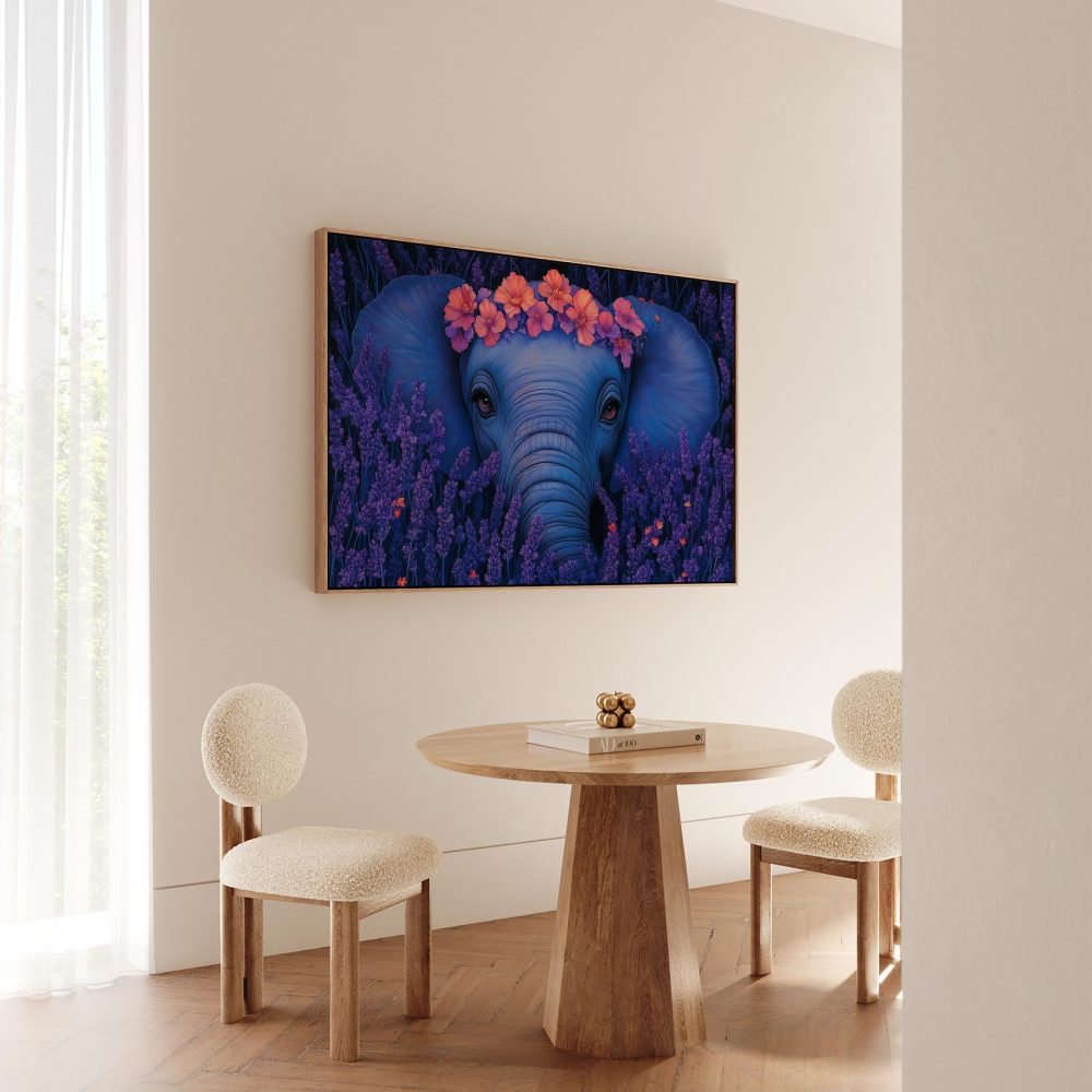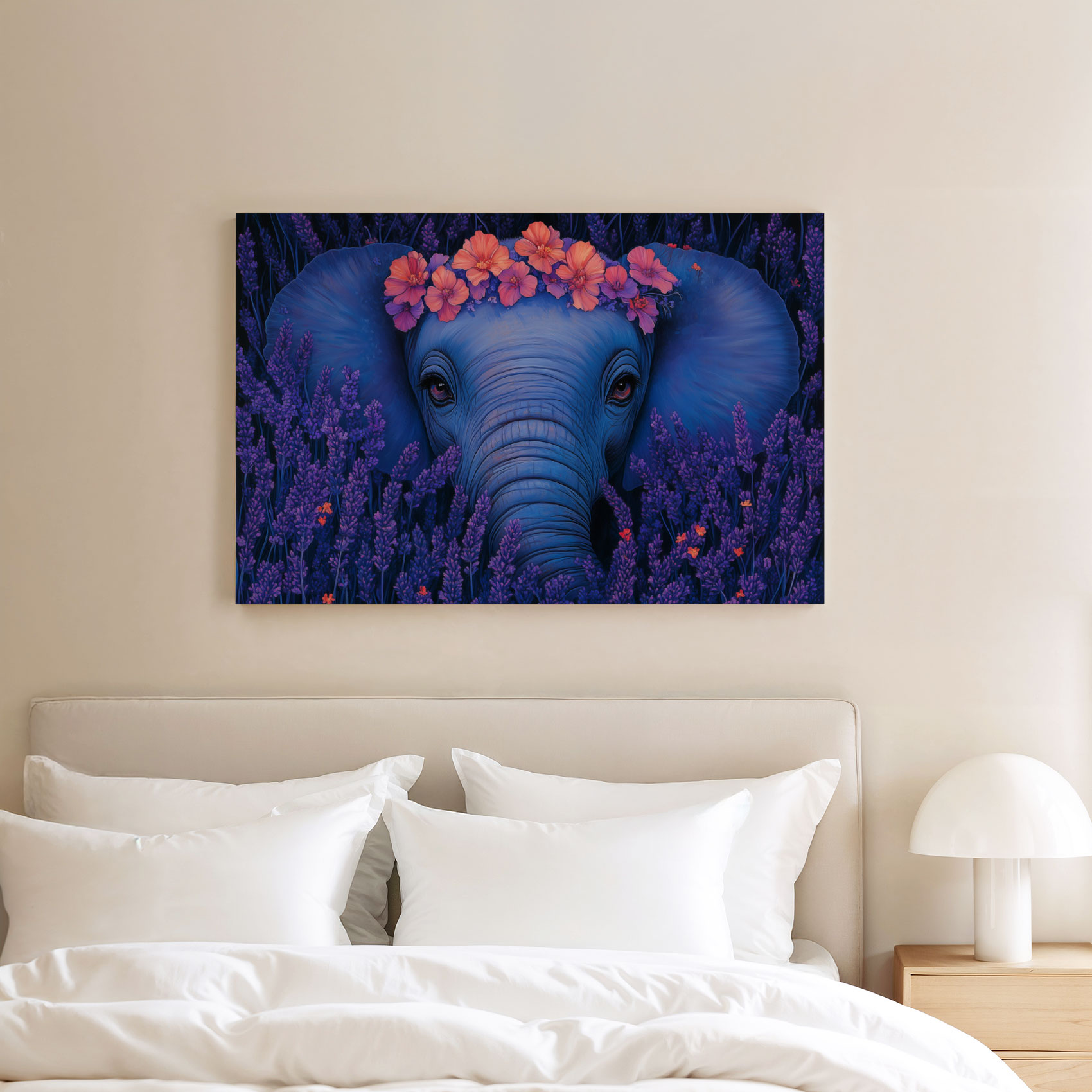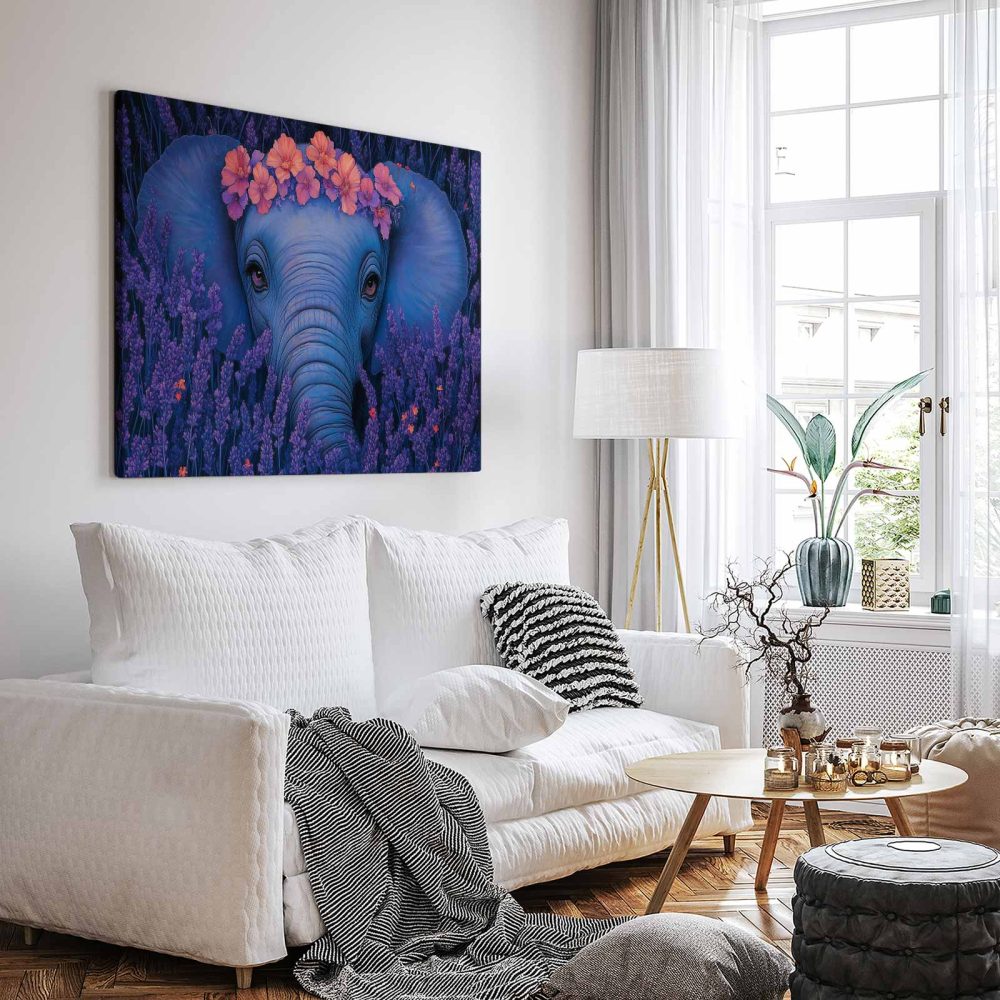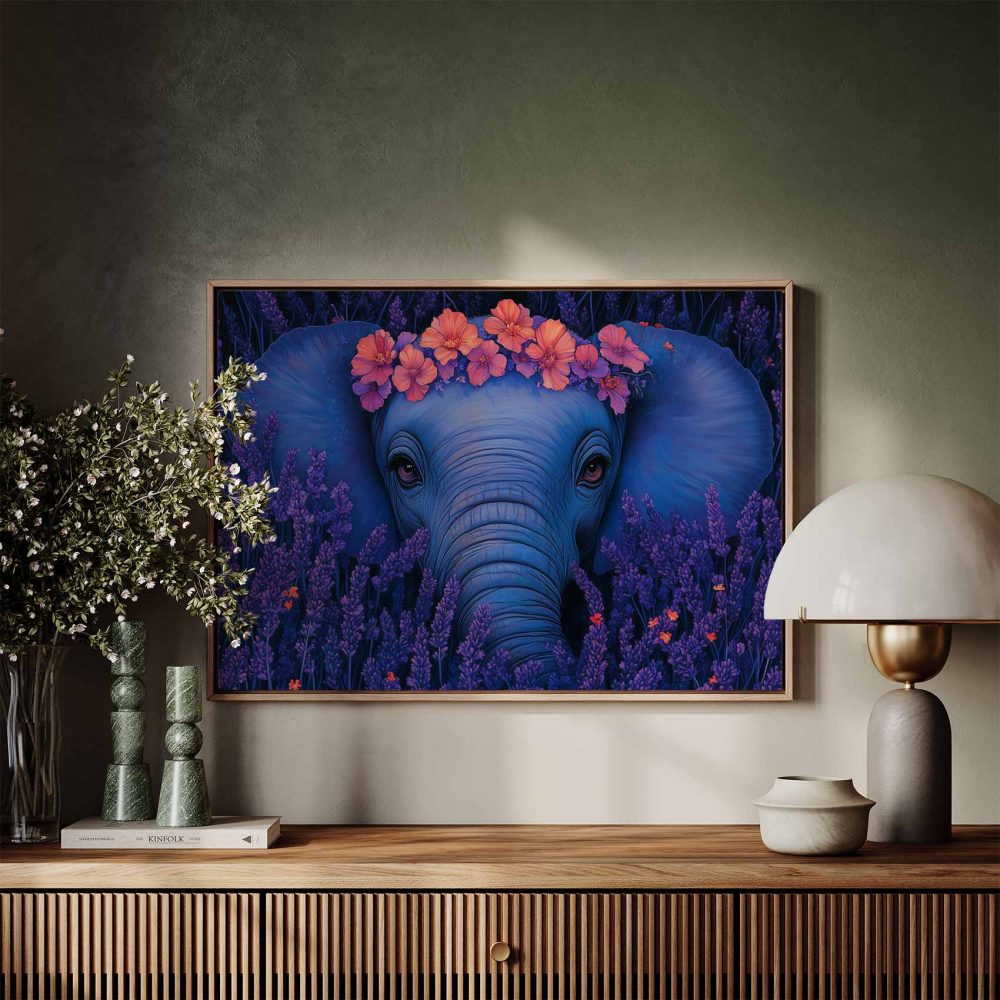 Terug naar collectie / Schilderijen / Bloemen Schilderij / Blauwe olifant met bloemenkroon