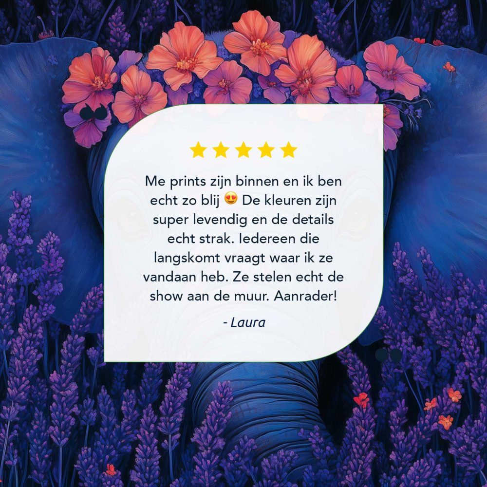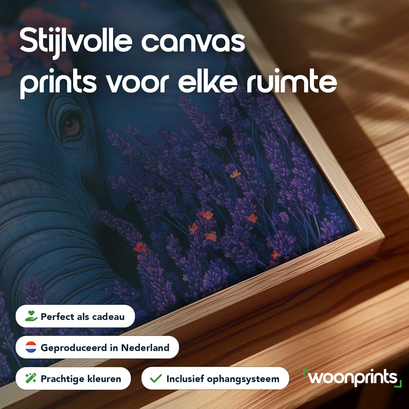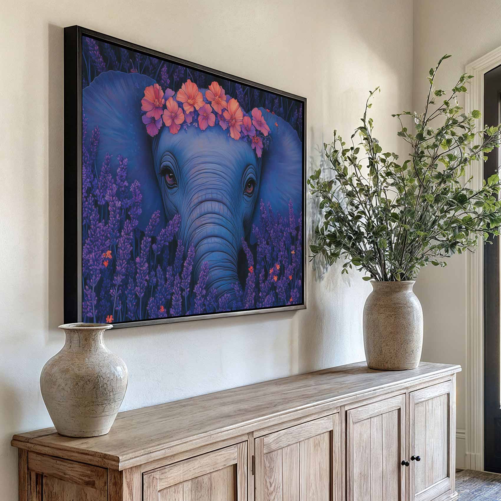Terug naar collectie / Schilderijen / Bloemen Schilderij / Blauwe olifant met bloemenkroon