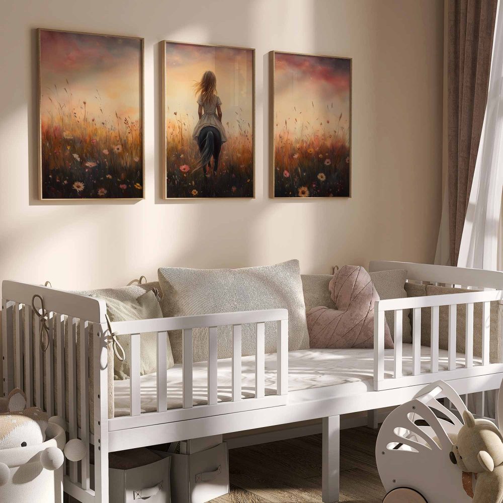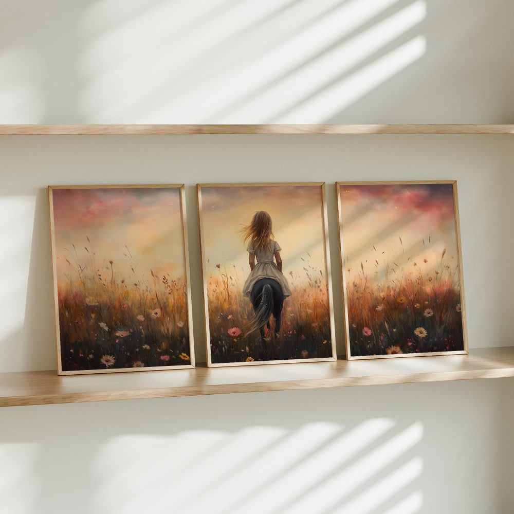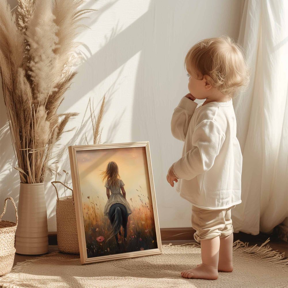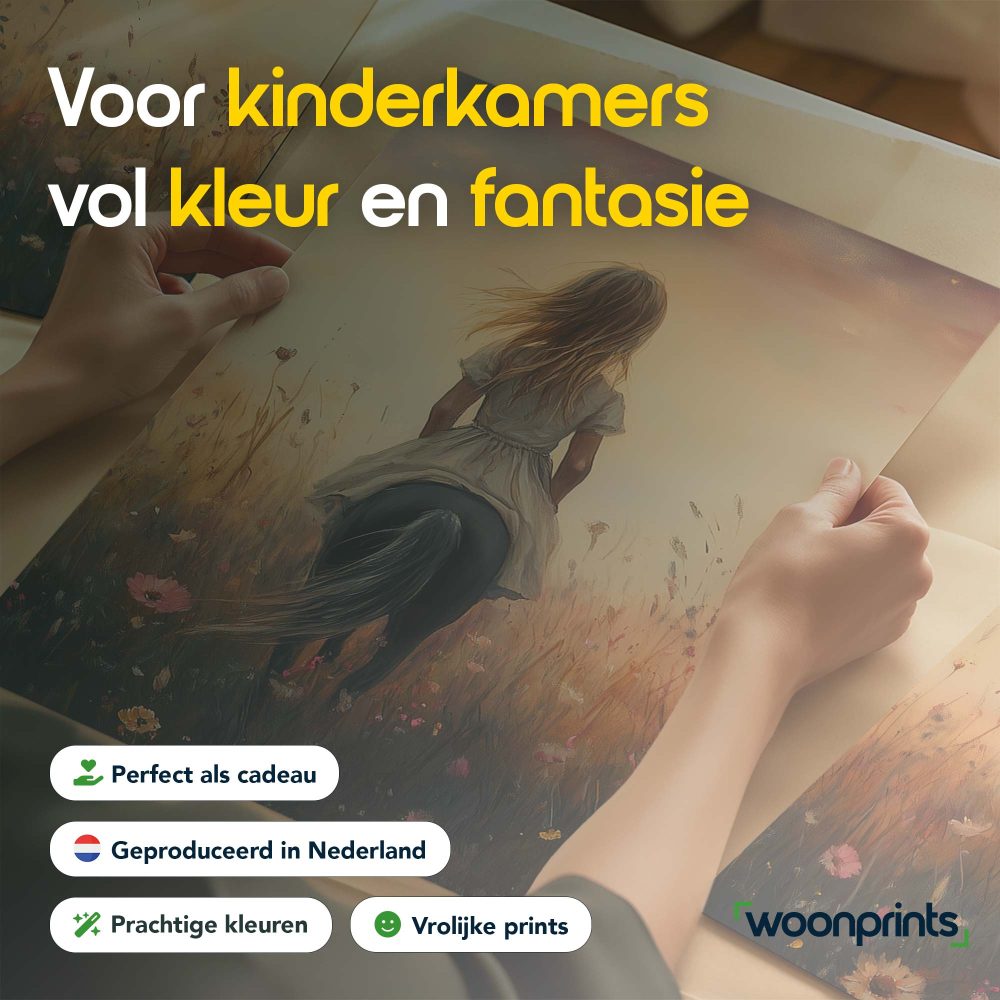 Terug naar collectie / Kinderkamer posters / Avontuurlijk posters / Blije Dame te Paard in Bloeiend Bloemenveld