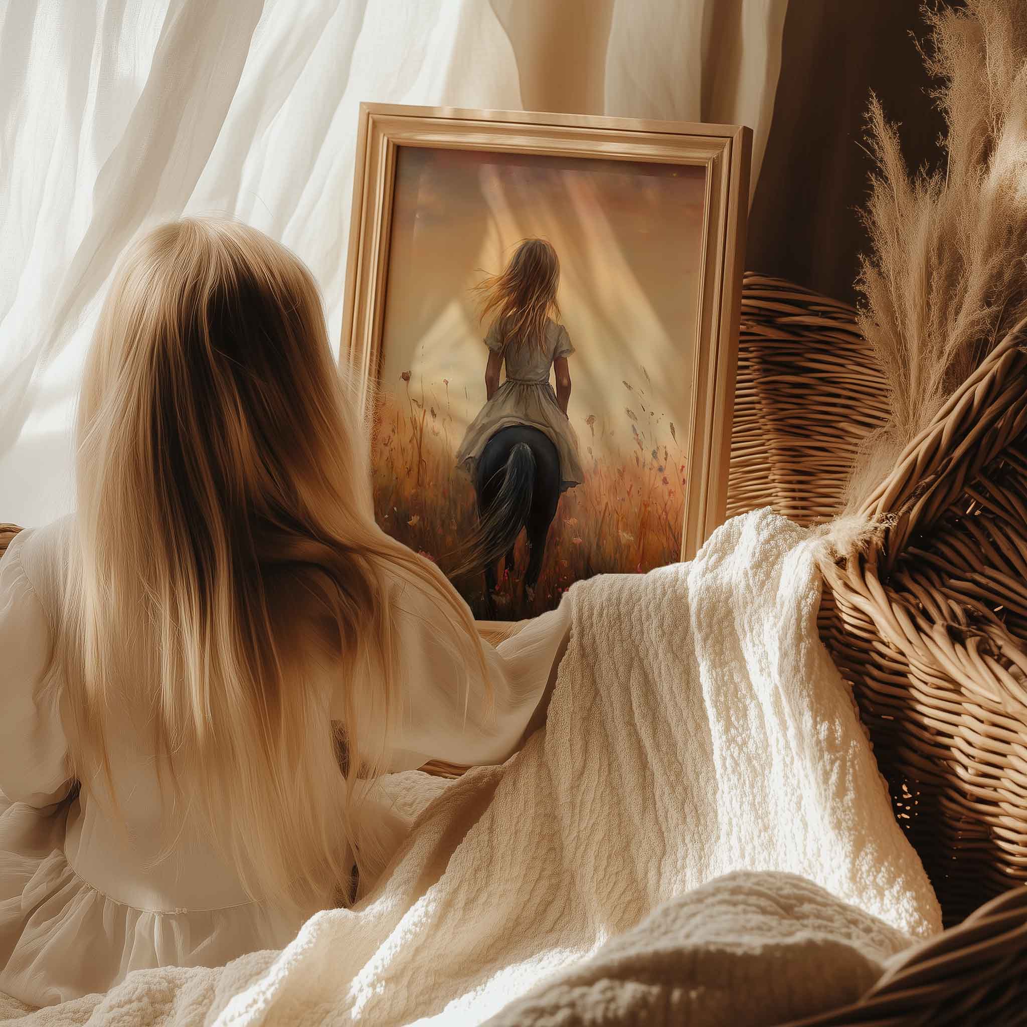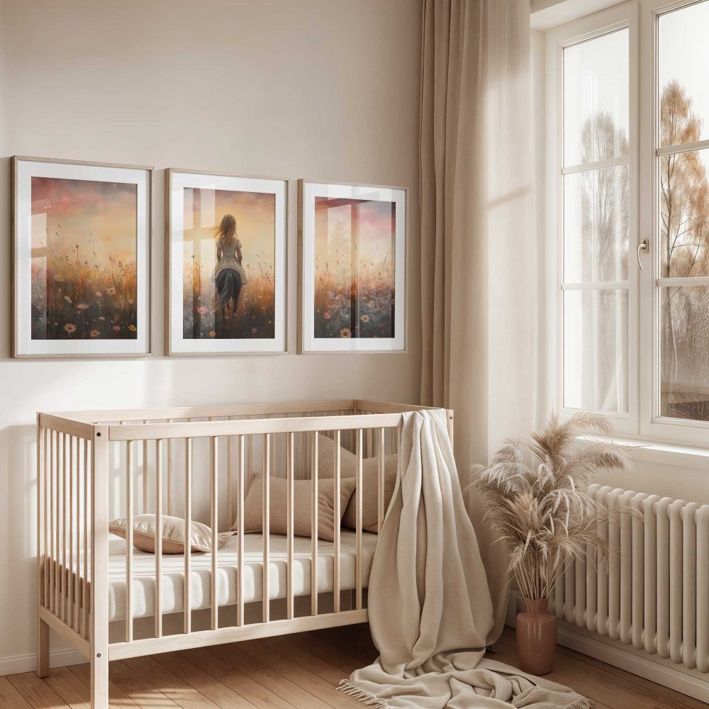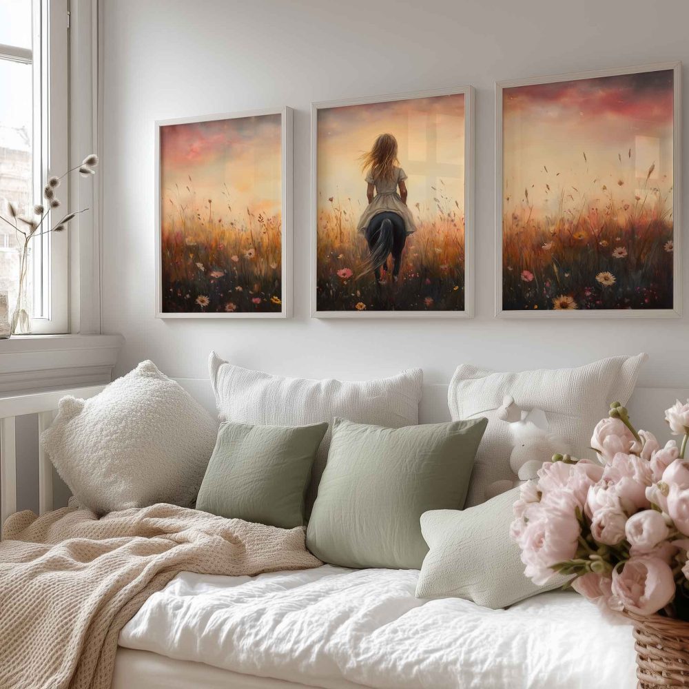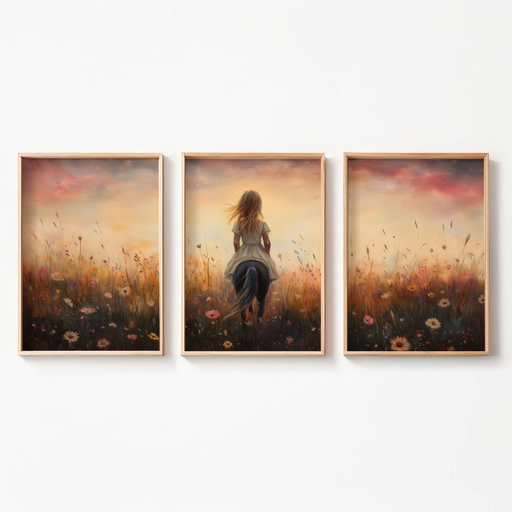 Terug naar collectie / Kinderkamer posters / Avontuurlijk posters / Blije Dame te Paard in Bloeiend Bloemenveld