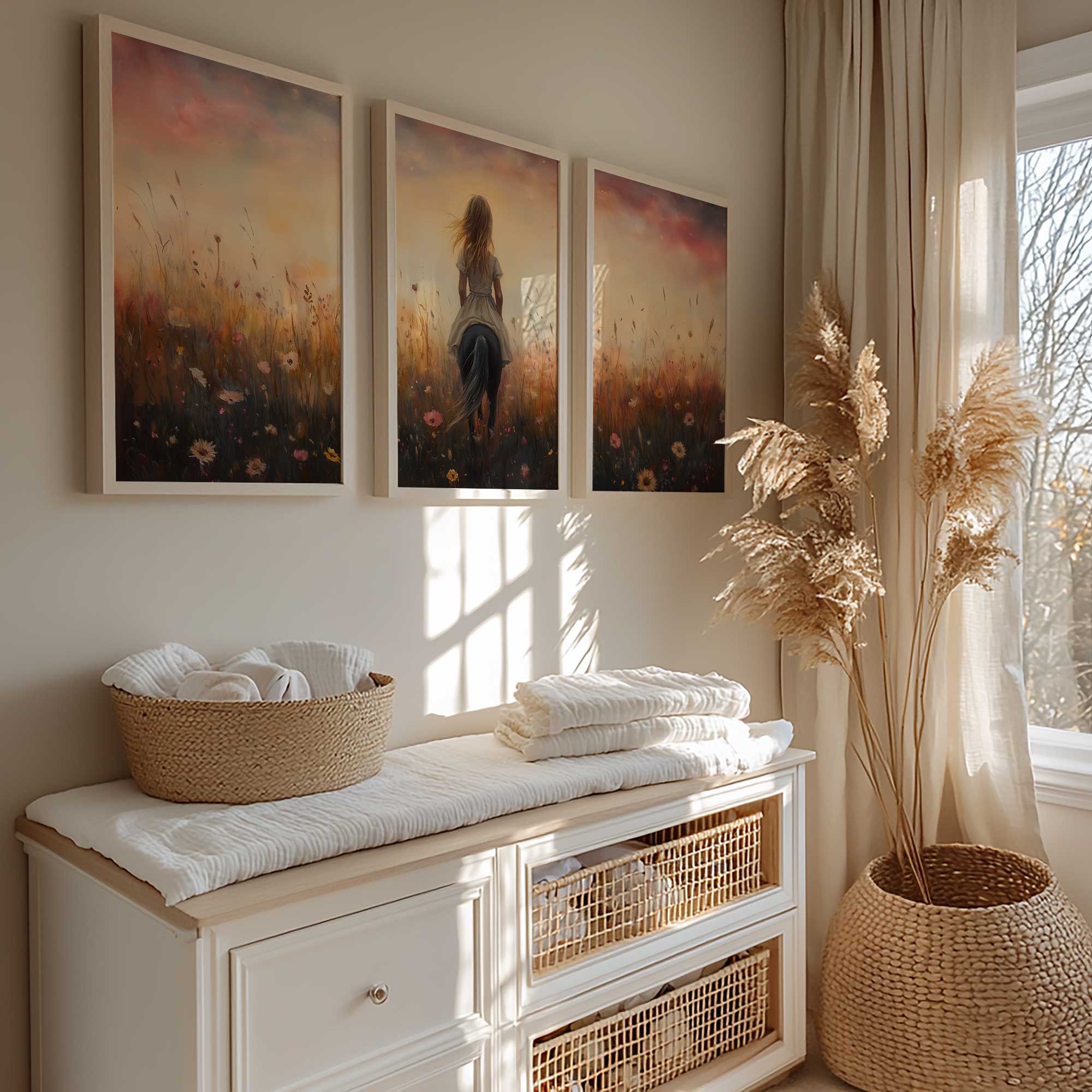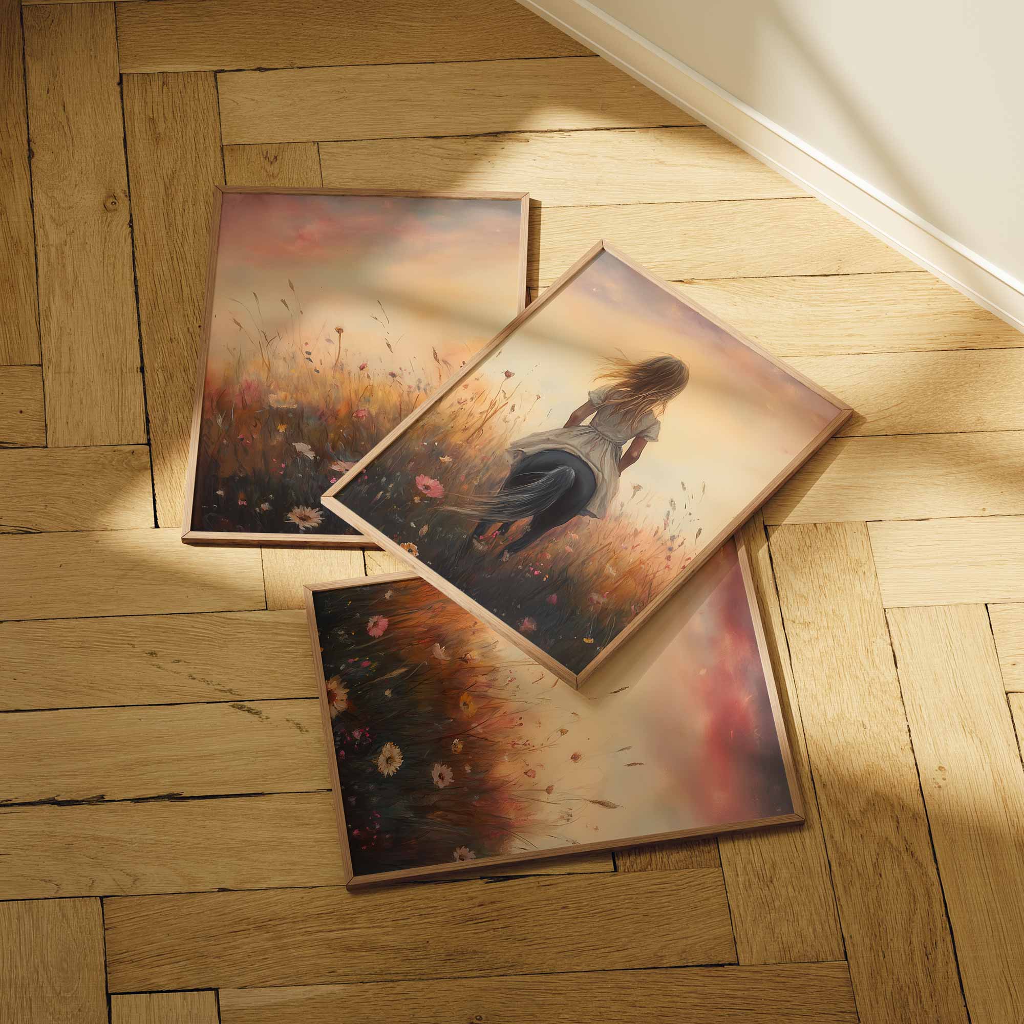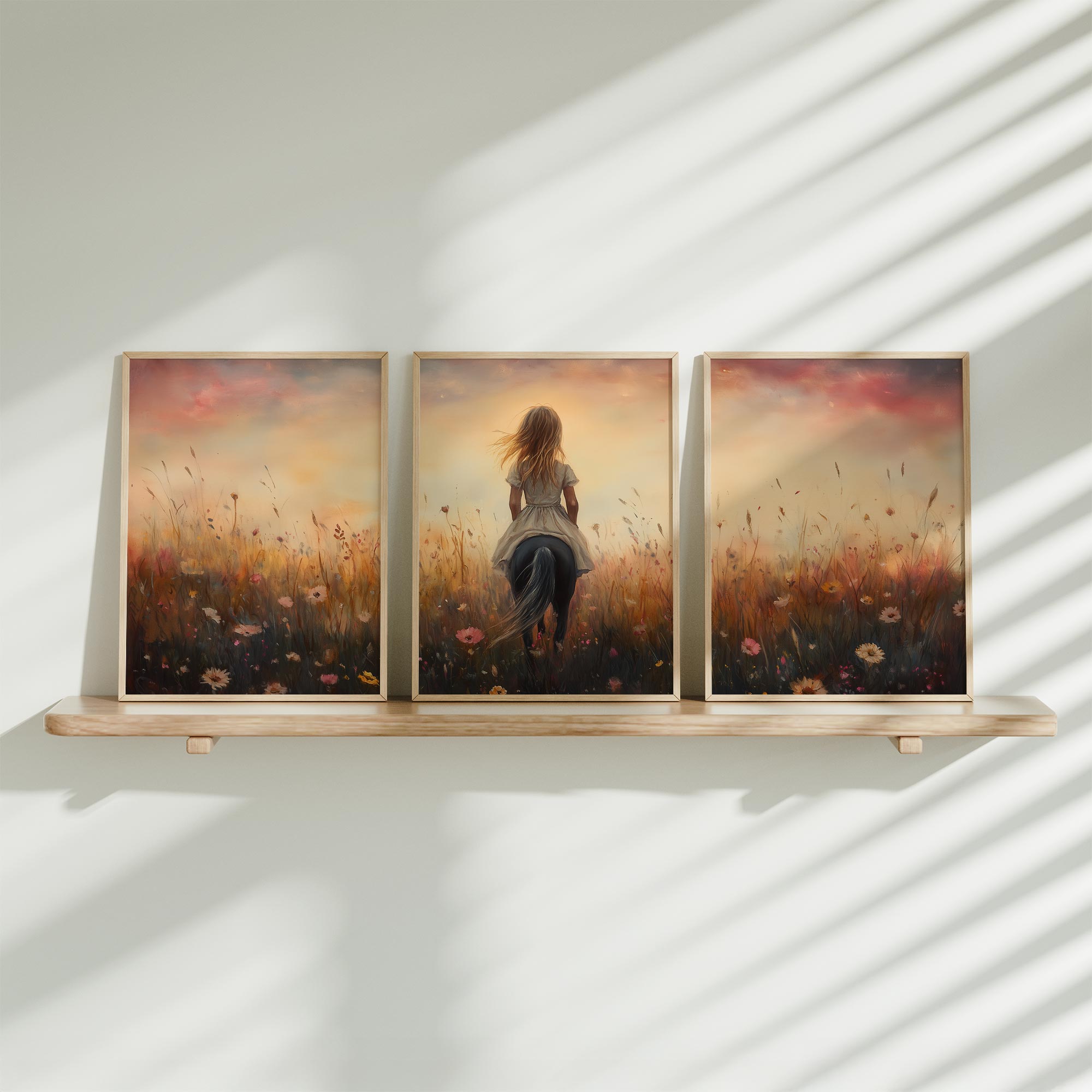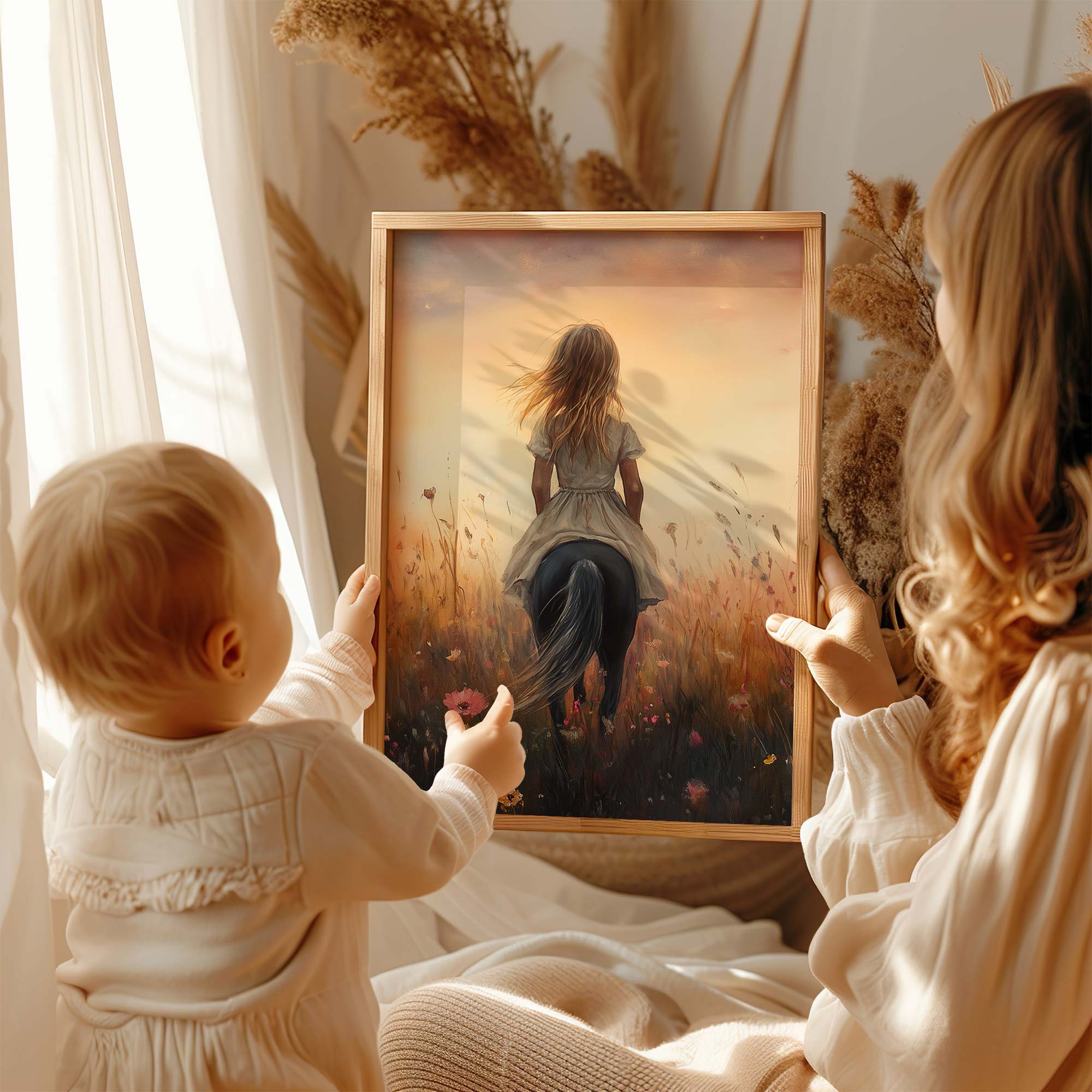 Terug naar collectie / Kinderkamer posters / Avontuurlijk posters / Blije Dame te Paard in Bloeiend Bloemenveld