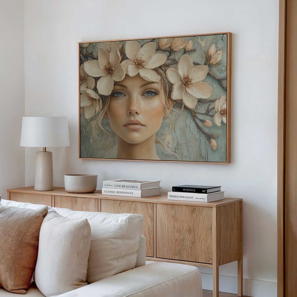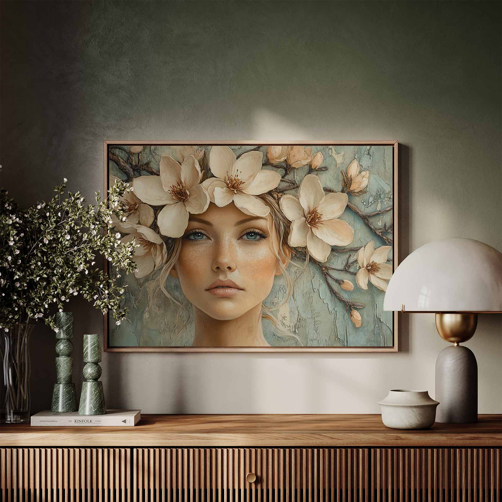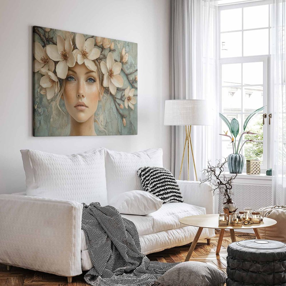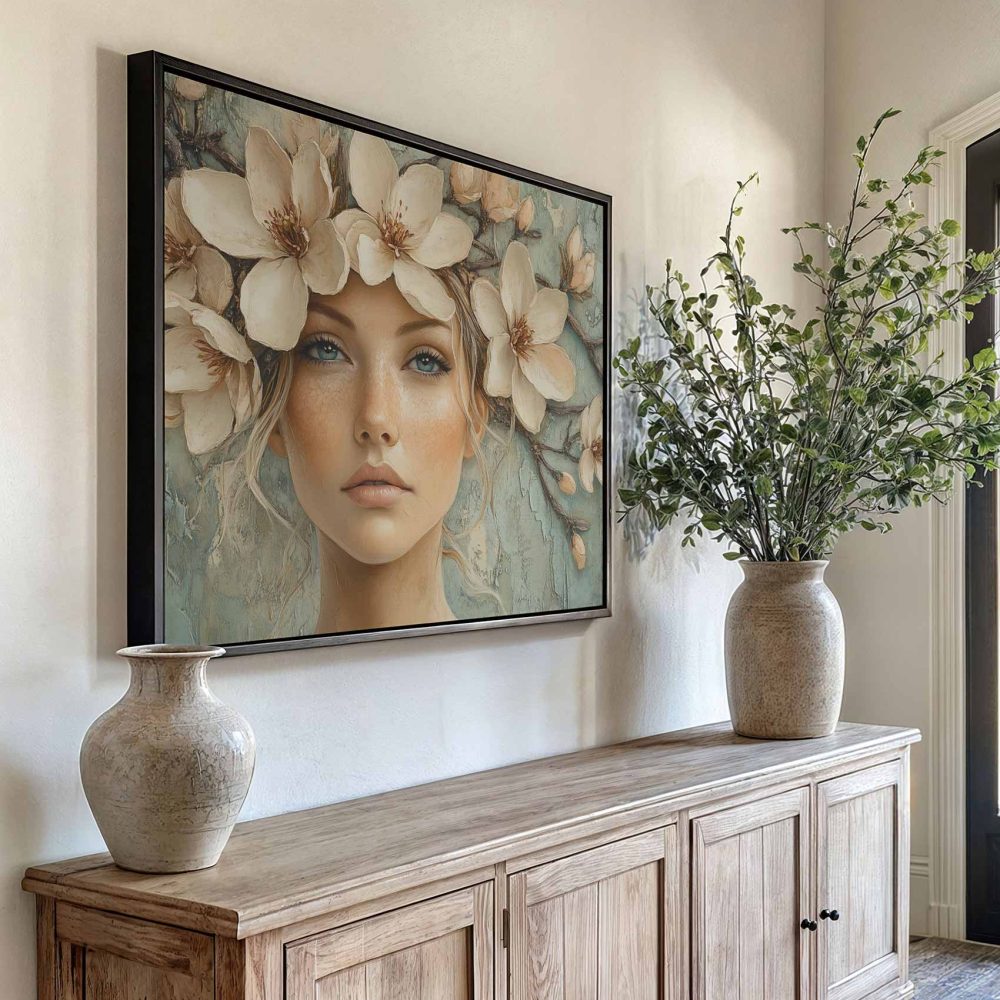 Terug naar collectie / Schilderijen / Bloemen Schilderij / Bloemenkrans vrouw serene blik