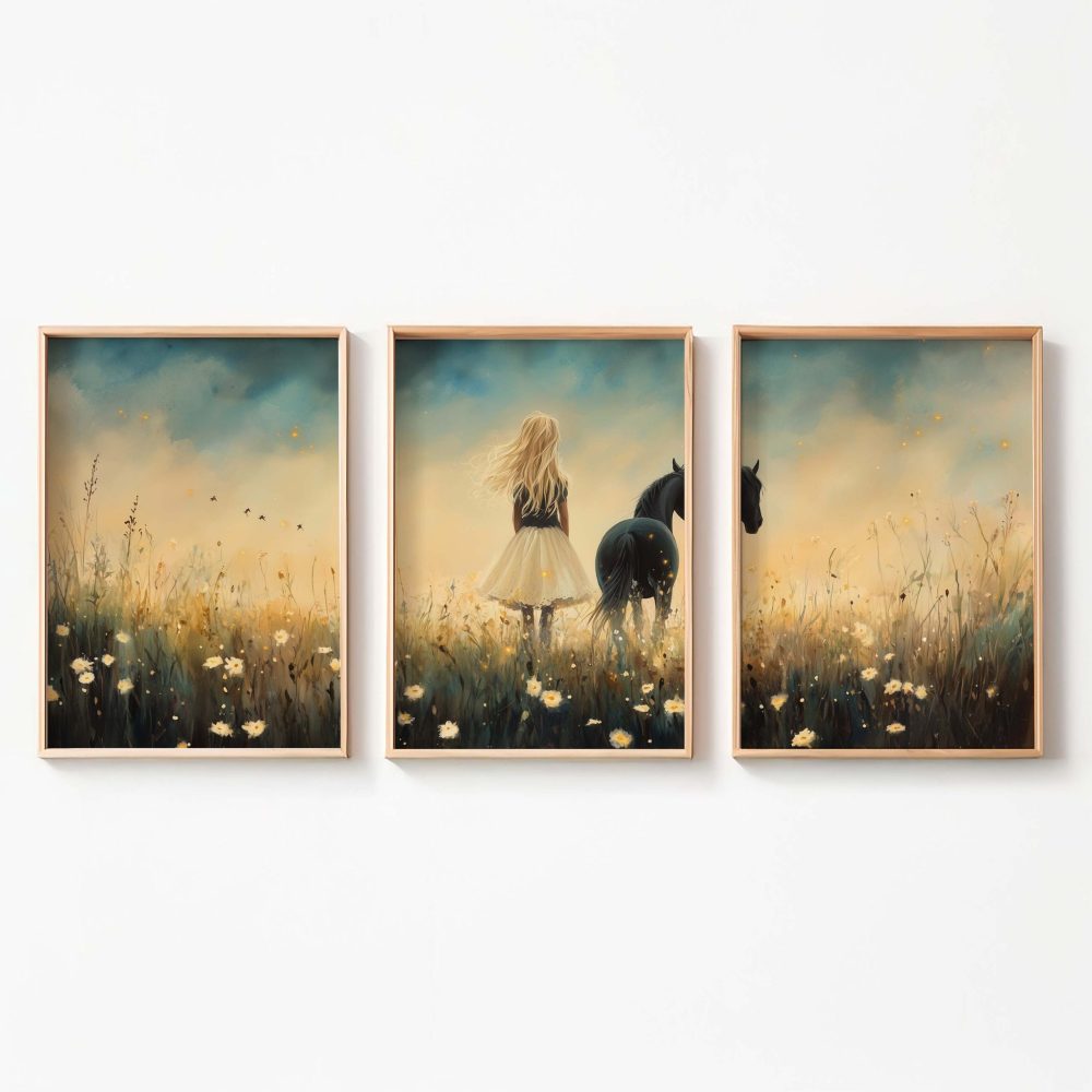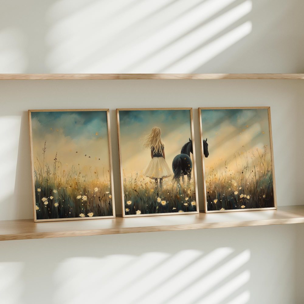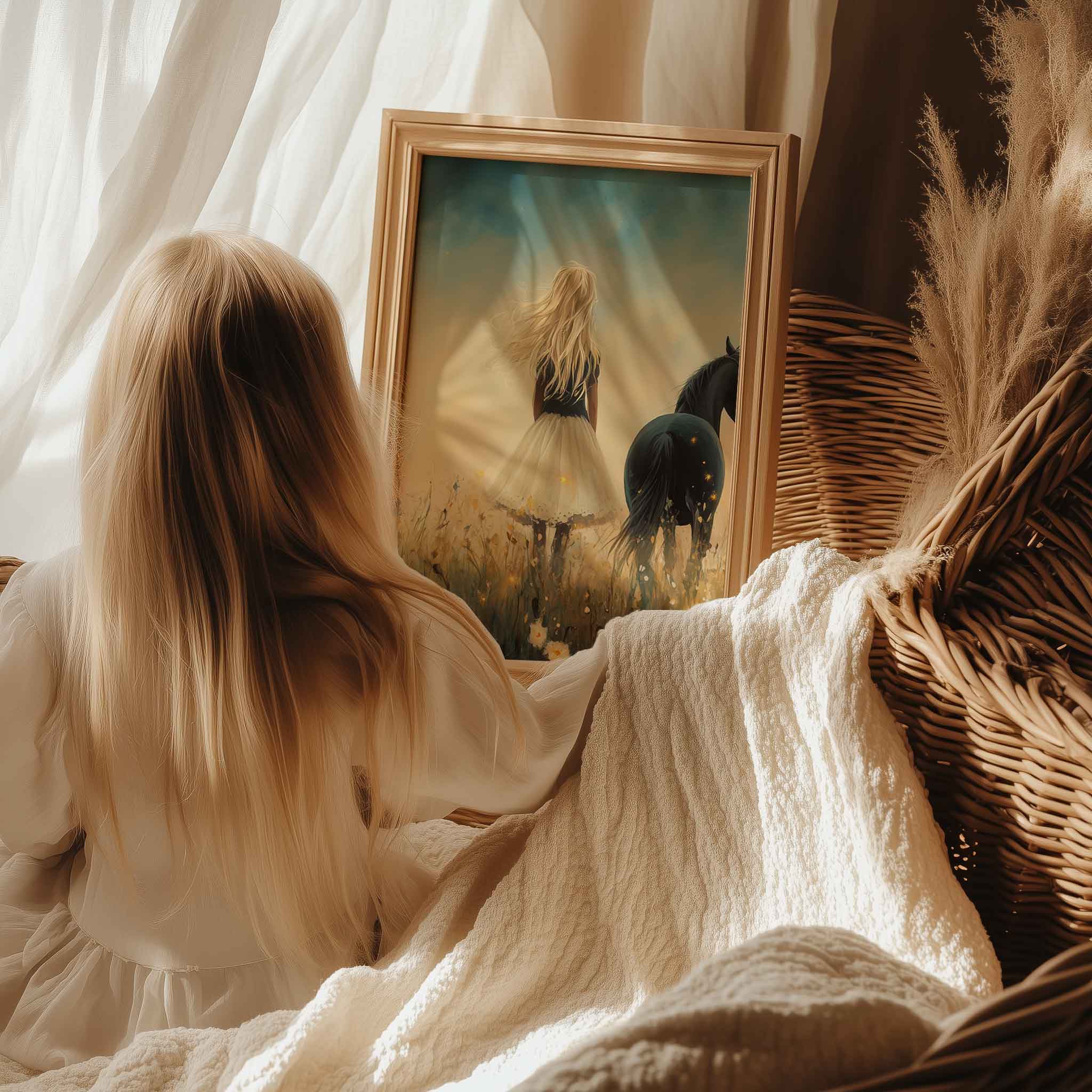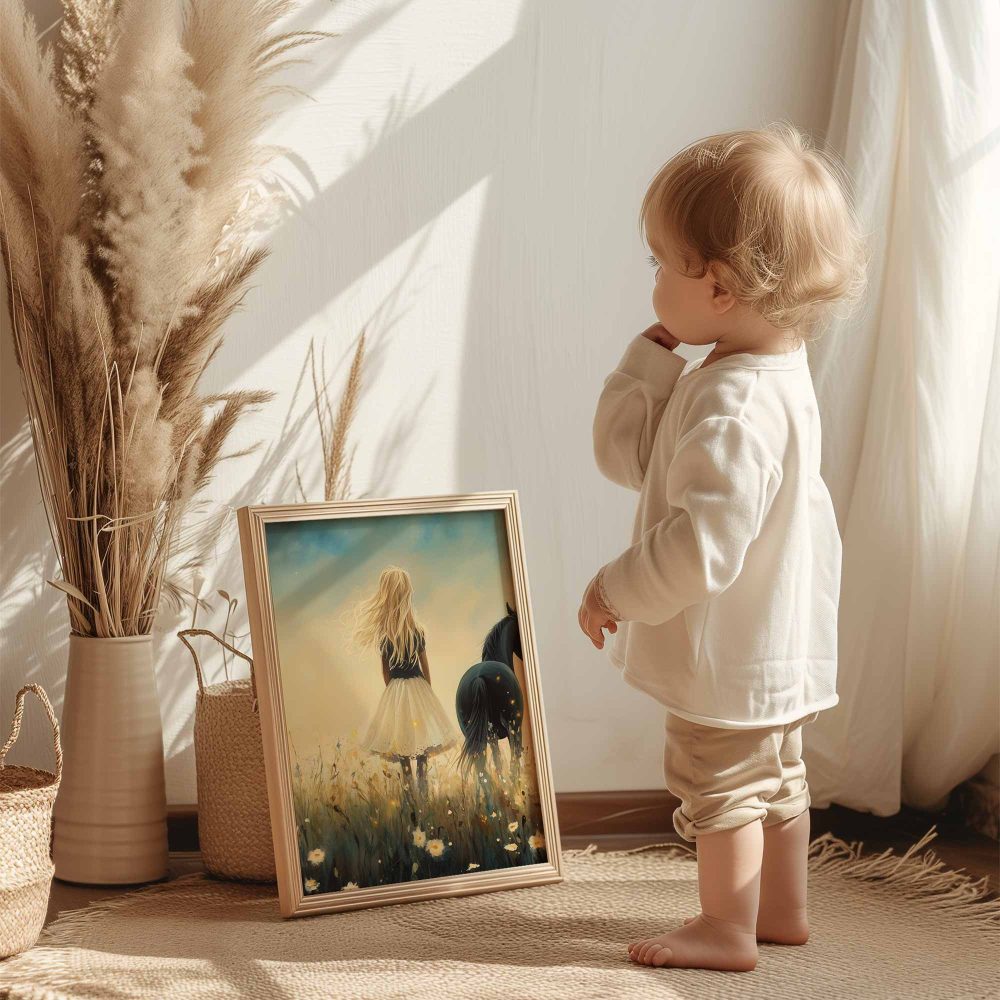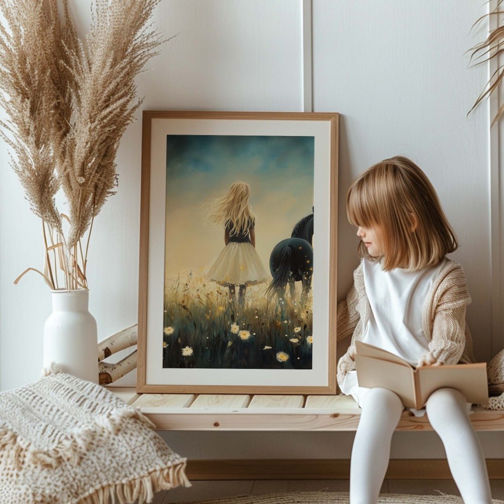 Terug naar collectie / Kinderkamer posters / Bloemen posters / Blonde Droom in Bloemenveld met Zwart Paard